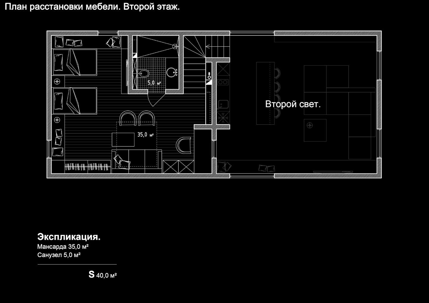 В доме два этажа: первый занимает кухня-гостиная, там же располагаются небольшая прачечная и гостевой санузел. Помещение получилось очень светлым благодаря панорамным окнам. На втором этаже обустроили ванную и просторную спальню с возможностью отделения гостевой спальной зоны или детской в будущем.