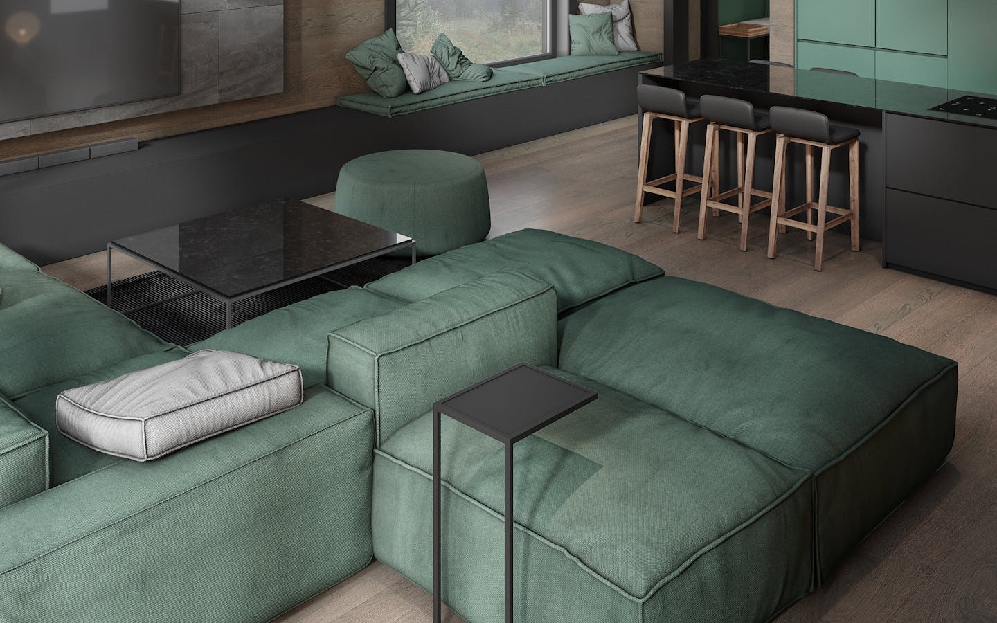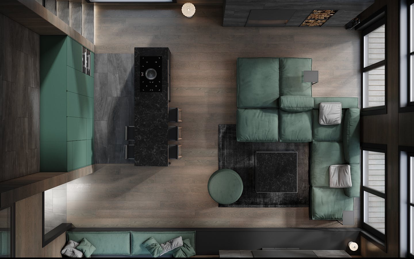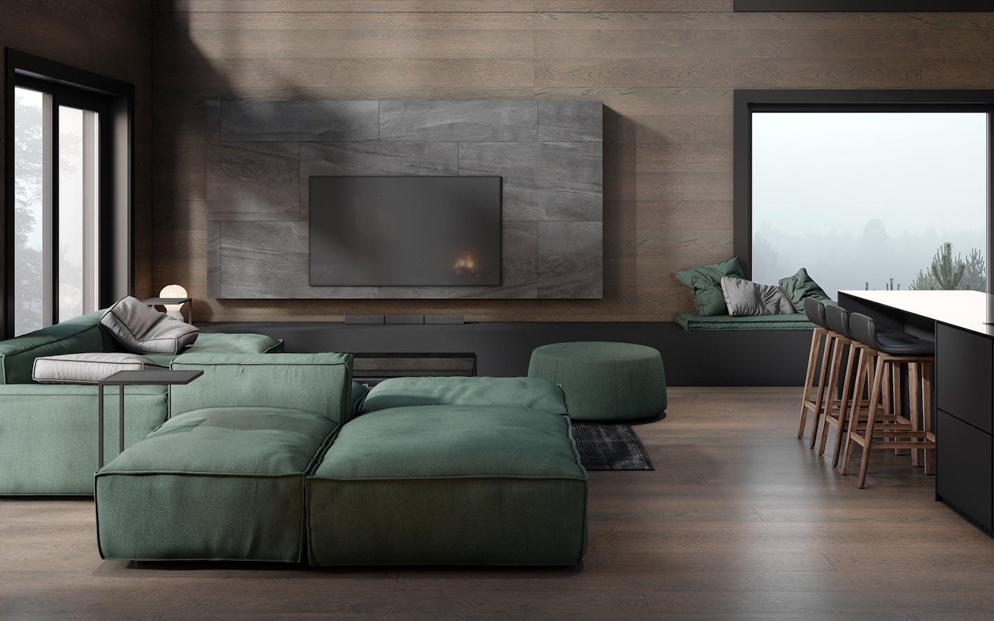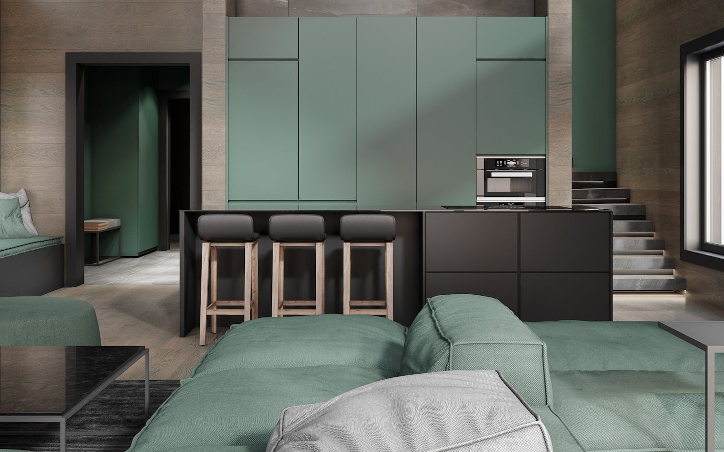 В проекте нейтральная цветовая гамма, в которой преобладают натуральные цвета, в основном это приглушенный изумрудный, черный и цвет орехового дерева.