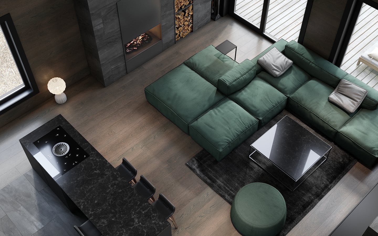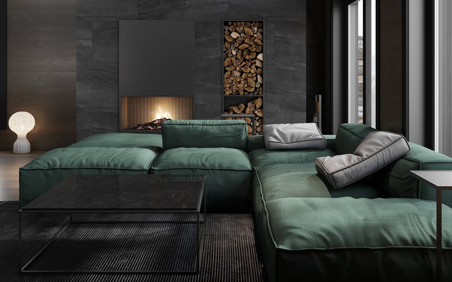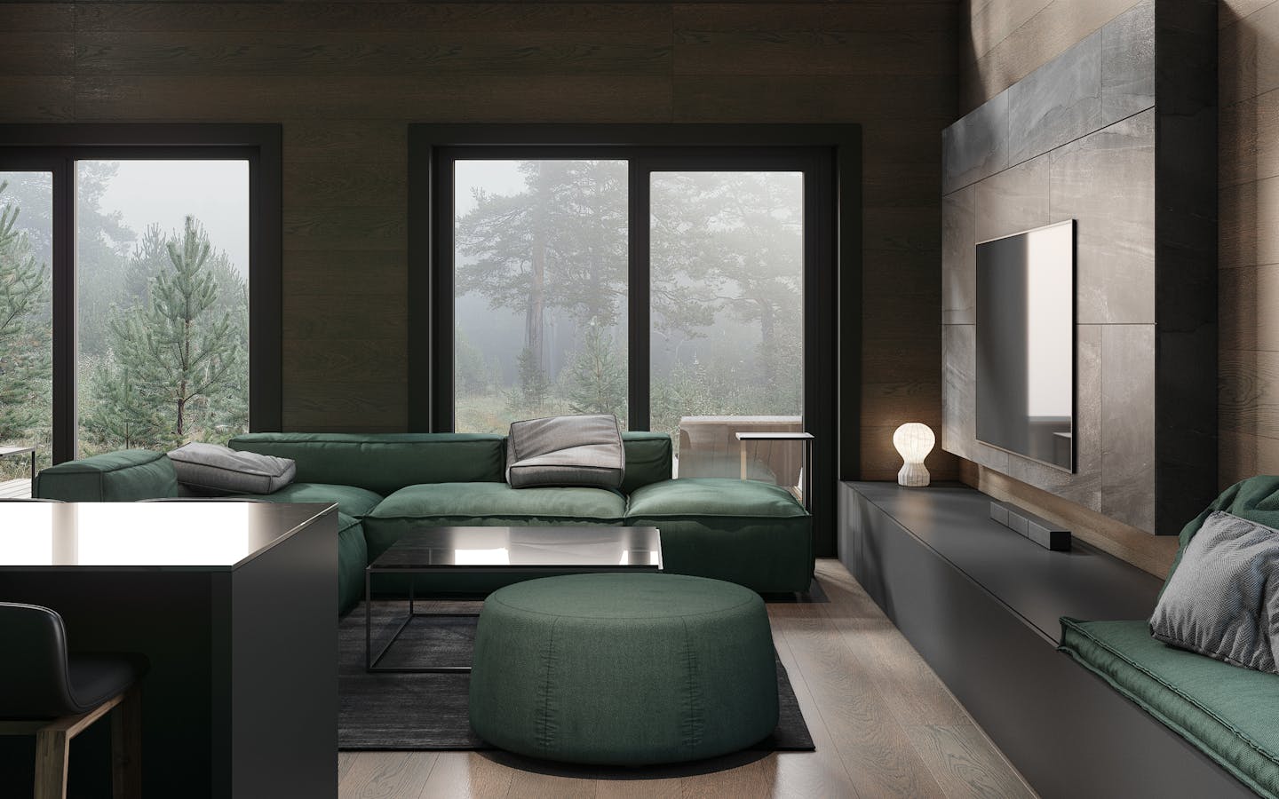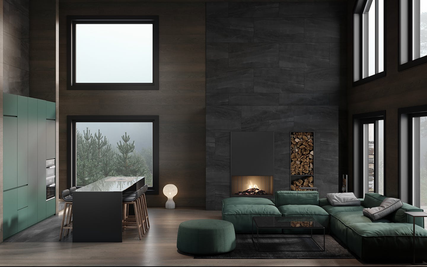 В проекте нейтральная цветовая гамма, в которой преобладают натуральные цвета, в основном это приглушенный изумрудный, черный и цвет орехового дерева.