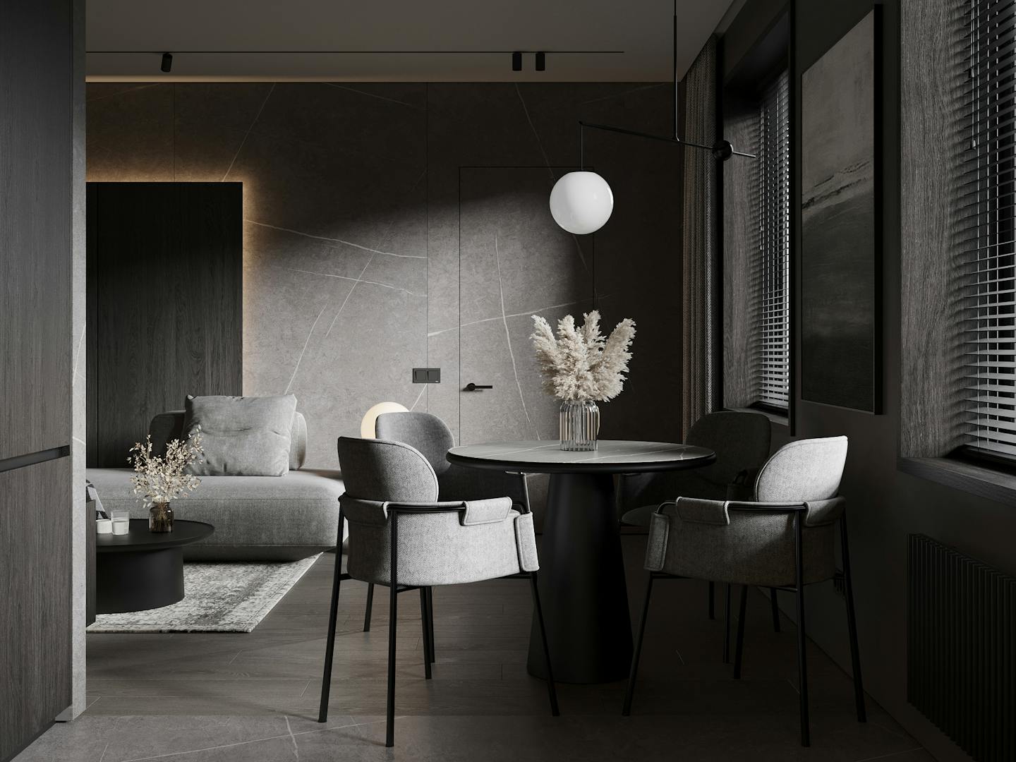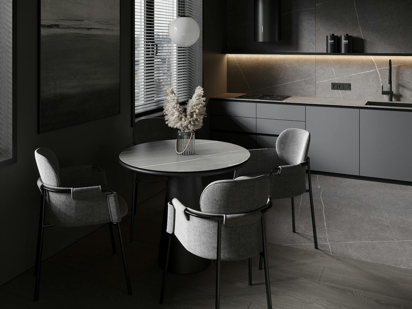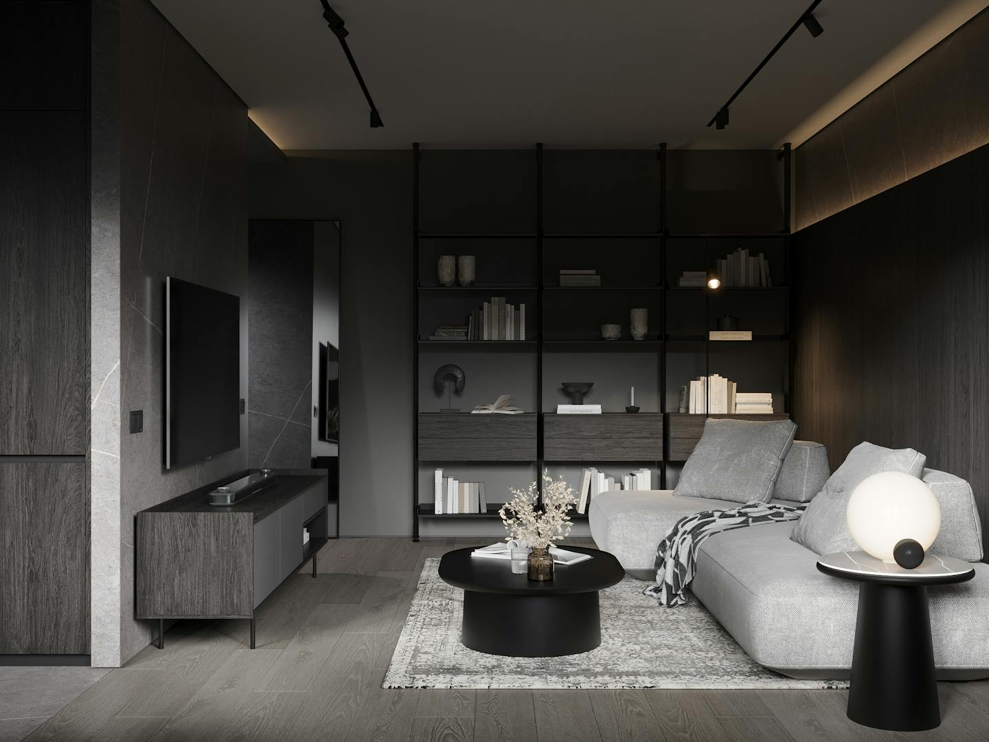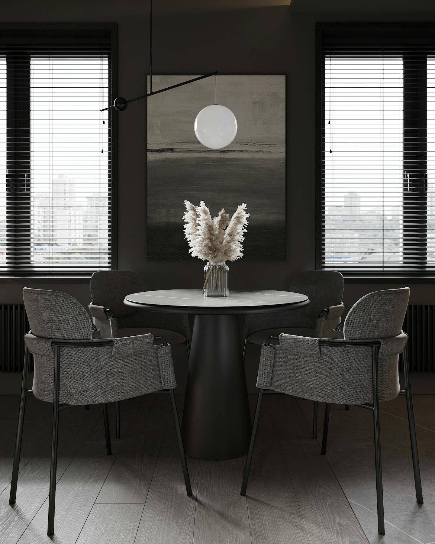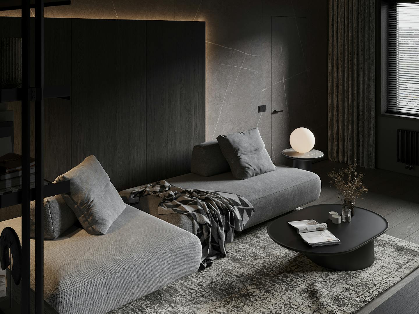 Таинственный и уютный интерьер с преобладанием серых оттенков – один из самых сложных проектов. В основу его легла теория о черном цвете, который поглощает весь свет, ничего не отражая. Темный интерьер формирует атмосферу таинственности и эмоциональную безопасность.