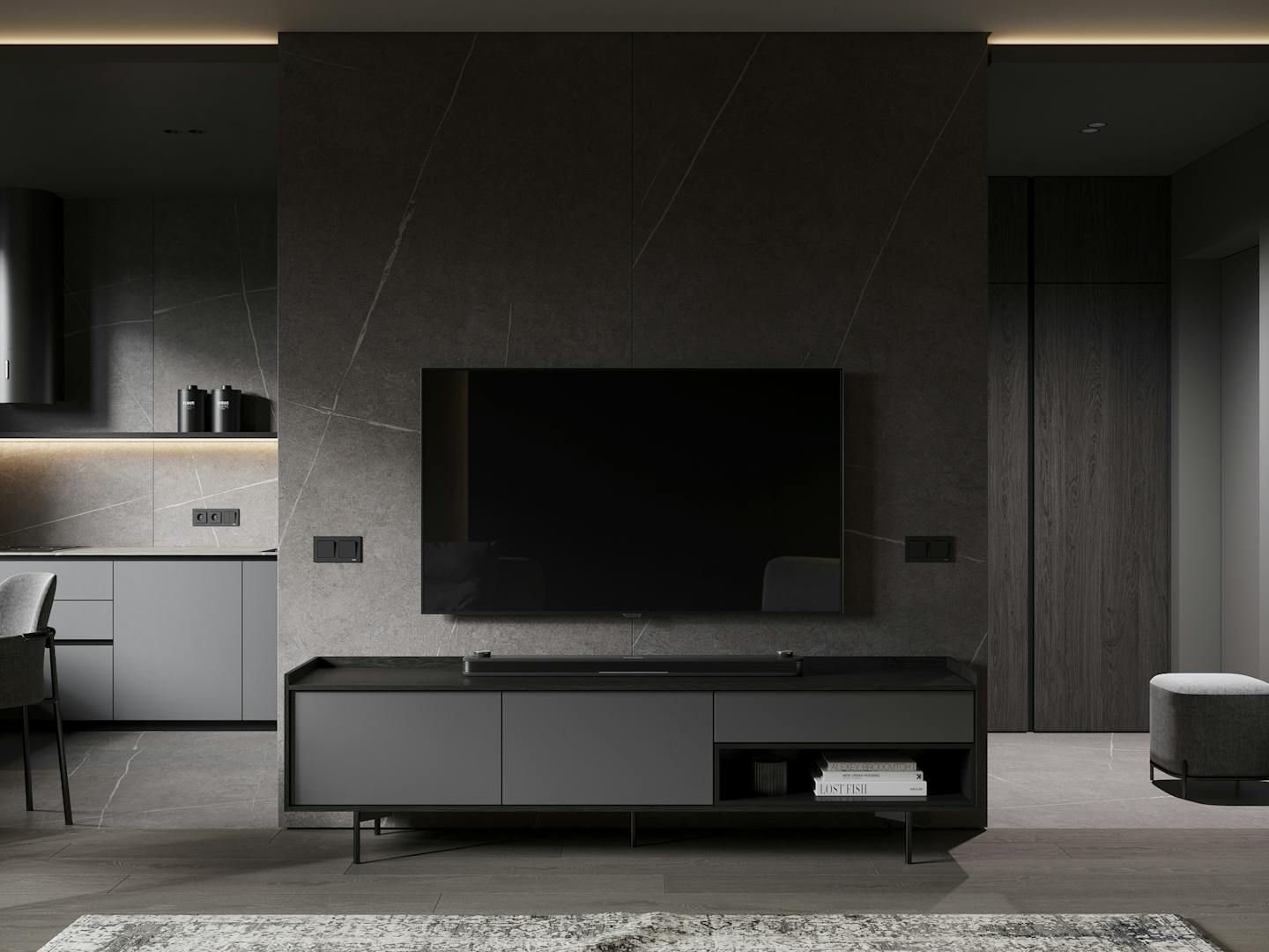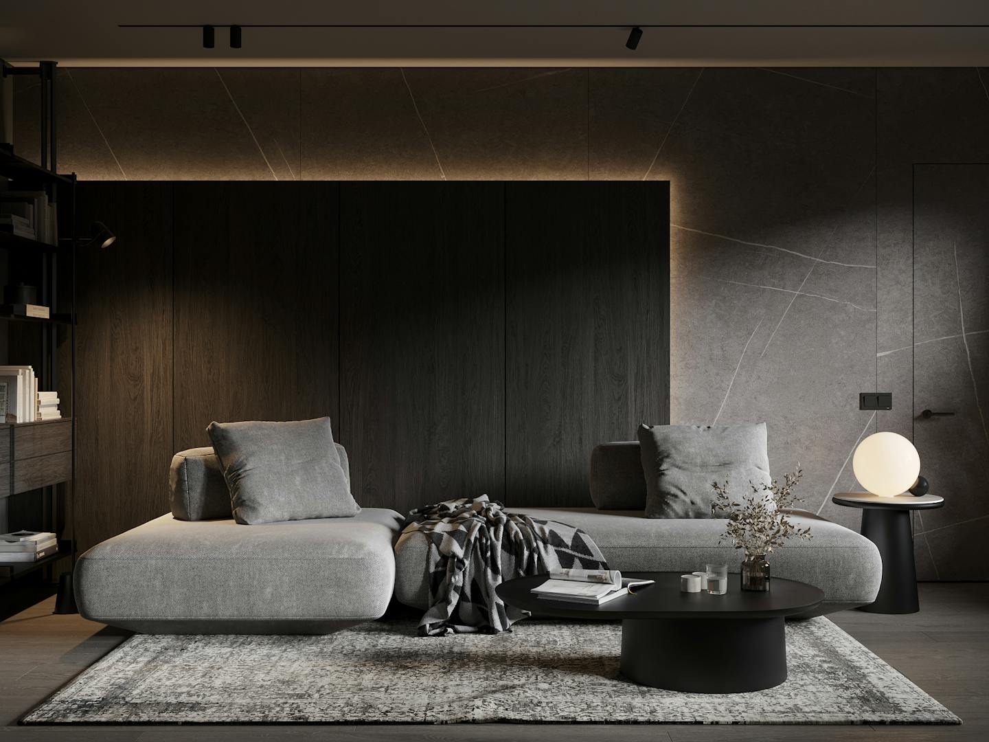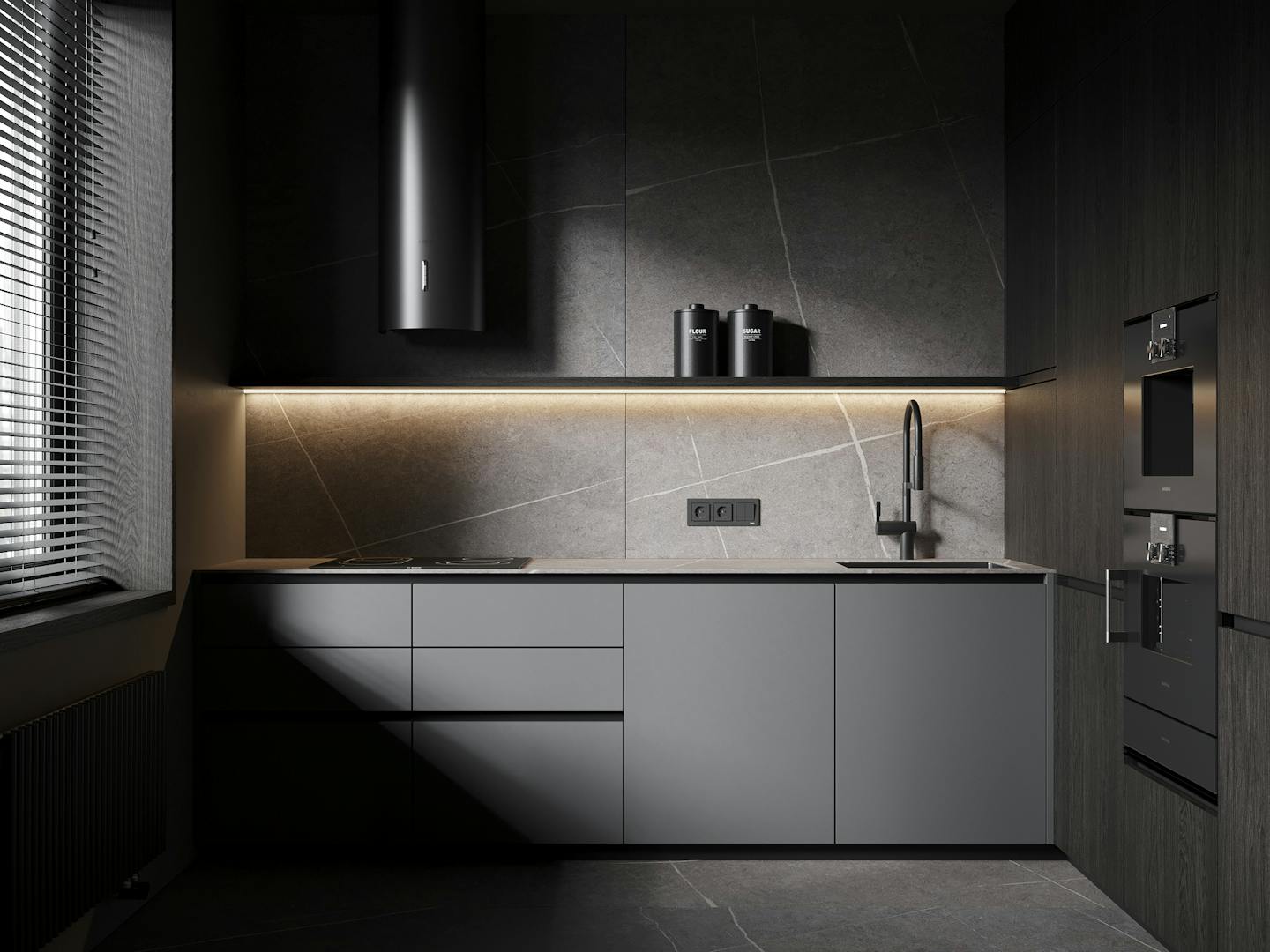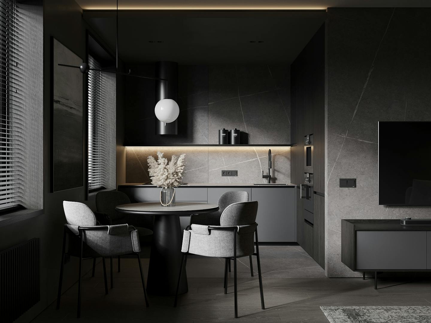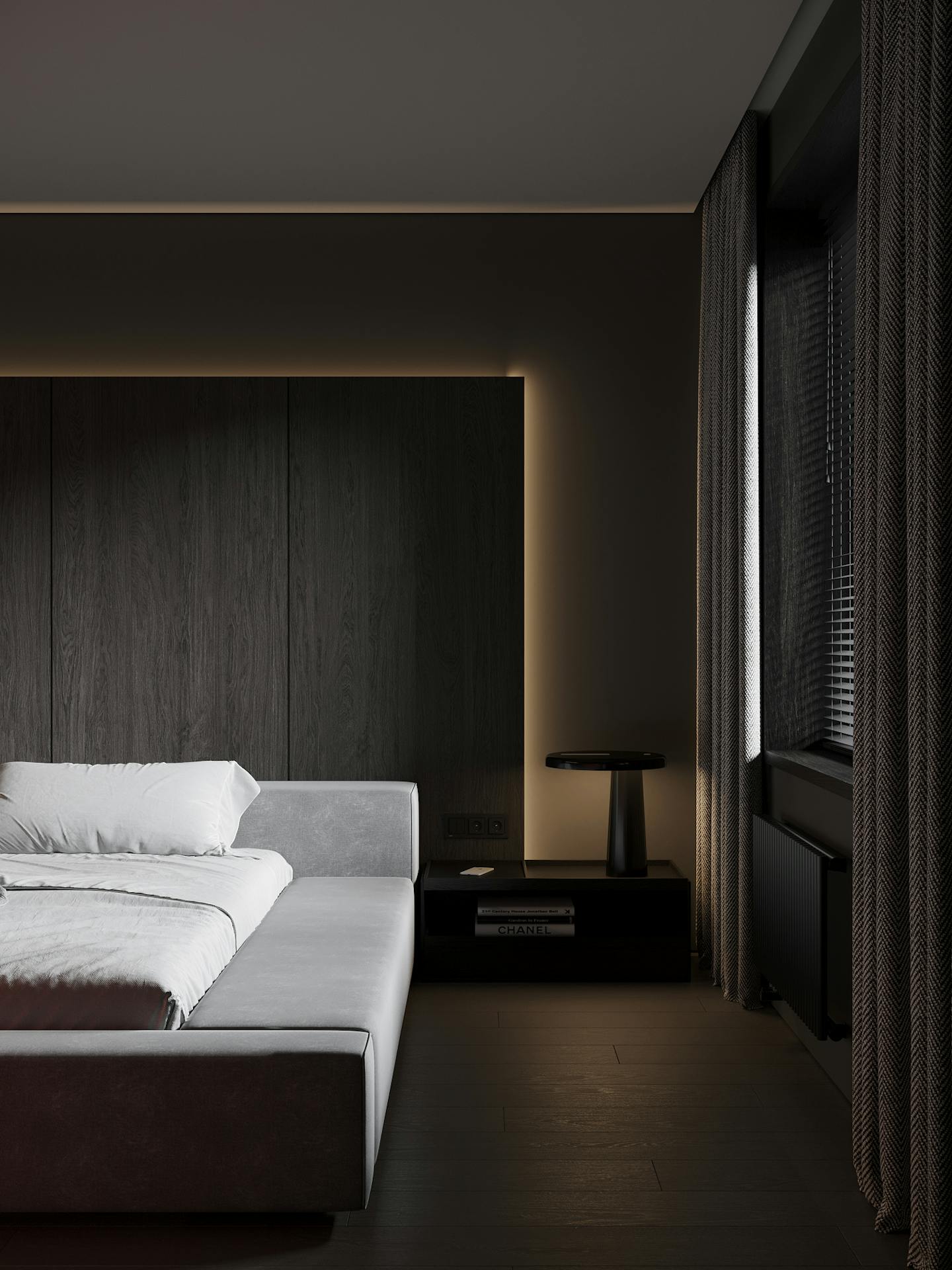 Таинственный и уютный интерьер с преобладанием серых оттенков – один из самых сложных проектов. В основу его легла теория о черном цвете, который поглощает весь свет, ничего не отражая. Темный интерьер формирует атмосферу таинственности и эмоциональную безопасность.