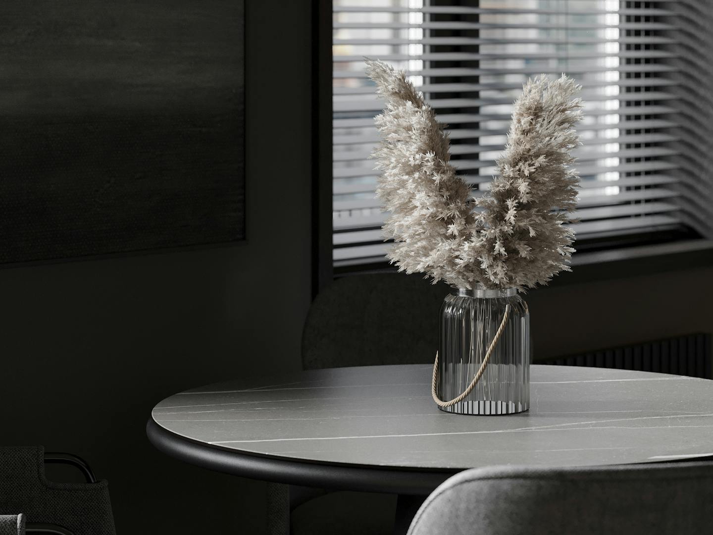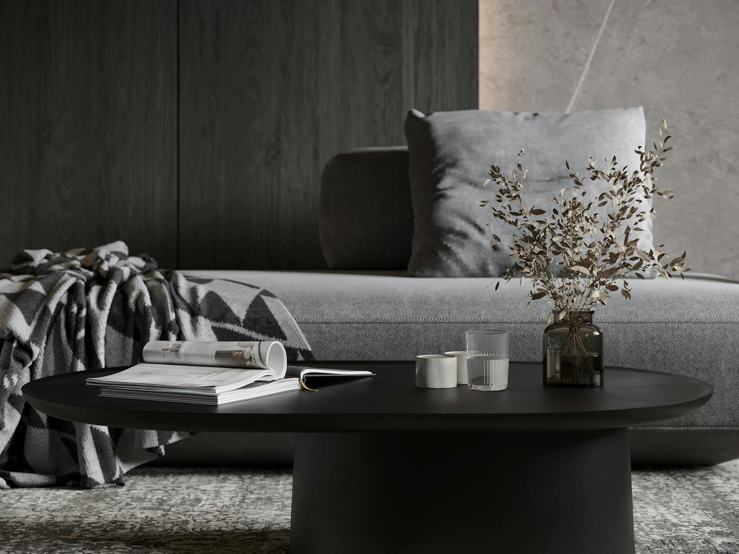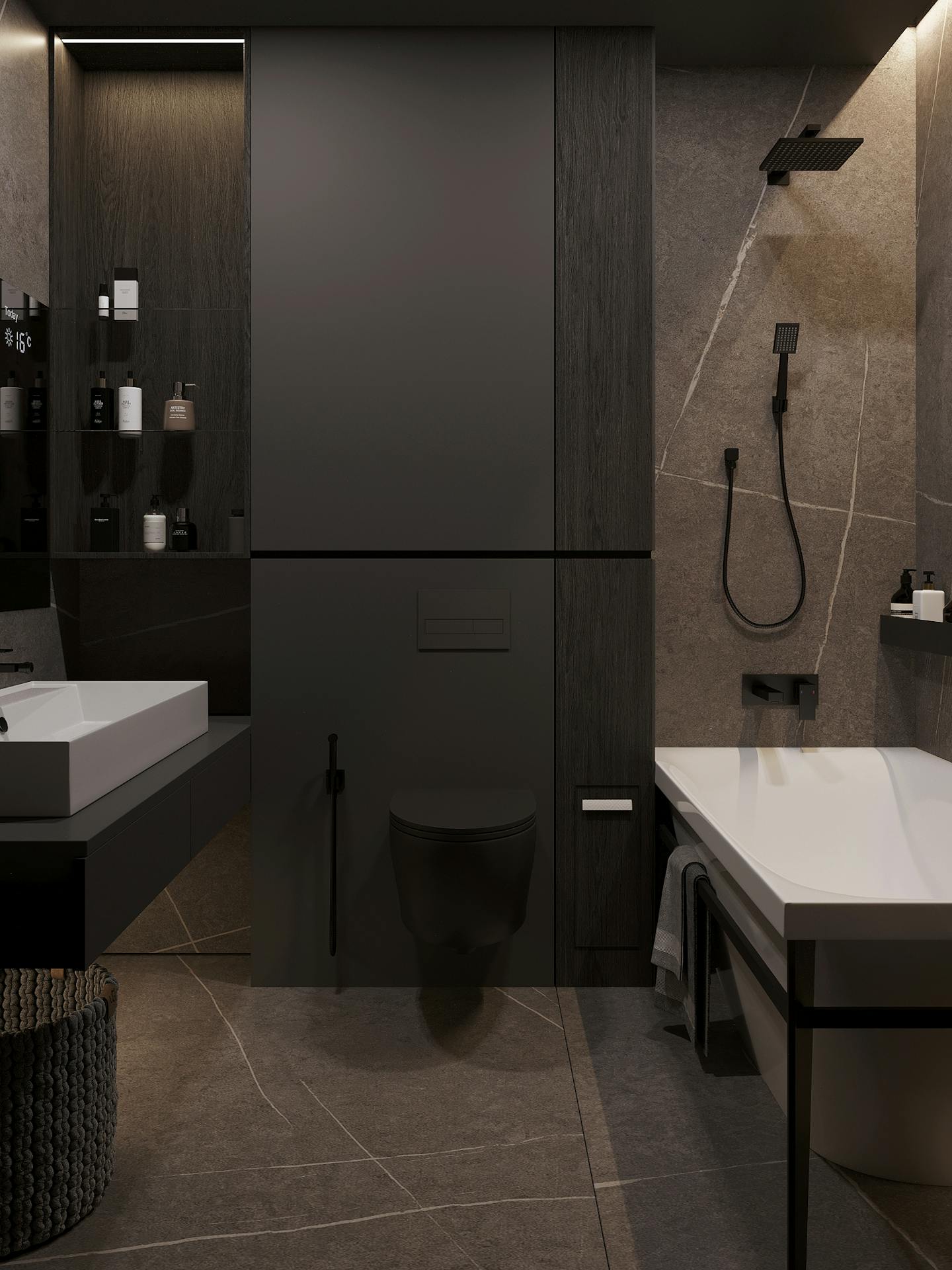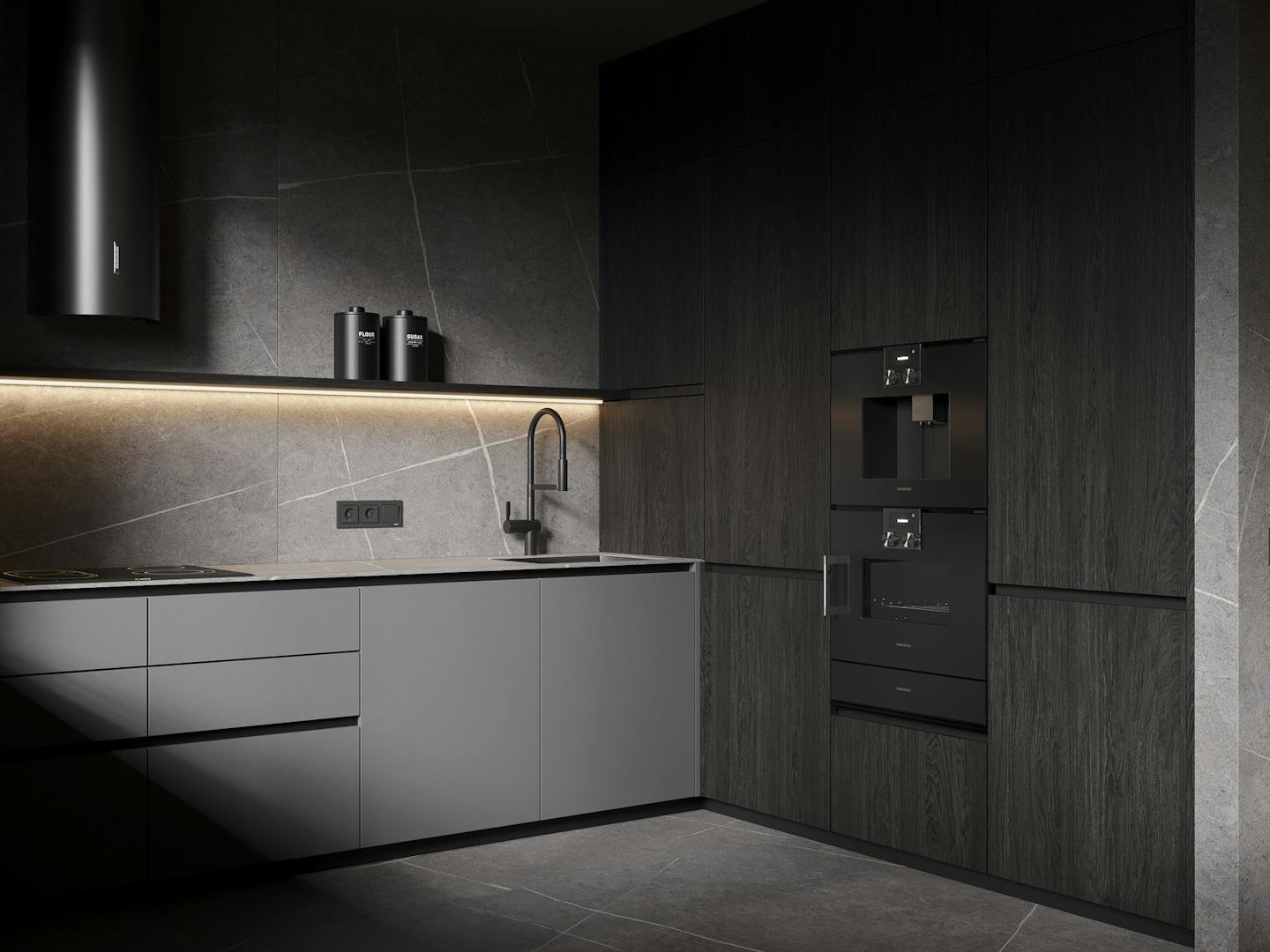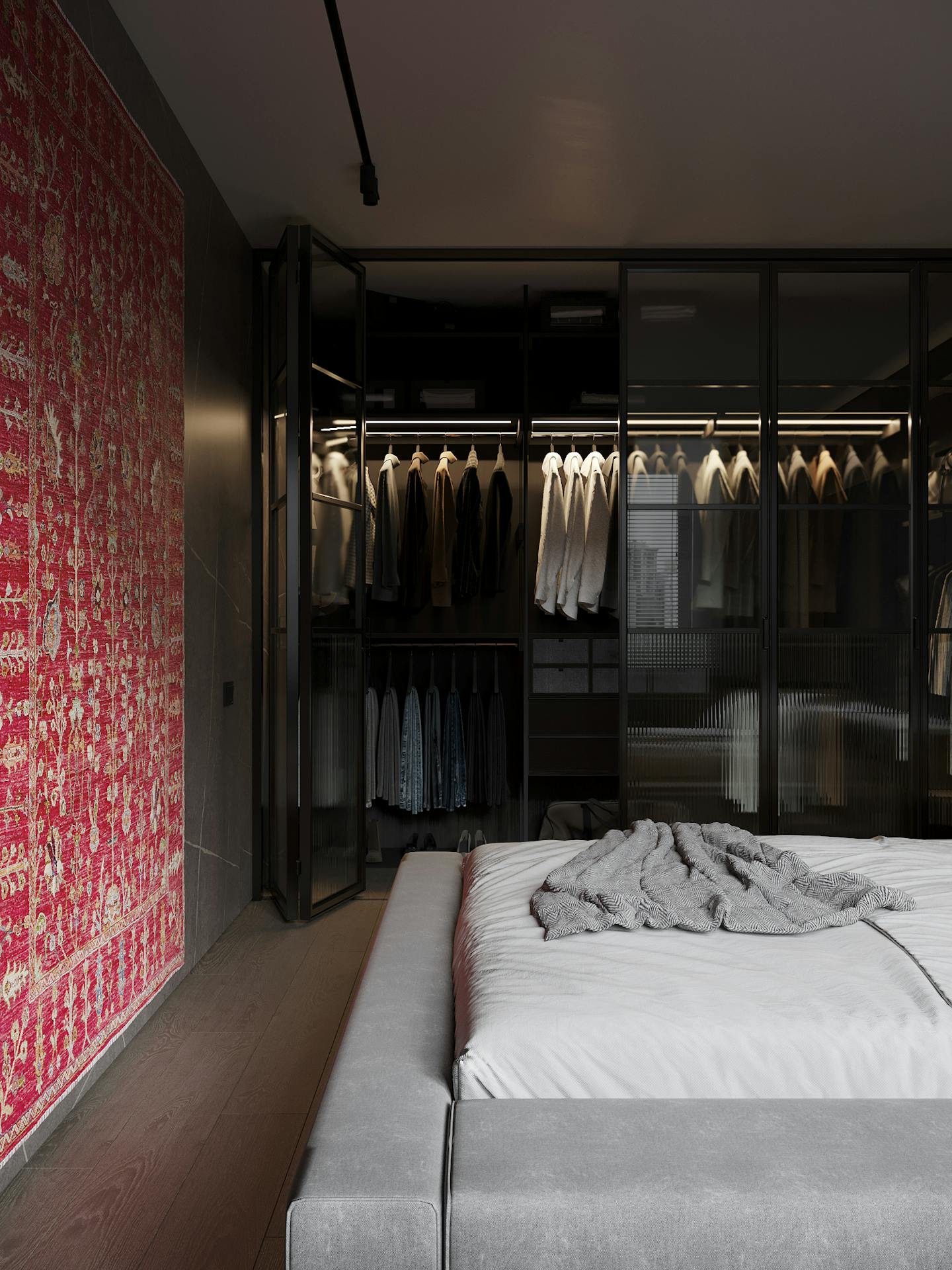Таинственный и уютный интерьер с преобладанием серых оттенков – один из самых сложных проектов. В основу его легла теория о черном цвете, который поглощает весь свет, ничего не отражая. Темный интерьер формирует атмосферу таинственности и эмоциональную безопасность.