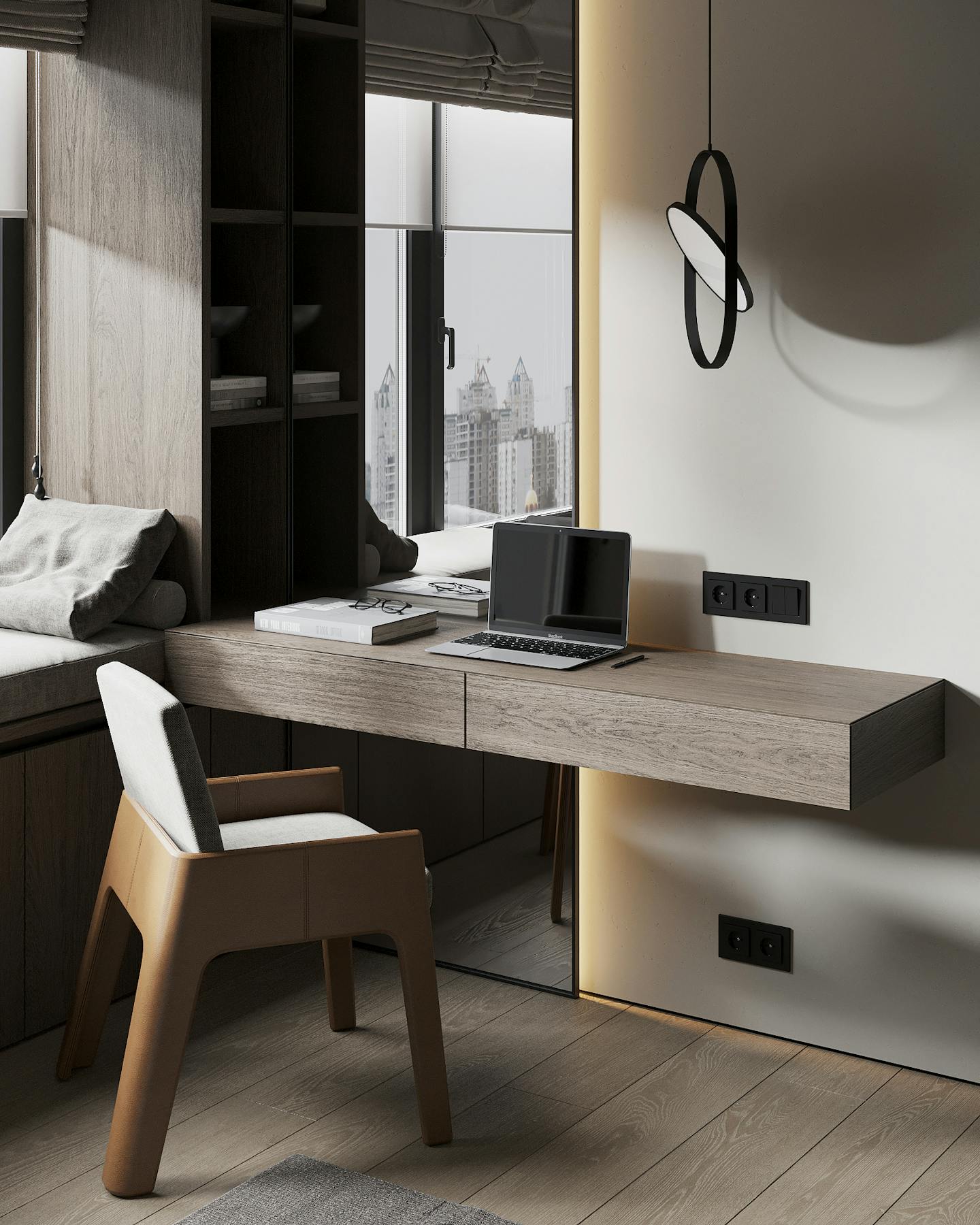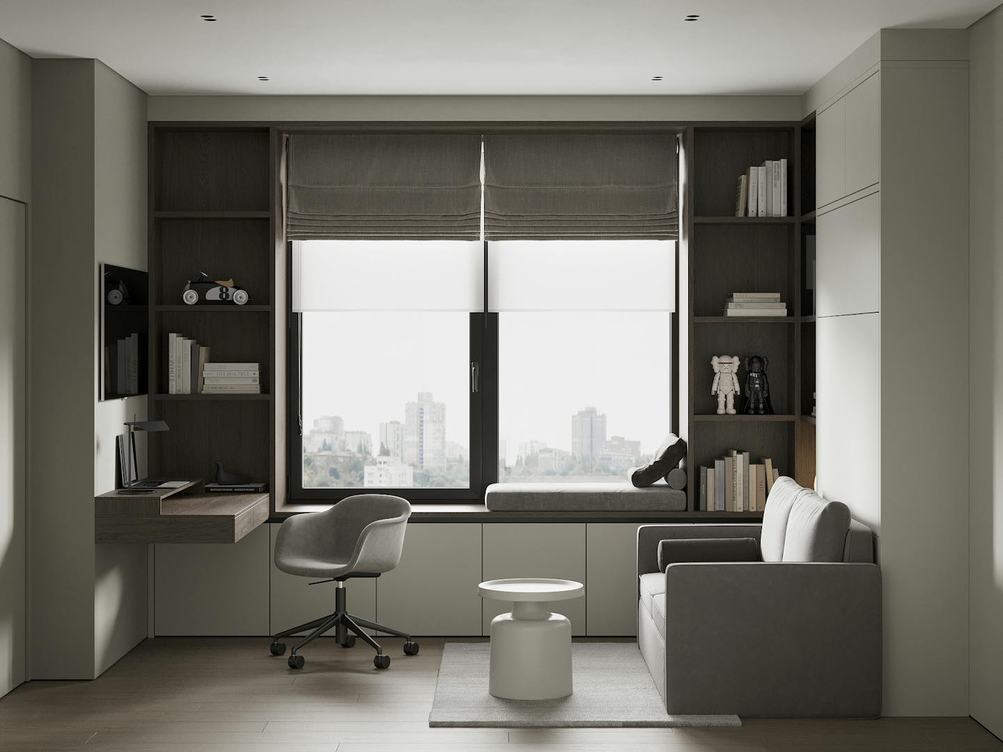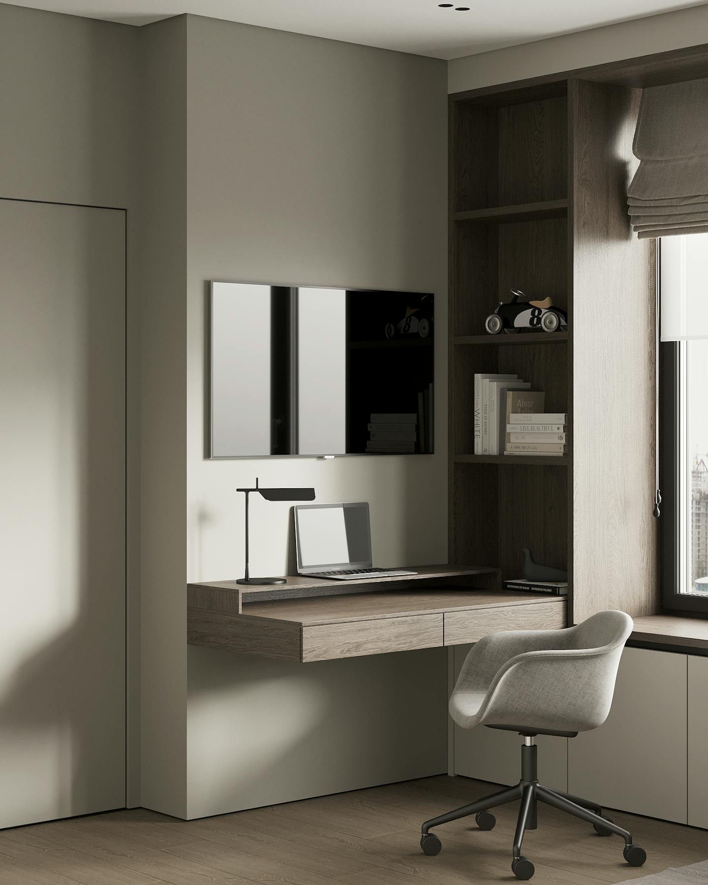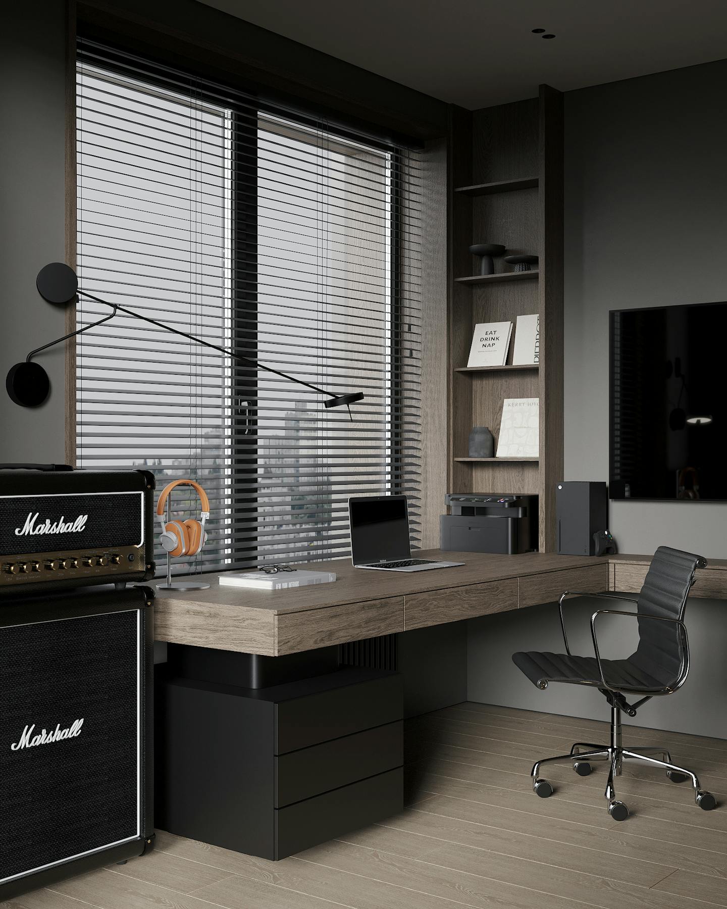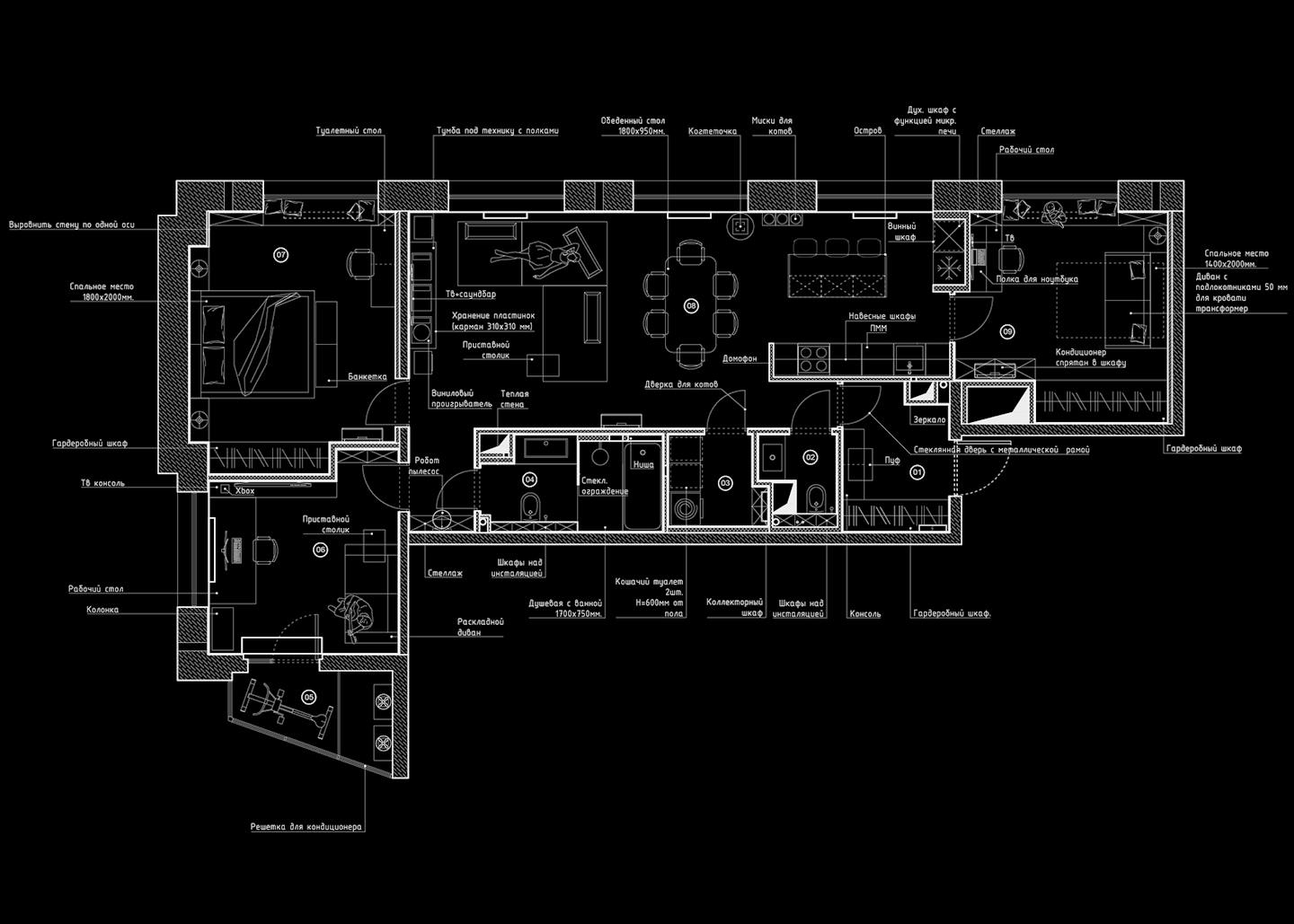В квартире почти идеальная планировка: спальни разнесены в разные стороны, центральная большая часть – кухня-гостиная, отдельная прихожая и кабинет. Удачно расположены санузлы и постирочная. Трое членов семьи встречаются в просторной обеденной зоне и всегда могут уединиться у себя в комнате.