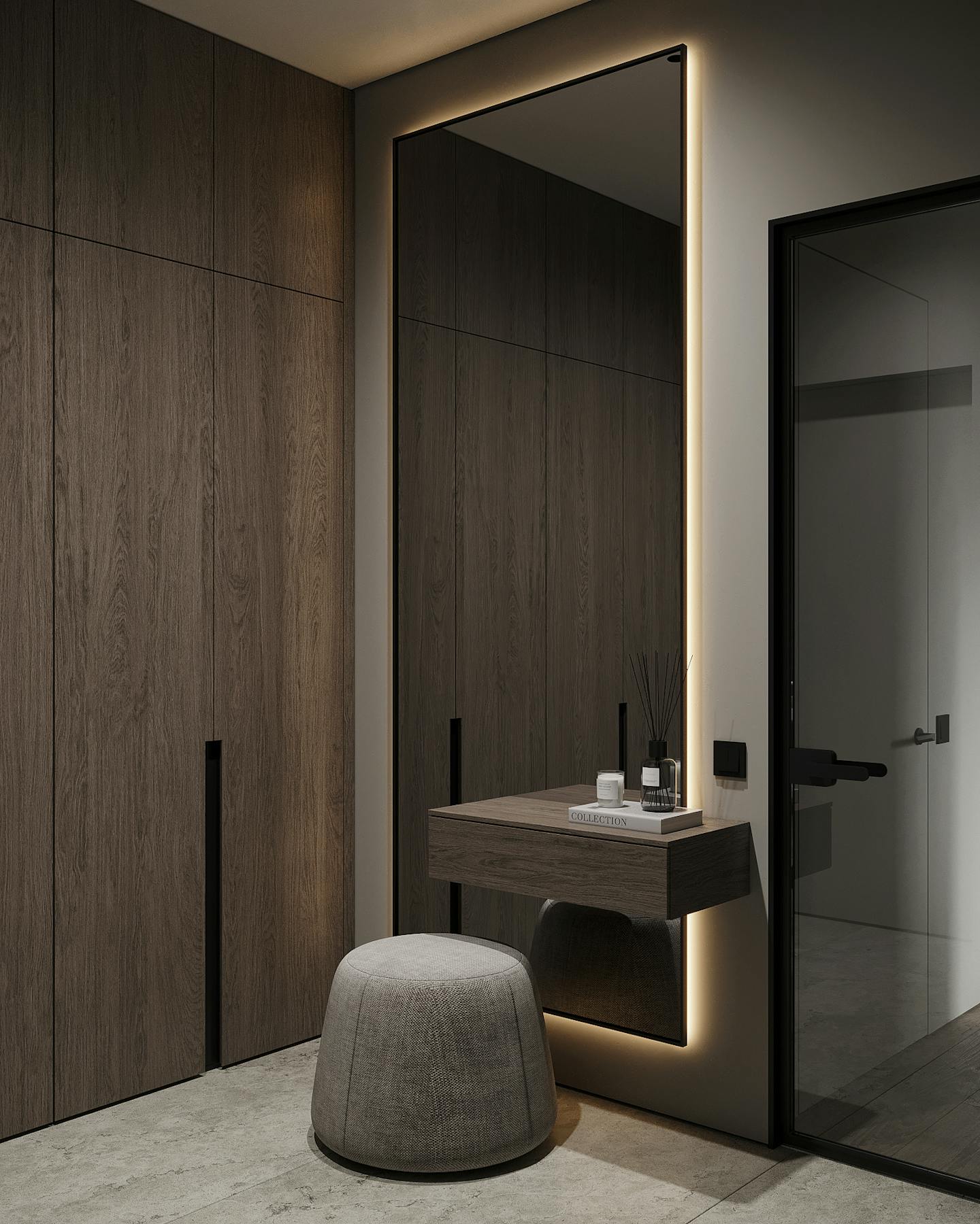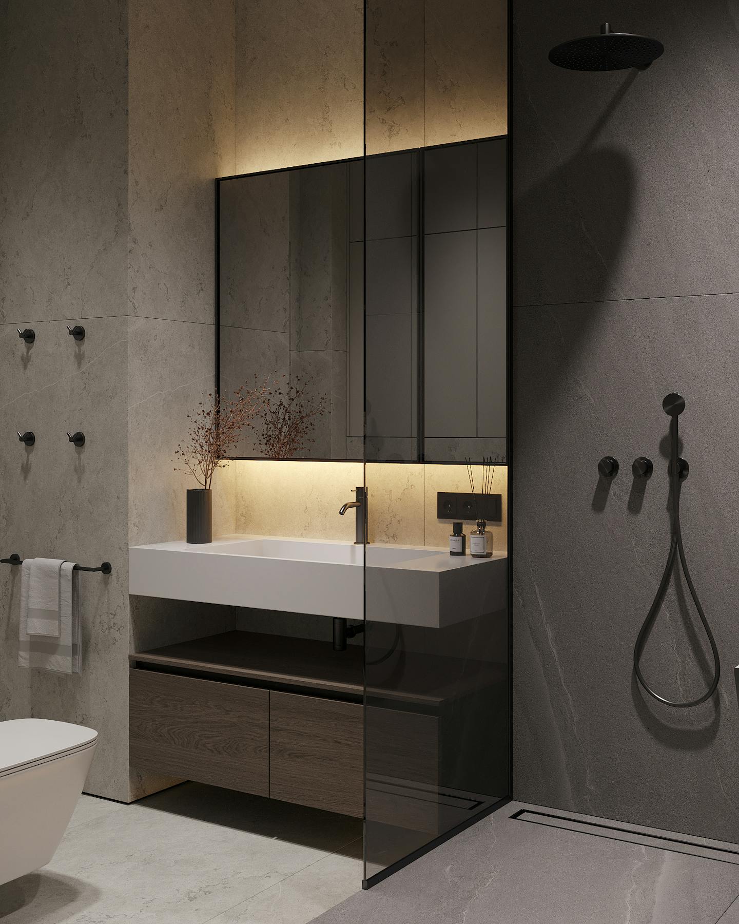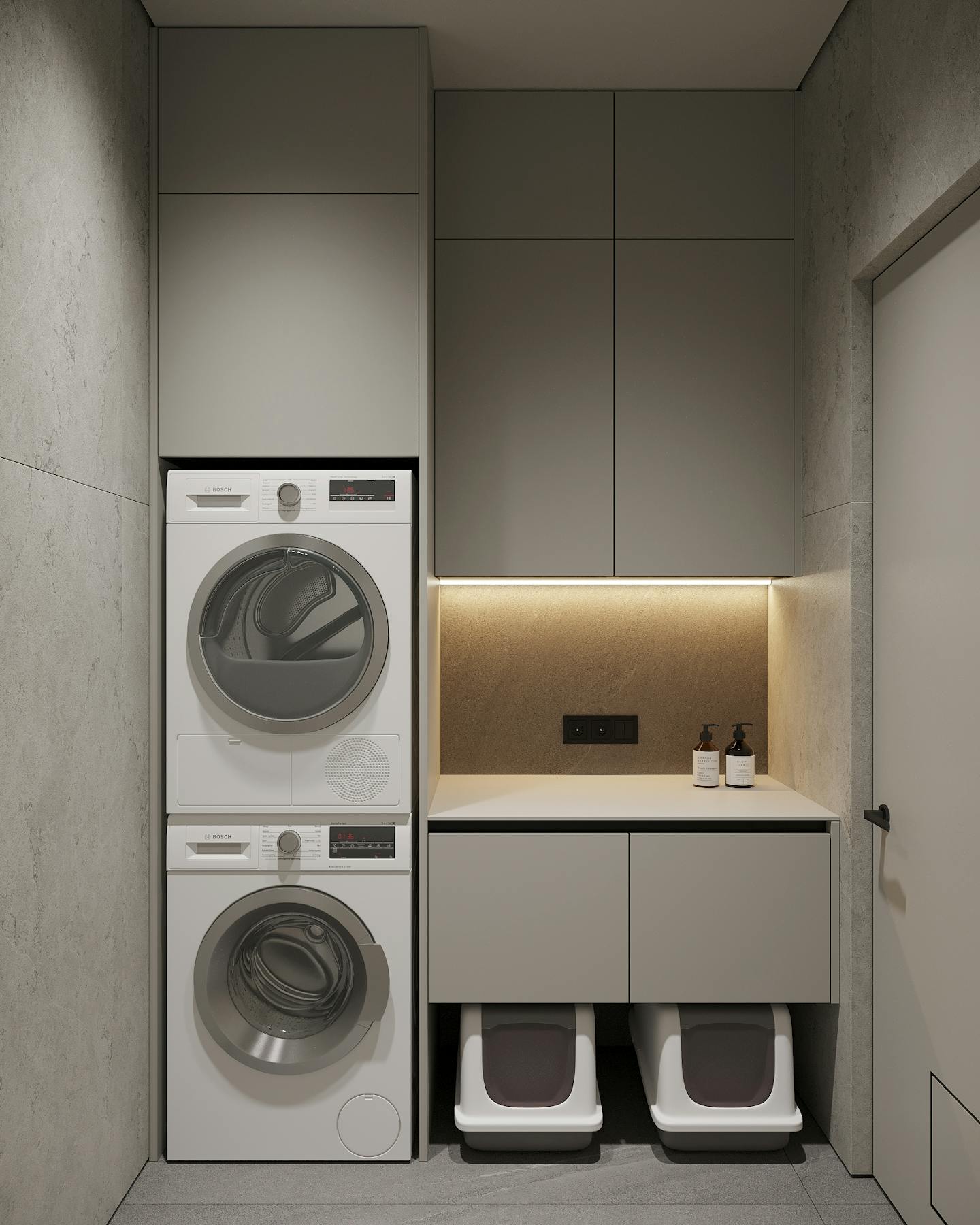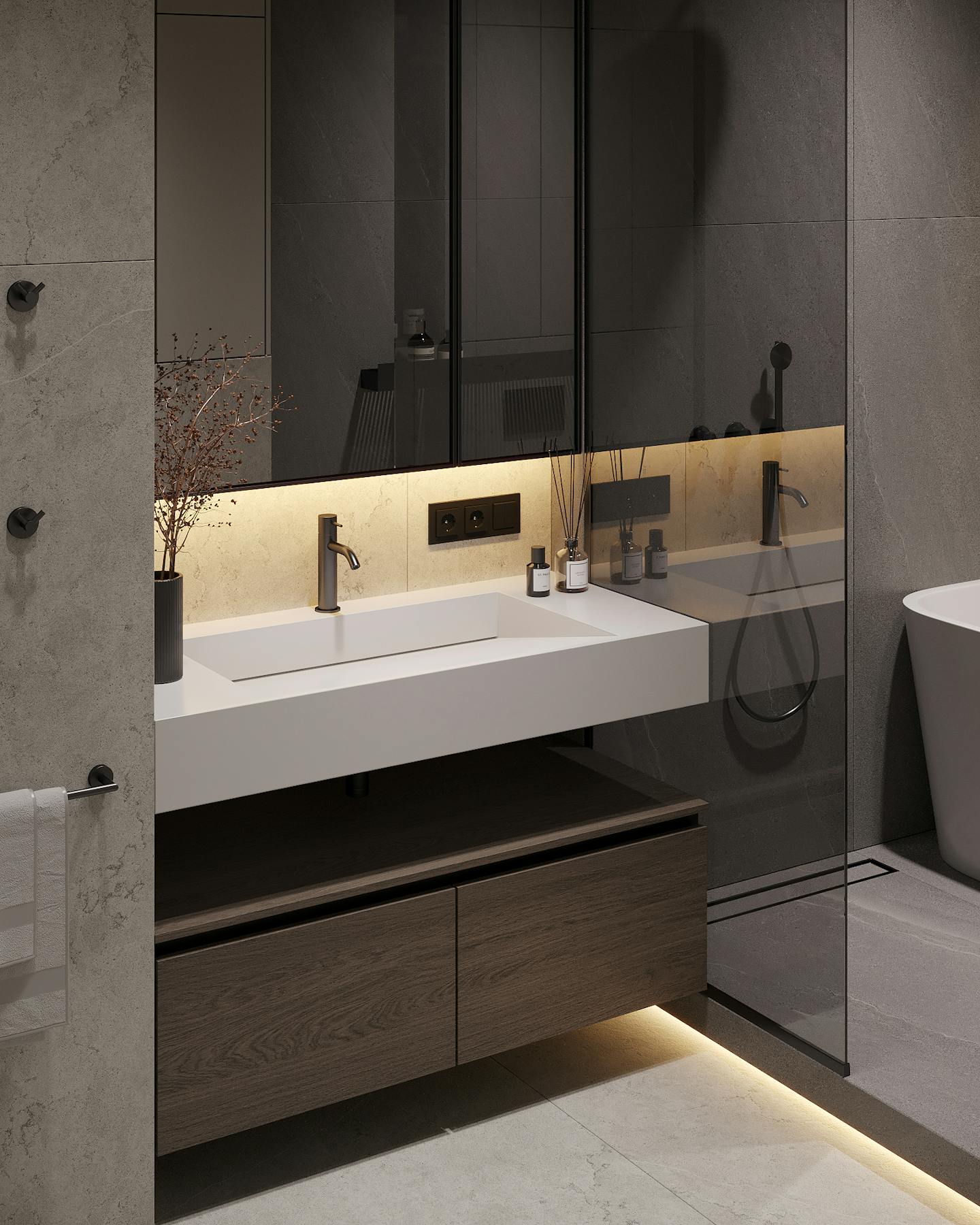 В квартире почти идеальная планировка: спальни разнесены в разные стороны, центральная большая часть – кухня-гостиная, отдельная прихожая и кабинет. Удачно расположены санузлы и постирочная. Трое членов семьи встречаются в просторной обеденной зоне и всегда могут уединиться у себя в комнате.