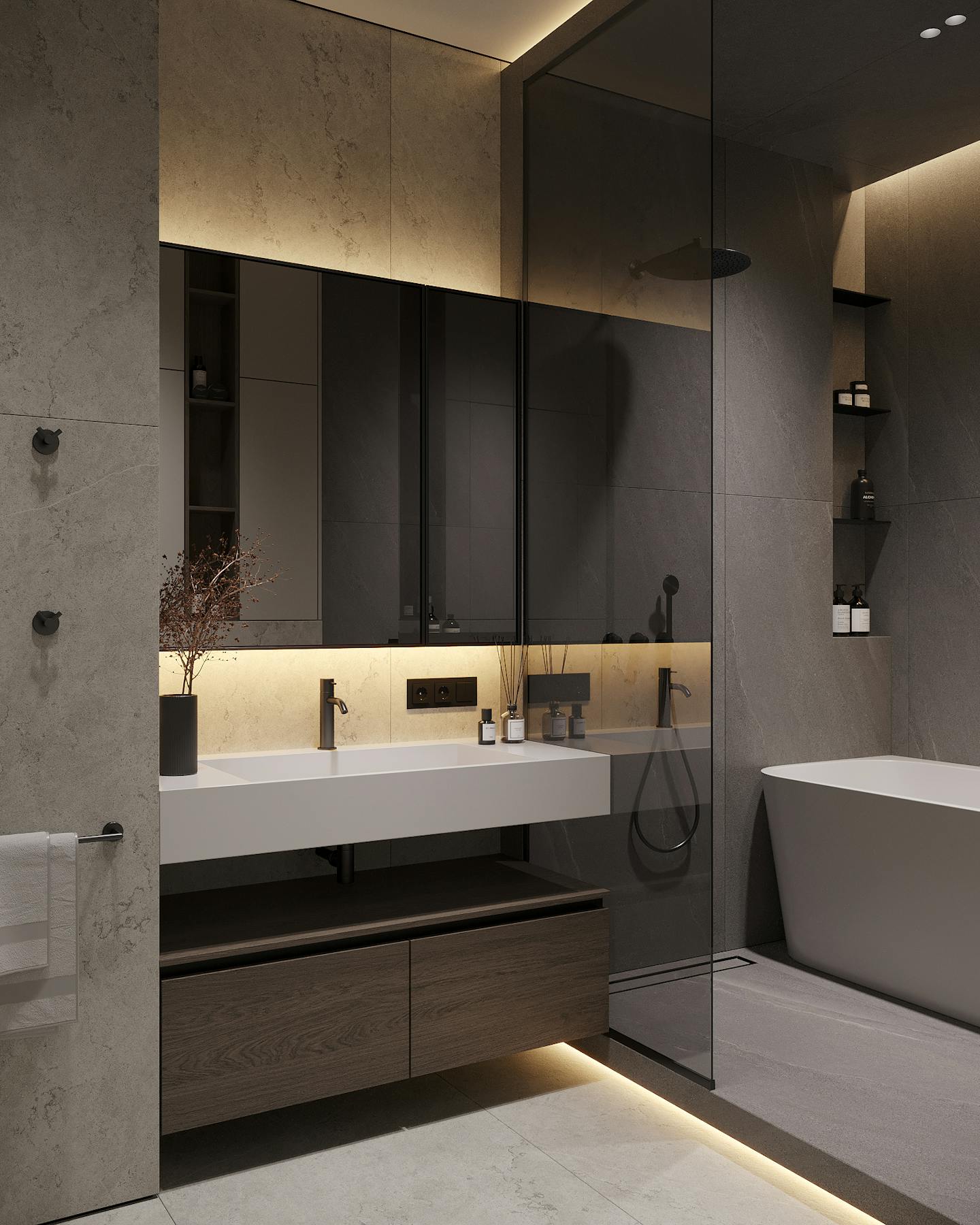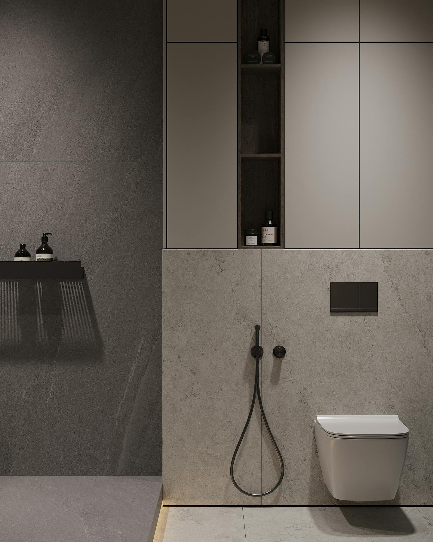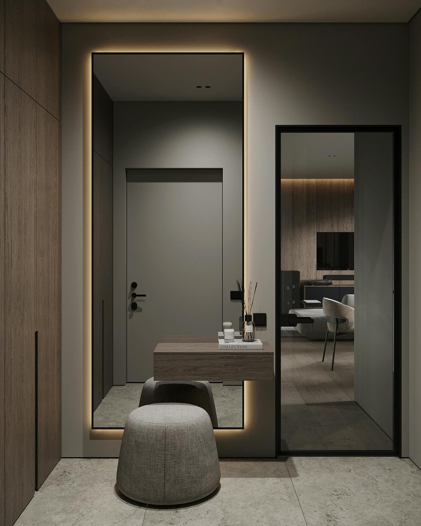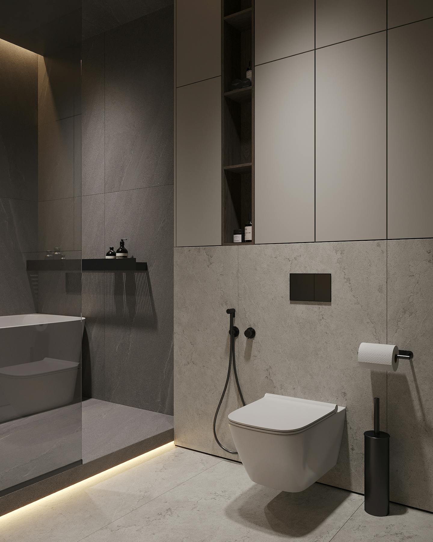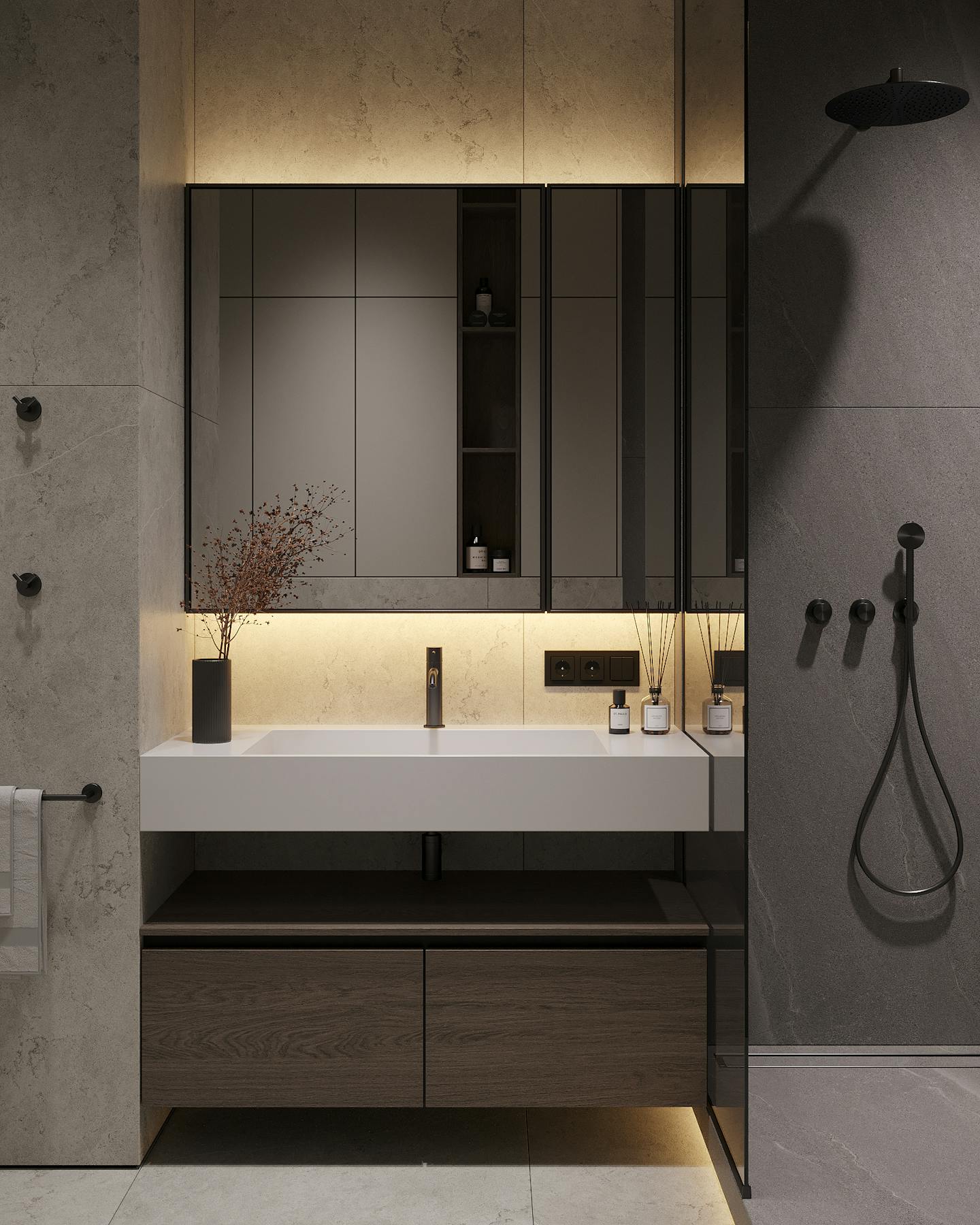 В квартире почти идеальная планировка: спальни разнесены в разные стороны, центральная большая часть – кухня-гостиная, отдельная прихожая и кабинет. Удачно расположены санузлы и постирочная. Трое членов семьи встречаются в просторной обеденной зоне и всегда могут уединиться у себя в комнате.
