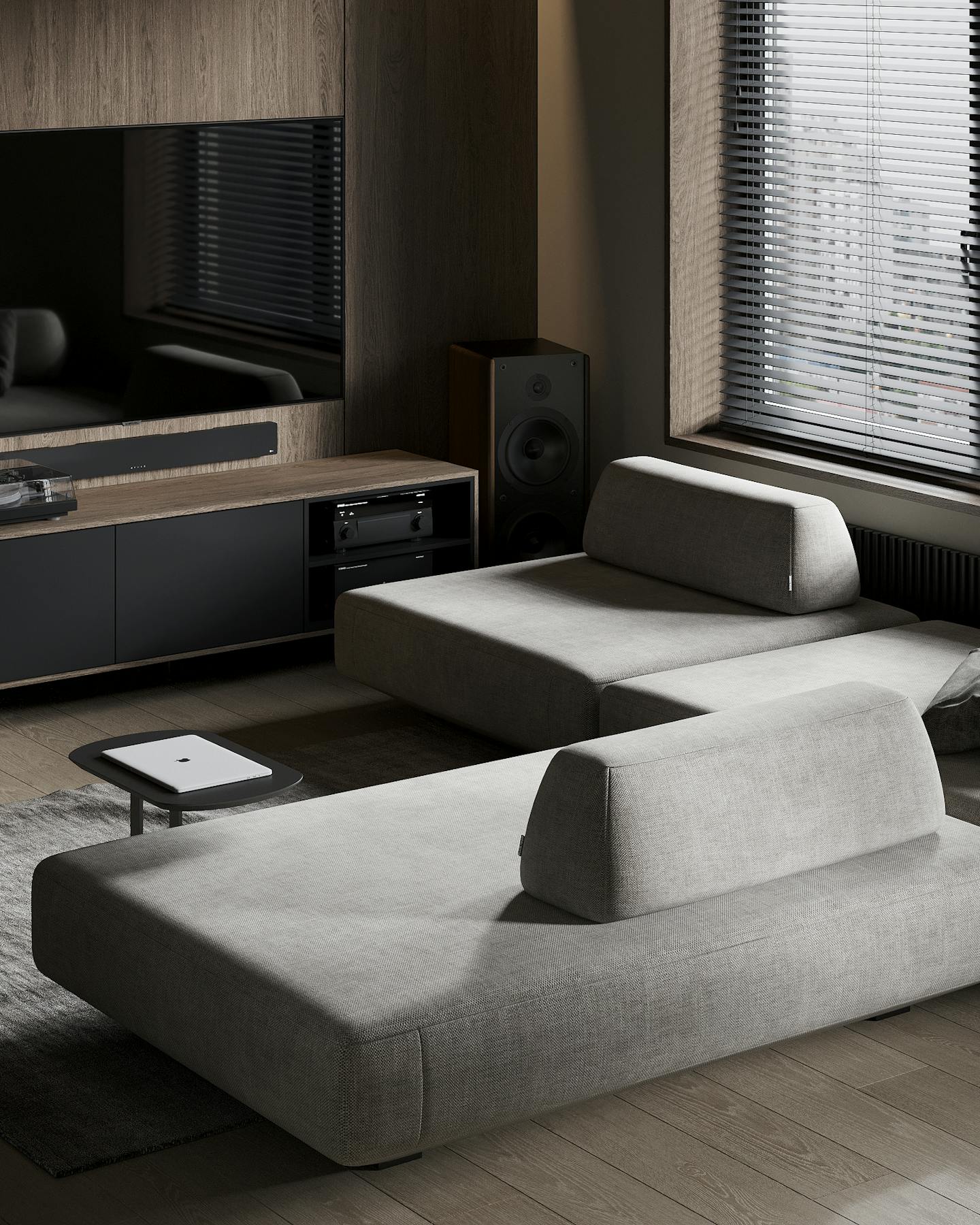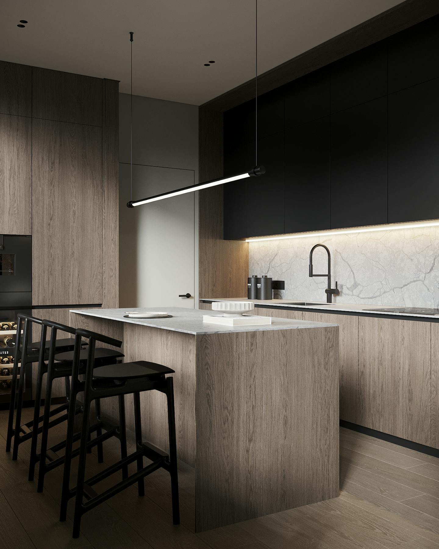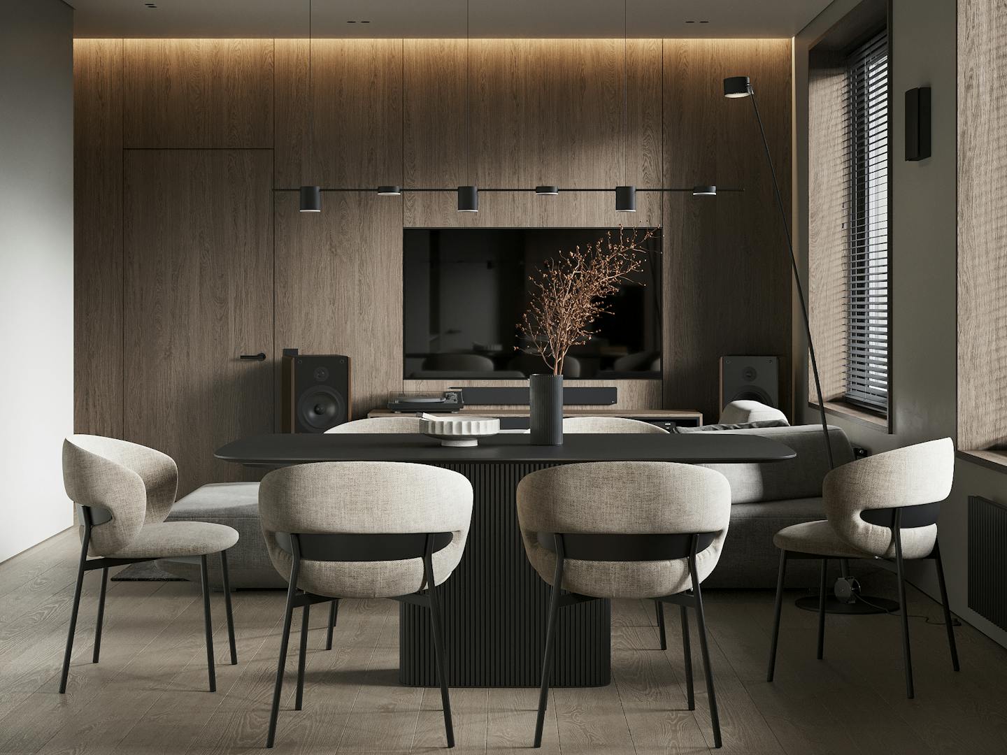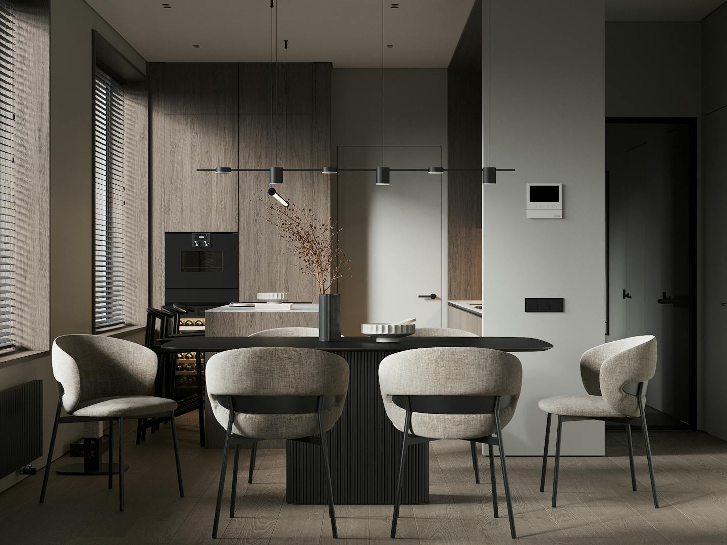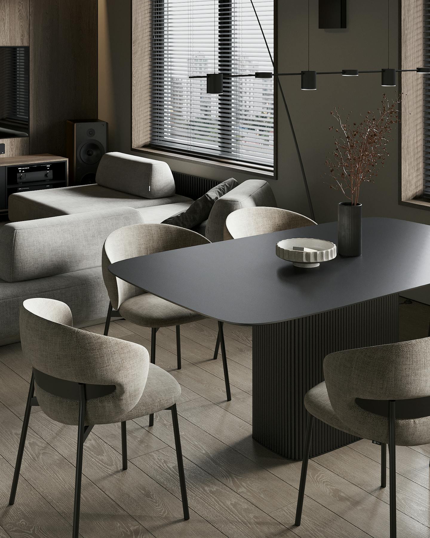 Строгий минималистичный объем, в котором комфортно расположились большой обеденный стол (180см), остров (180х80см), кухня с отдельностоящими пеналами, удобный диван с зоной тв и акустикой.