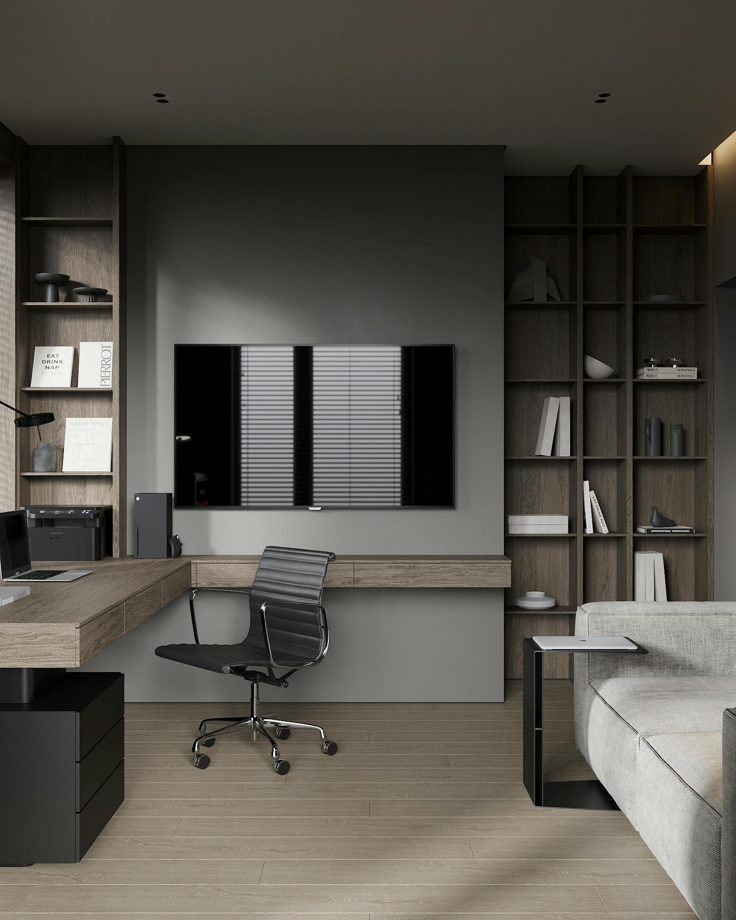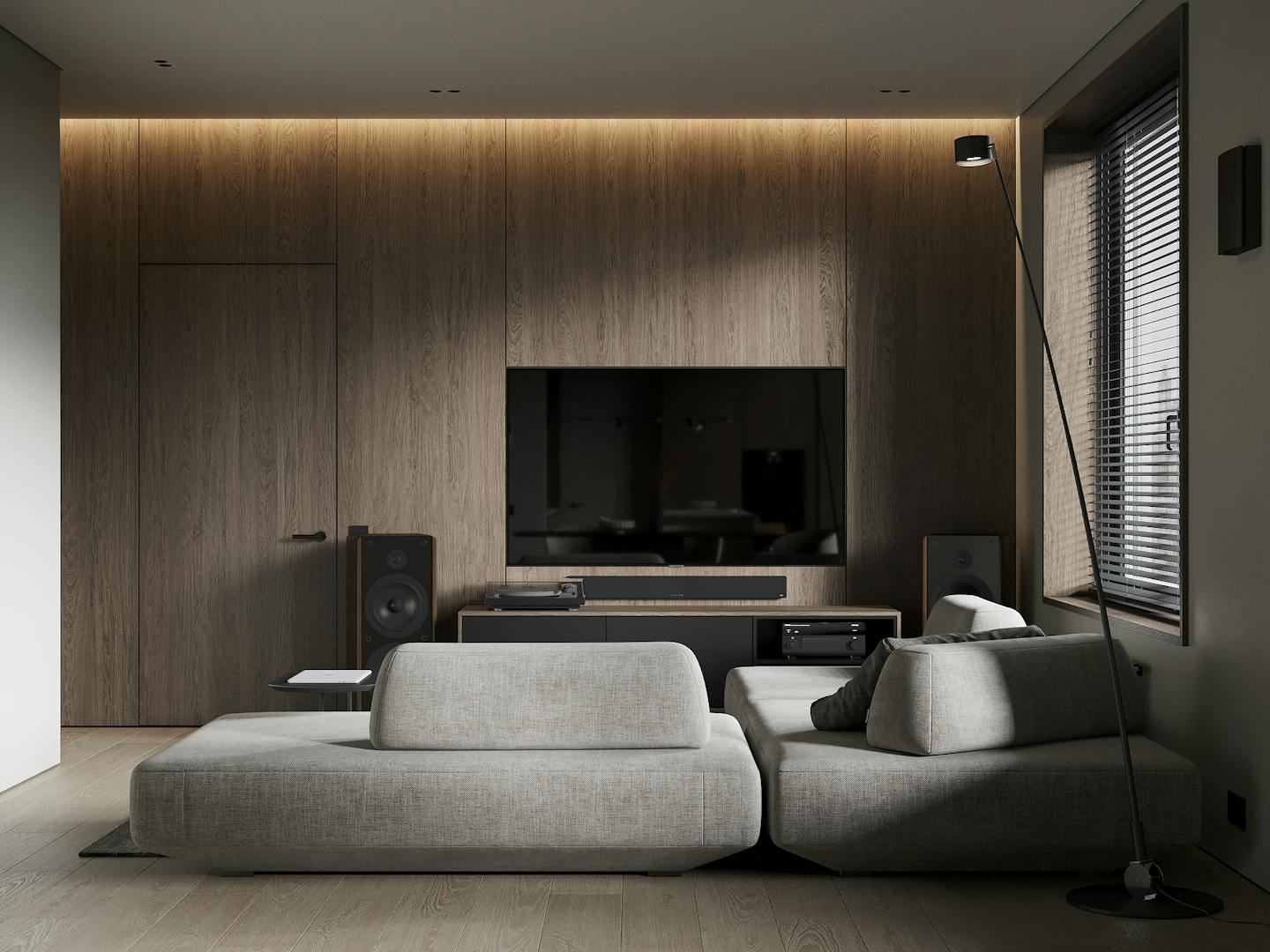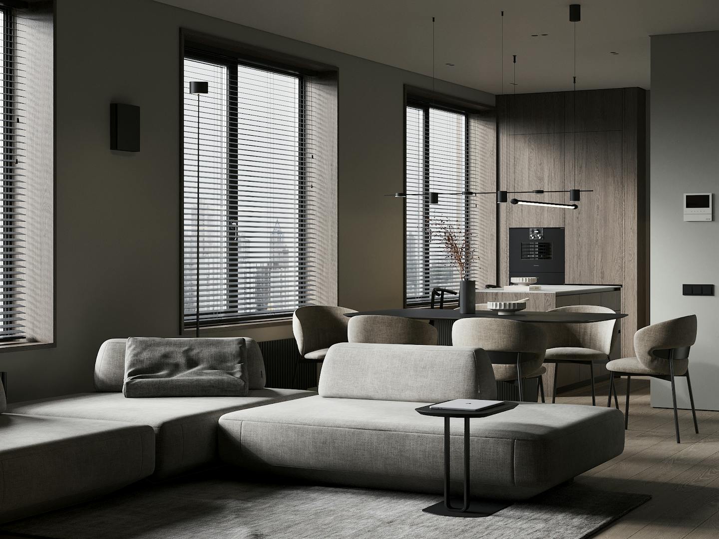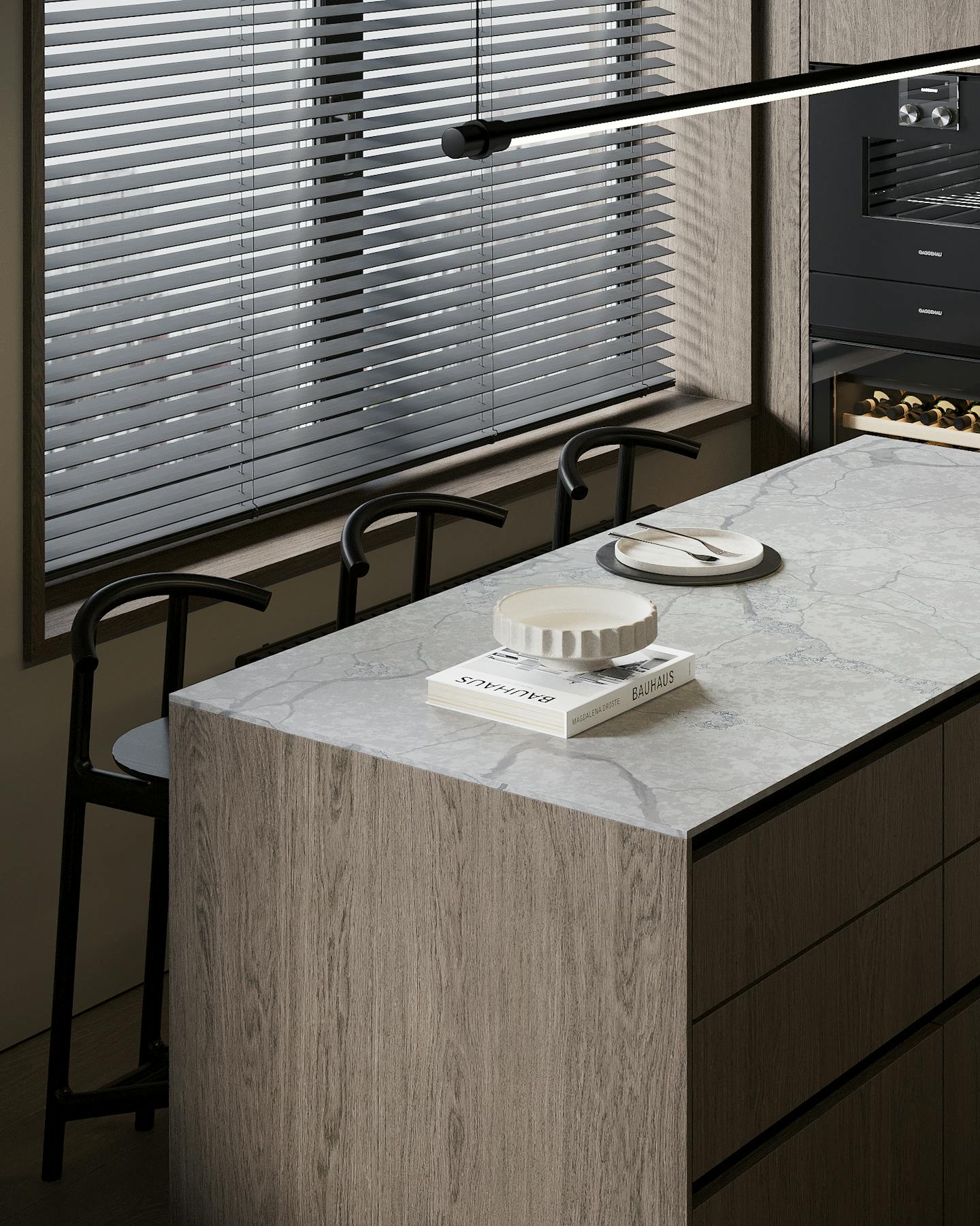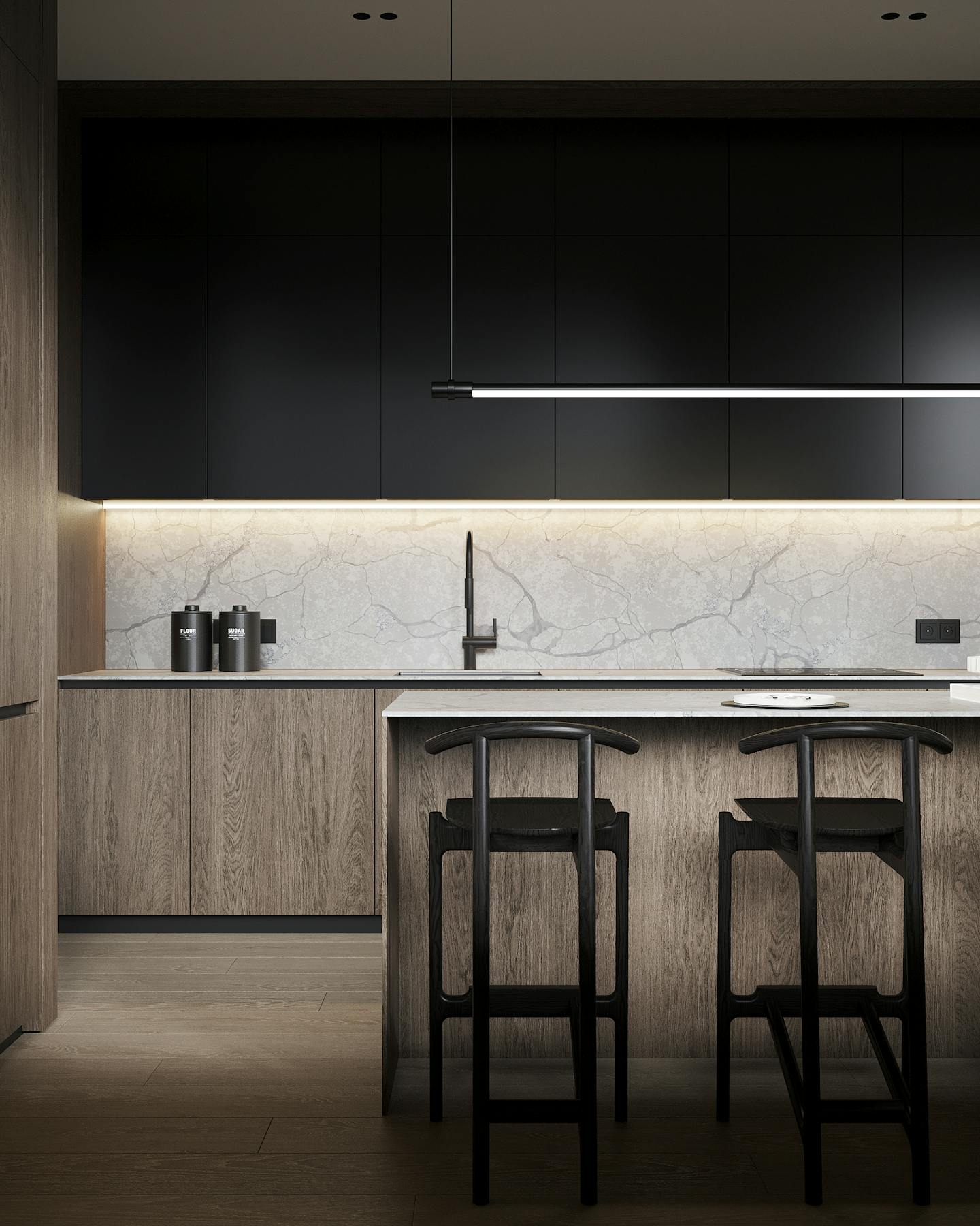 Строгий минималистичный объем, в котором комфортно расположились большой обеденный стол (180см), остров (180х80см), кухня с отдельностоящими пеналами, удобный диван с зоной тв и акустикой.