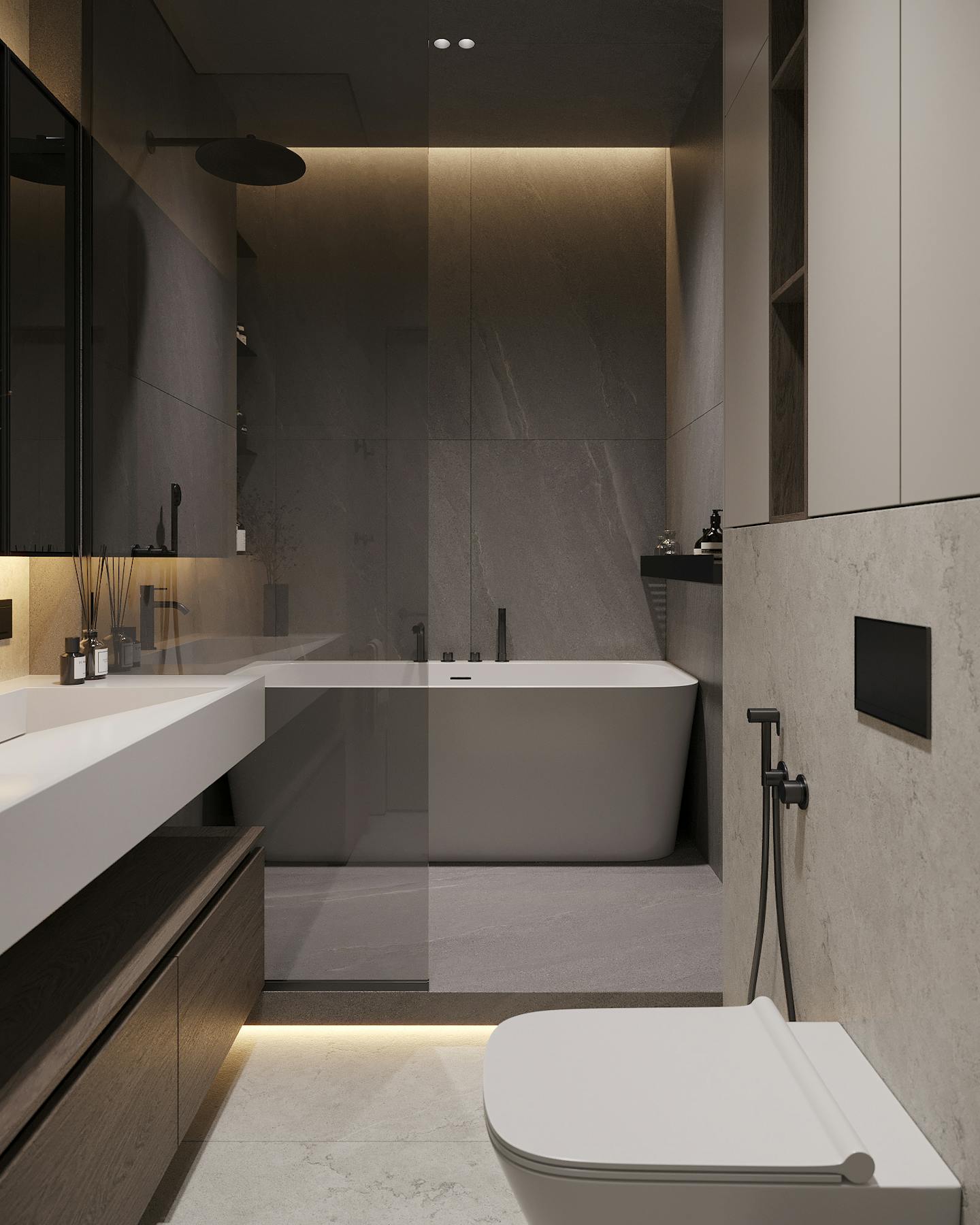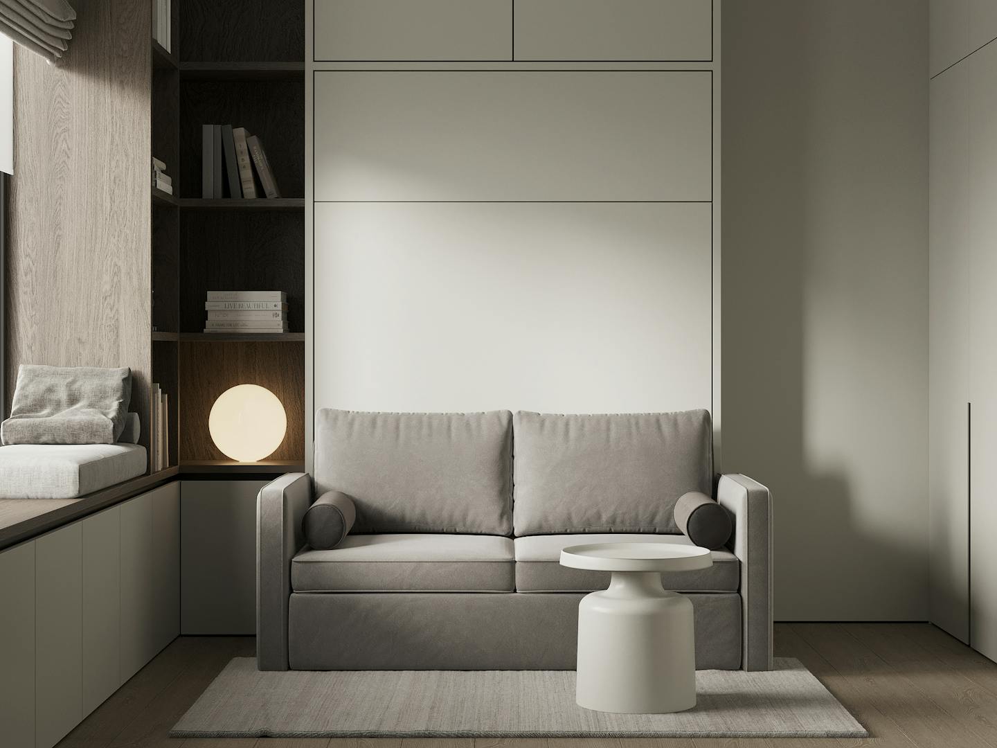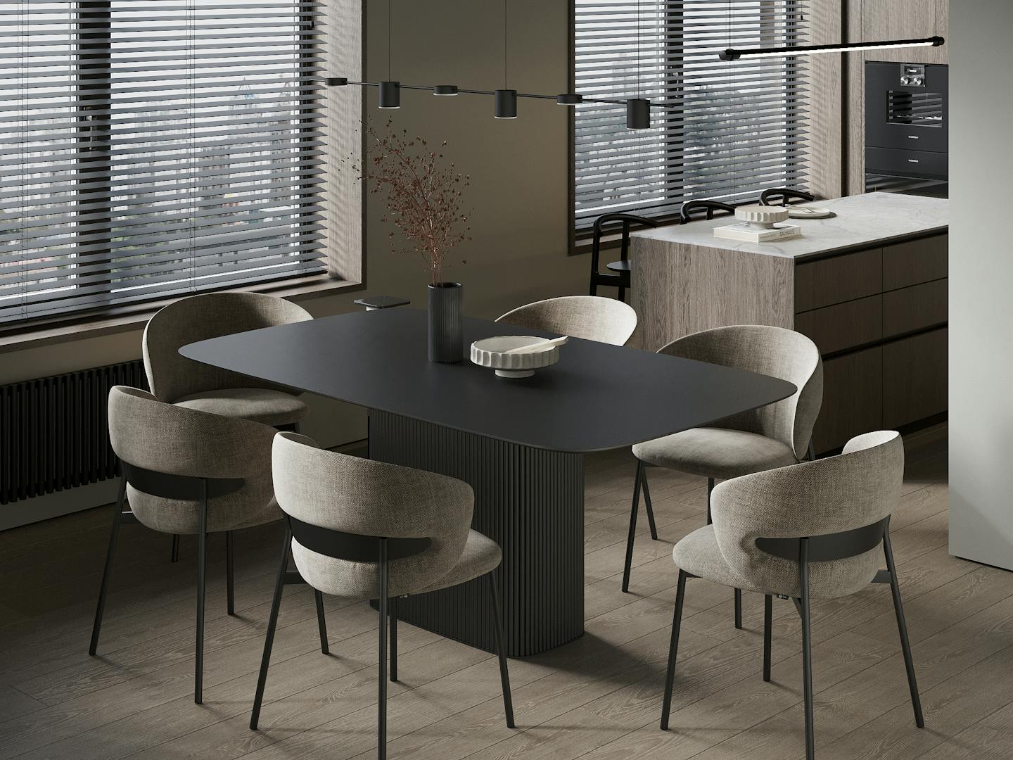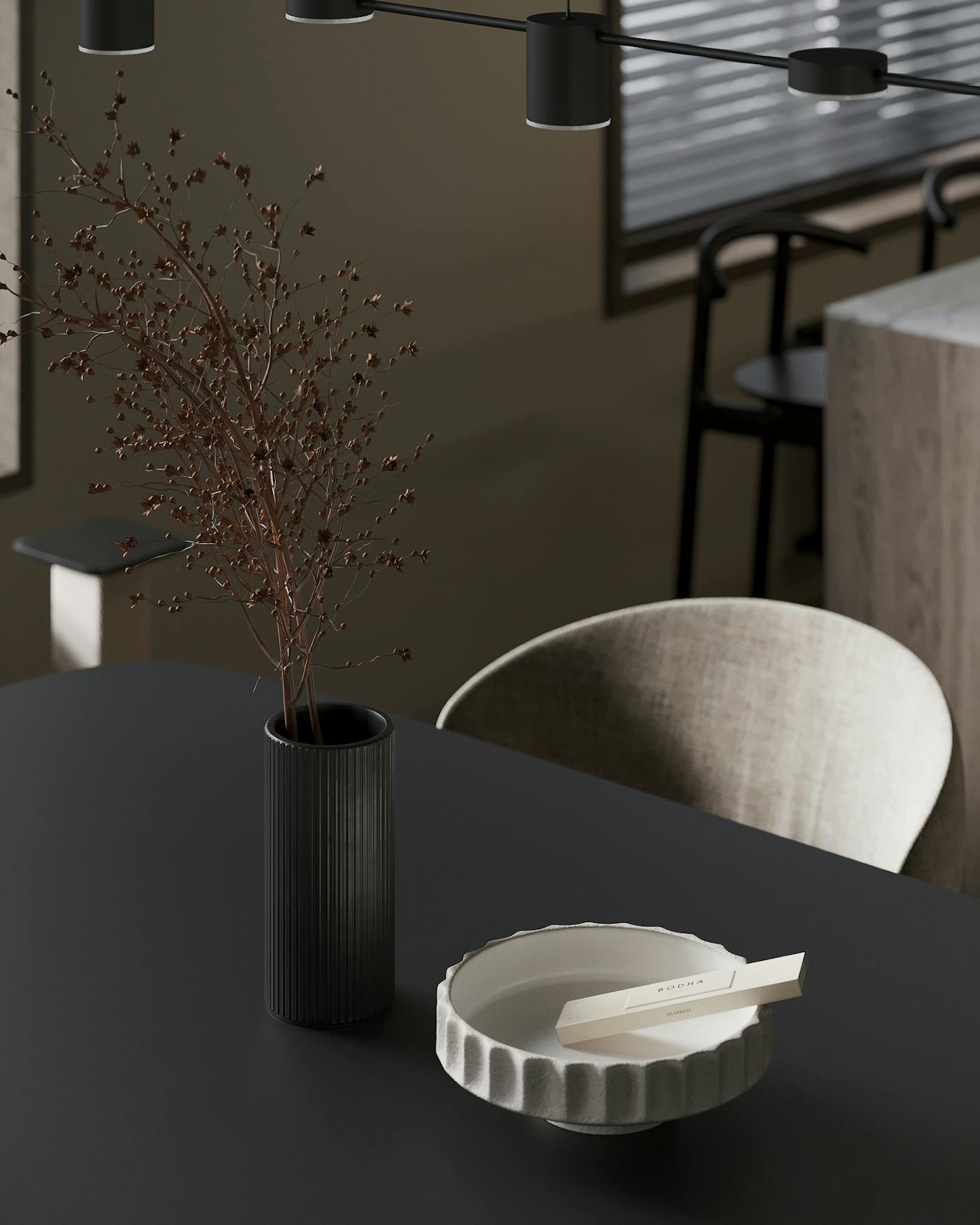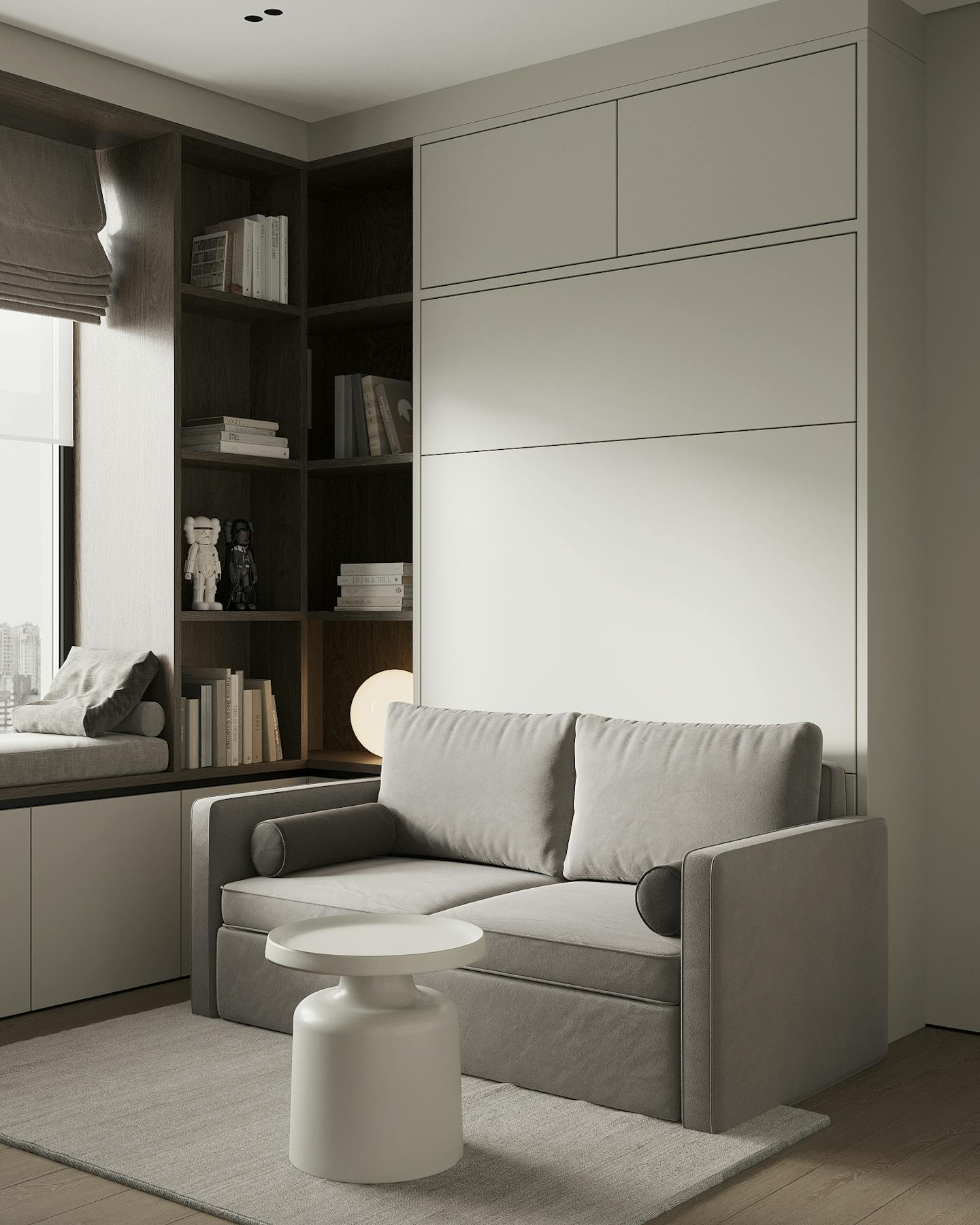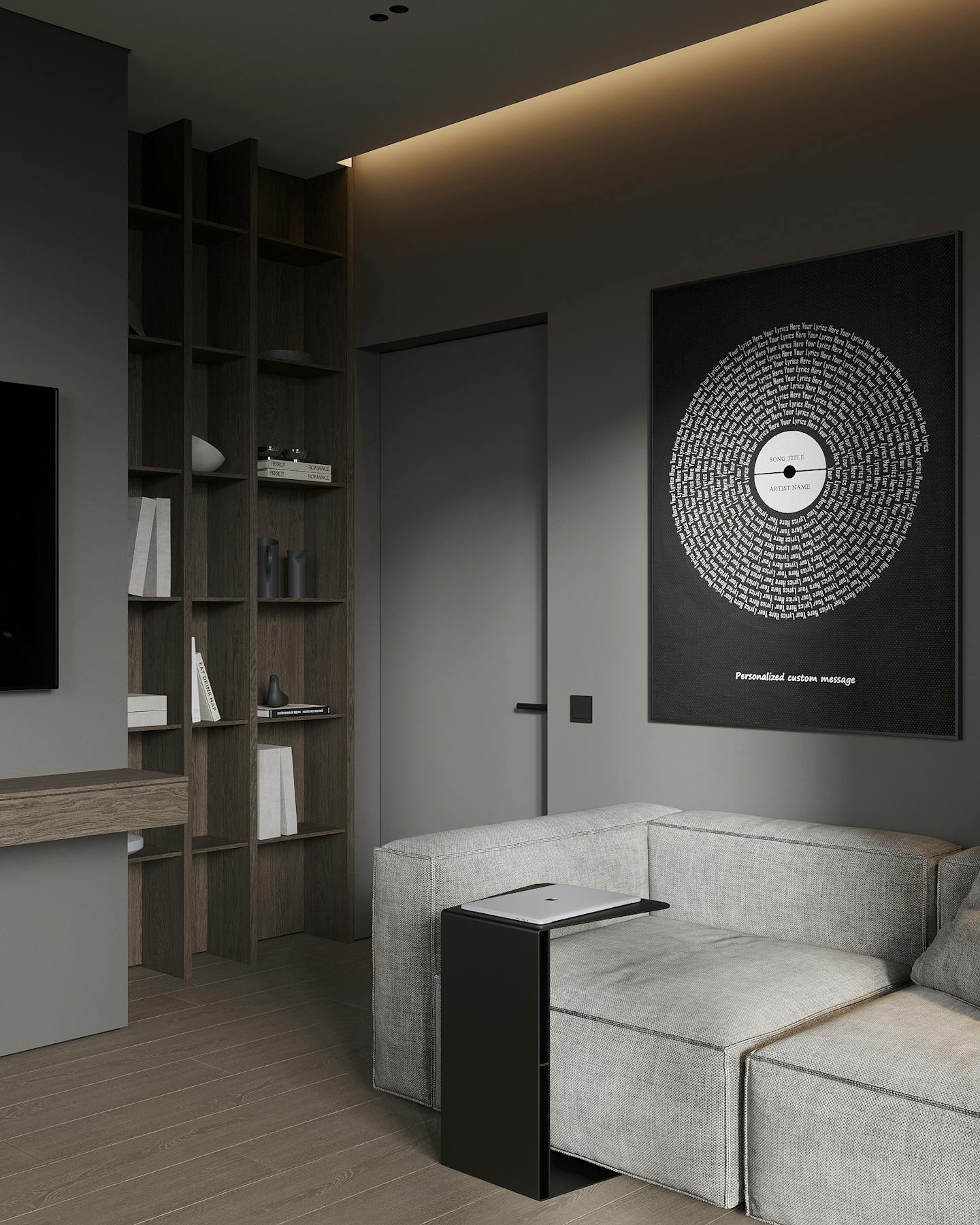 Строгий минималистичный объем, в котором комфортно расположились большой обеденный стол (180см), остров (180х80см), кухня с отдельностоящими пеналами, удобный диван с зоной тв и акустикой.