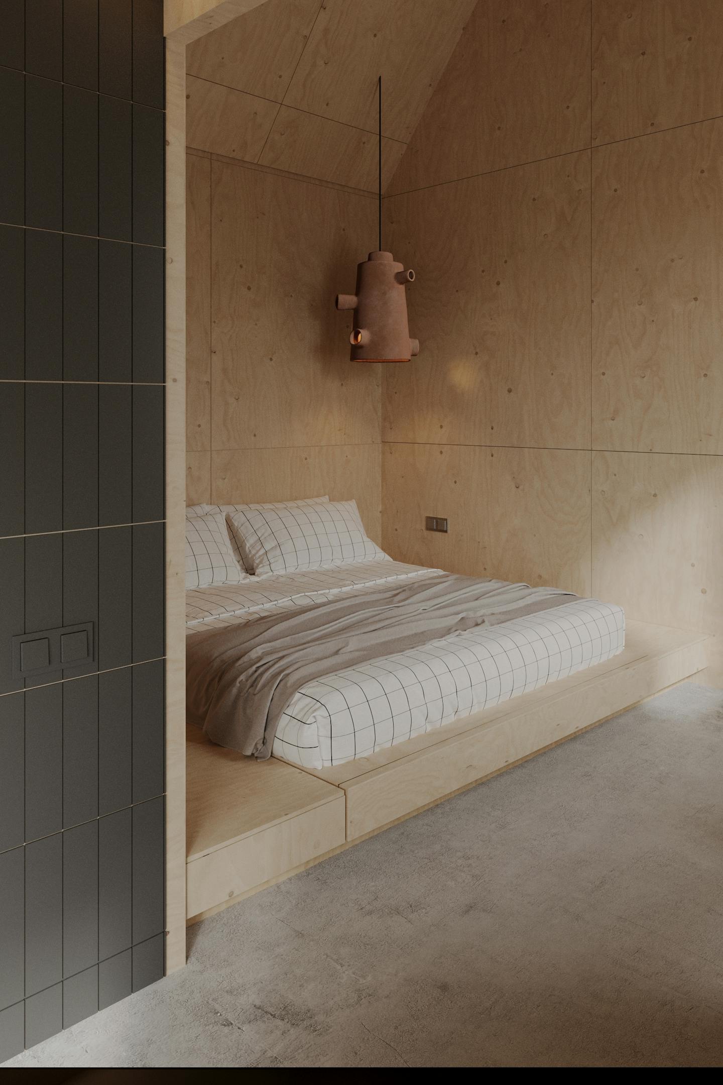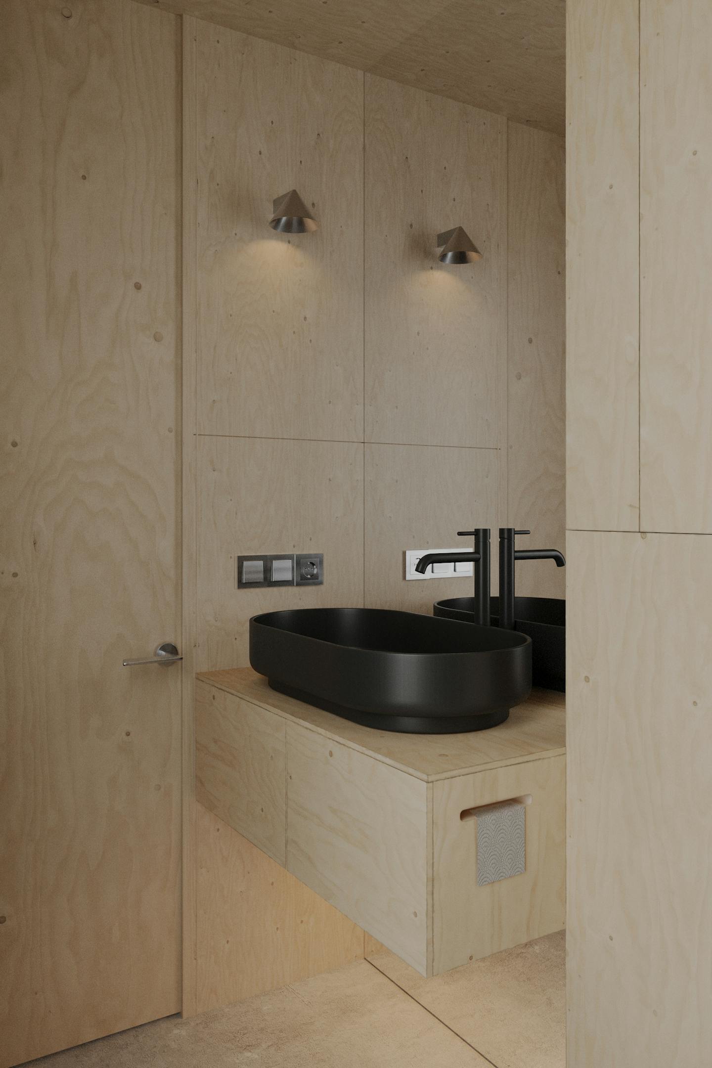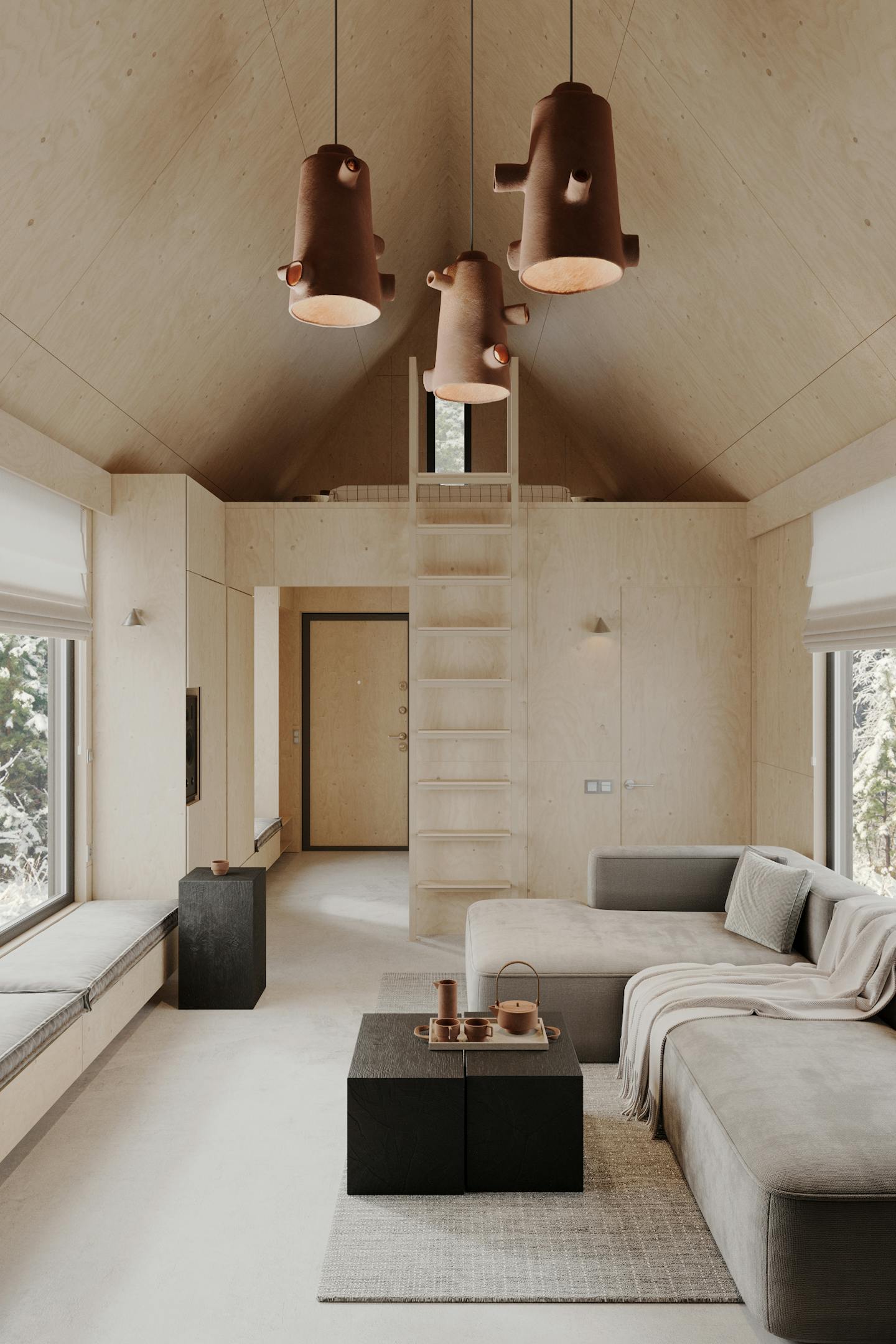 ■ Стиль и атмосфера: интерьер выполнен в чистом Barn Style с сильным уклоном в современный минимализм. Атмосфера уютная, обволакивающая и “ламповая”, благодаря доминированию натурального дерева. Цветовая палитра монохромная и сдержанная: тёплый, светлый натуральный цвет фанеры и дерева, контрастирующий с глубоким чёрным.