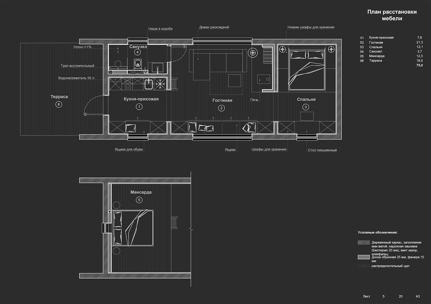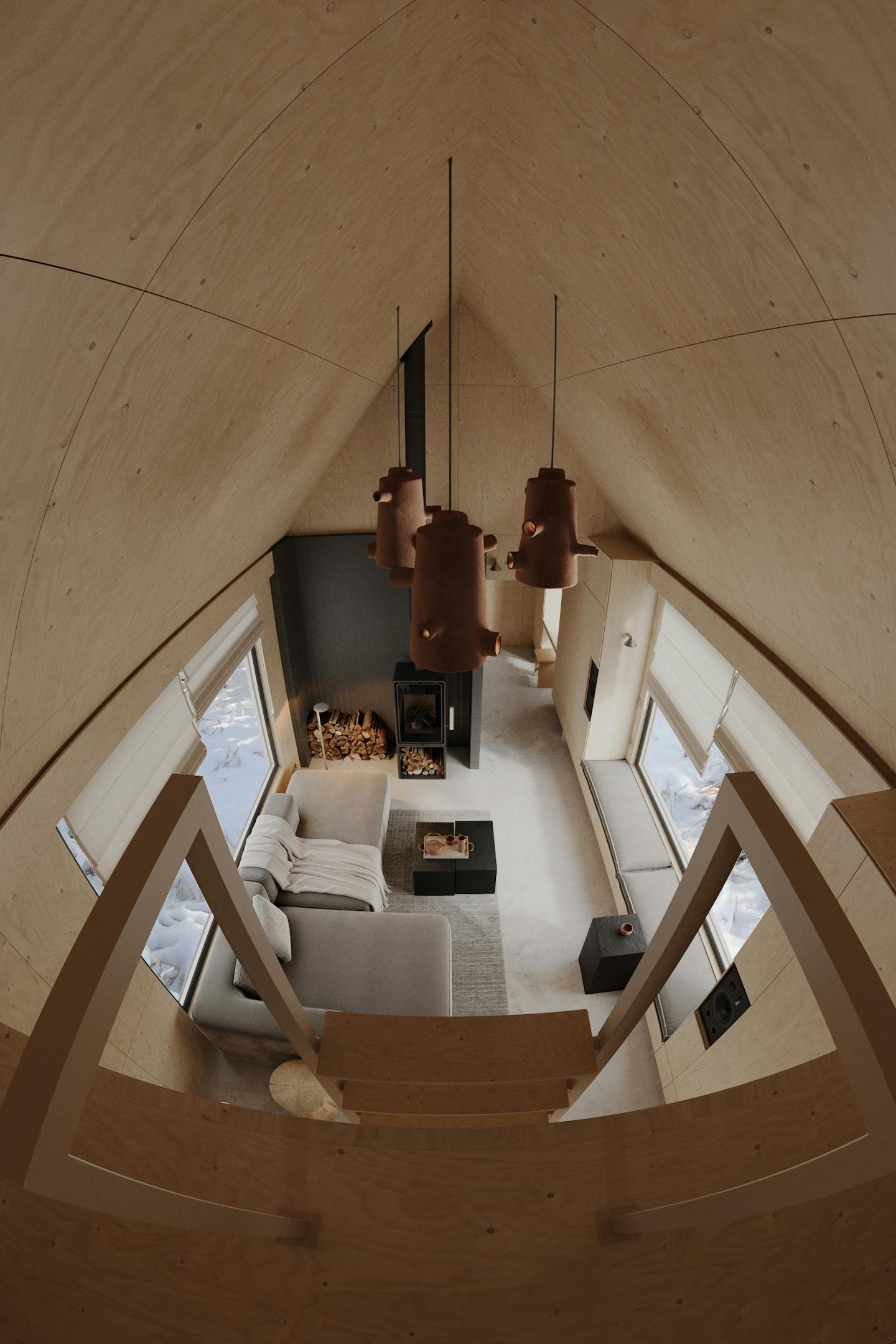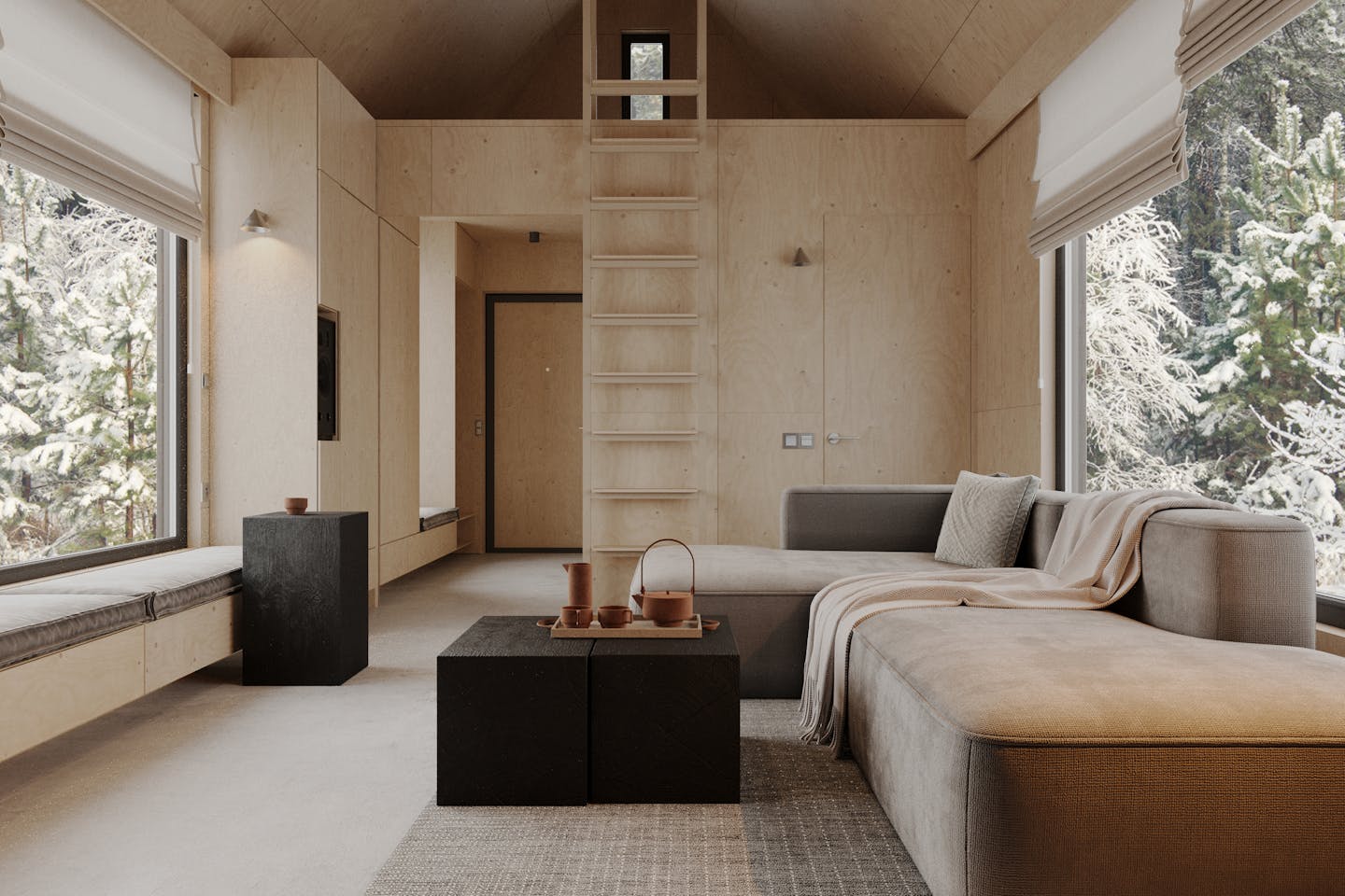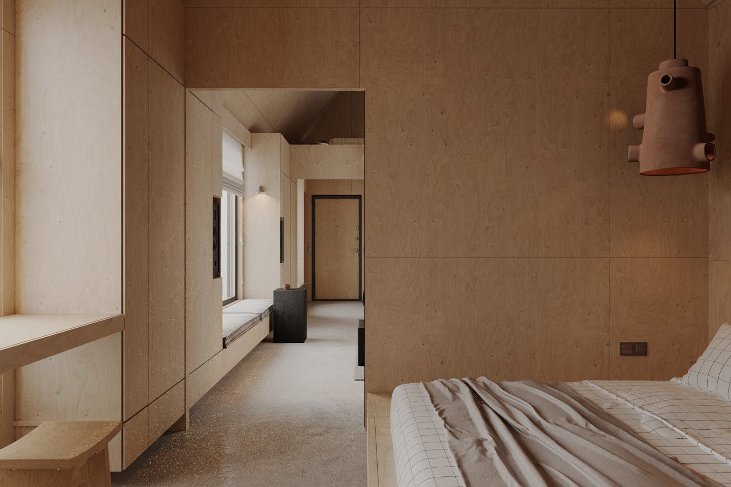 ■ Стиль и атмосфера: интерьер выполнен в чистом Barn Style с сильным уклоном в современный минимализм. Атмосфера уютная, обволакивающая и “ламповая”, благодаря доминированию натурального дерева. Цветовая палитра монохромная и сдержанная: тёплый, светлый натуральный цвет фанеры и дерева, контрастирующий с глубоким чёрным.