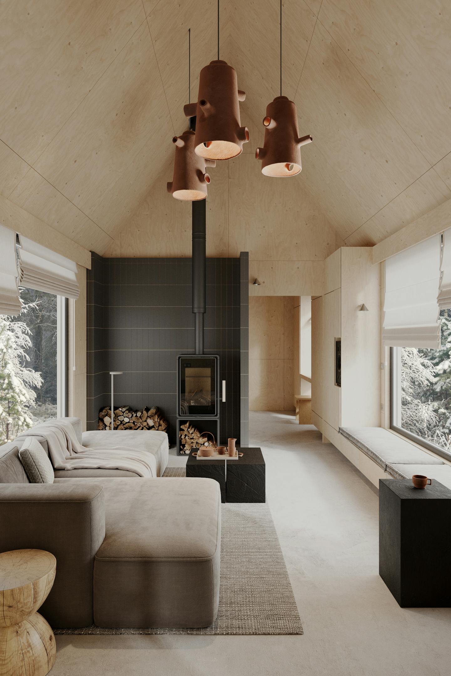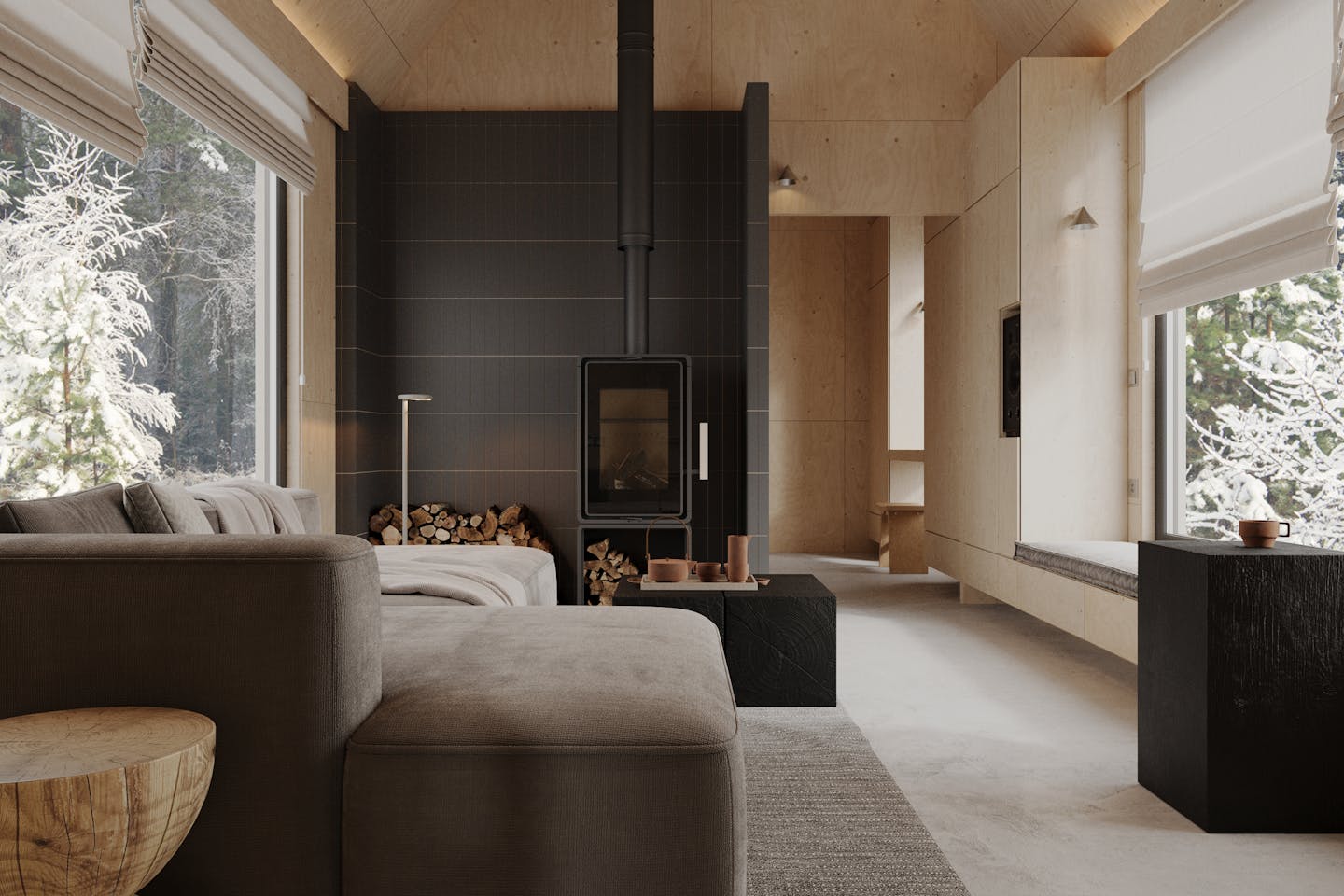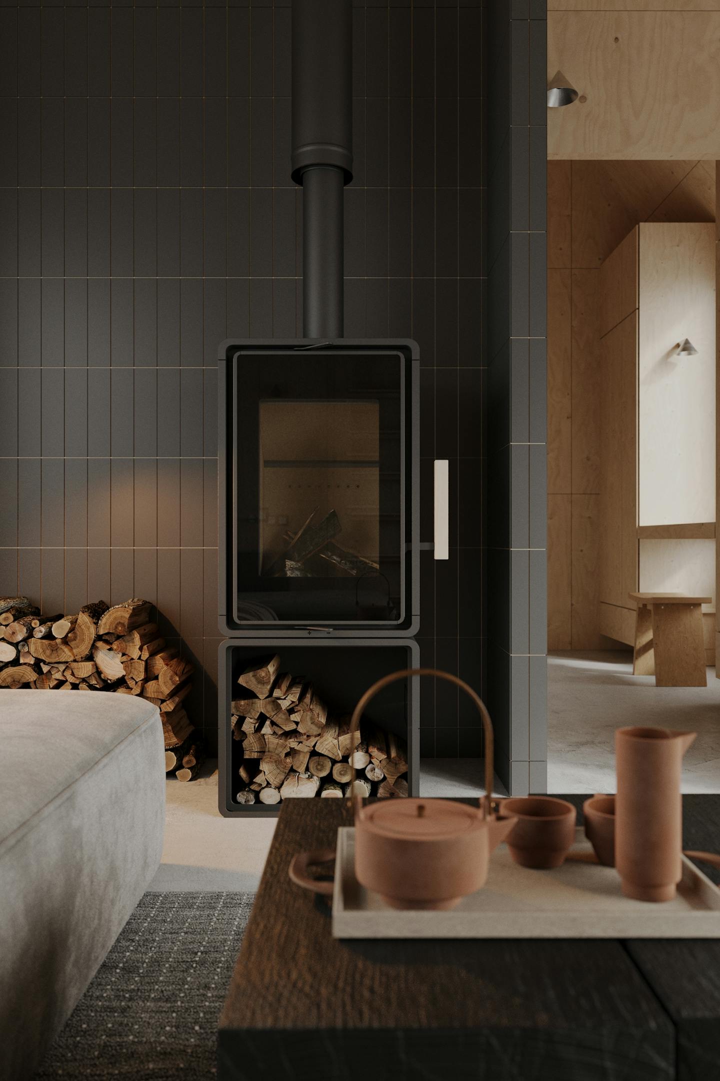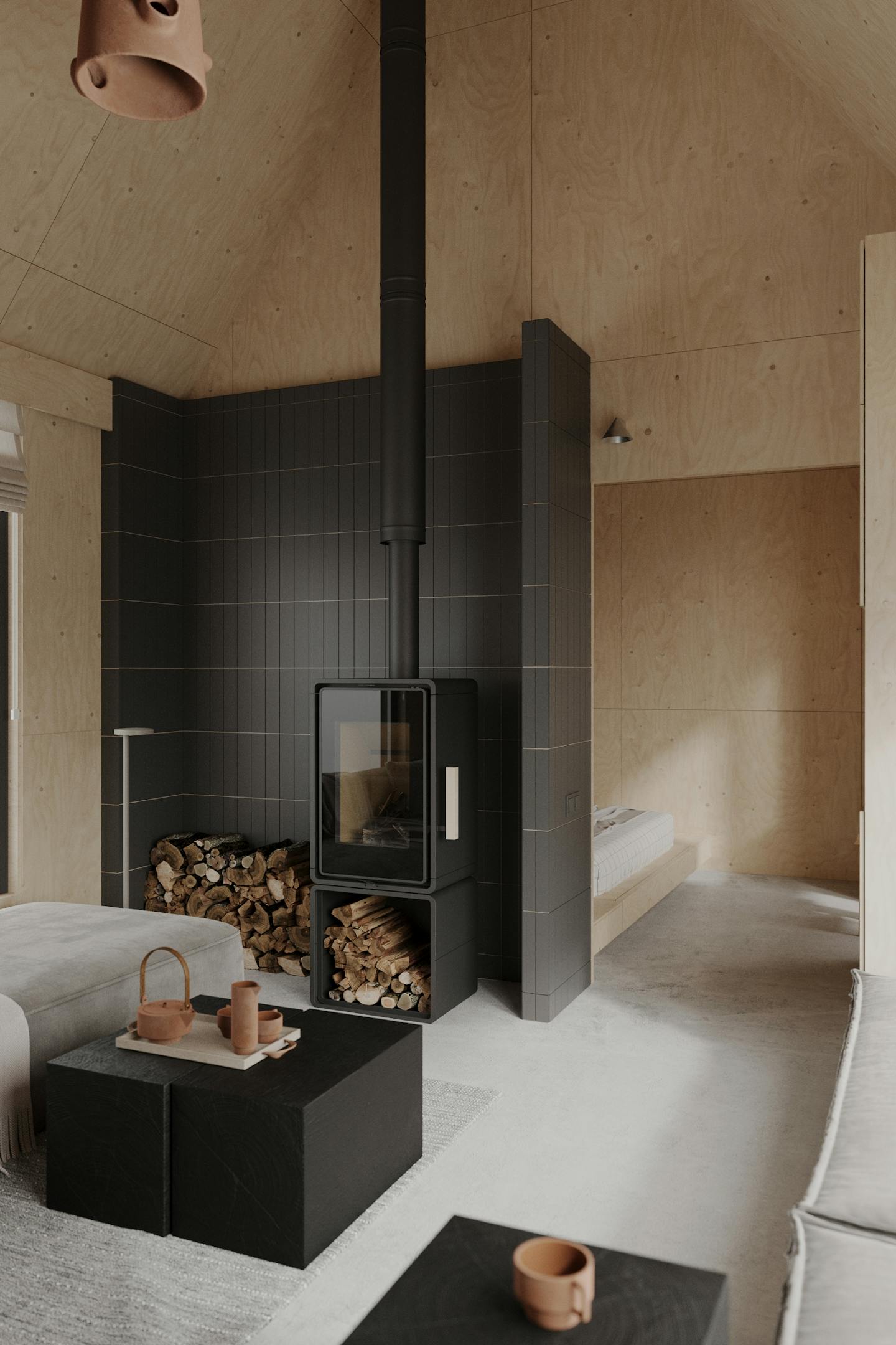■ Центральный Элемент: дровяная печь-камин с открытым складом дров по соседству. Это не только источник тепла для круглогодичного проживания, но и главный элемент, создающий ту самую “ламповую” и уединённую атмосферу.