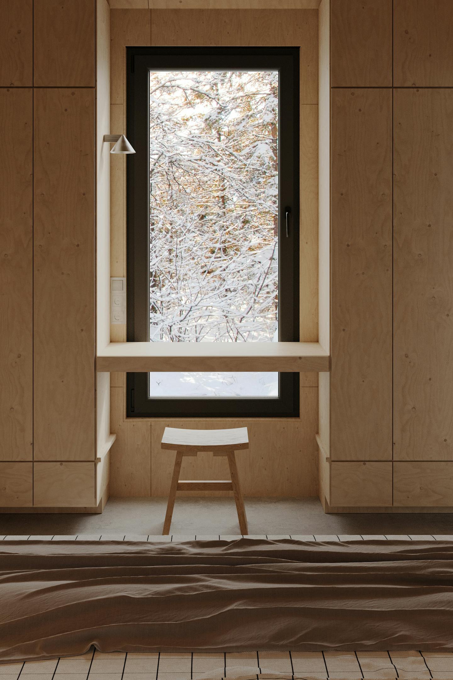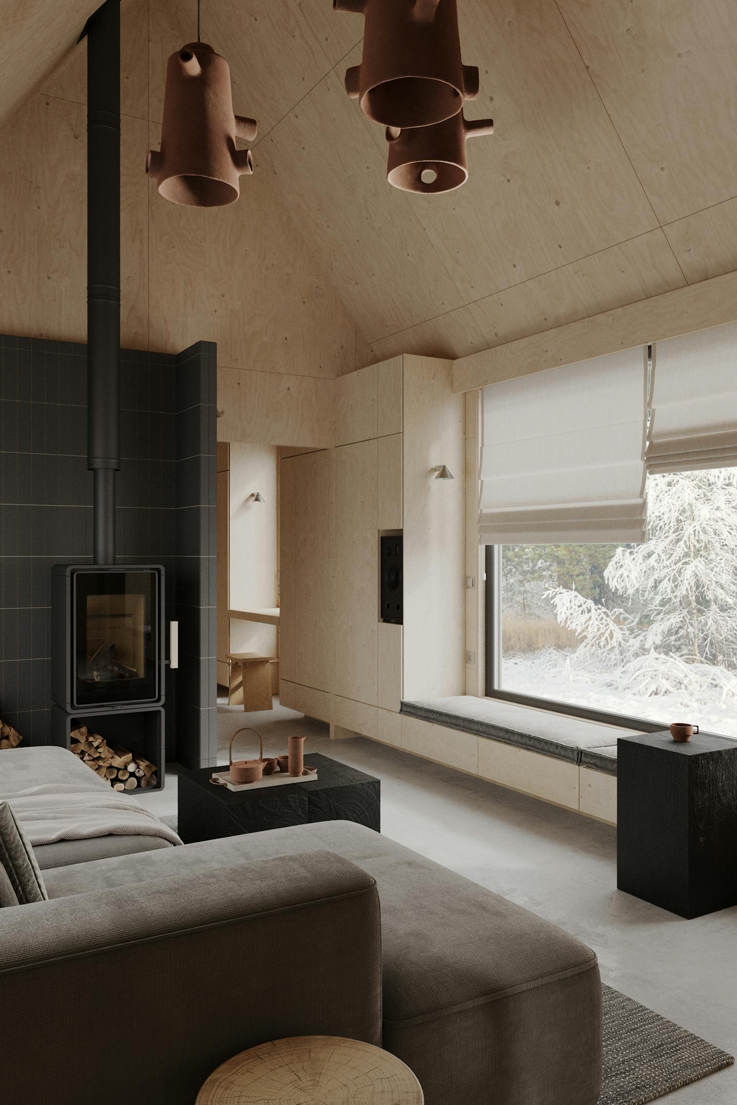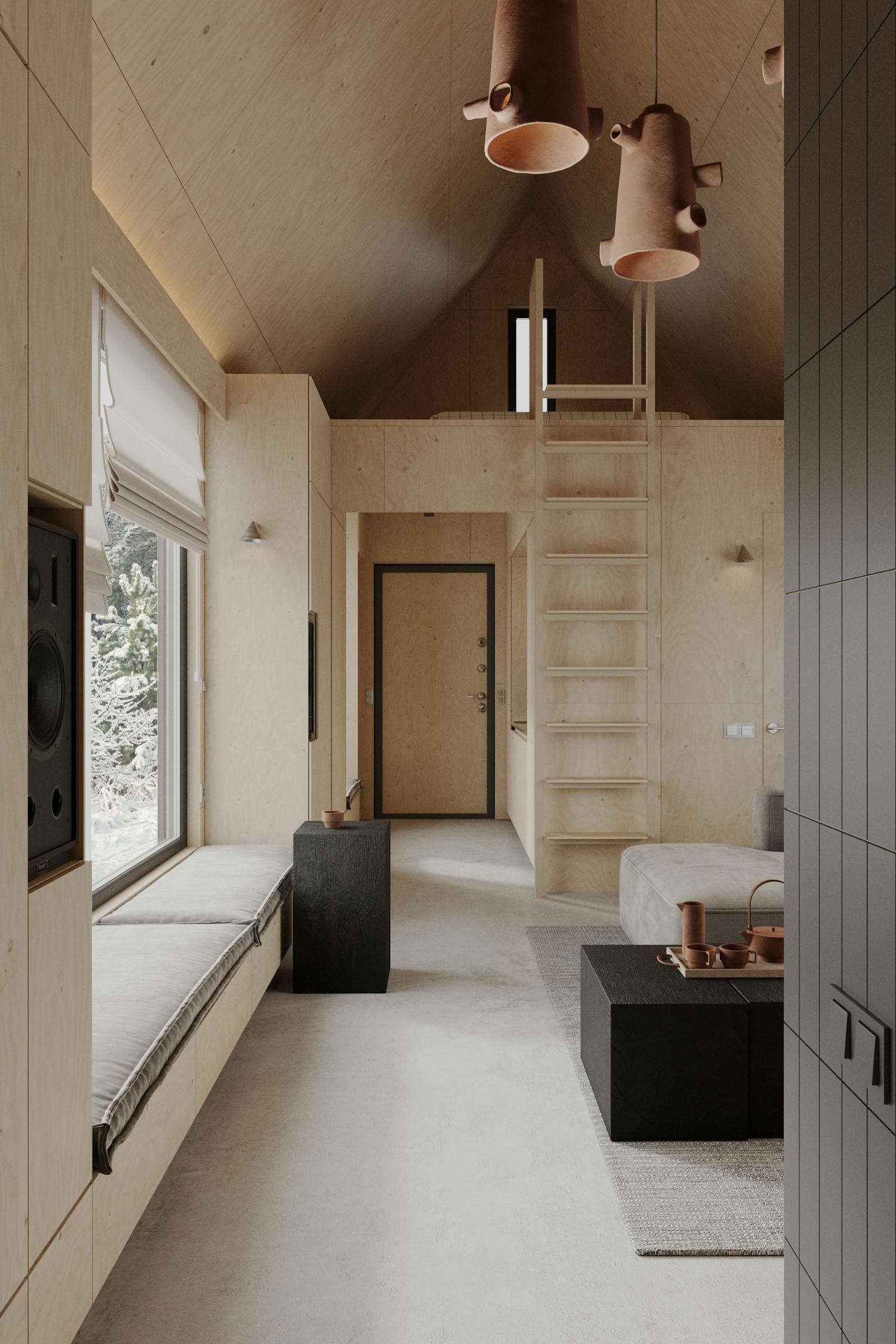 Триумф функциональности над площадью. Данный проект задумывался и после реализации стал живим воплощением декларации «функционального минимализма». Разработанный как личный дом мечты Алексея (руководителя студии) в 120 км от Санкт-Петербурга, он демонстрирует, как можно вместить полноценную жизнь для круглогодичного проживания в 45 квадратных метрах. Главная цель — создать убежище для «идеального побега», где каждая деталь работает на максимальный комфорт и минимальное отвлечение. Использование стиля Барн в сочетании с проверенными технологиями строительства (лстк-каркас, фальцевая кровля) и натуральными материалами (глина, фанера, бетон) сформировало тёплую, но строгую эстетику. Отсутствие телевизора и фокус на панорамных окнах, открывающих вид на лес и поле, окончательно позиционируют этот дом как место силы в непосредственной близости от мистических, полных природной энергии земель Карелии. Этот концептуальный подход и мастерство автора в реализации нашли заслуженный отклик в профессиональной сфере. Проект отмечен международной премией ADD Awards.