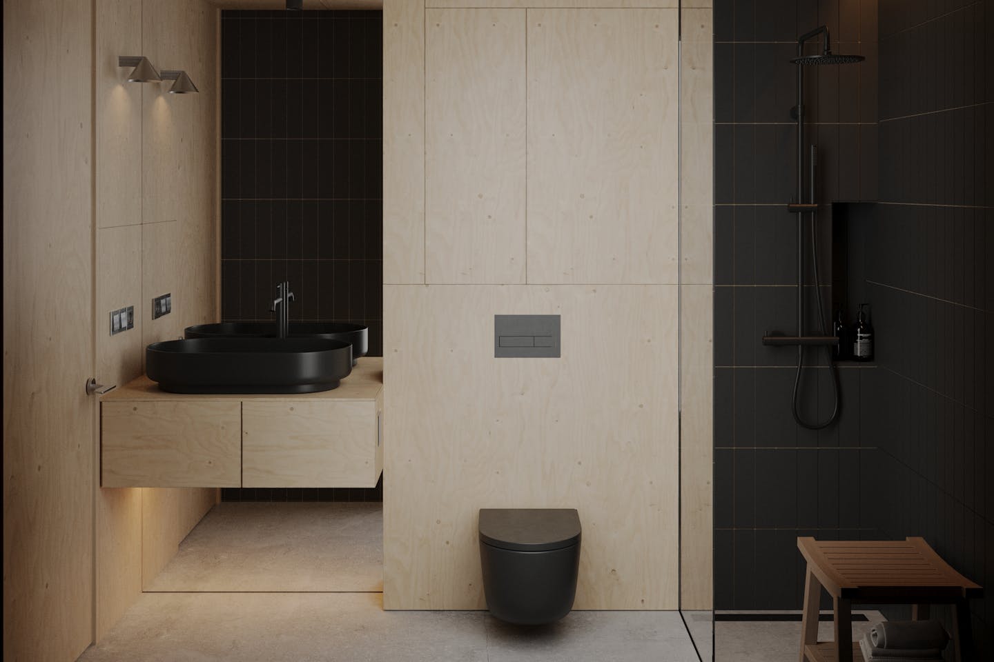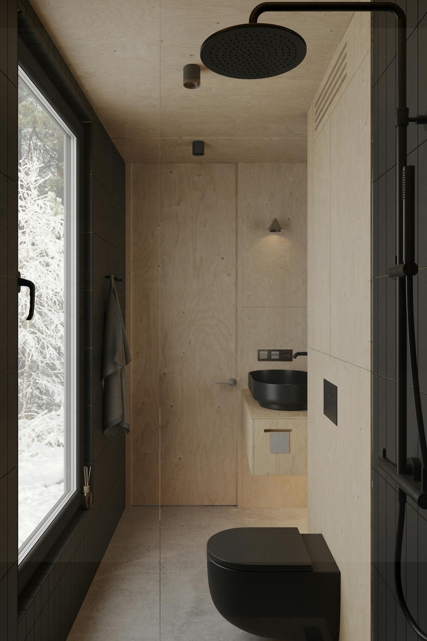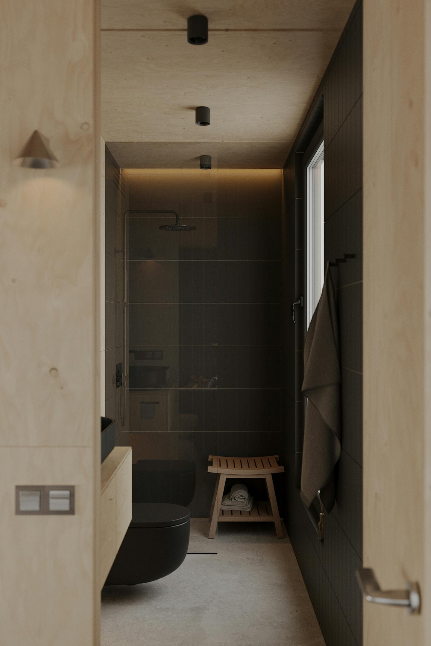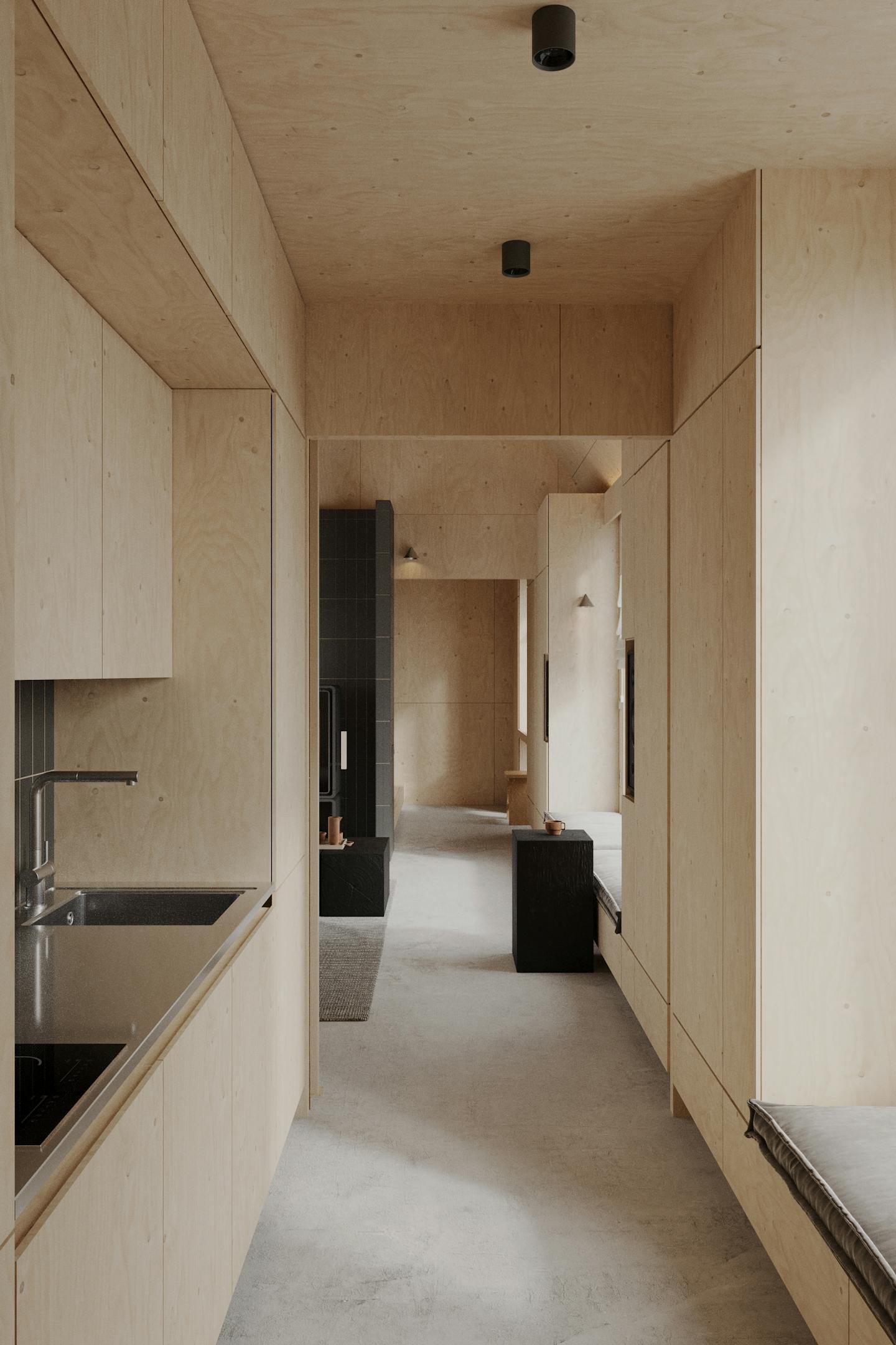 ■ Текстурный контраст и тепло: внутри доминирует тепло светлой фанеры (стены, потолок, шкафы). Это тепло уравновешивается холодными, монументальными поверхностями тёмного керамогранита (облицовка печи и стены в мокрой зоне).