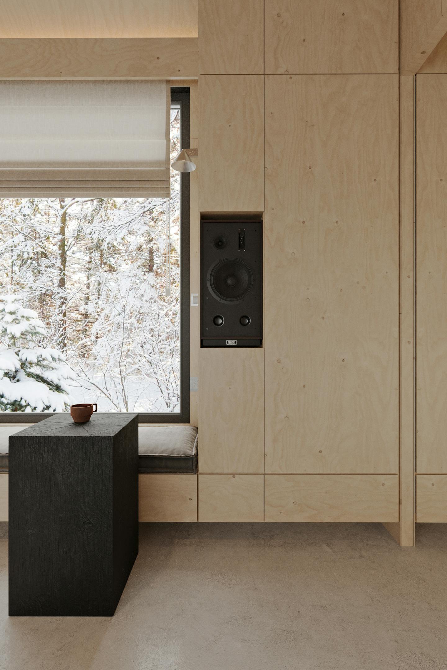 «Мне нужно было место, где теплота природных естественных материалов находится в симбиозе с человеком, а контрастирующий чёрный цвет не давит, а наоборот, структурирует. Я сознательно отказался от ТВ, чтобы перенести фокус внимания на окружающий лес, природу, которая удивительно прекрасна в бесчисленных уголках моей любимой Родины. Это дом для внутренней жизни, дом, для единения с собой, духом, первозданным миром. Место, где ты, наконец, почувствуешь себя счастливым, перестав быть целью для внешних раздражителей.»