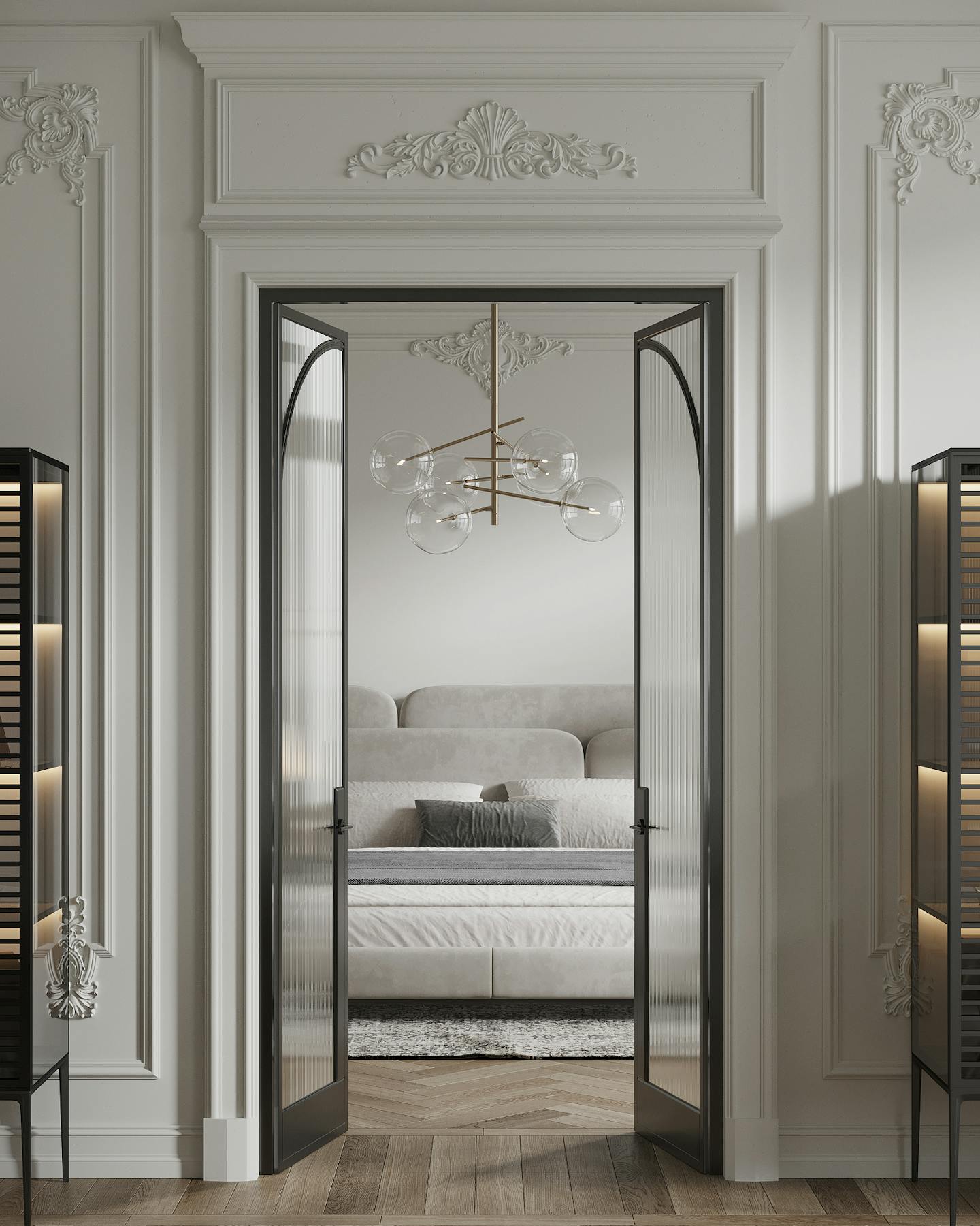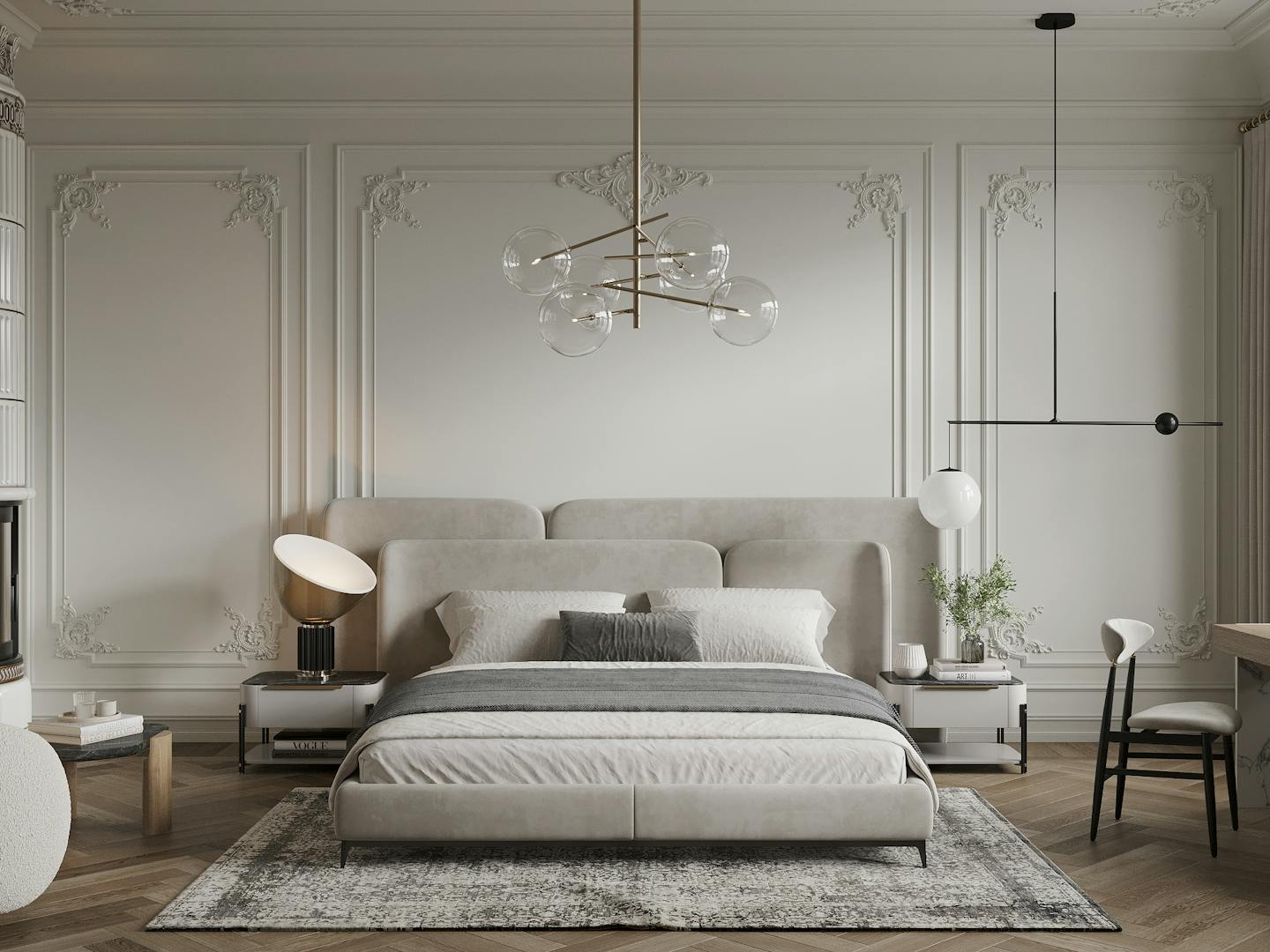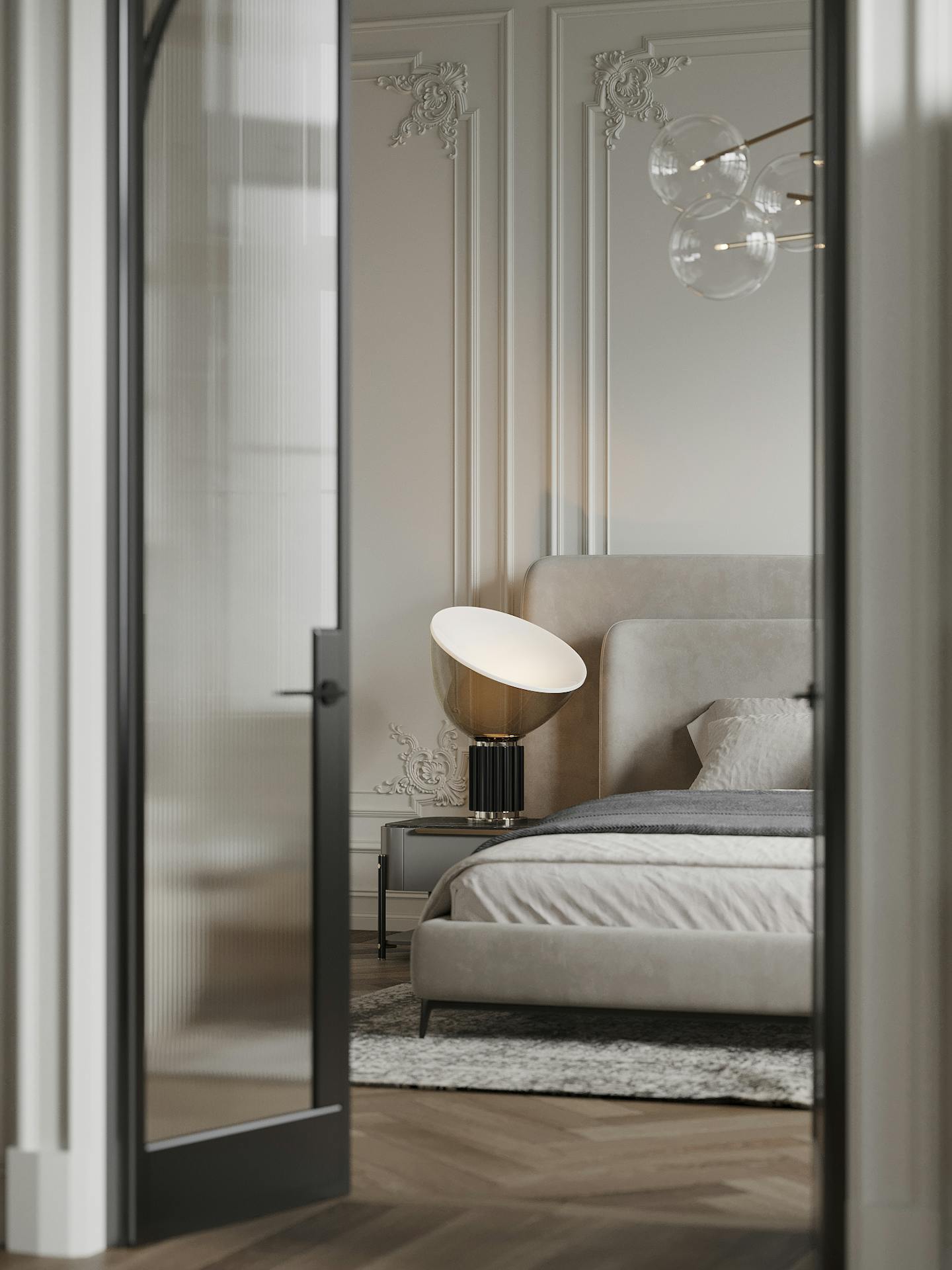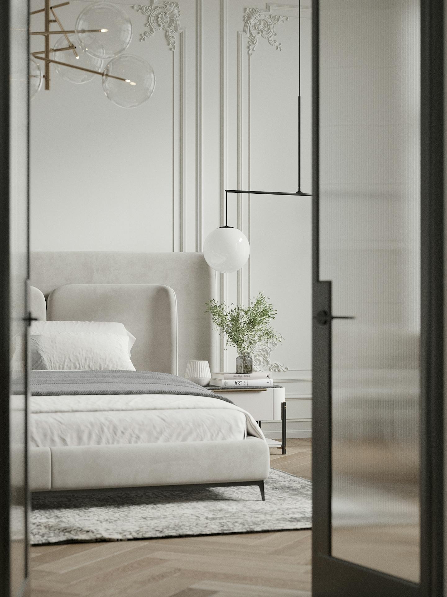 Спокойная, почти монохромная атмосфера разбавлена современными декоративными элементами, освещением и мебелью знаменитых фабрик.