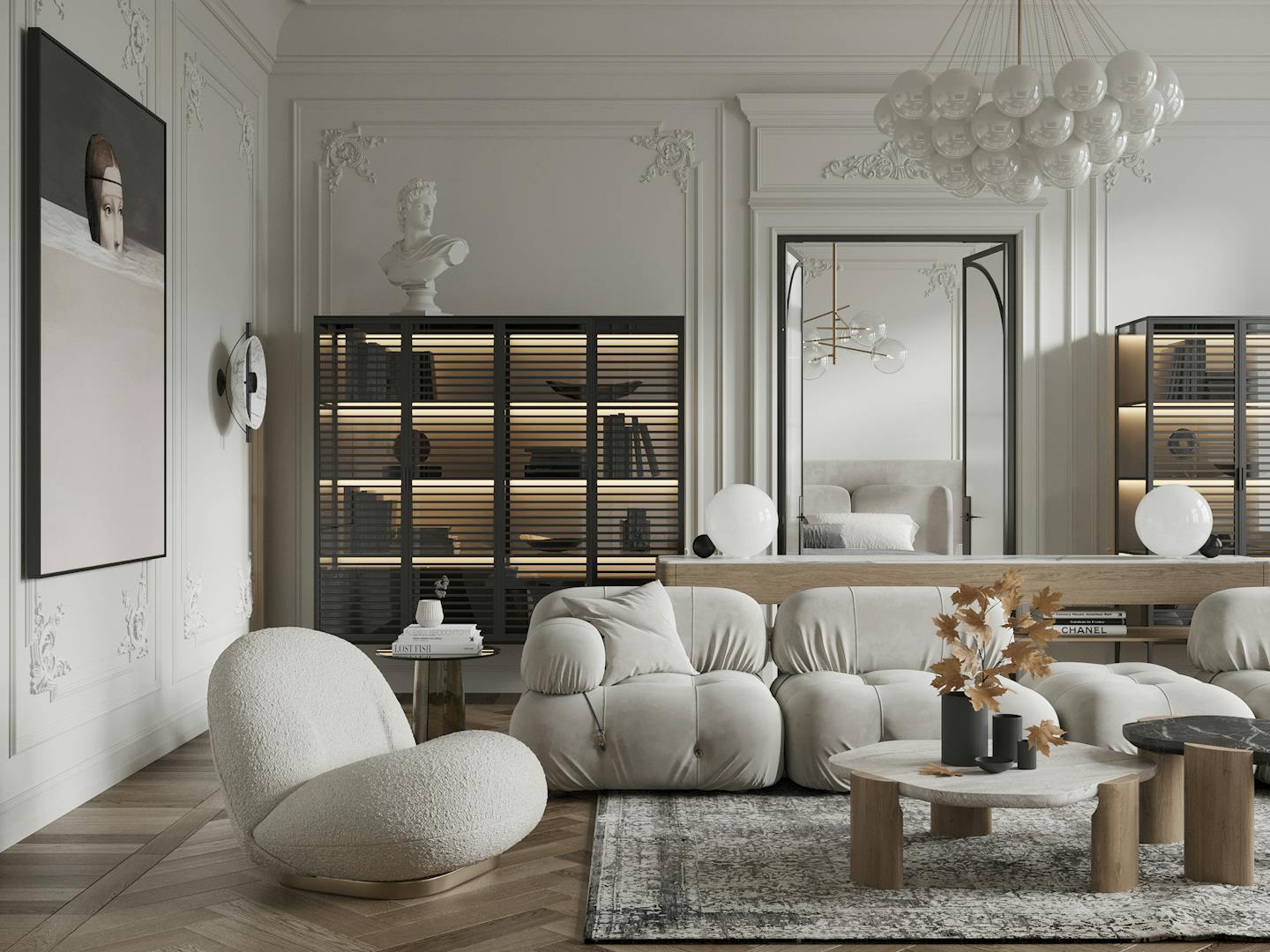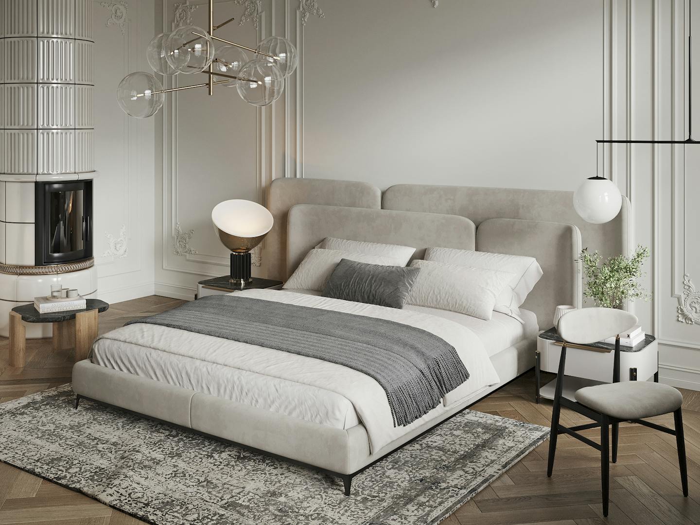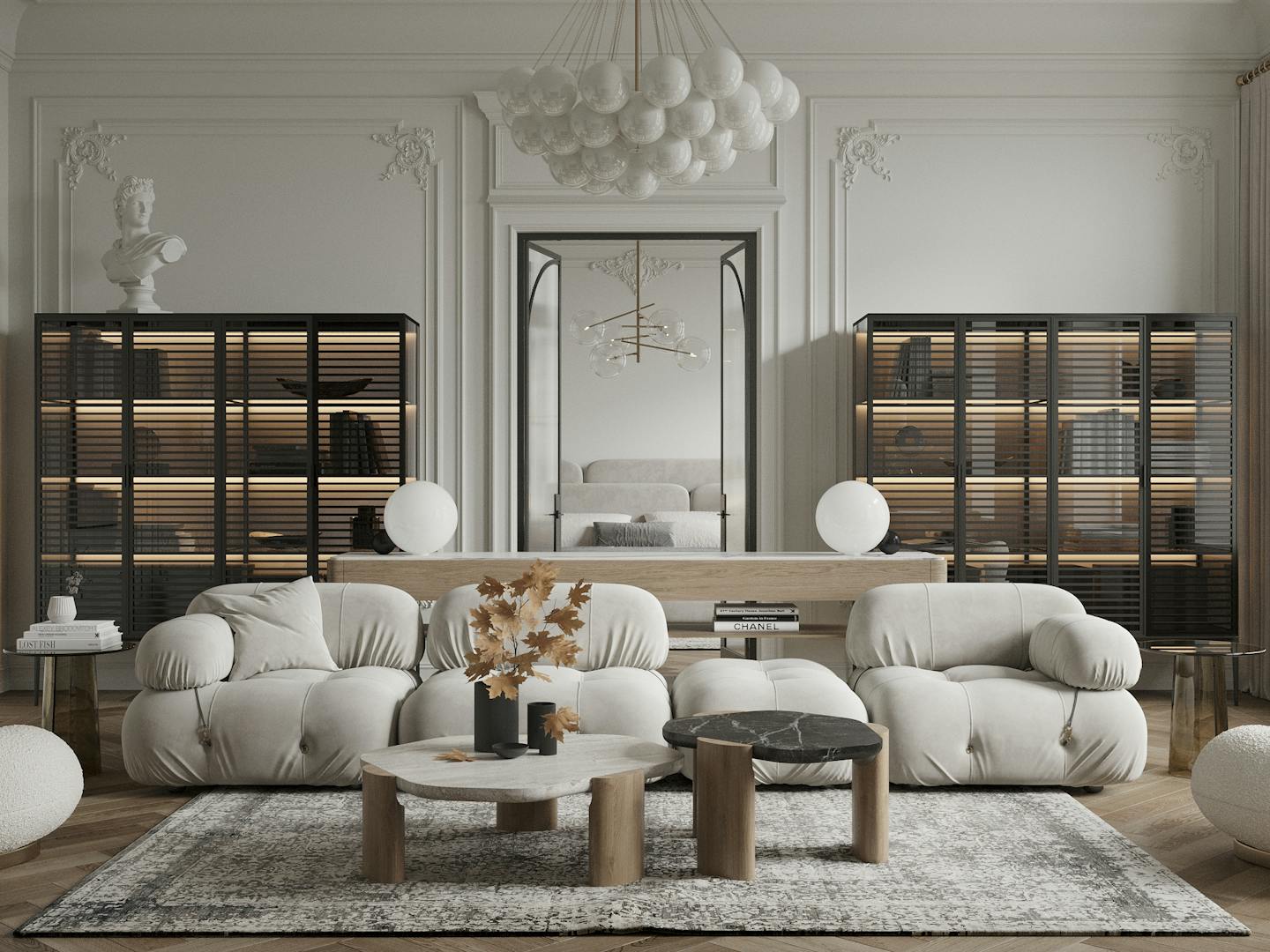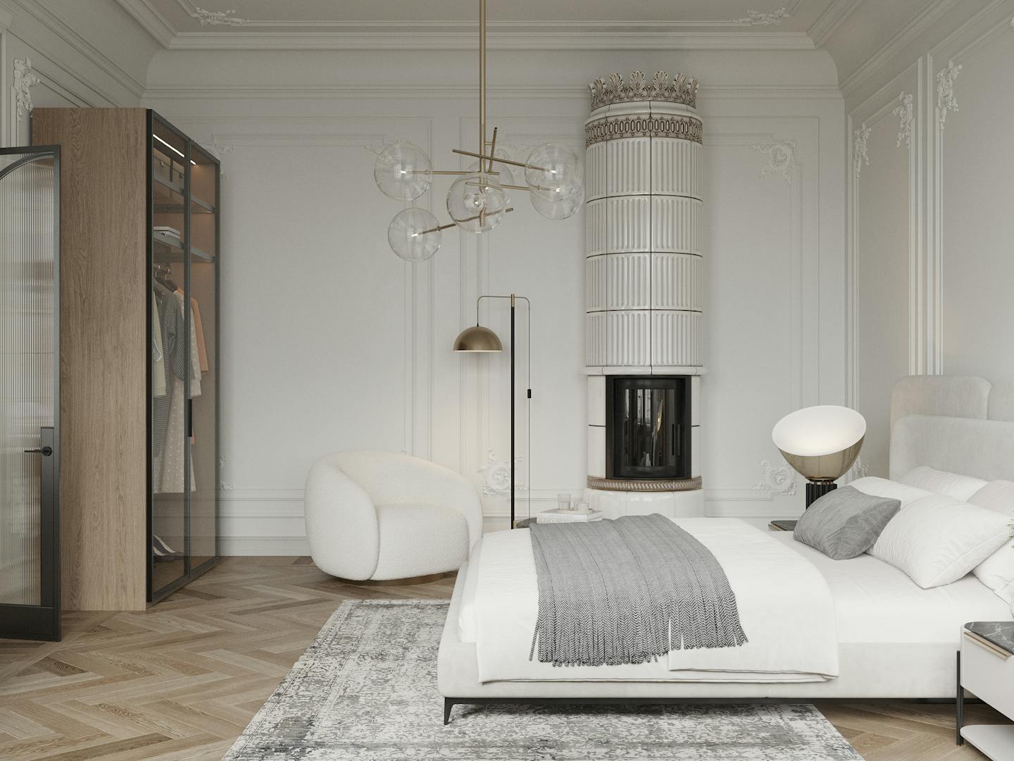 Спокойная, почти монохромная атмосфера разбавлена современными декоративными элементами, освещением и мебелью знаменитых фабрик.