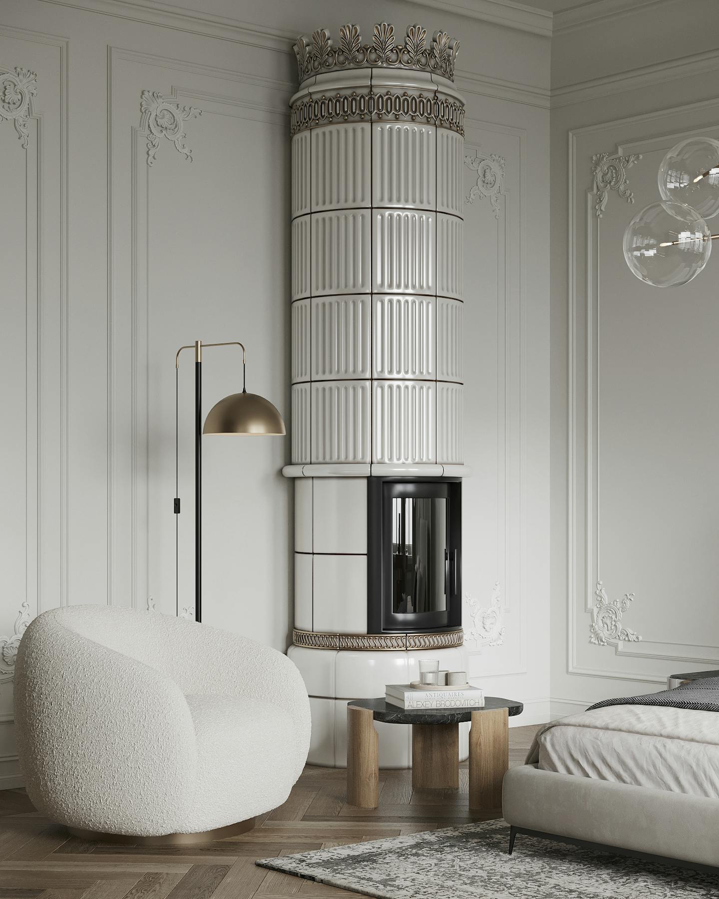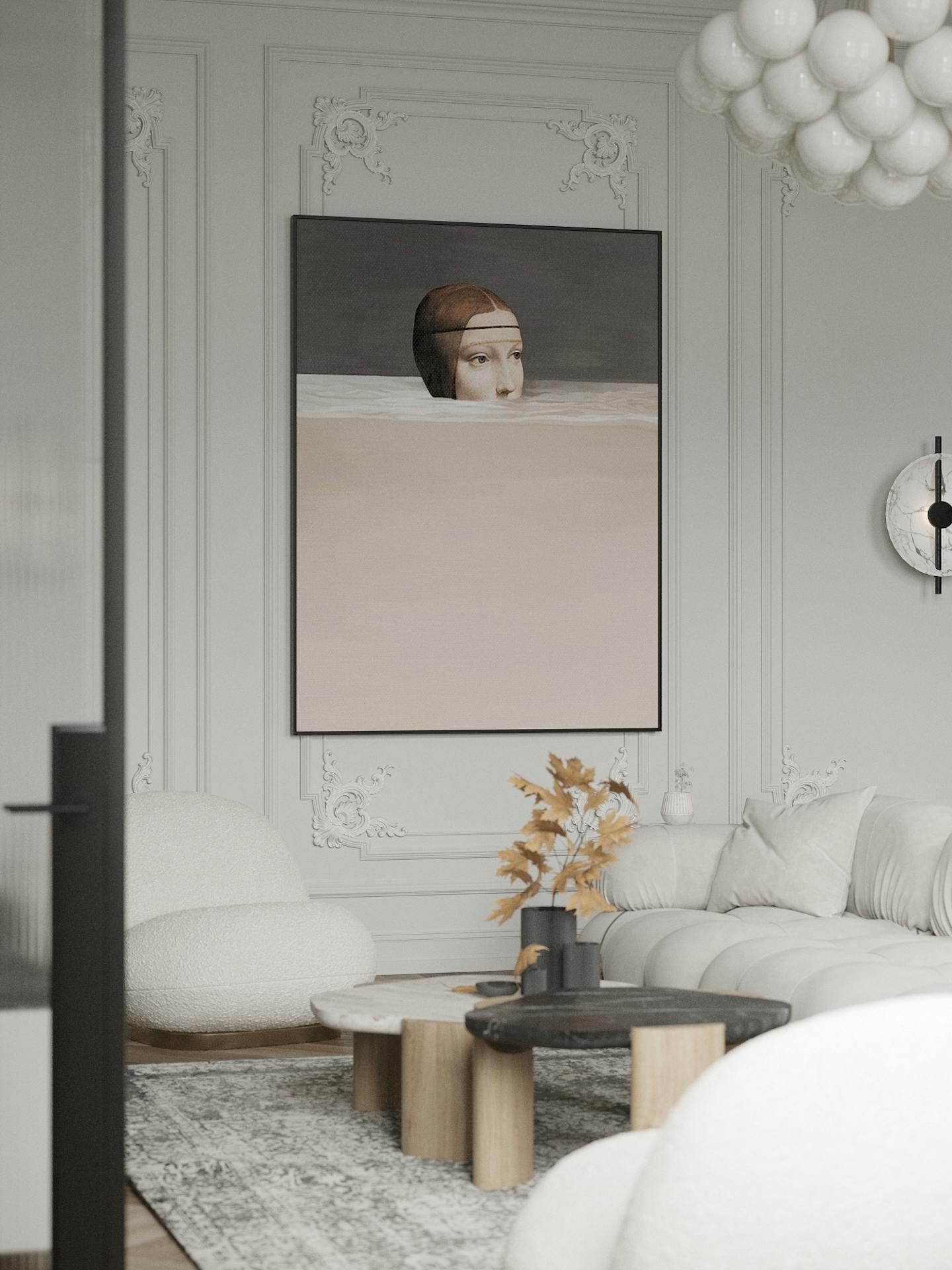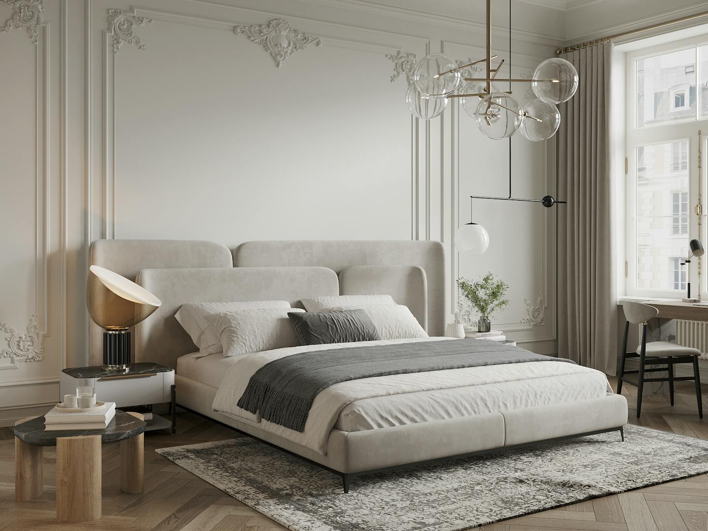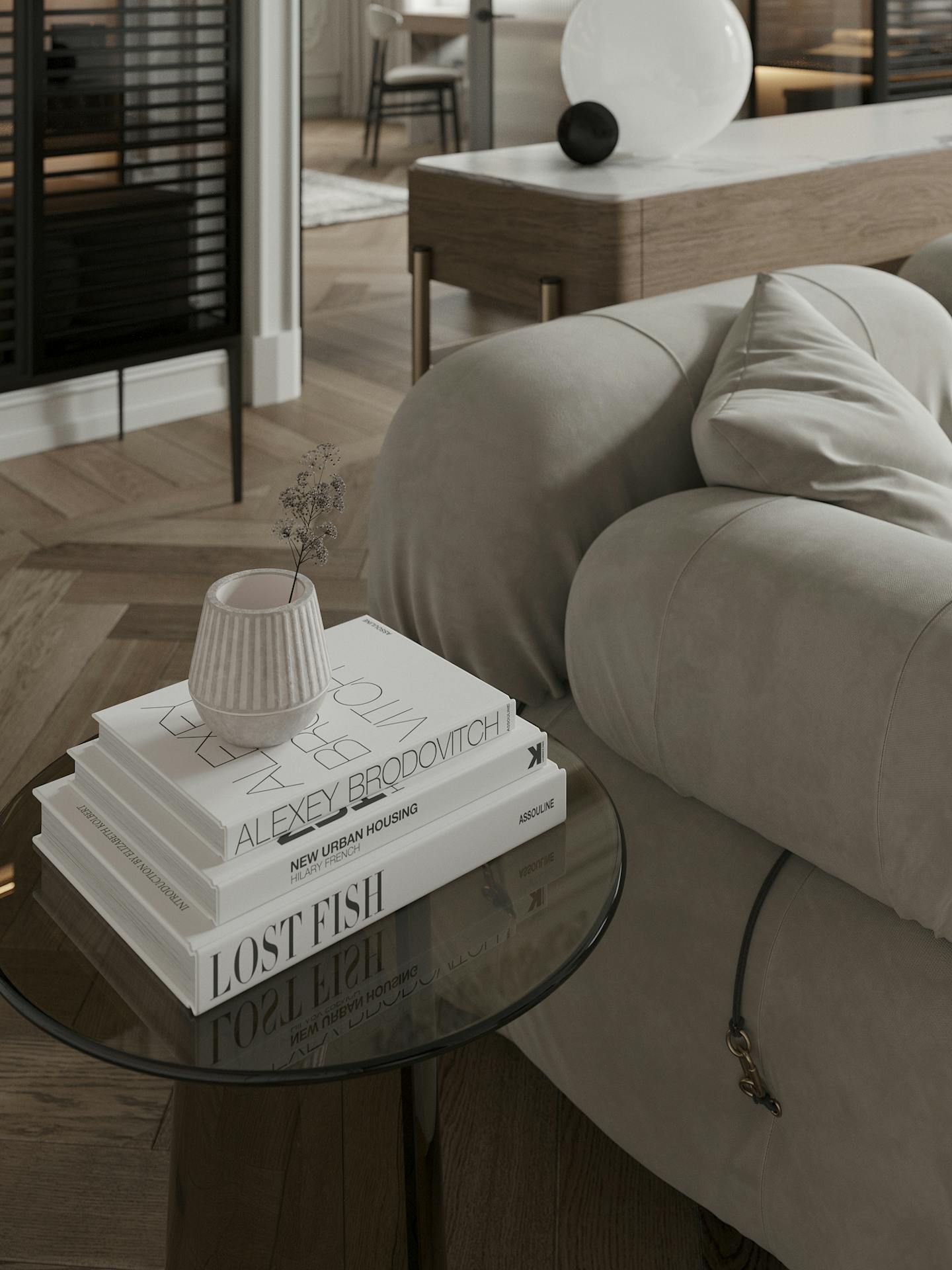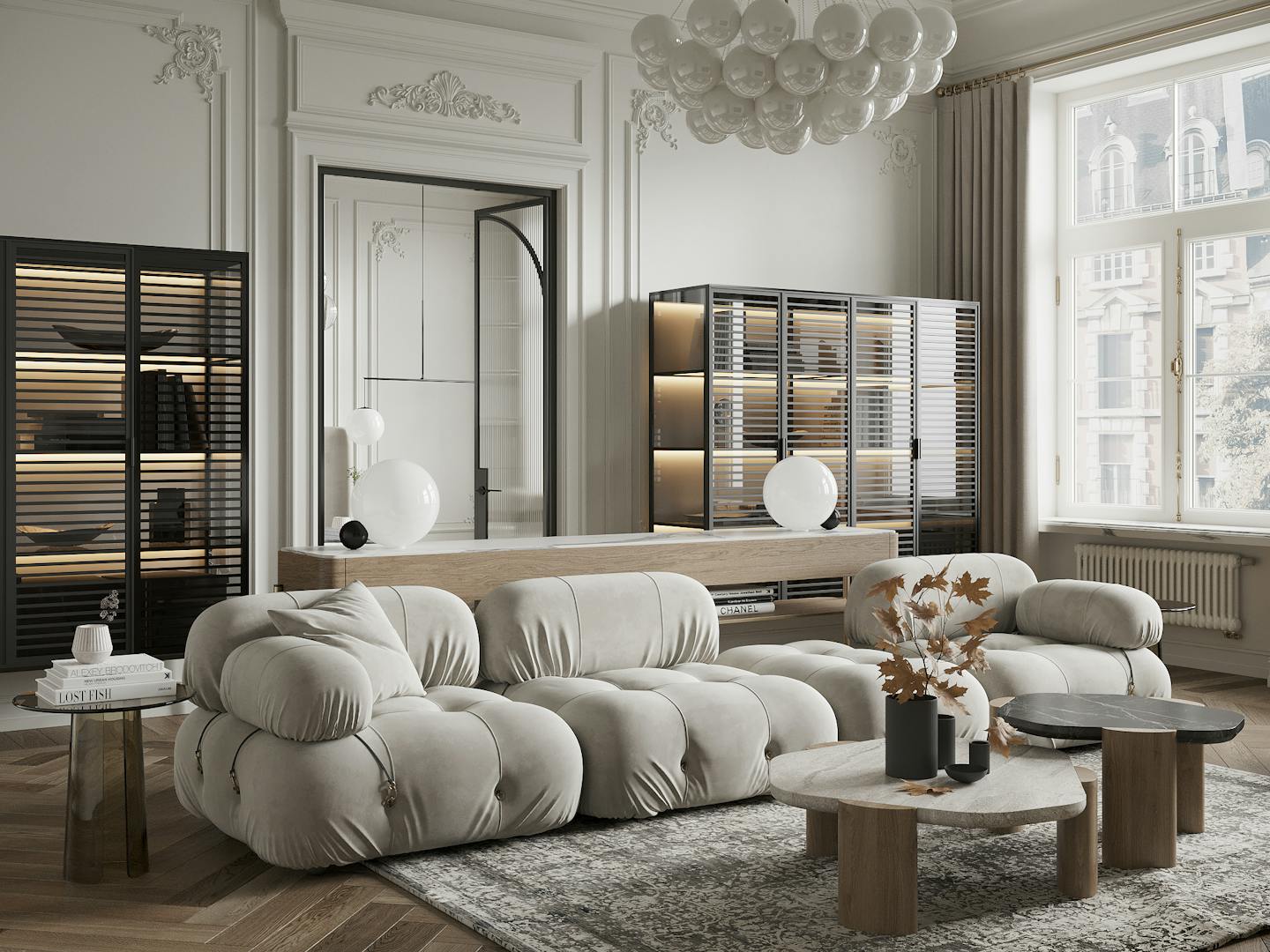 Спокойная, почти монохромная атмосфера разбавлена современными декоративными элементами, освещением и мебелью знаменитых фабрик.