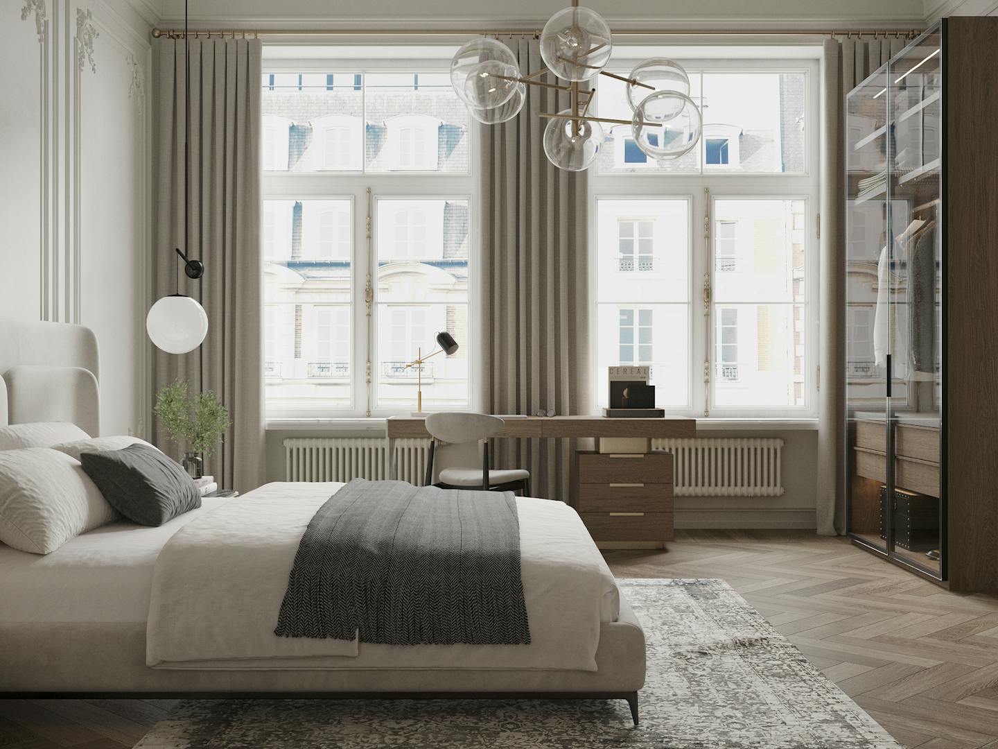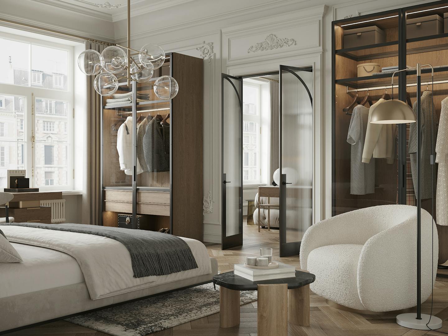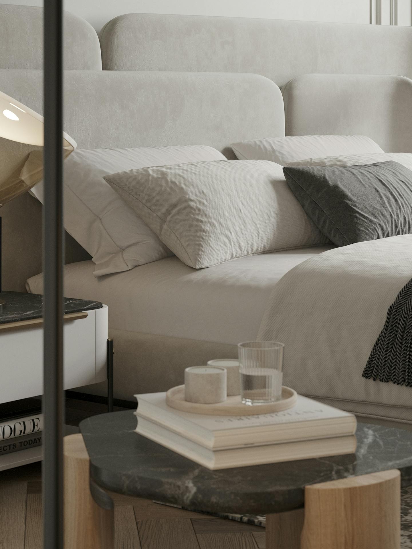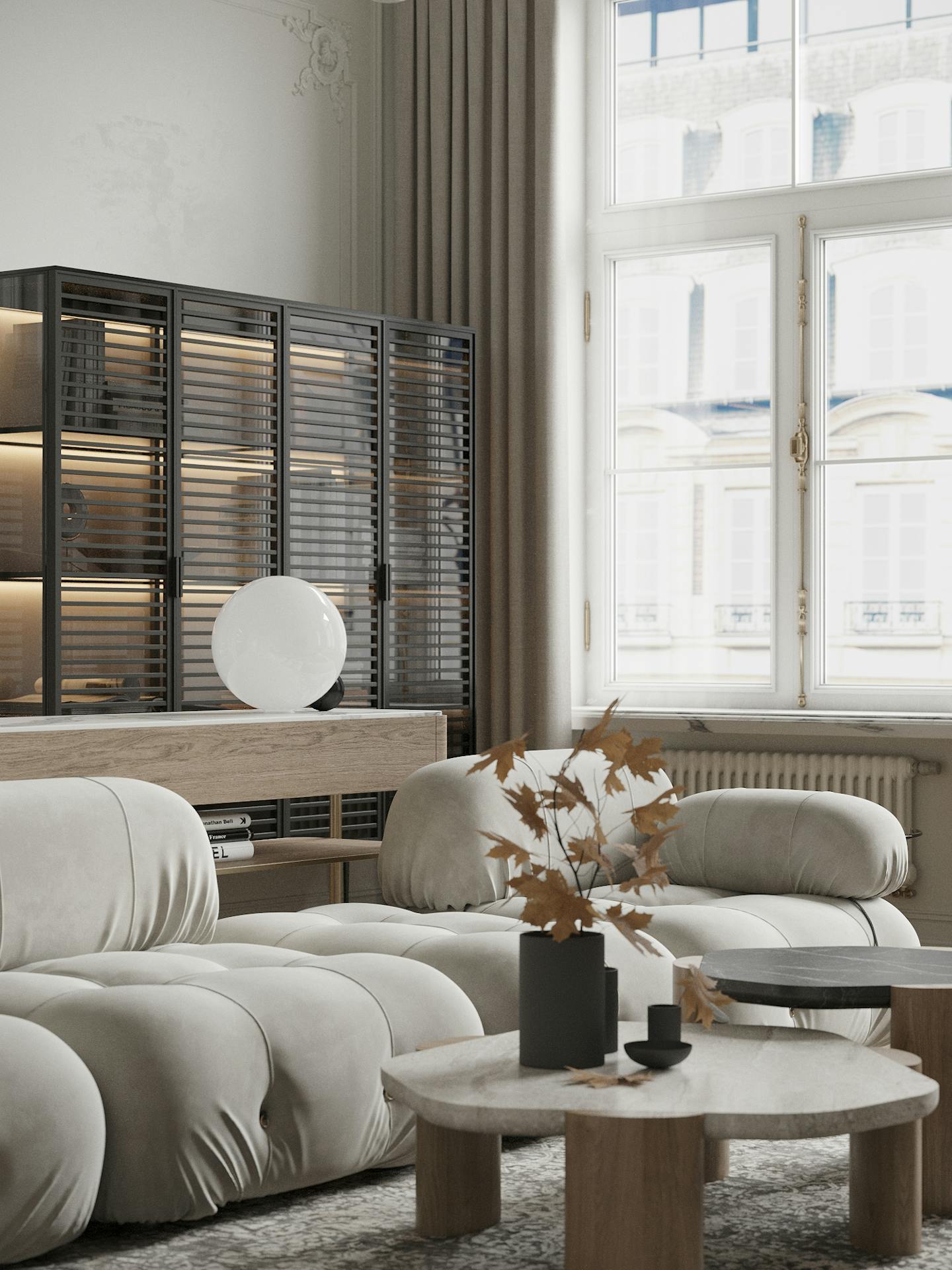 Спокойная, почти монохромная атмосфера разбавлена современными декоративными элементами, освещением и мебелью знаменитых фабрик.