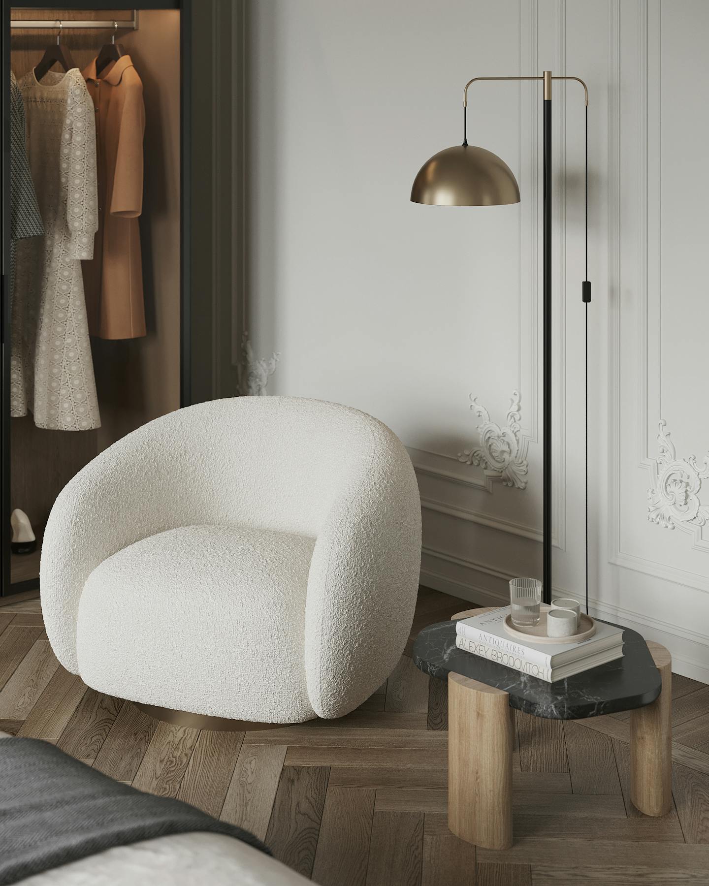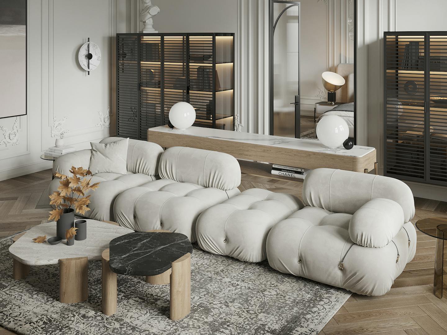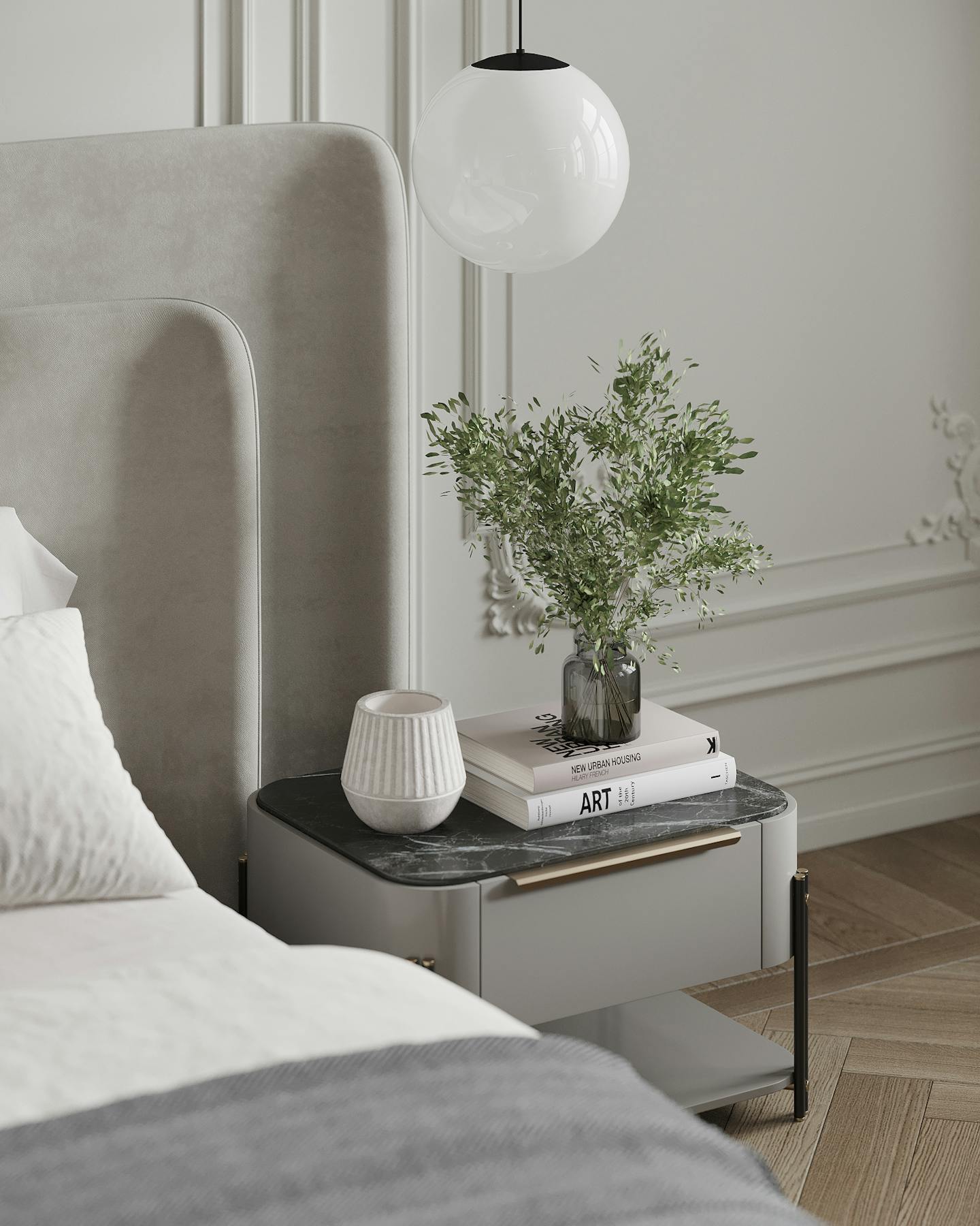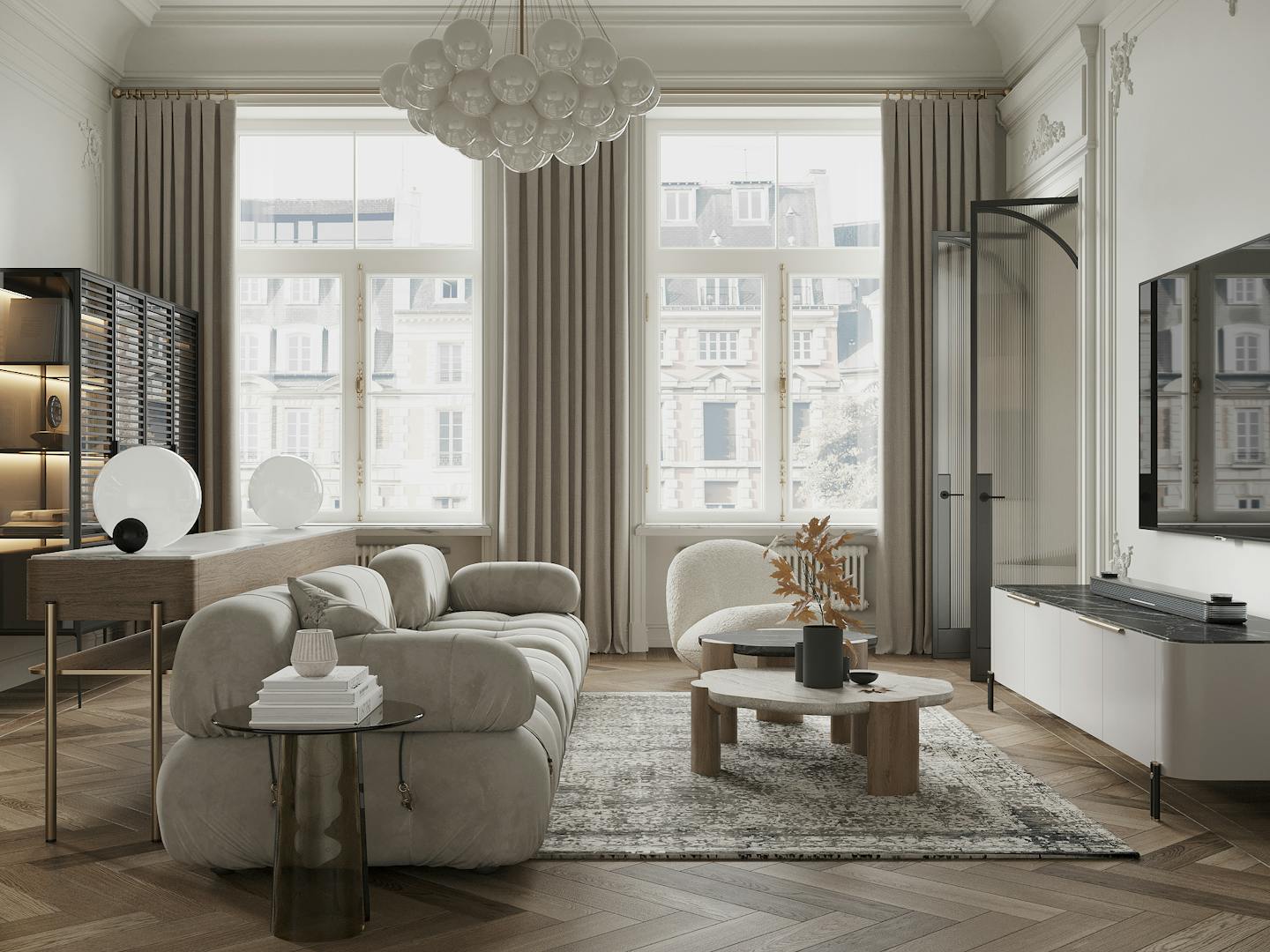 Спокойная, почти монохромная атмосфера разбавлена современными декоративными элементами, освещением и мебелью знаменитых фабрик.