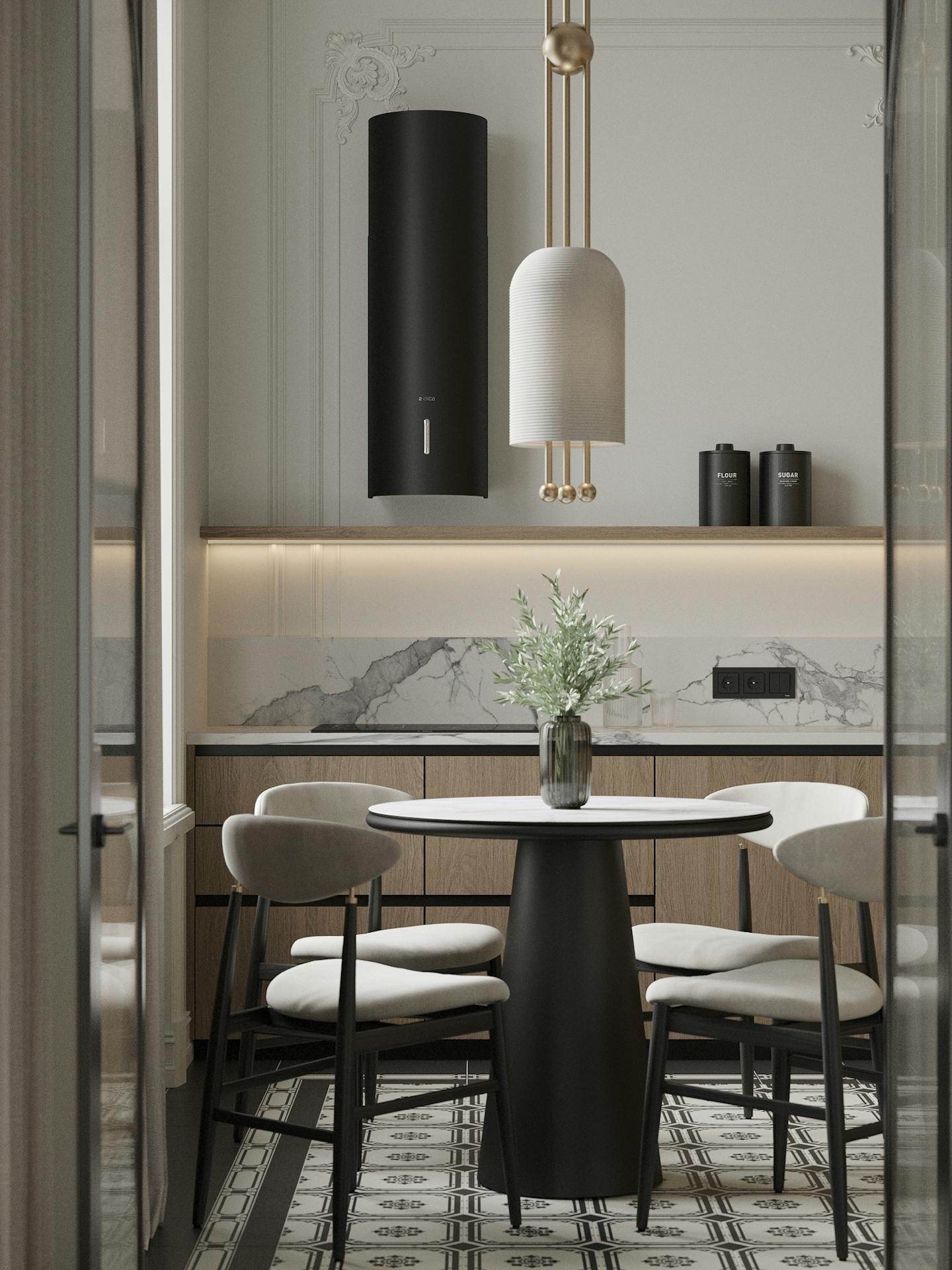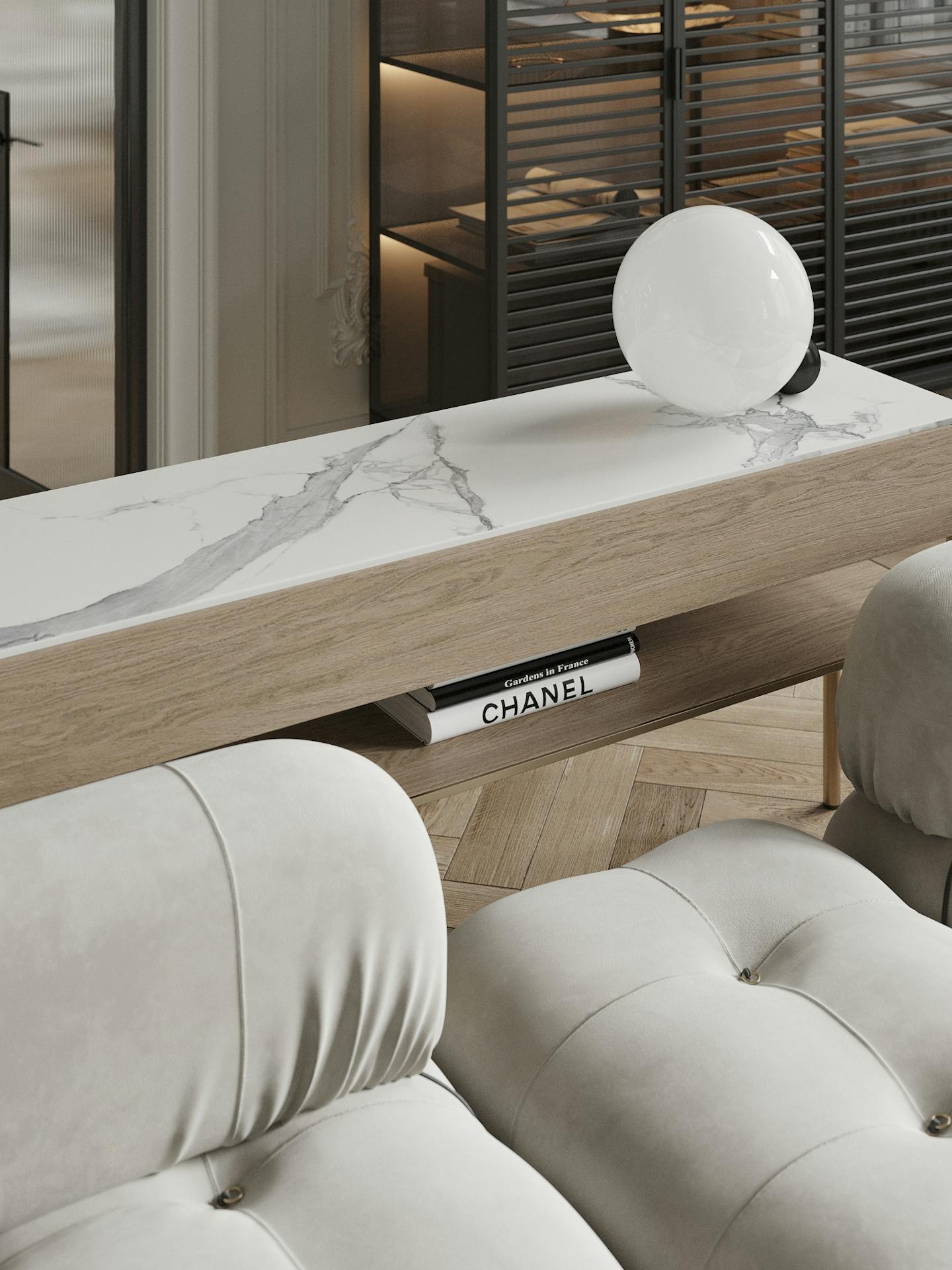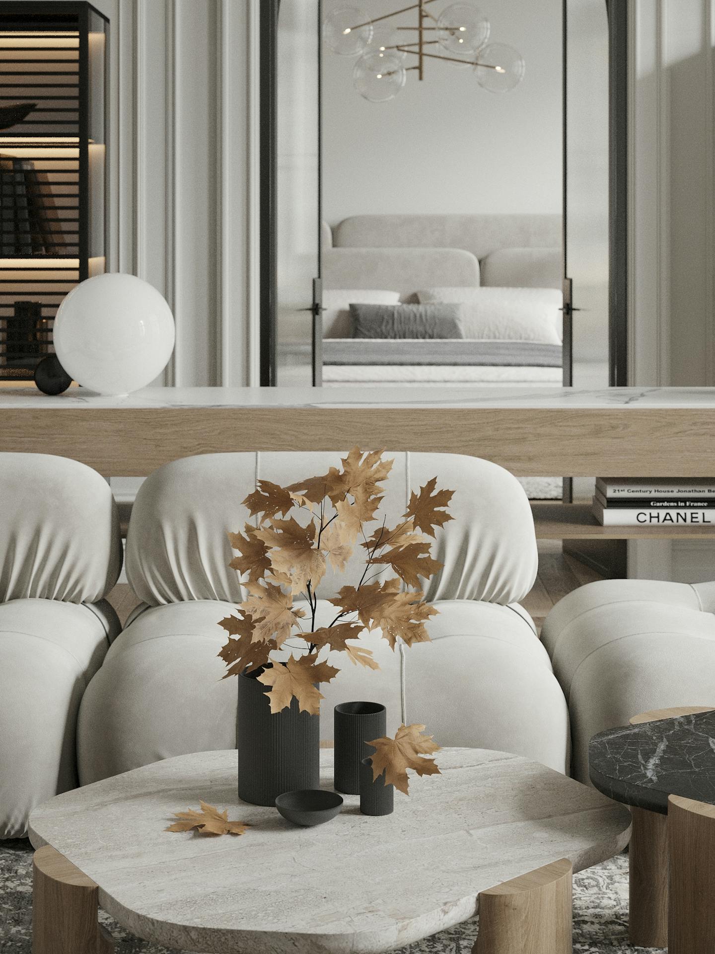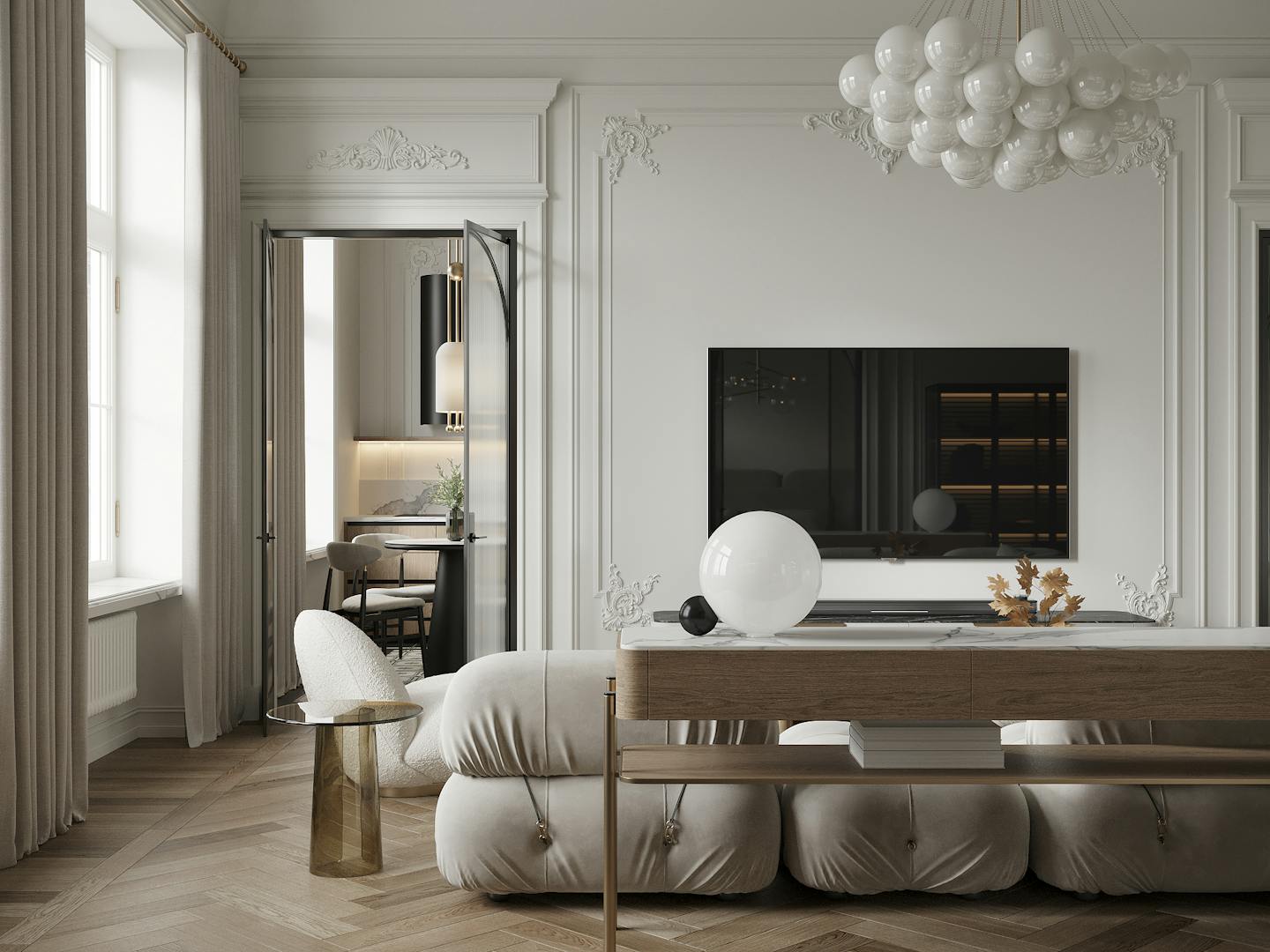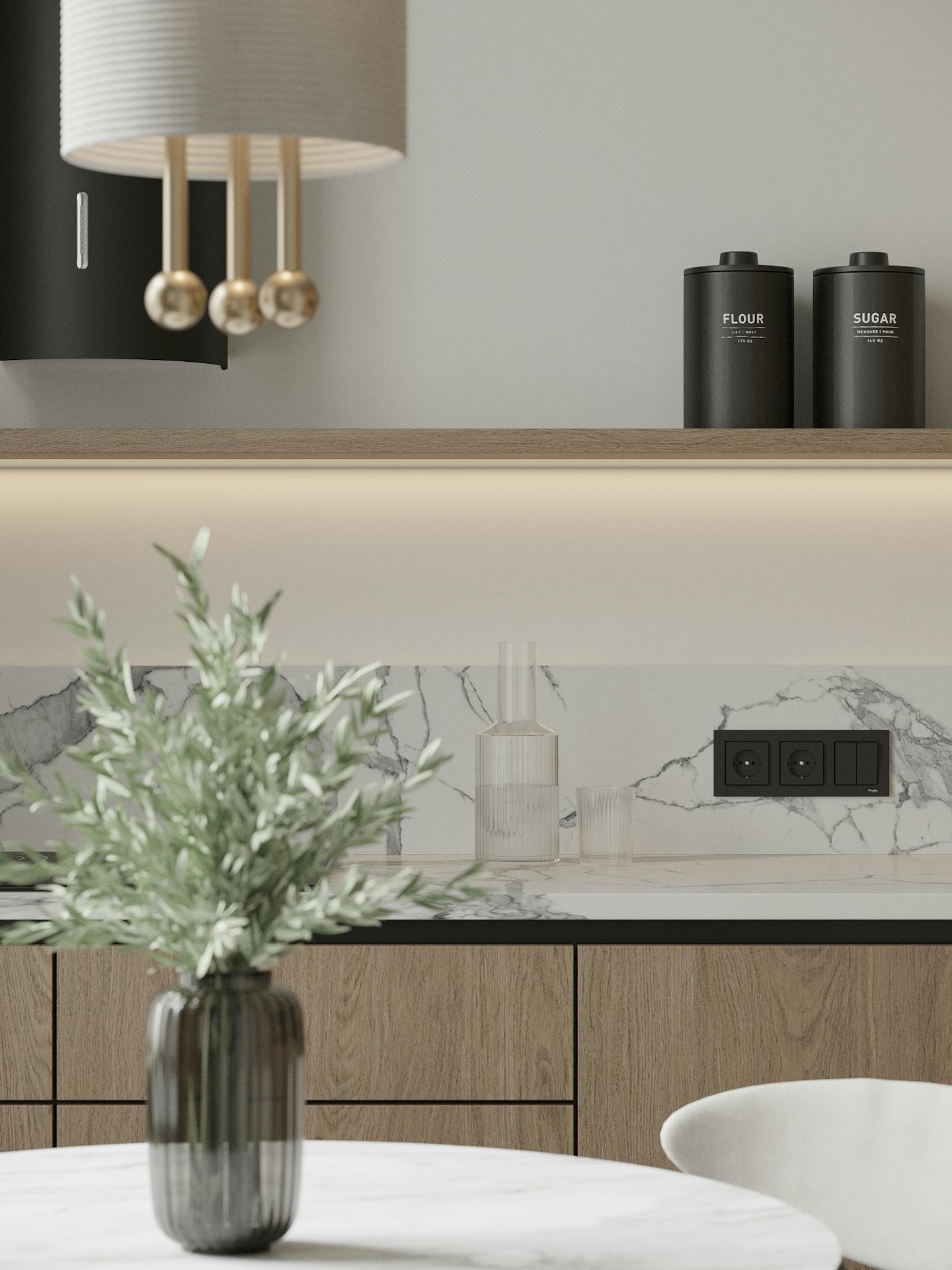 В дизайне интерьера мы использовали спокойную светлую гамму с теплыми оттенками натурального дерева и мрамора. Яркие темные элементы контрастируют на белом фоне.