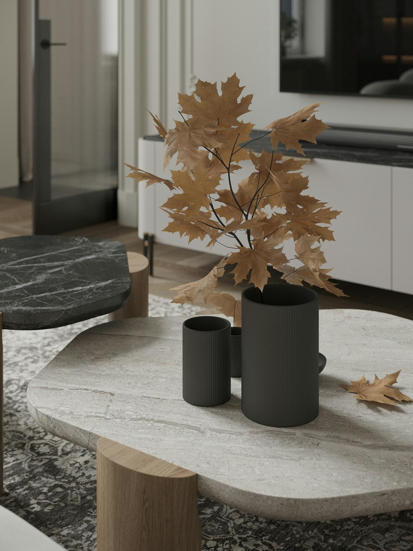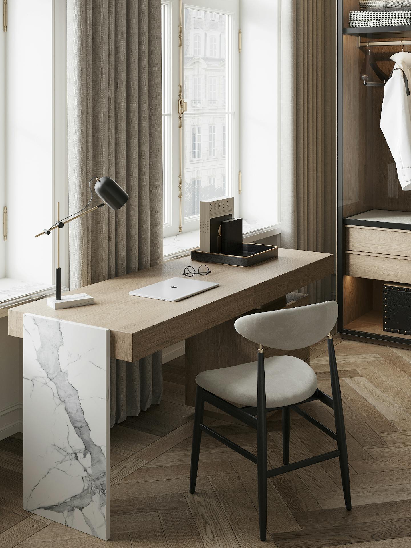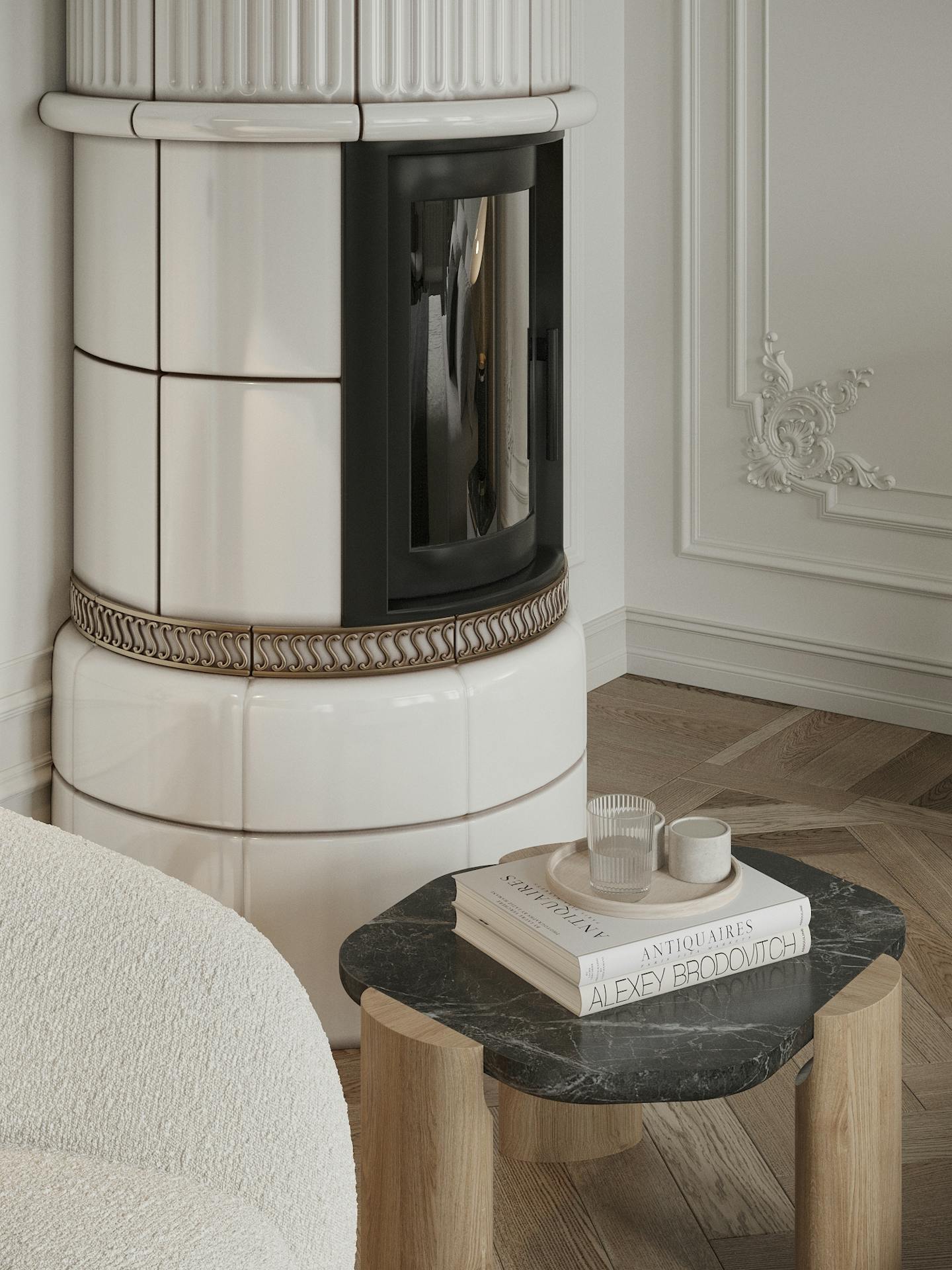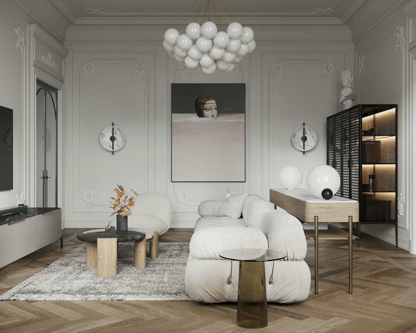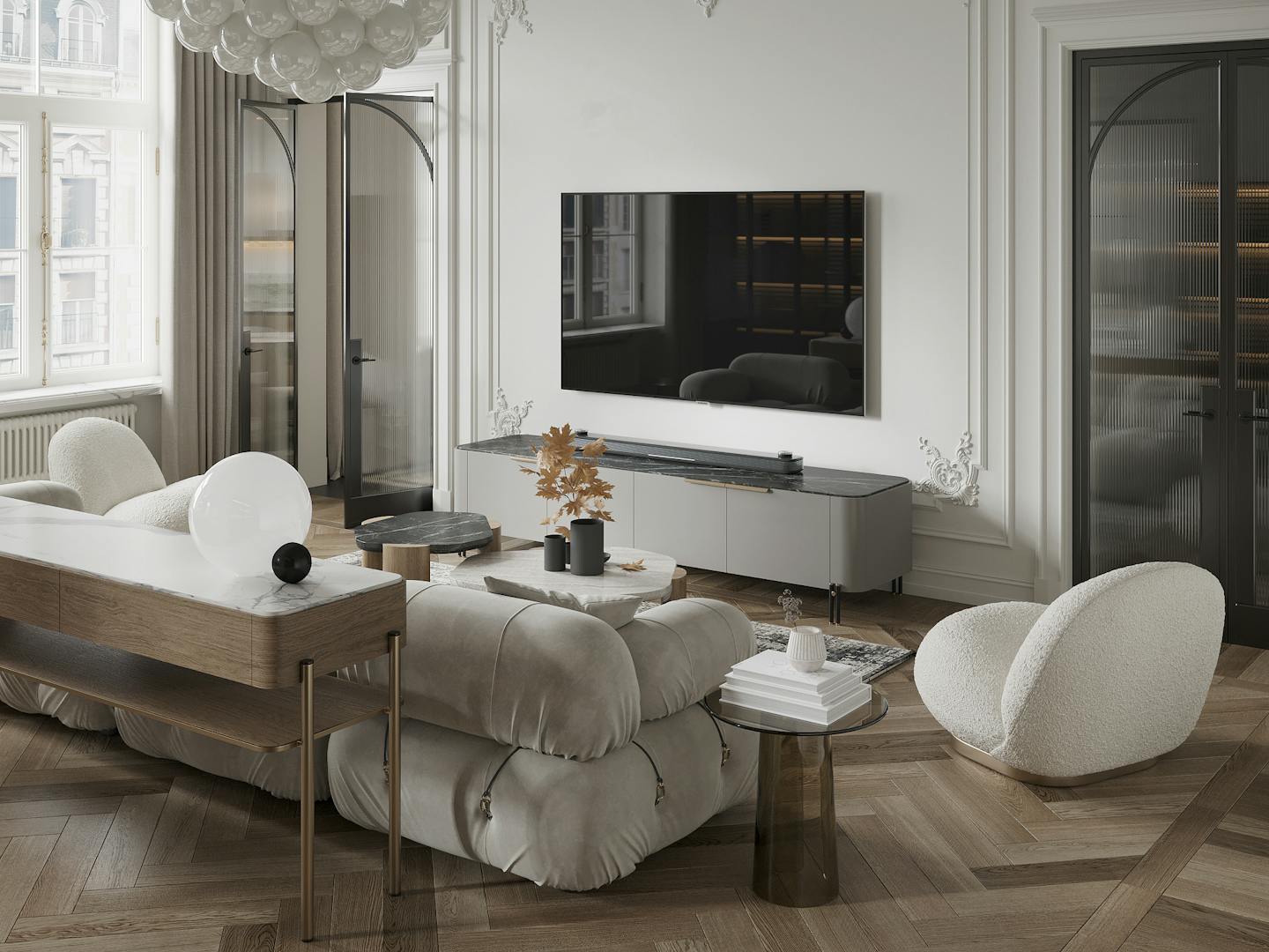 В дизайне интерьера мы использовали спокойную светлую гамму с теплыми оттенками натурального дерева и мрамора. Яркие темные элементы контрастируют на белом фоне.