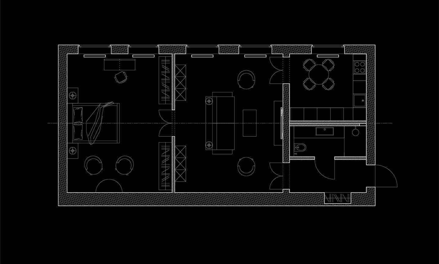 В планировочном решении поменяли расположение дверей, проведя ось вдоль всей квартиры.