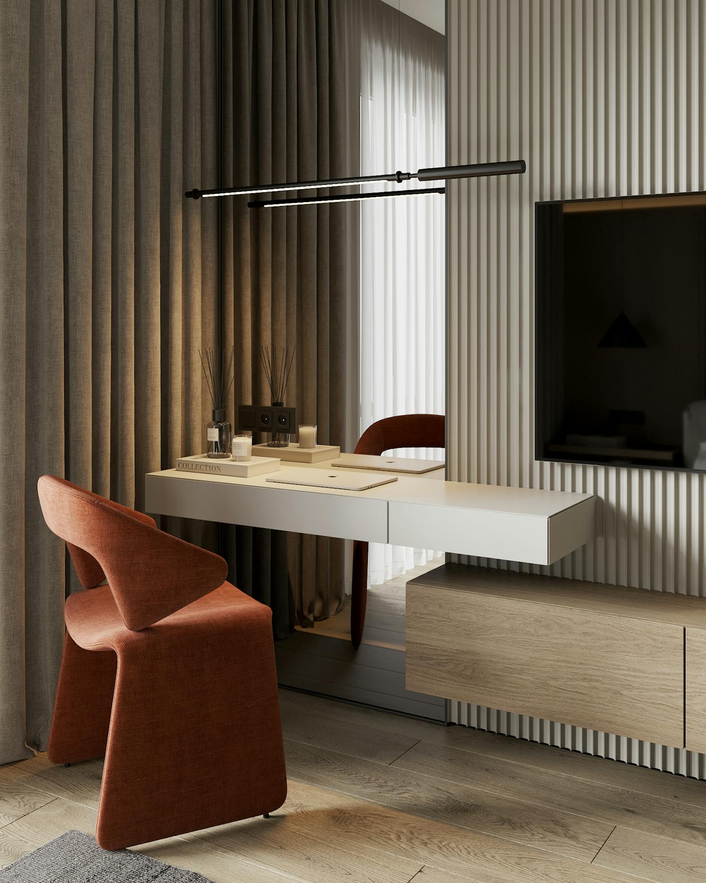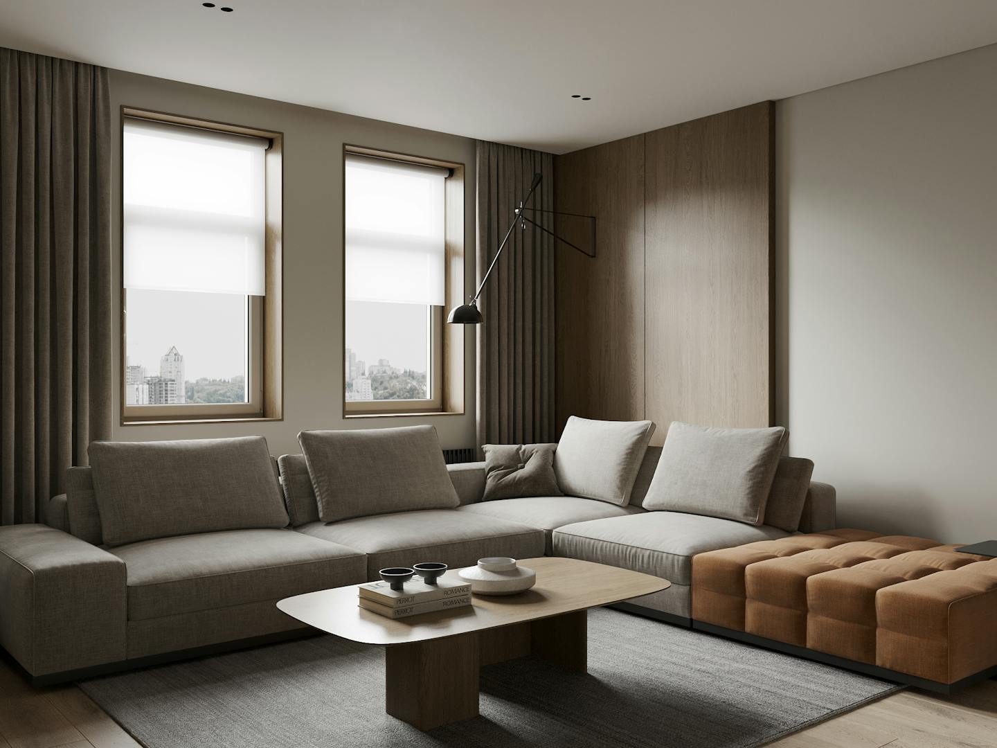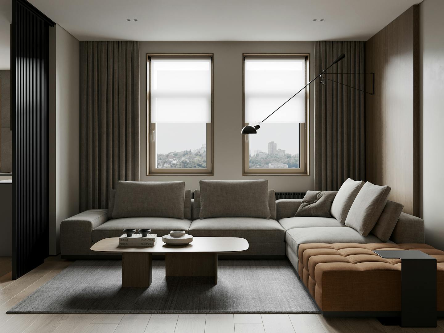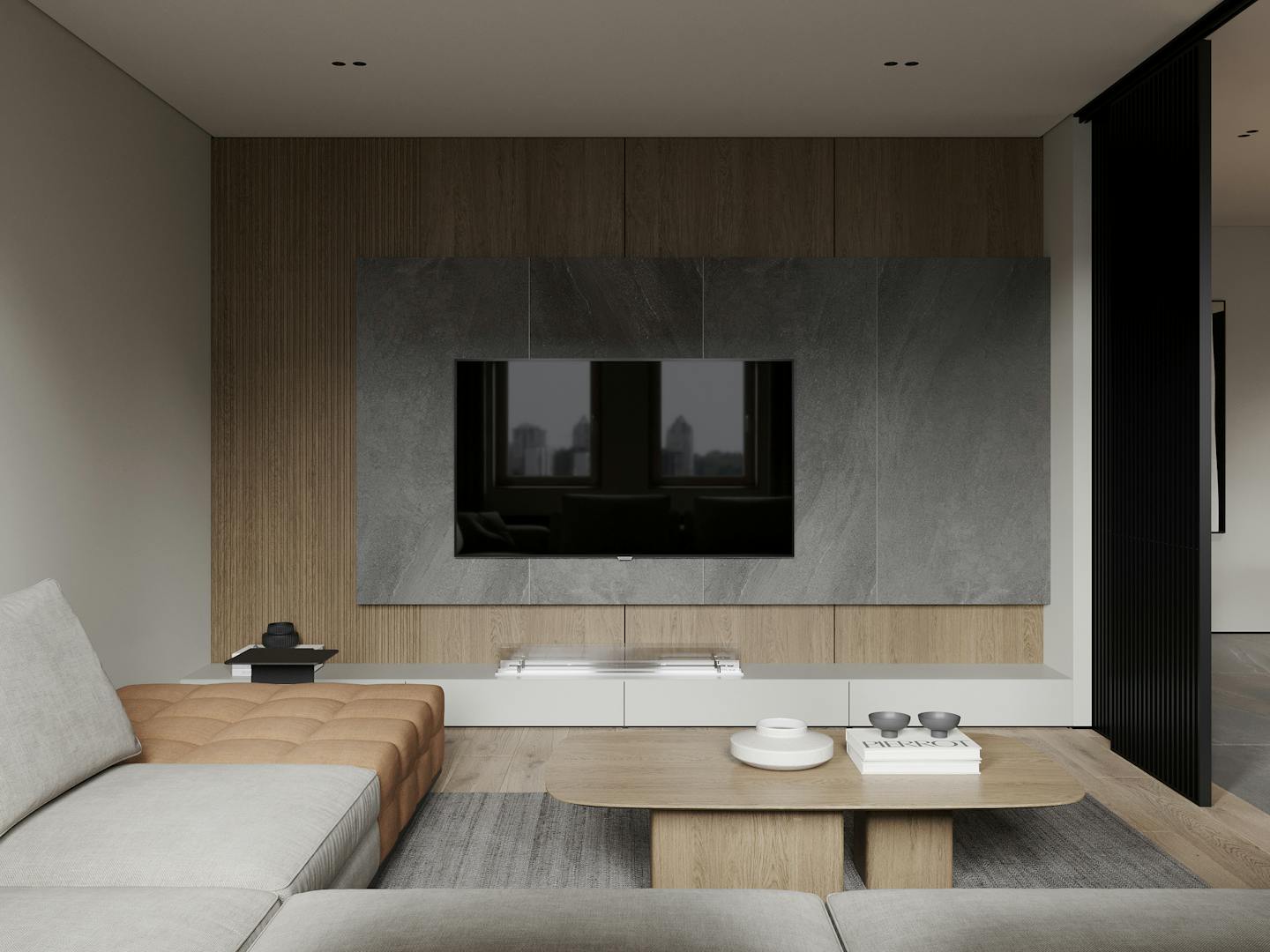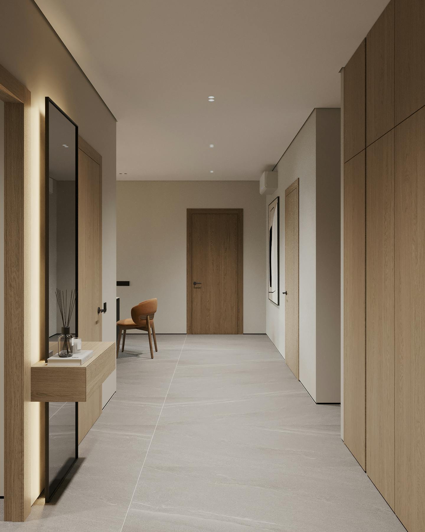 Комфортное, современное пространство, в котором используется множество натуральных материалов: дерево, камень, шерсть и лен. Светлая цветовая гамма с оттенками белого, бежевого, светло-серого и терракотового.
