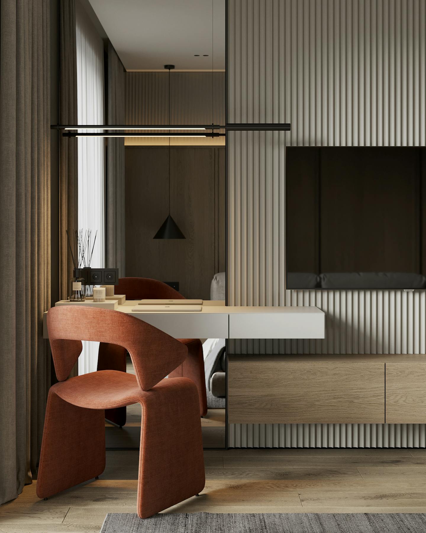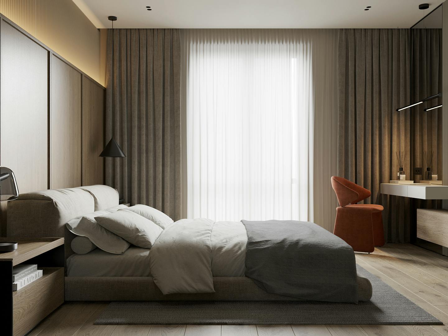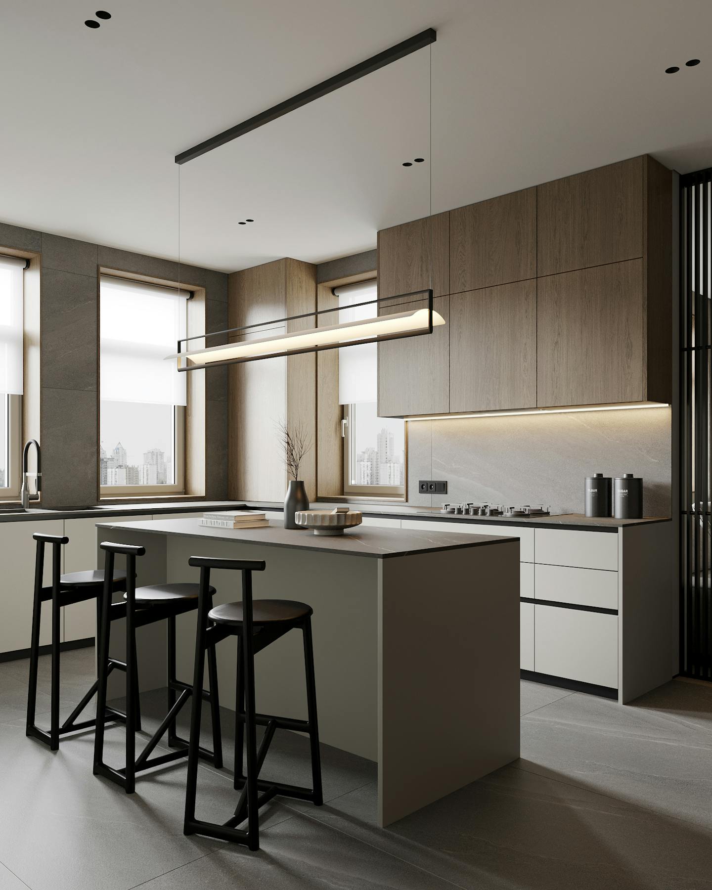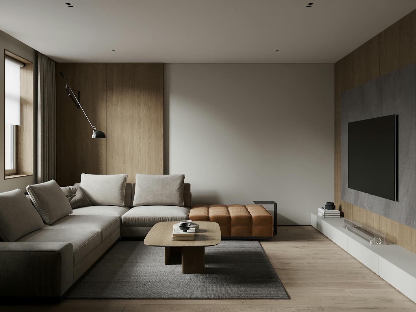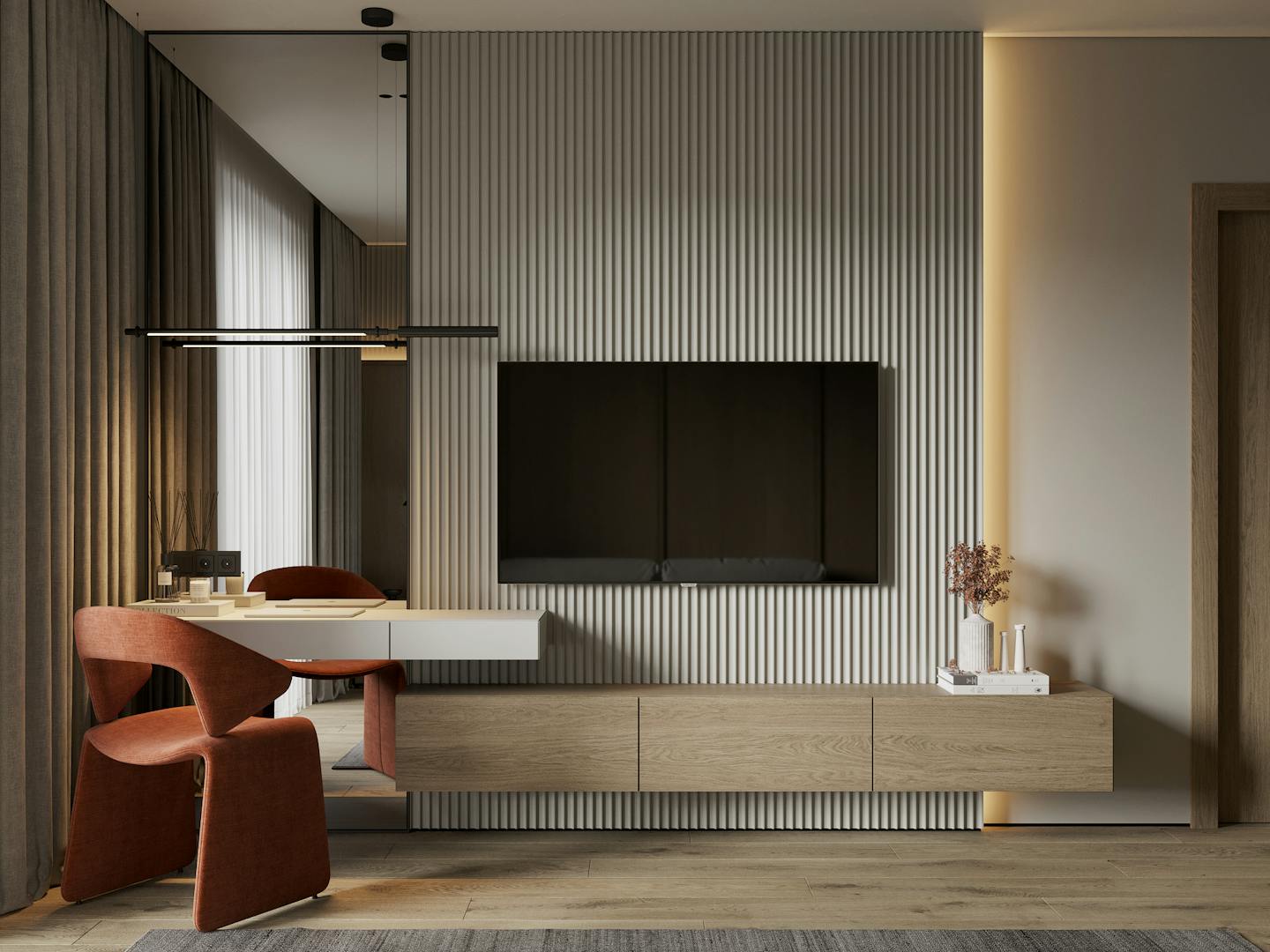 Комфортное, современное пространство, в котором используется множество натуральных материалов: дерево, камень, шерсть и лен. Светлая цветовая гамма с оттенками белого, бежевого, светло-серого и терракотового.