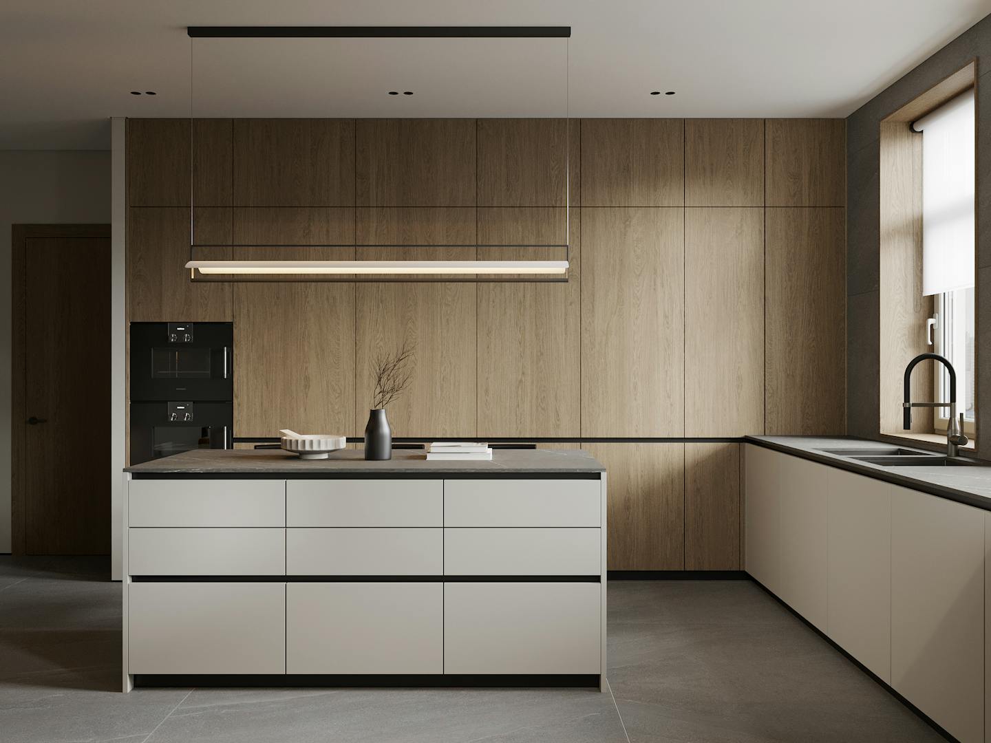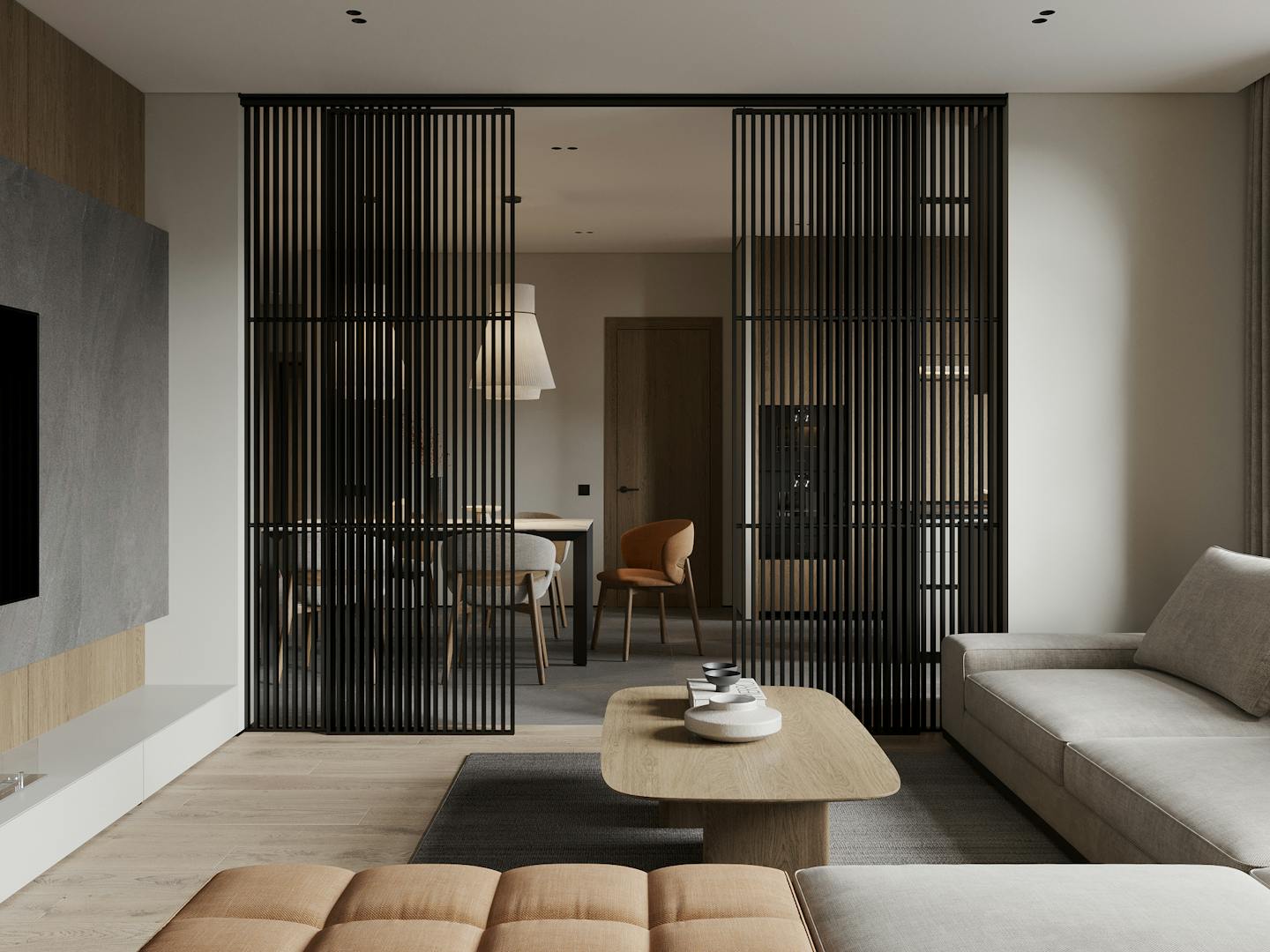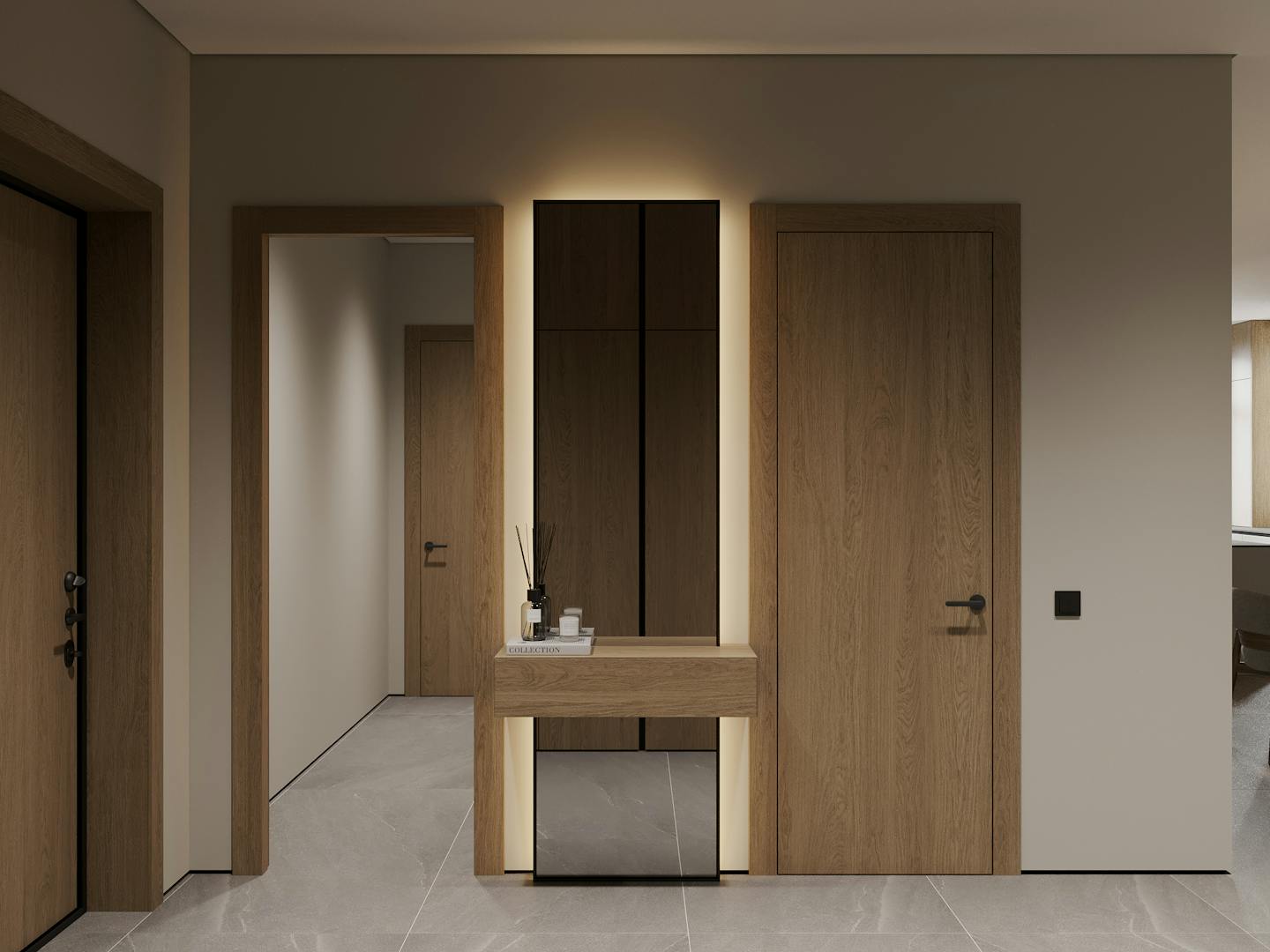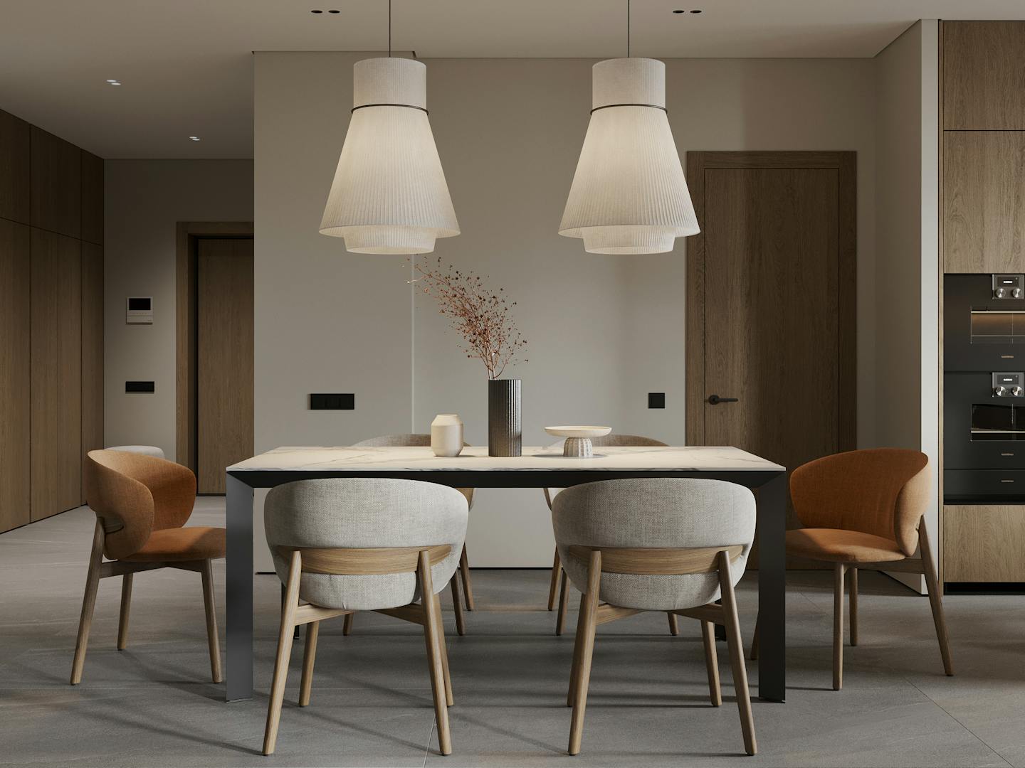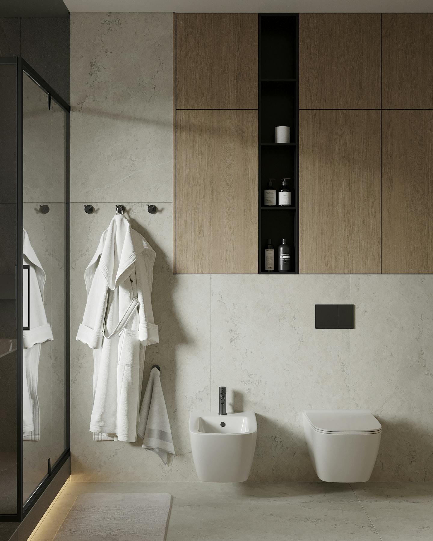 Комфортное, современное пространство, в котором используется множество натуральных материалов: дерево, камень, шерсть и лен. Светлая цветовая гамма с оттенками белого, бежевого, светло-серого и терракотового.