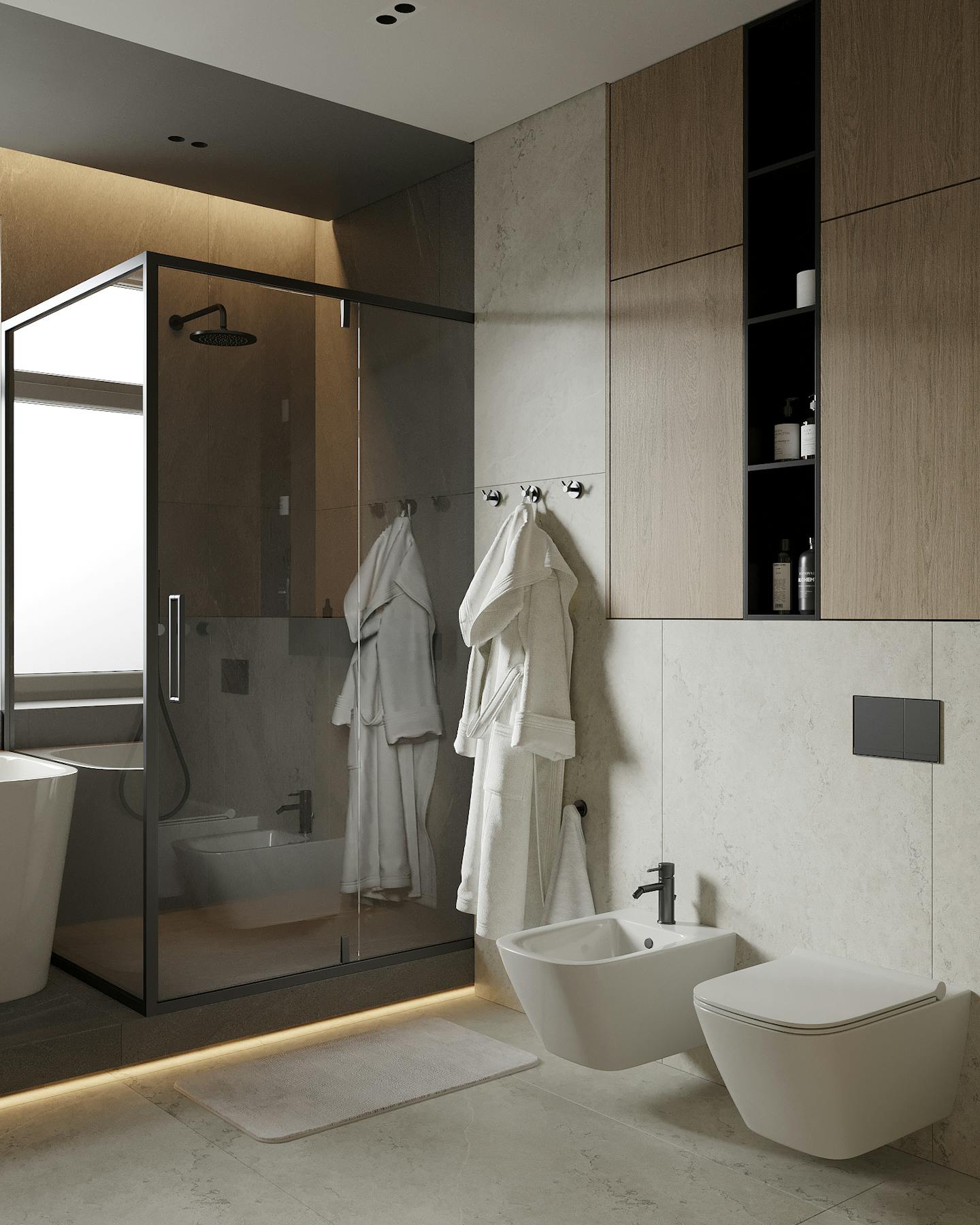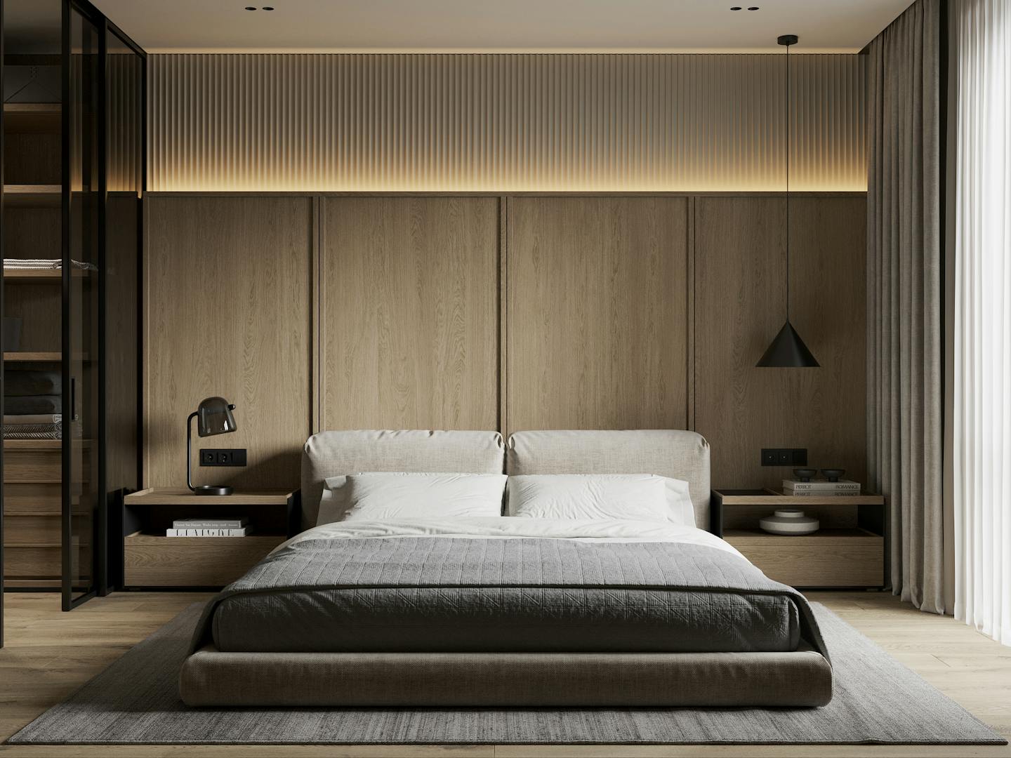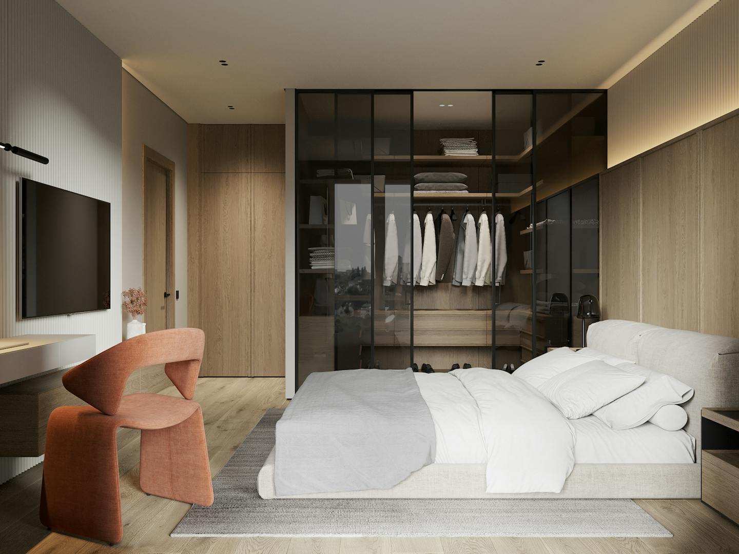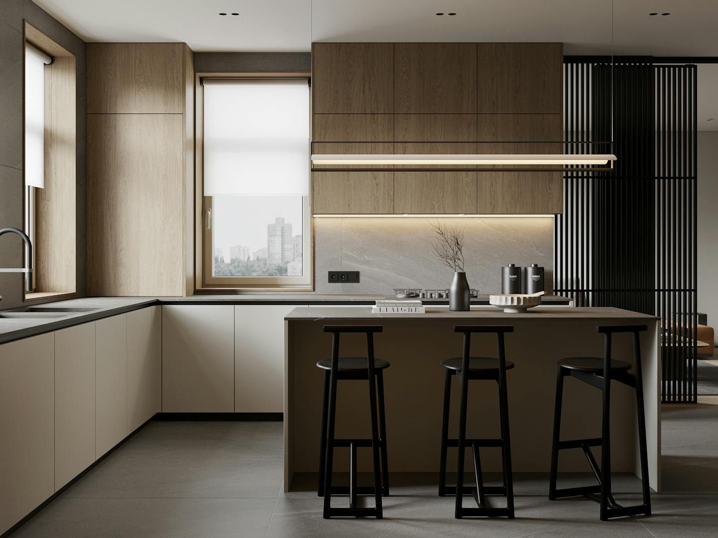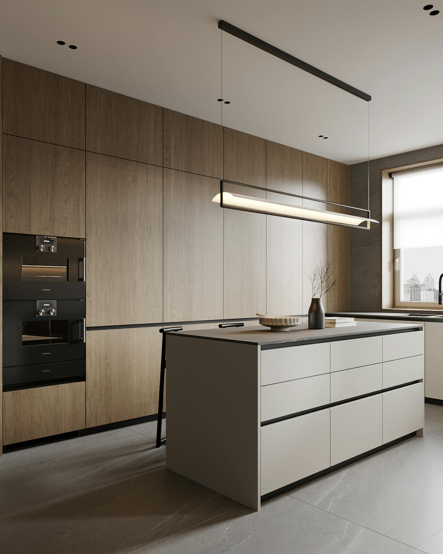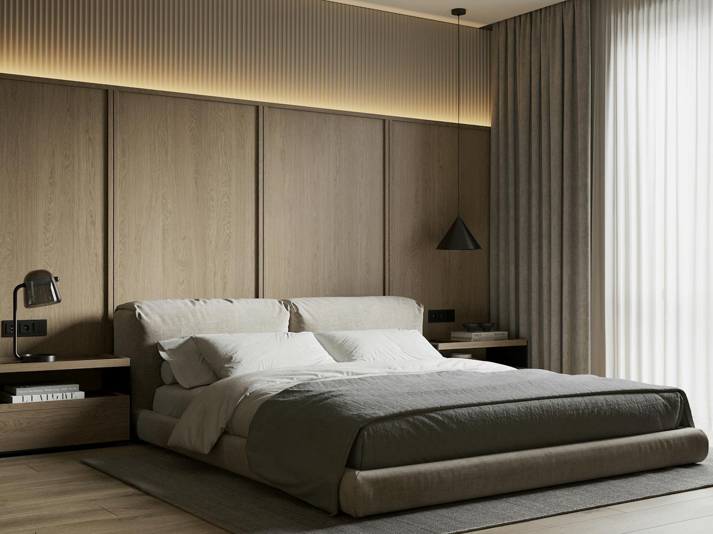 Комфортное, современное пространство, в котором используется множество натуральных материалов: дерево, камень, шерсть и лен. Светлая цветовая гамма с оттенками белого, бежевого, светло-серого и терракотового.