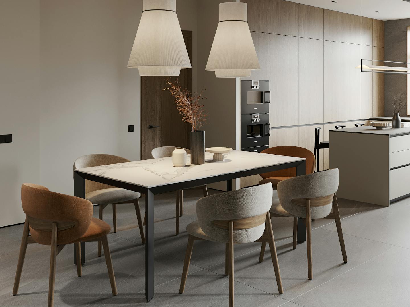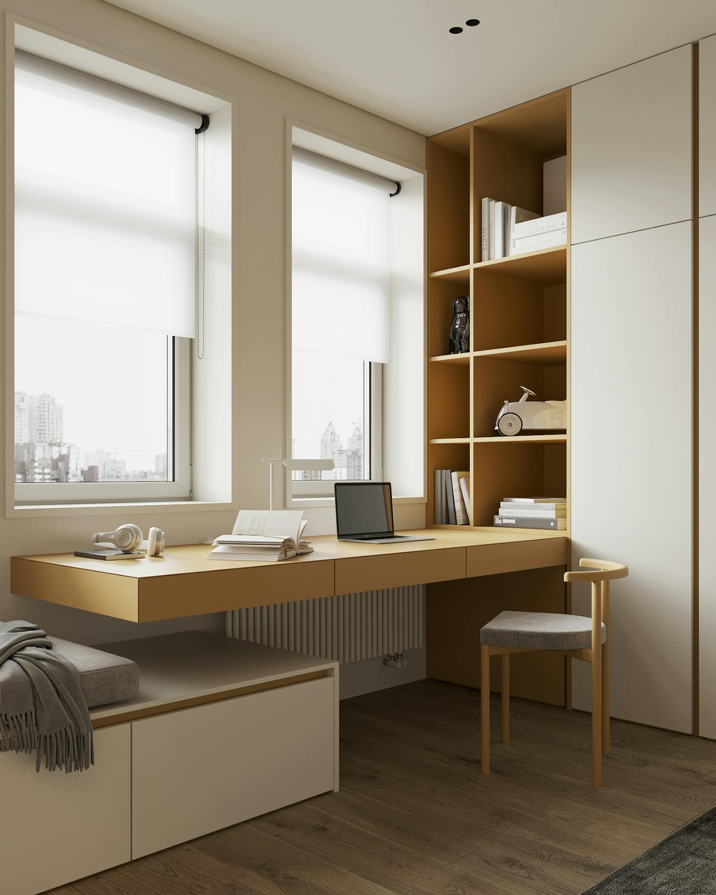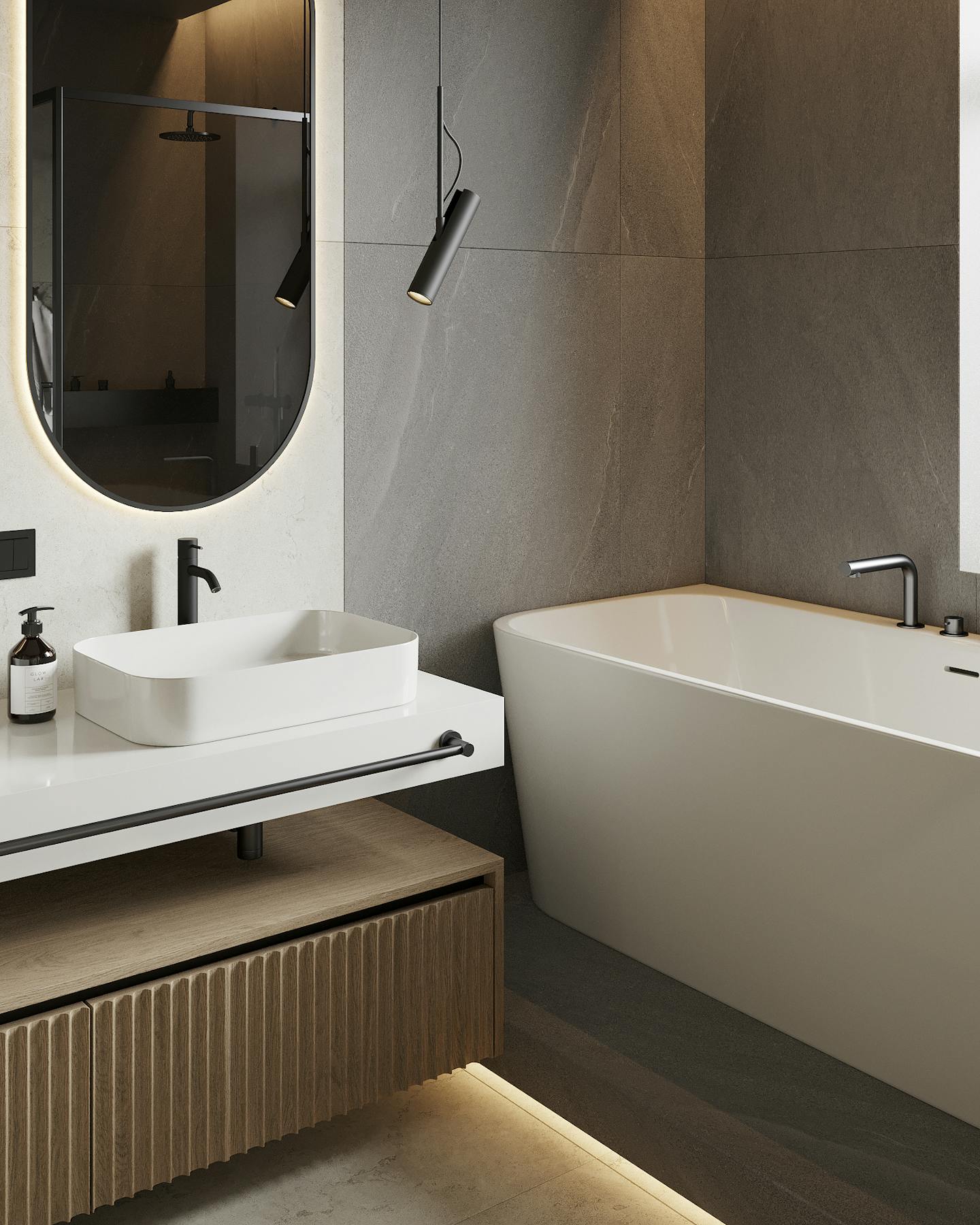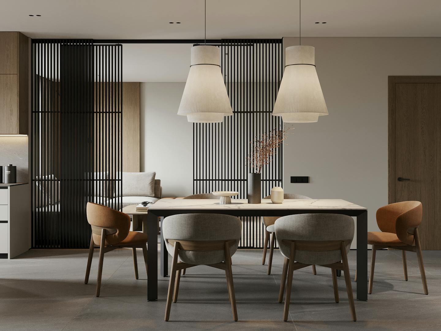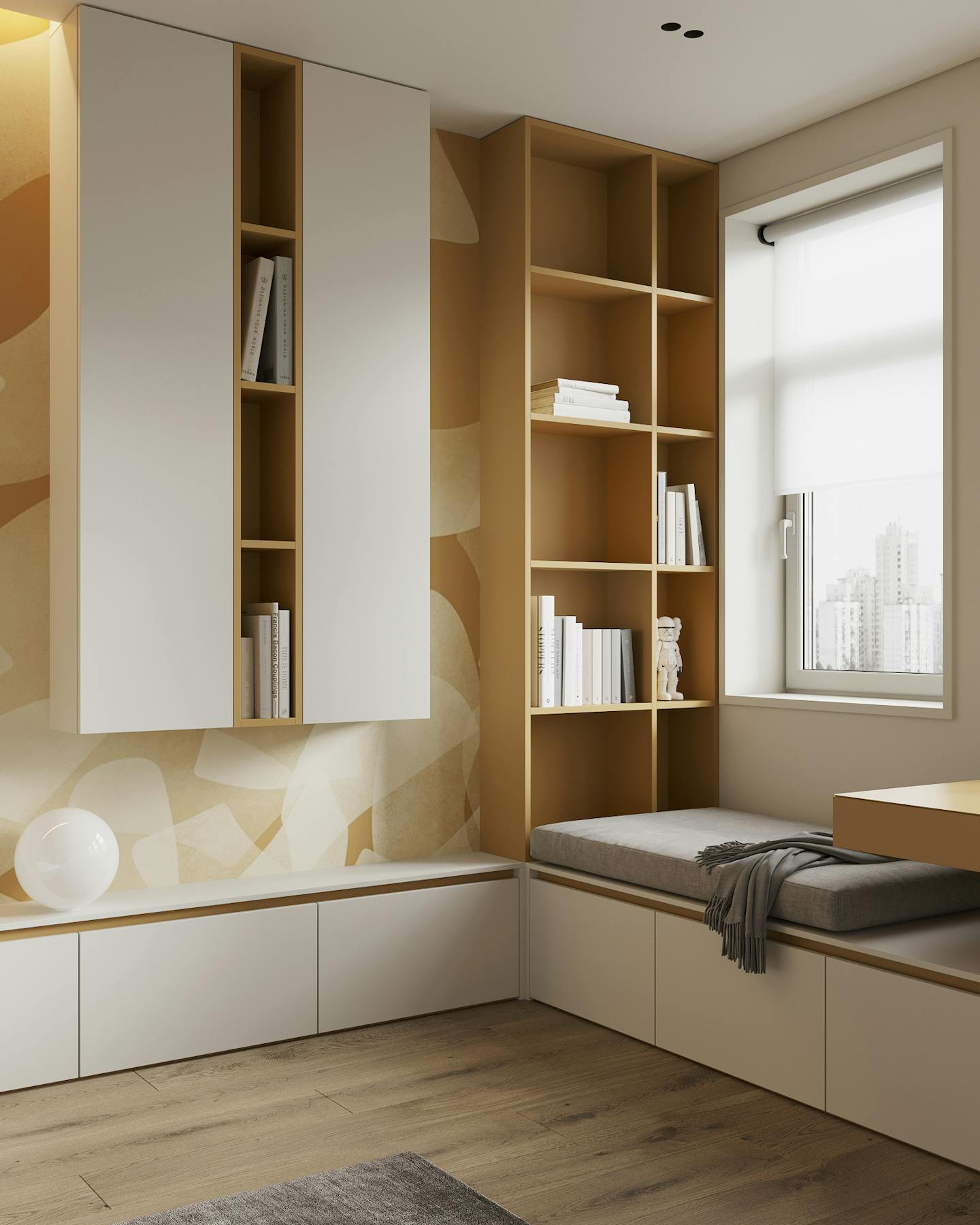 Комфортное, современное пространство, в котором используется множество натуральных материалов: дерево, камень, шерсть и лен. Светлая цветовая гамма с оттенками белого, бежевого, светло-серого и терракотового.