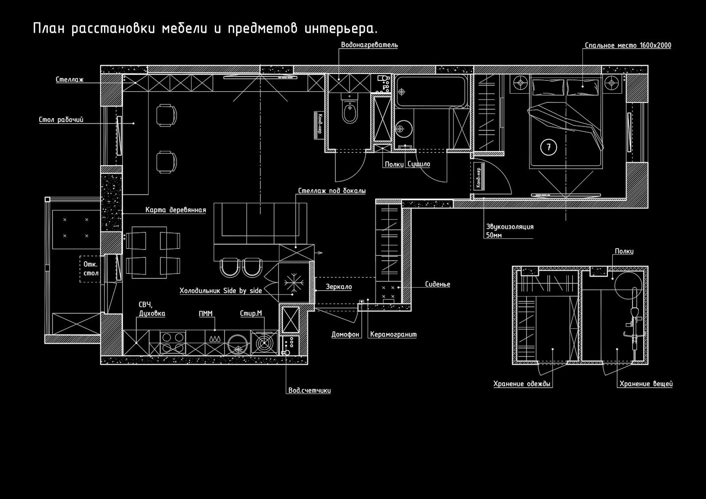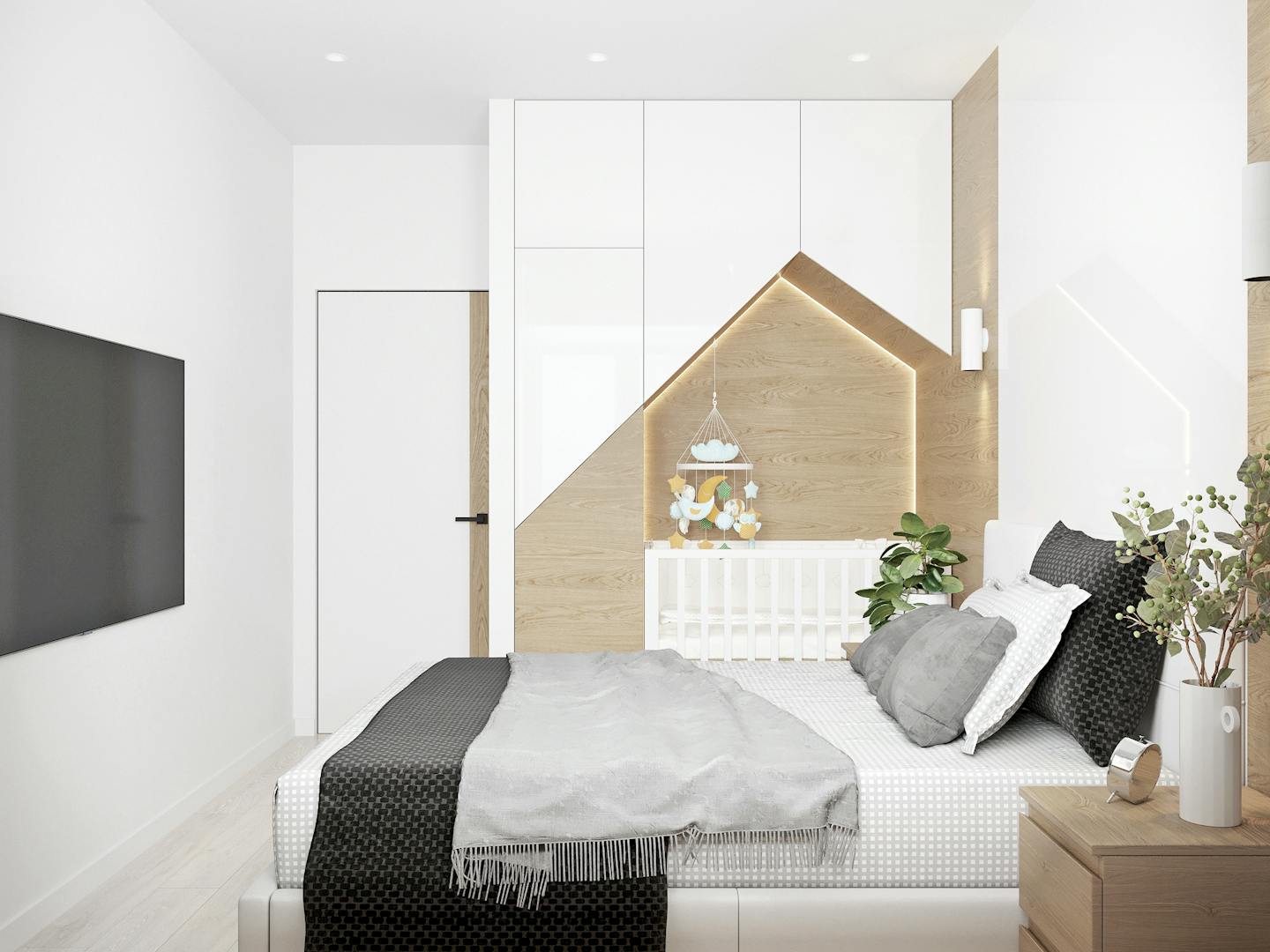 В квартире разместили большую и функциональную кухню с барной стойкой и отдельным столом, удобную мягкую группу, небольшую, но уютную спальню с кроваткой для малыша, место для работы, а также предусмотреть достаточное количество мест для хранения. В проекте необходимо было выделить рабочую зону, которую мы расположили в гостиной.