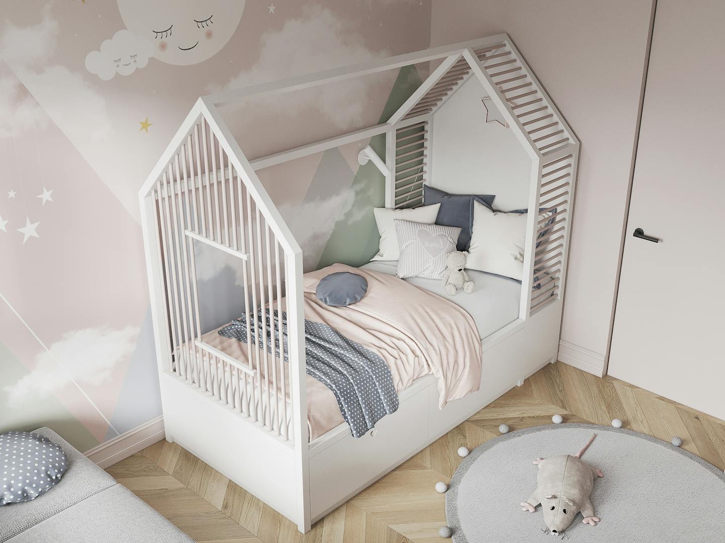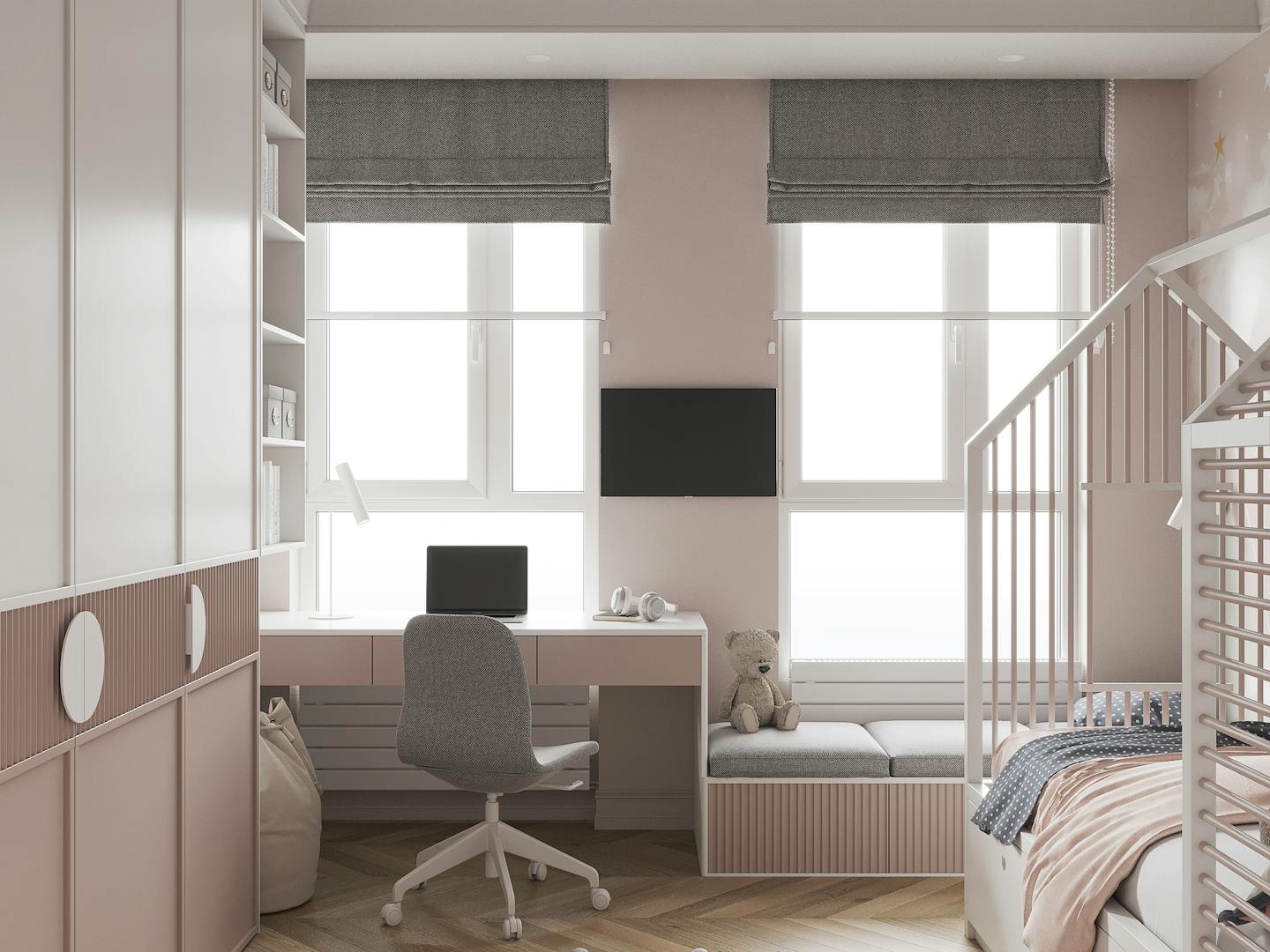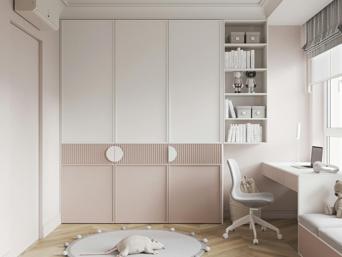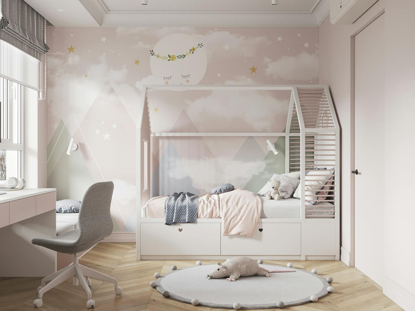 Детскую сделали в нежных пастельных оттенках, невесомой и легкой. Вся мебель сделана сделана под заказ.
