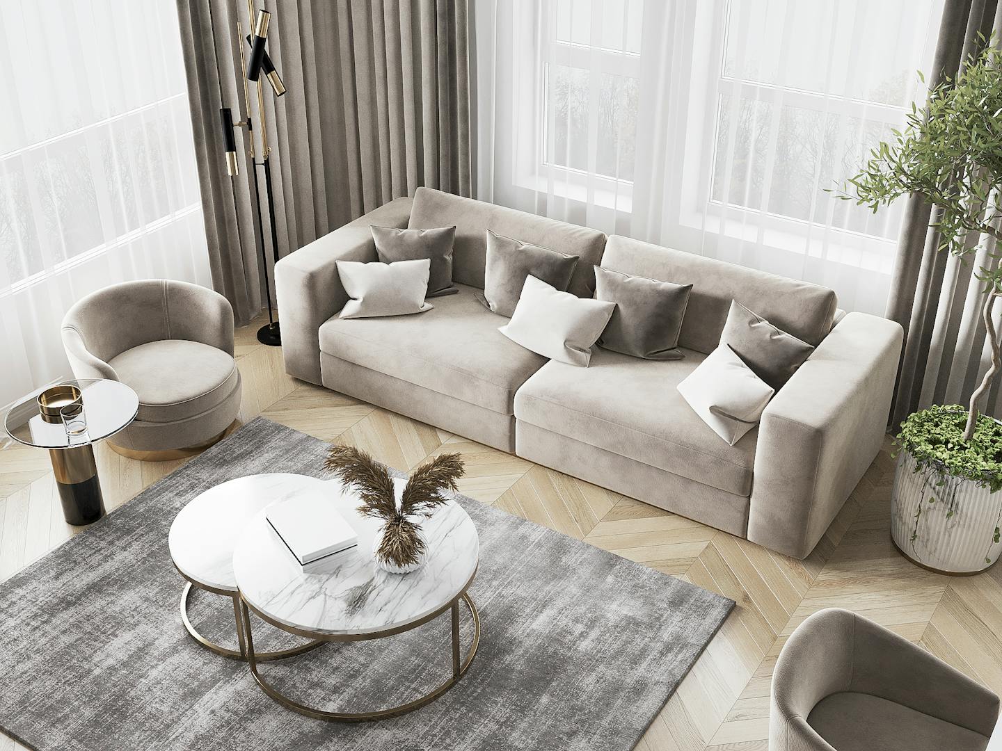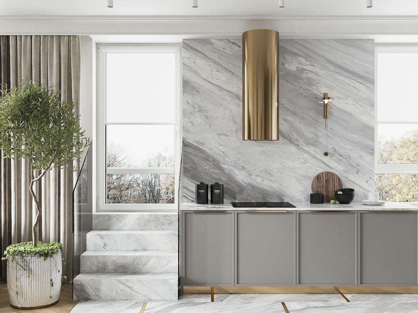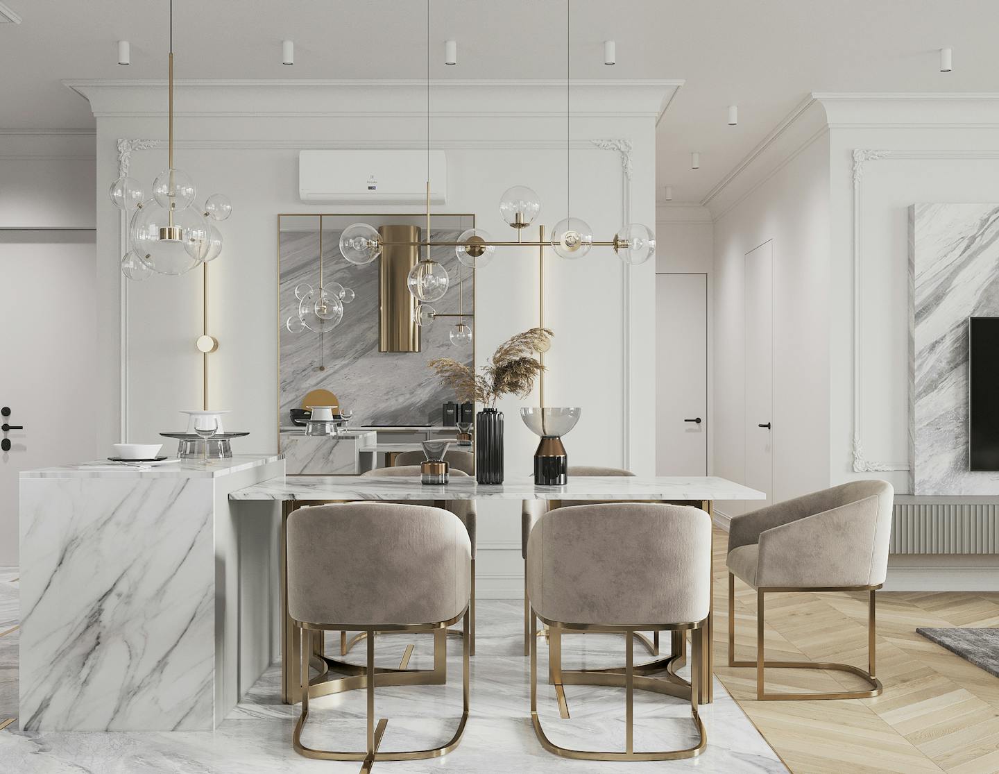 Красивые, высокие потолки с карнизами и лепниной, а также большие окна в пол еще сильнее подчеркнули молдингами по периметру стен и минималистичным фоном. Цветовая гамма нейтральная. На стенах — белая штукатурка, на полу — паркетная доска, в зоне тв и кухни добавили мраморные элементы. Акценты создаются за счет архитектуры самого помещения, гармонии объемов и форм. Холодная палитра дополнена теплым деревом, текстилем и подсветкой стен. Разбавляется интерьер золотой отделкой светильников — как, например, характерная люстра в гостиной, стульев, фурнитуры. Вытяжку тоже подобрали красивого латунного оттенка.