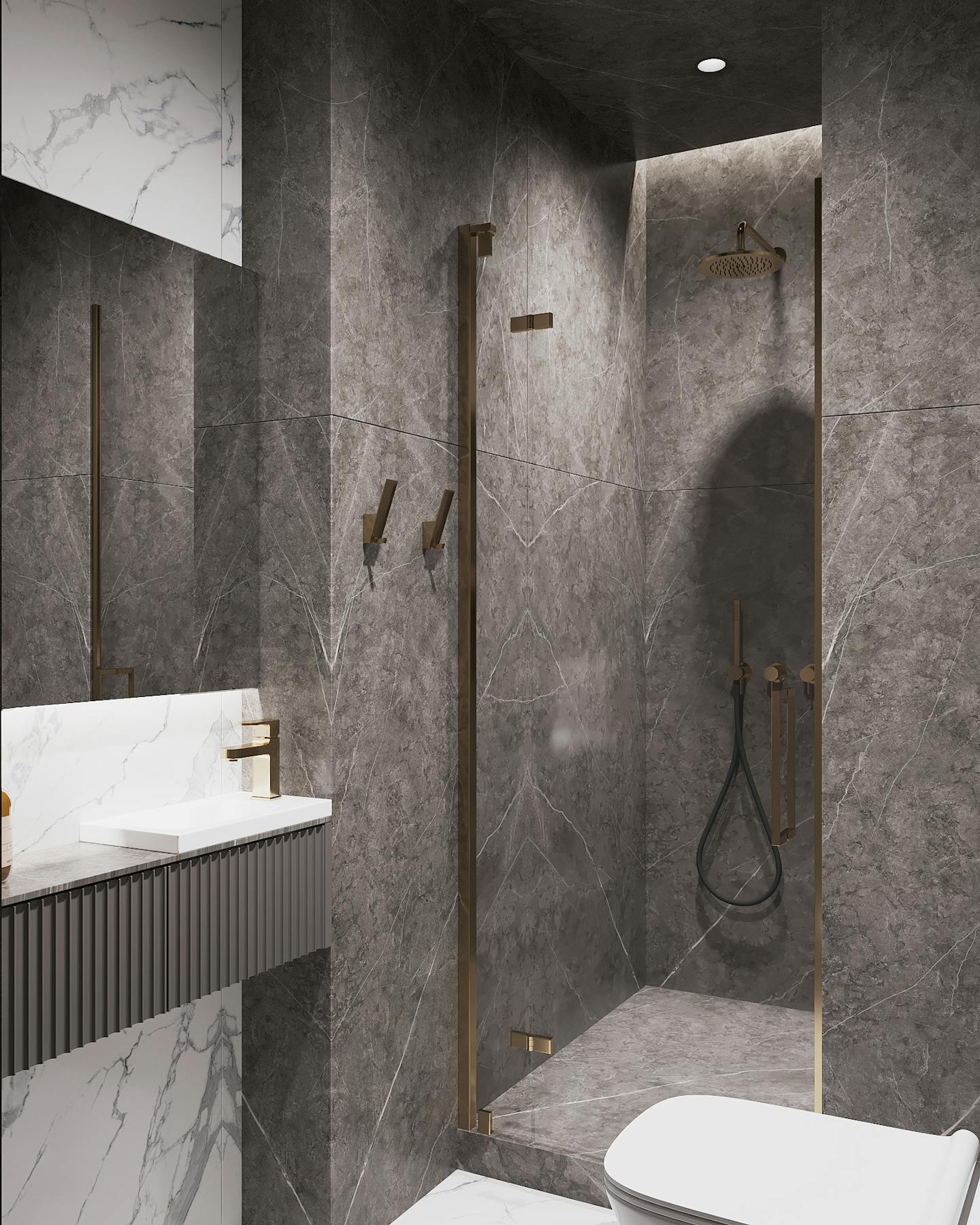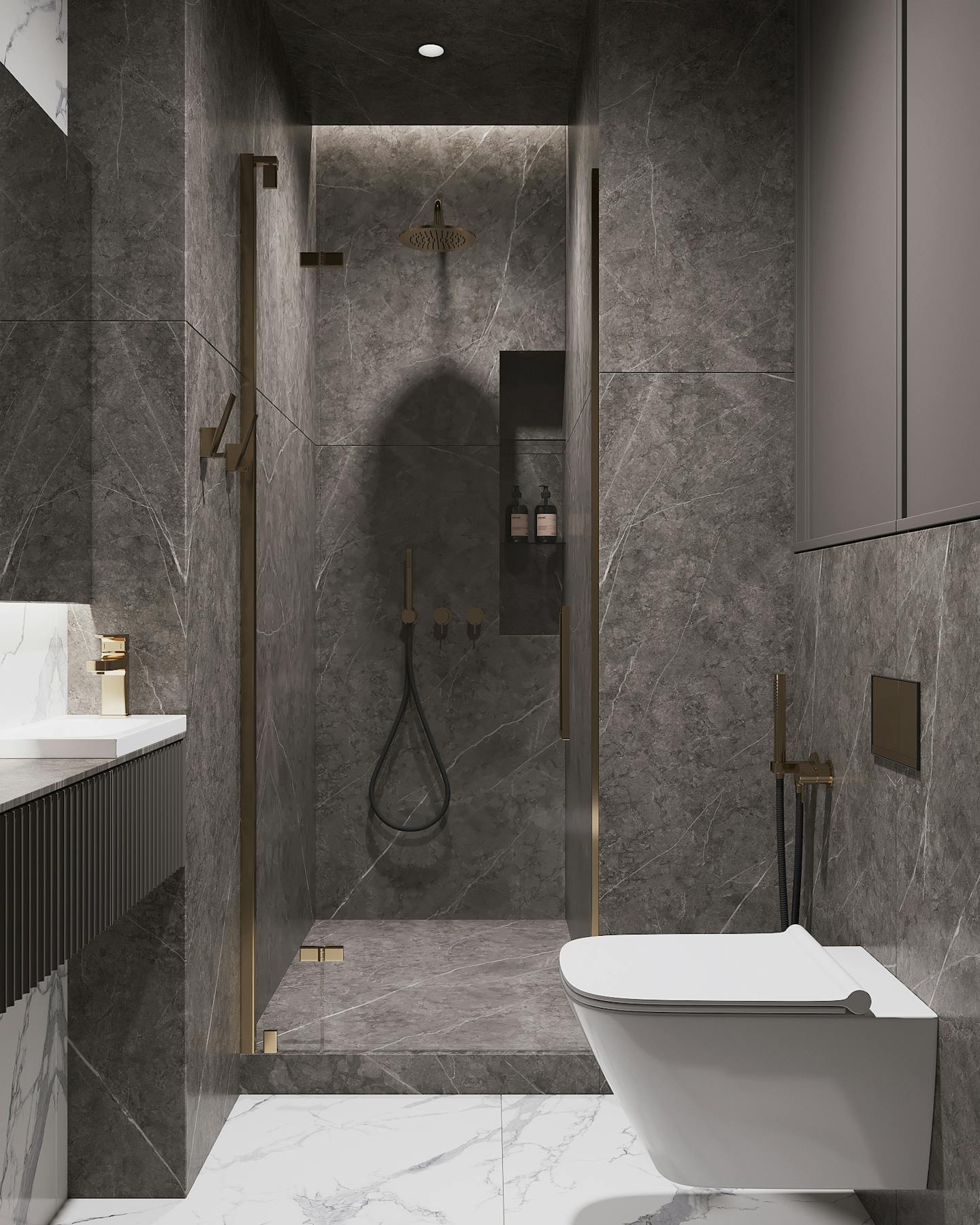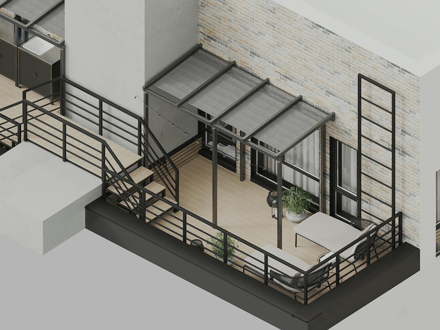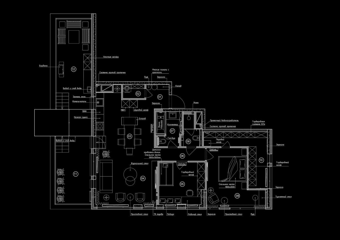 Мебель — минималистичная по характеру и сложная по форме. В пространстве достаточно искусственного освещения, чтобы осветить функциональные зоны и сделать уютными места отдыха.
