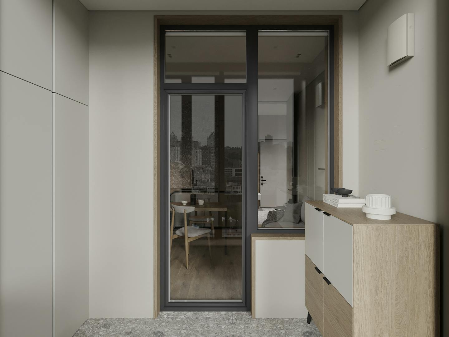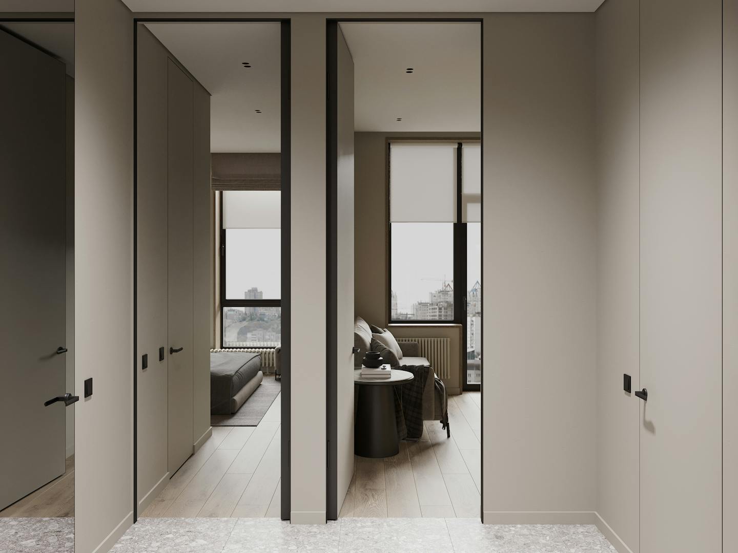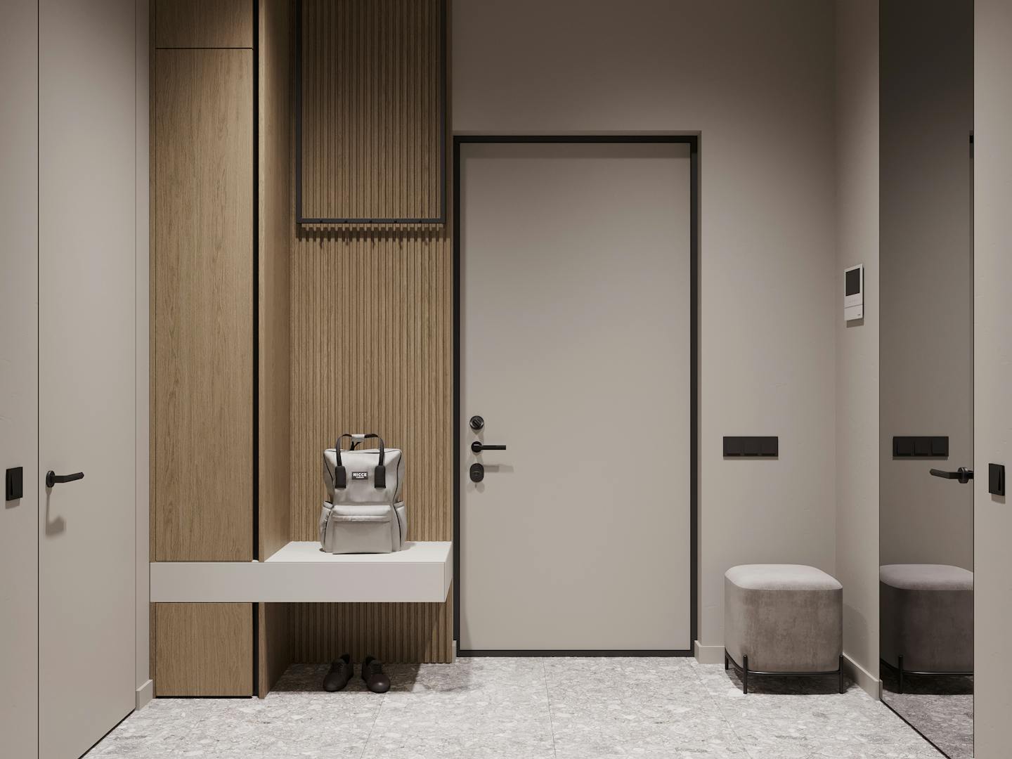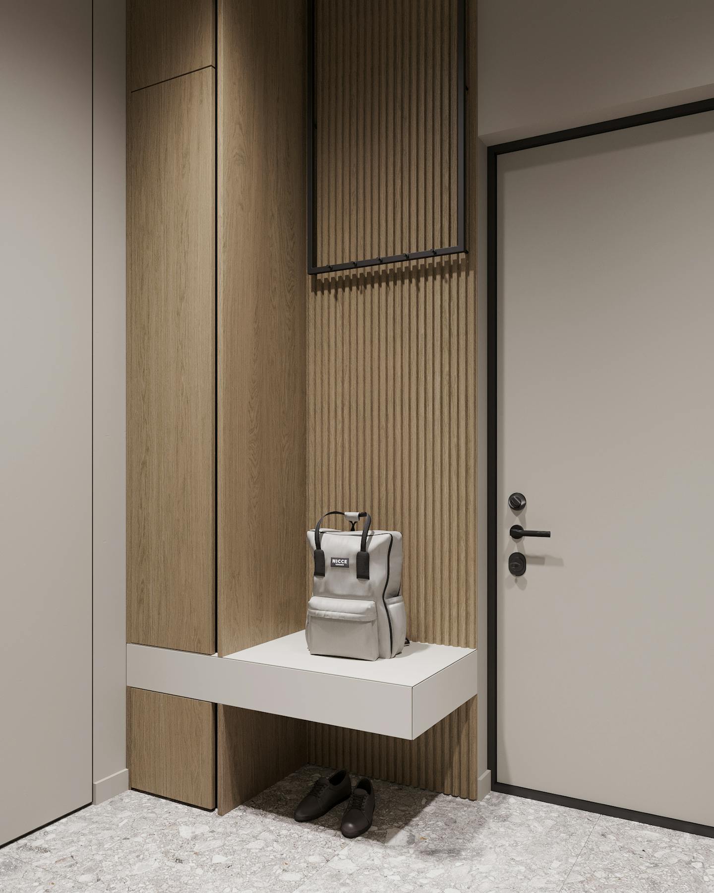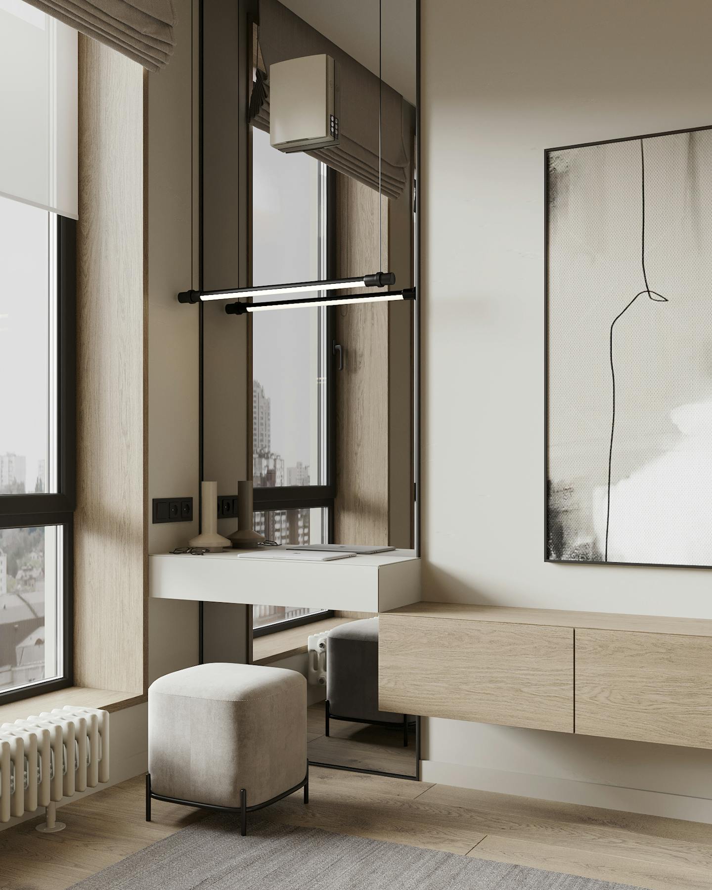 Для стен и мебели мы использовали сложные серо-бежевые, кремовые оттенки. На полу натуральные материалы – инженерная доска и керамический гранит в приглушенных тонах. Для создания теплых акцентов в помещении использовали мебель из искусственных материалов, которые имитируют древесину.