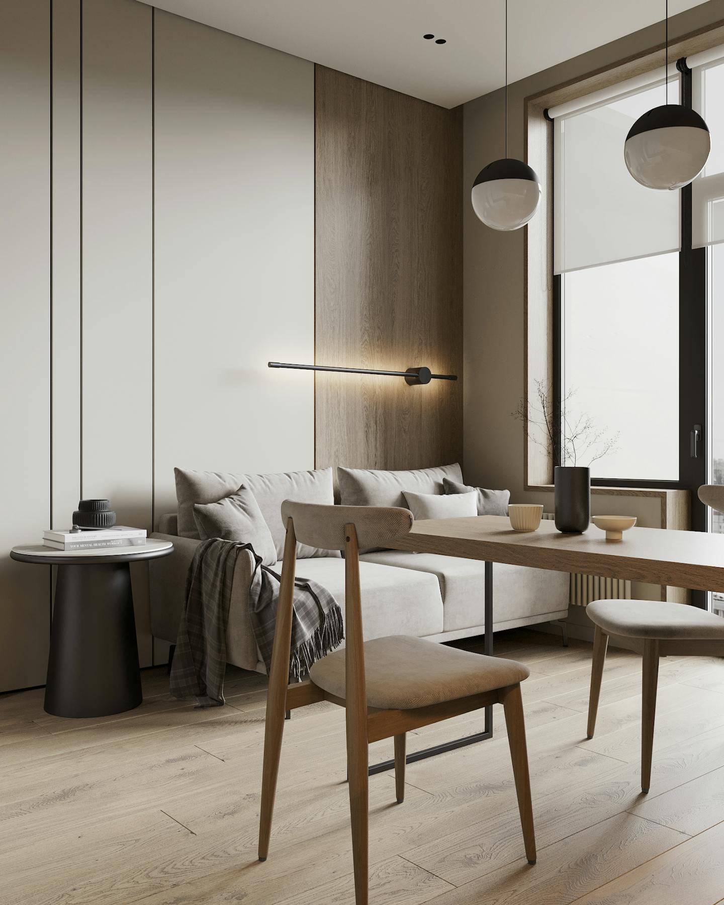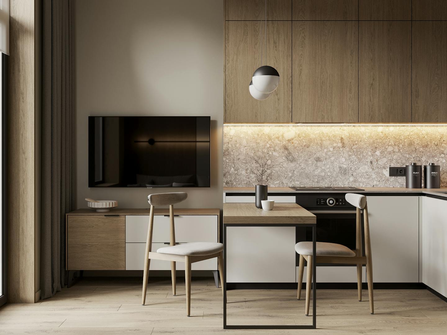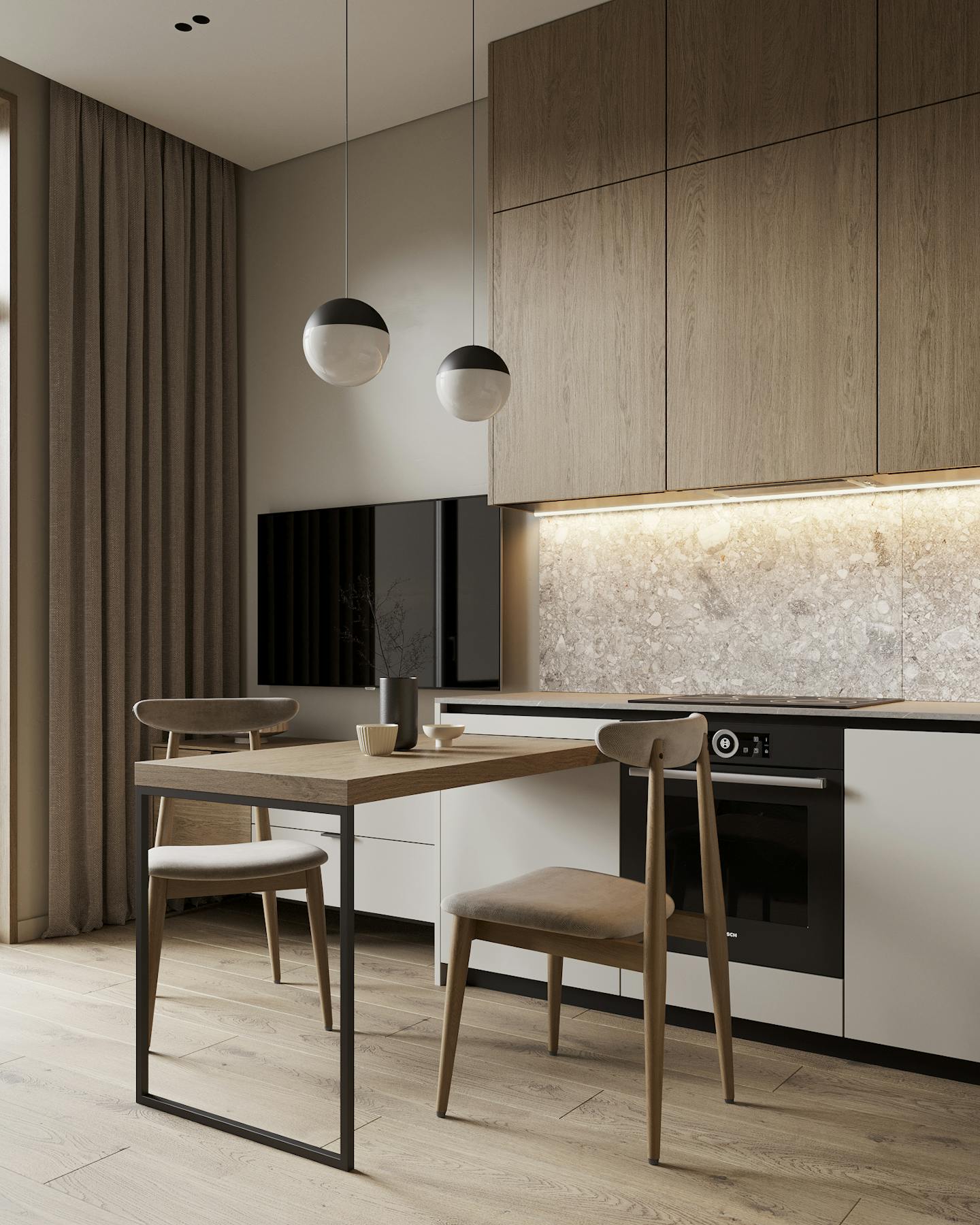 Получился очень теплый и спокойный интерьер с нежными оттенками и фактурой естественных материалов.