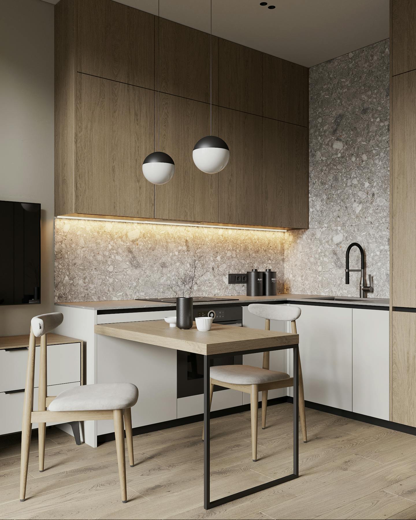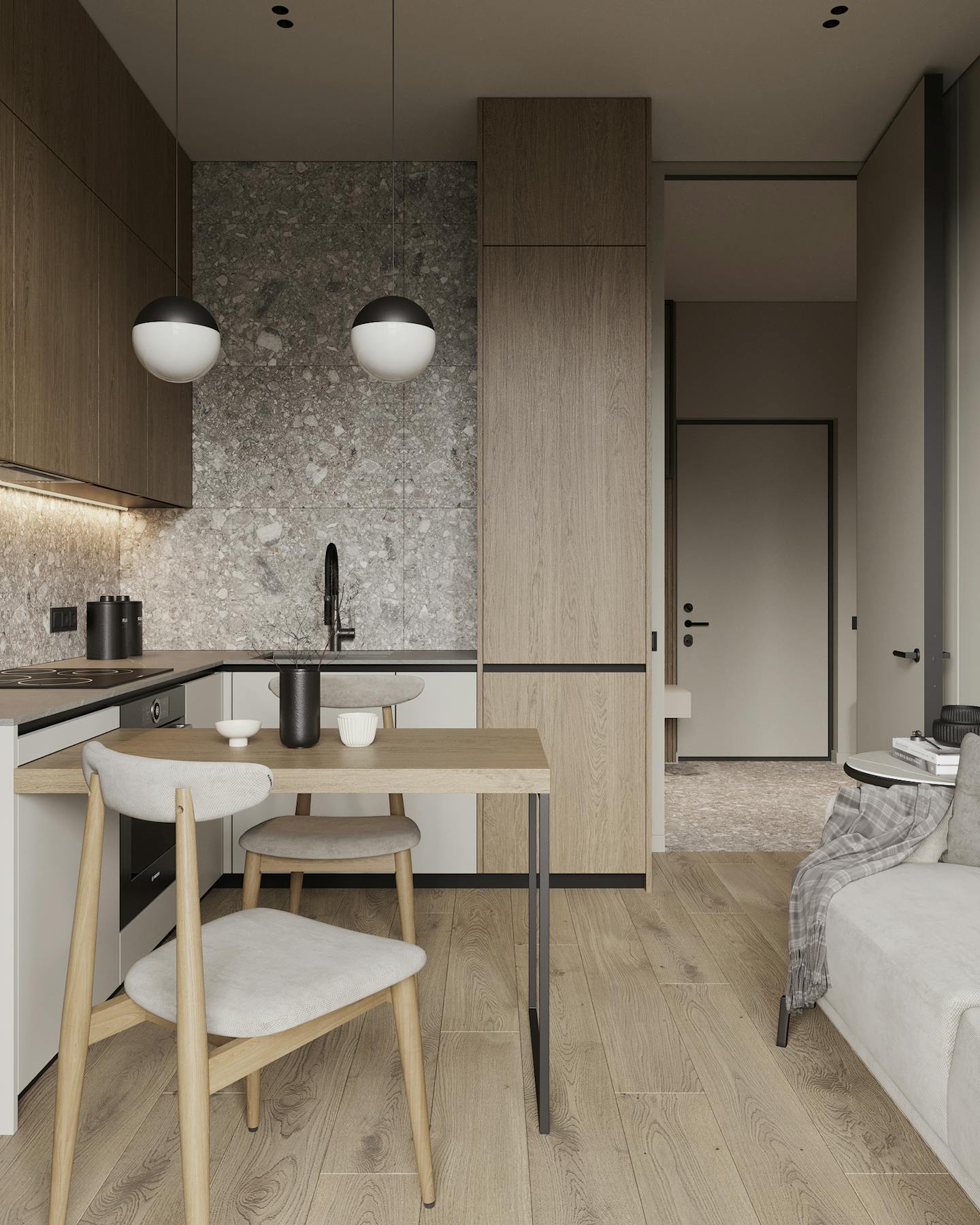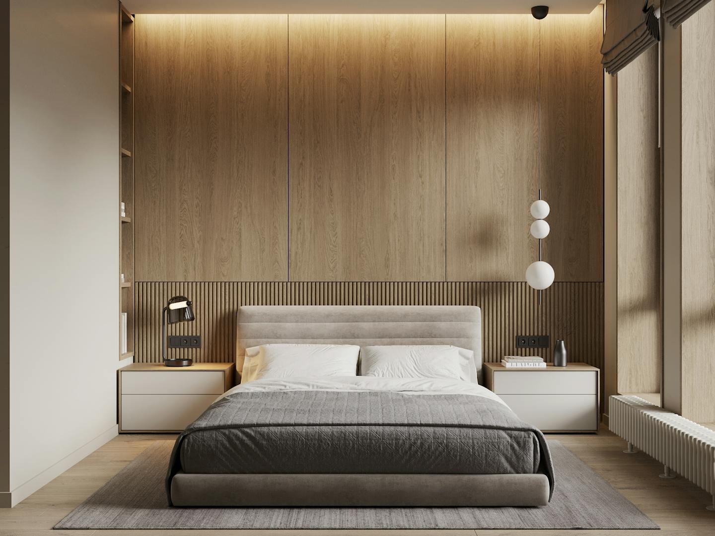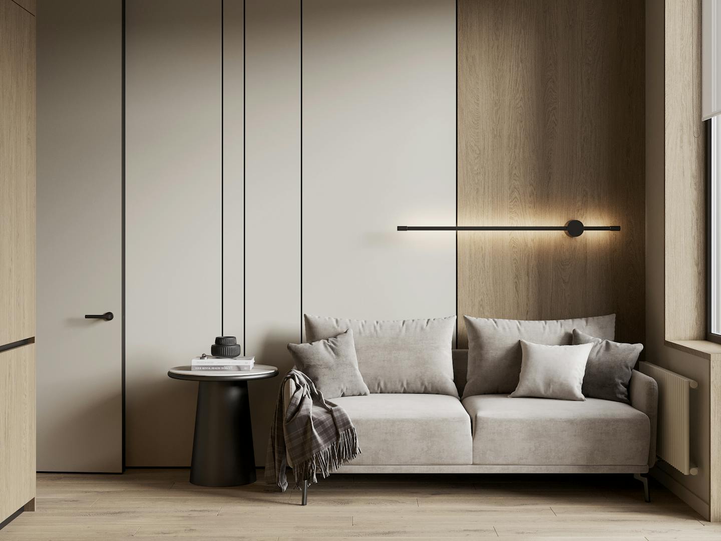 Получился очень теплый и спокойный интерьер с нежными оттенками и фактурой естественных материалов.