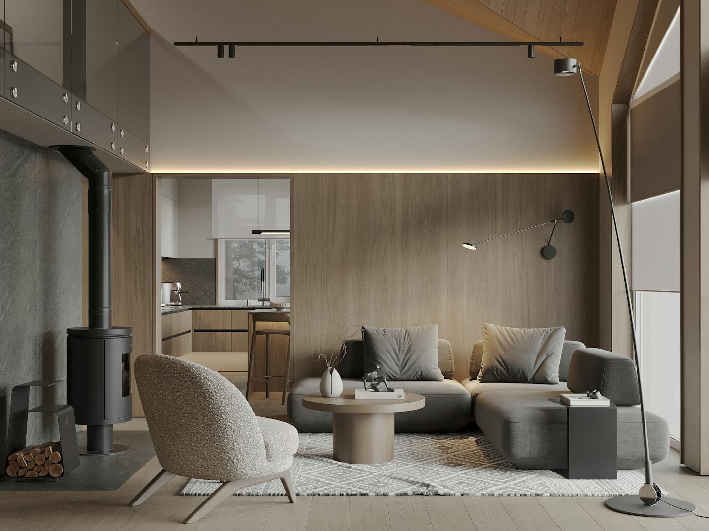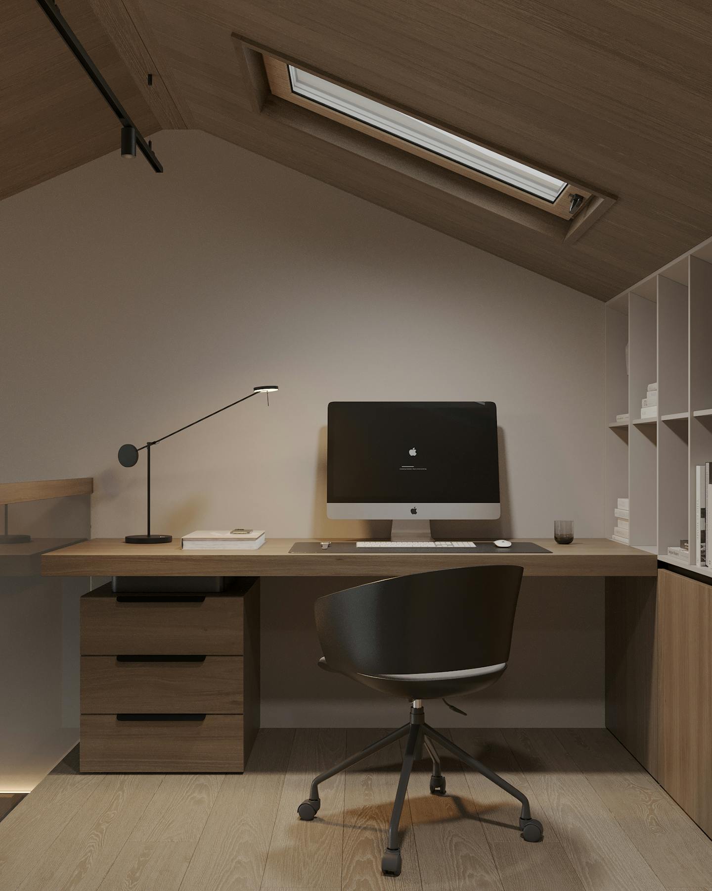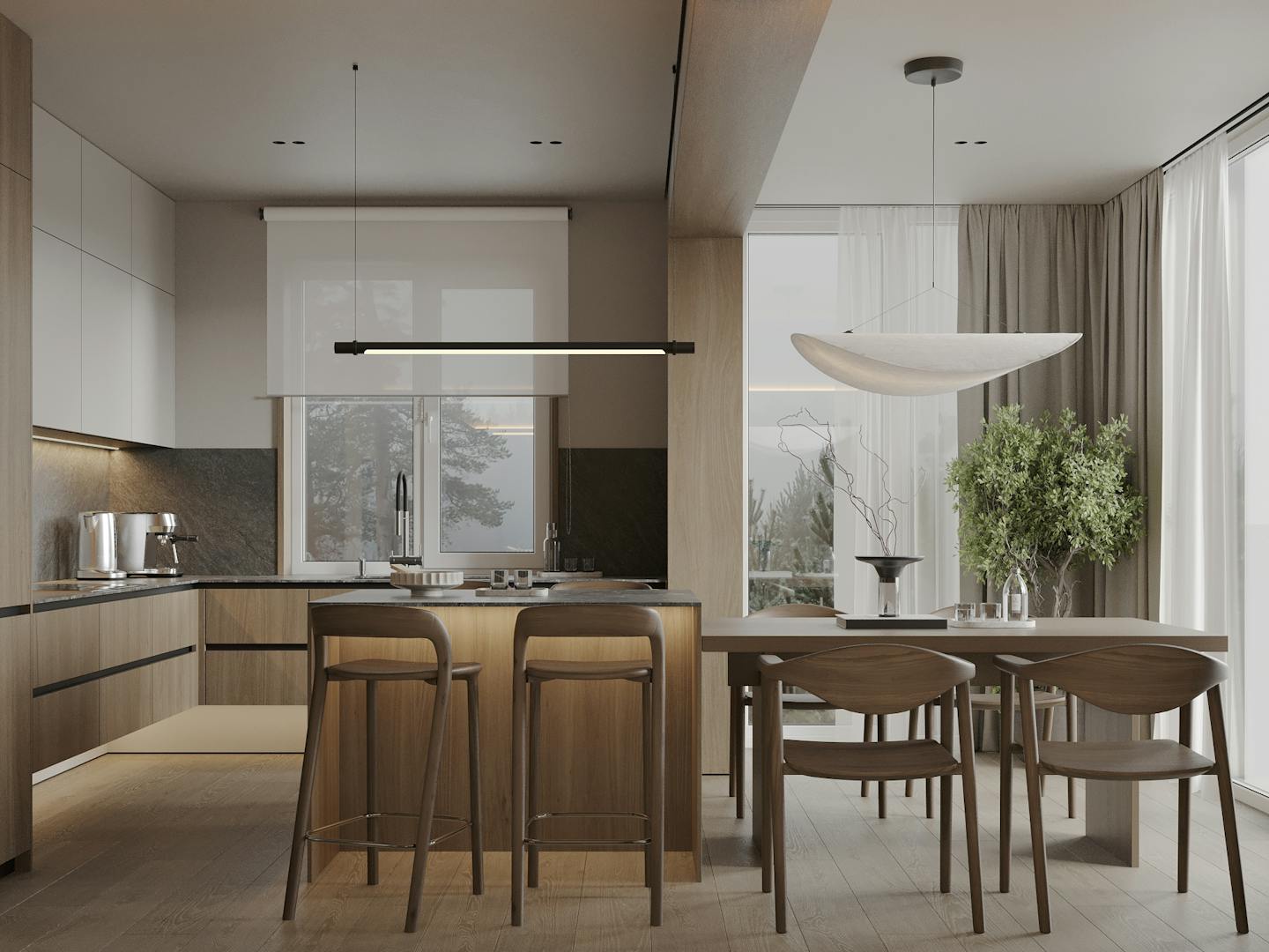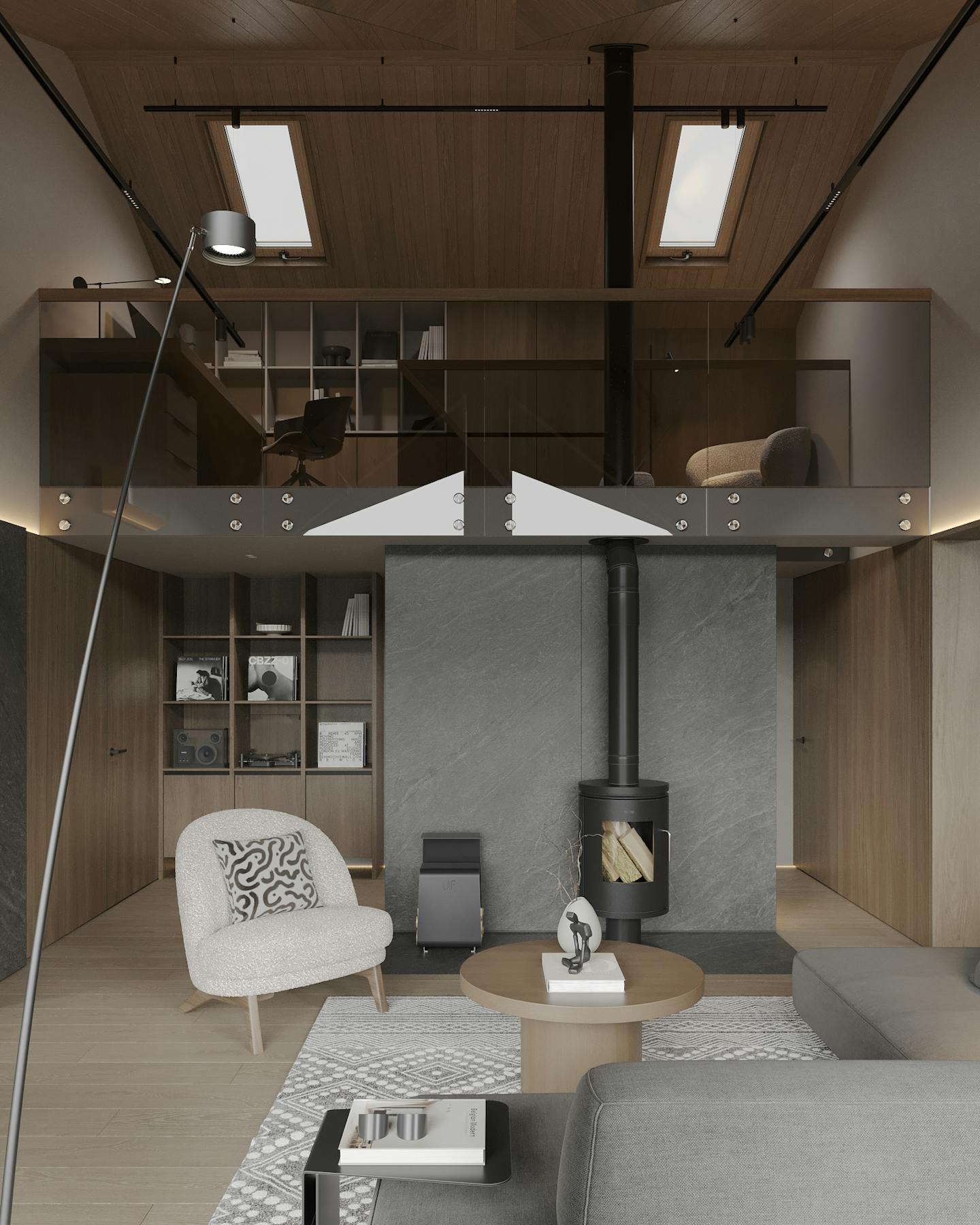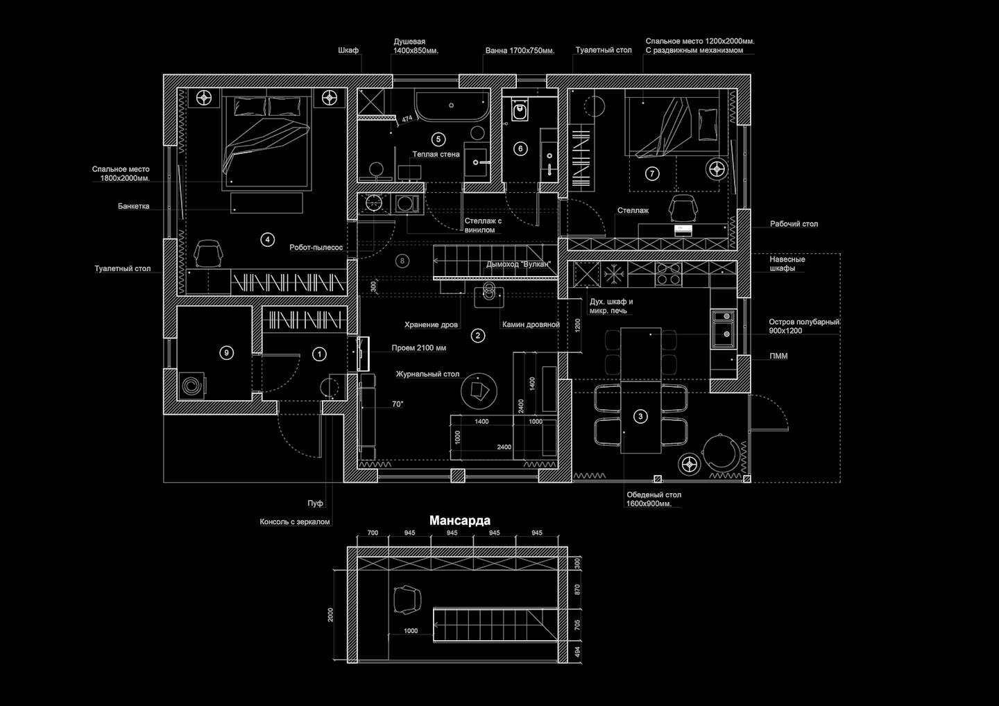 Один из примеров, когда на небольшой площади удалось расположить полноценную кухню с островом и большим столом для гостей, просторную гостиную с камином, мансарду с кабинетом, две спальни и два санузла.