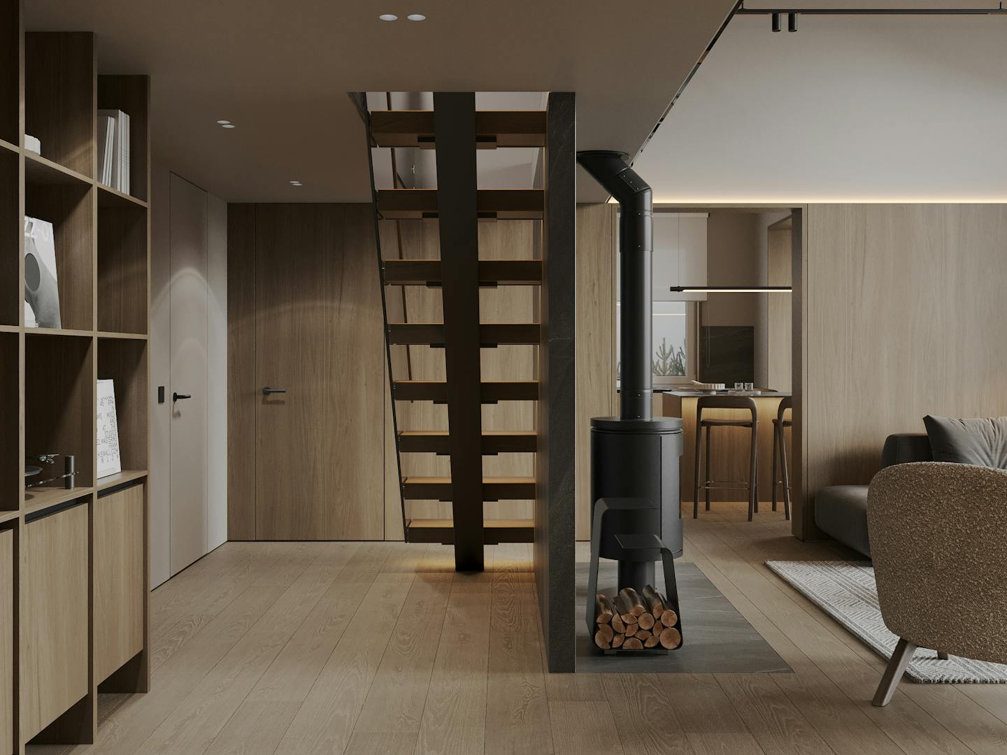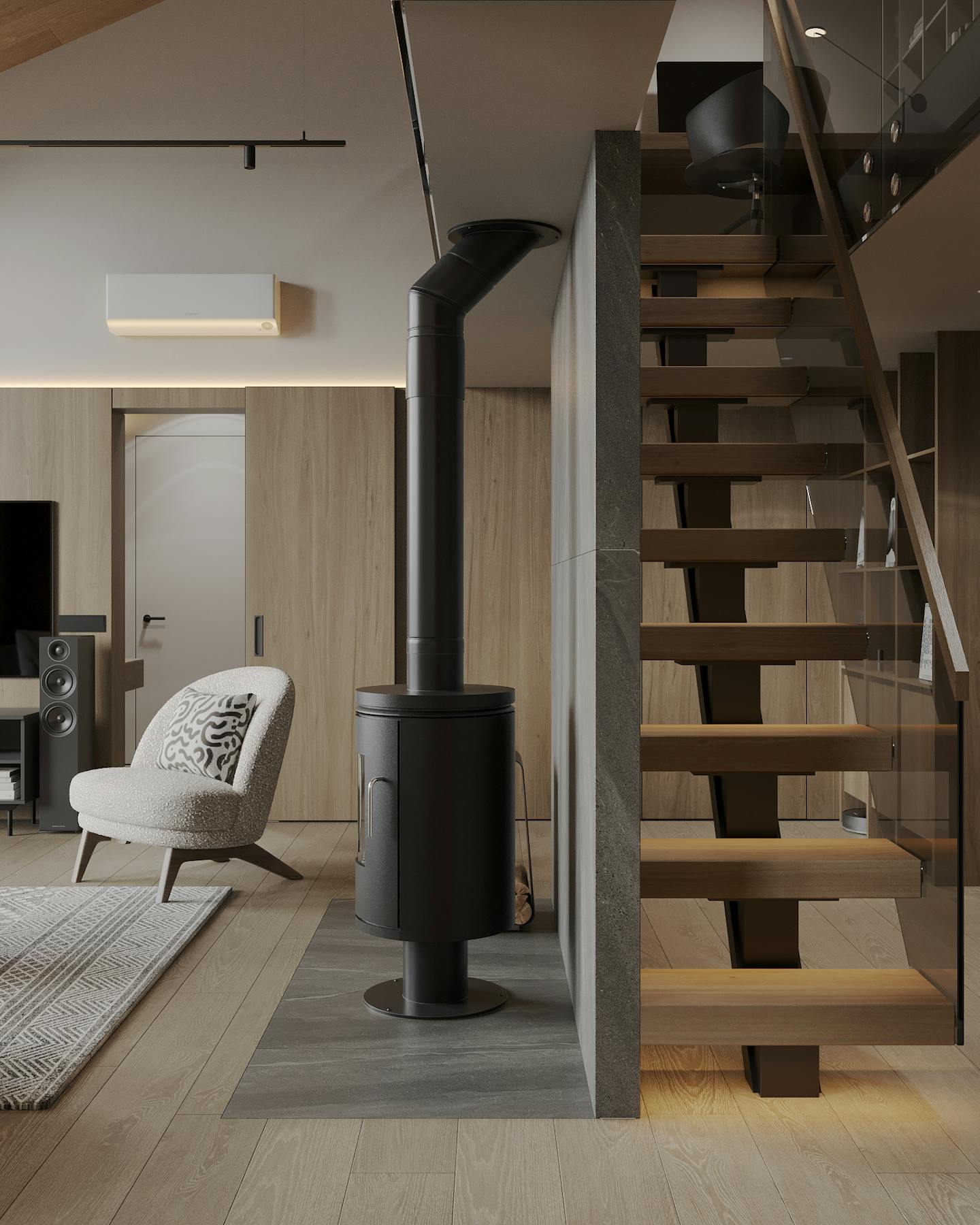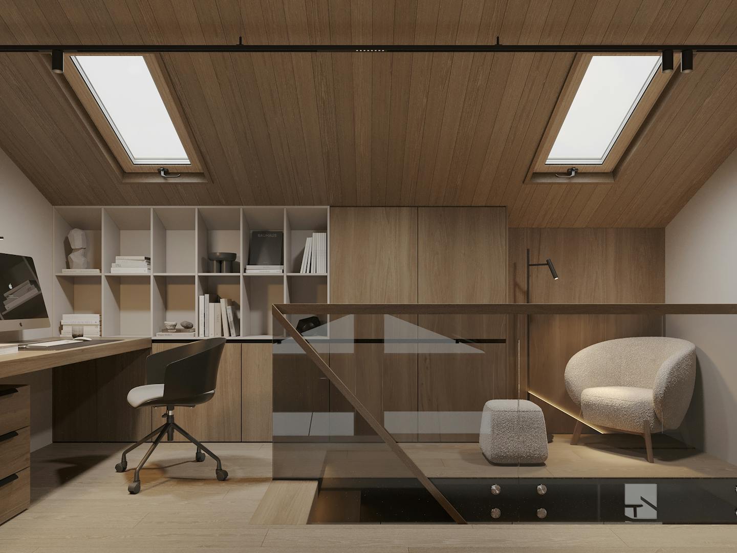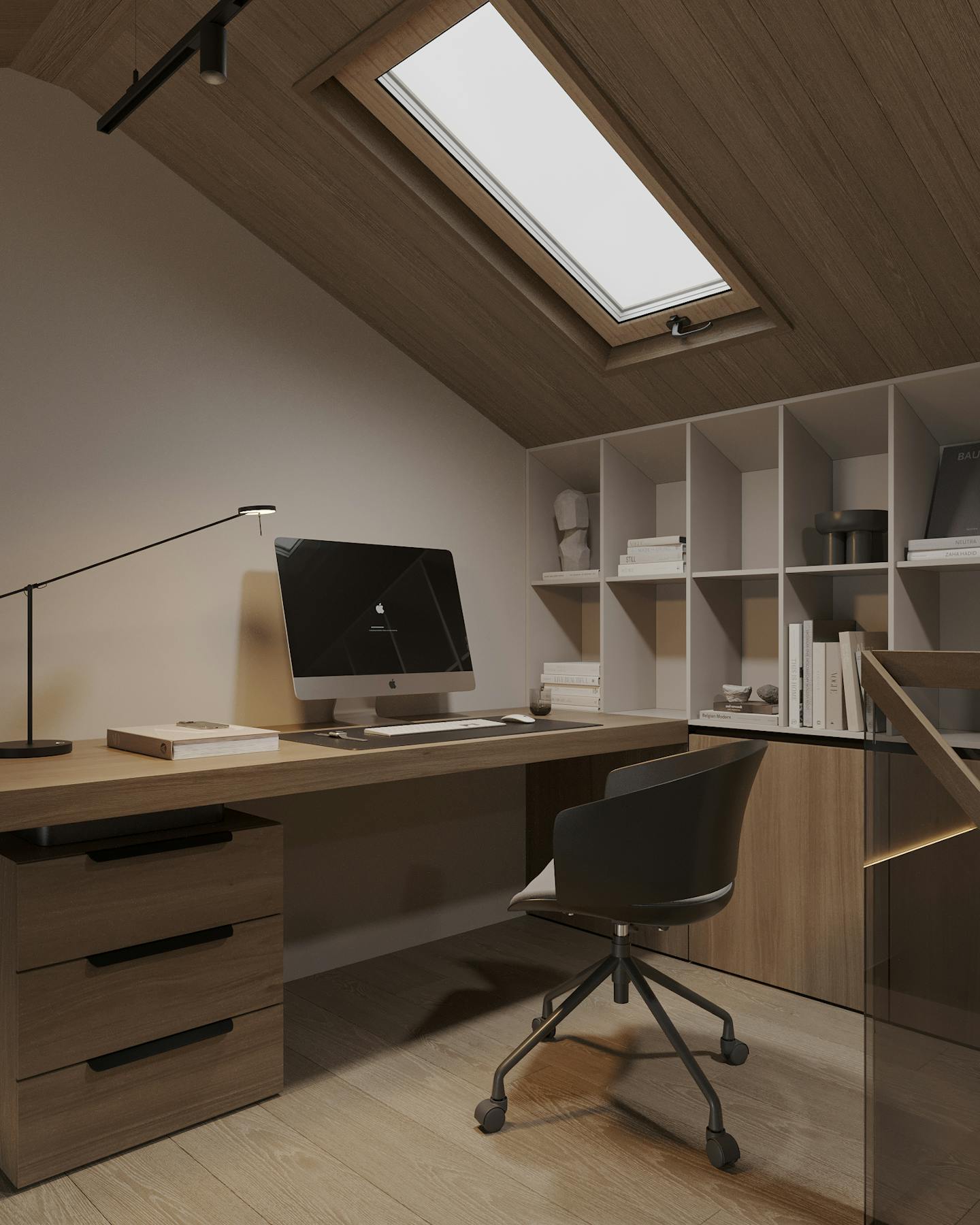 Один из примеров, когда на небольшой площади удалось расположить полноценную кухню с островом и большим столом для гостей, просторную гостиную с камином, мансарду с кабинетом, две спальни и два санузла.