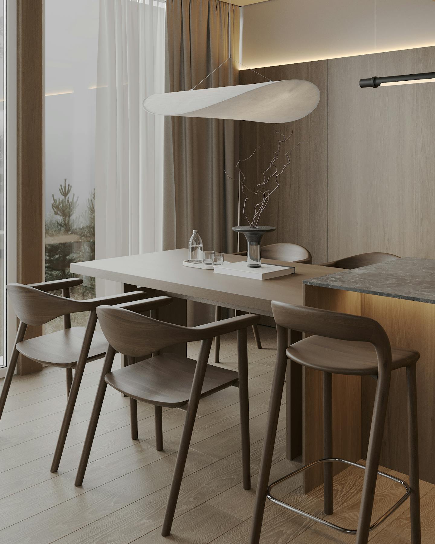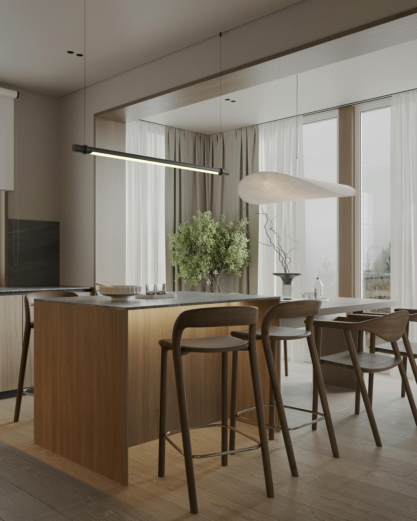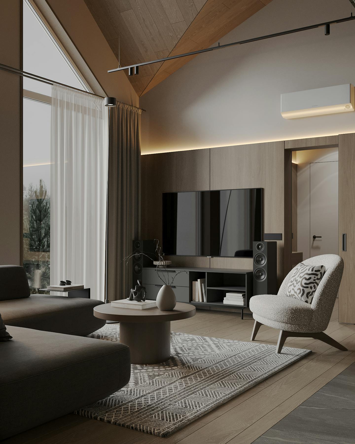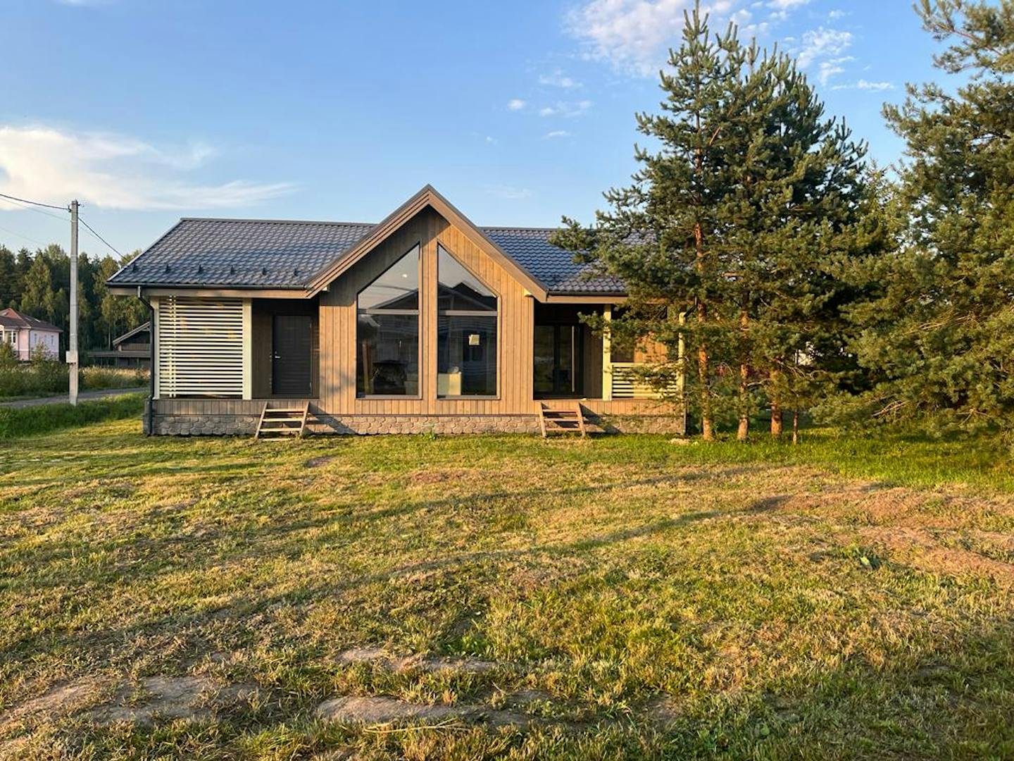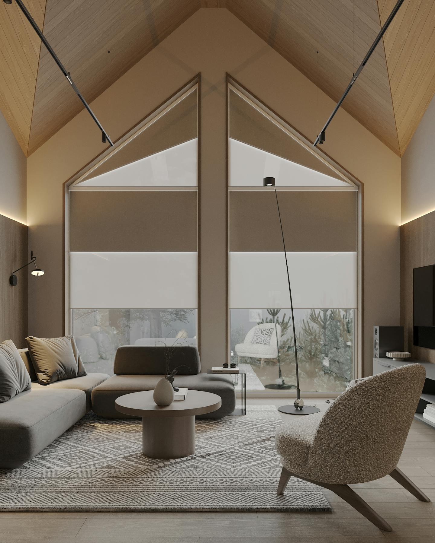 Один из примеров, когда на небольшой площади удалось расположить полноценную кухню с островом и большим столом для гостей, просторную гостиную с камином, мансарду с кабинетом, две спальни и два санузла.