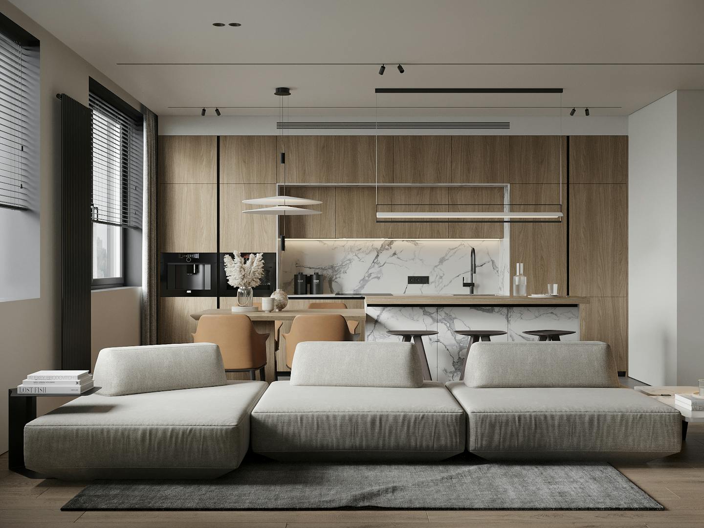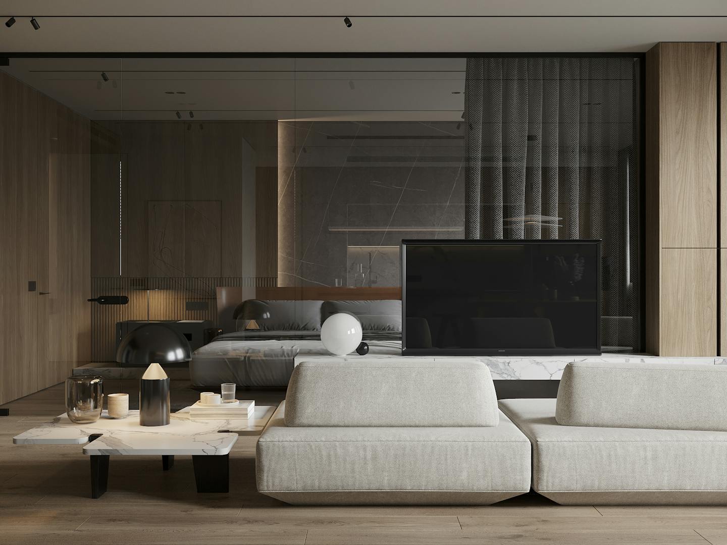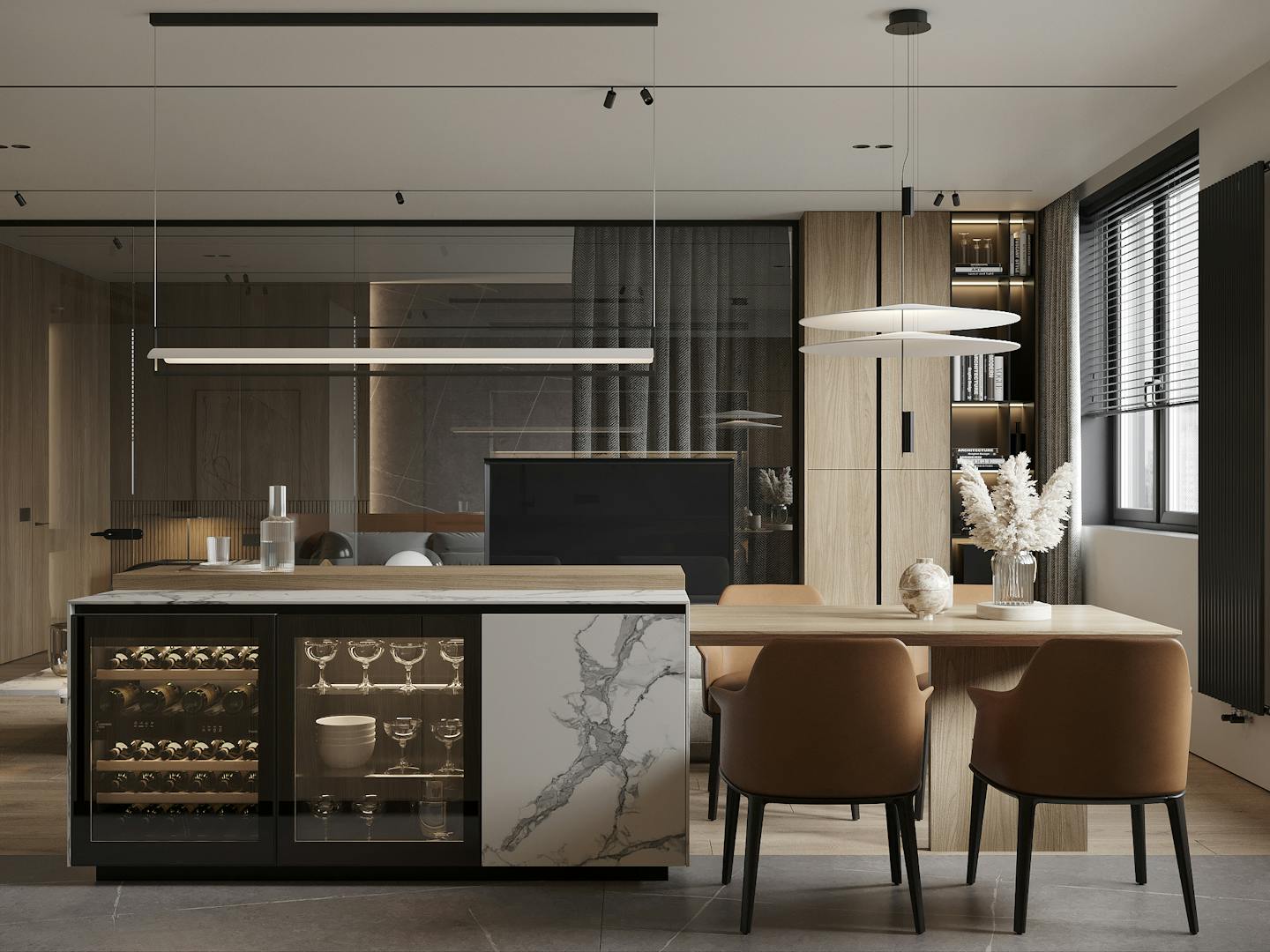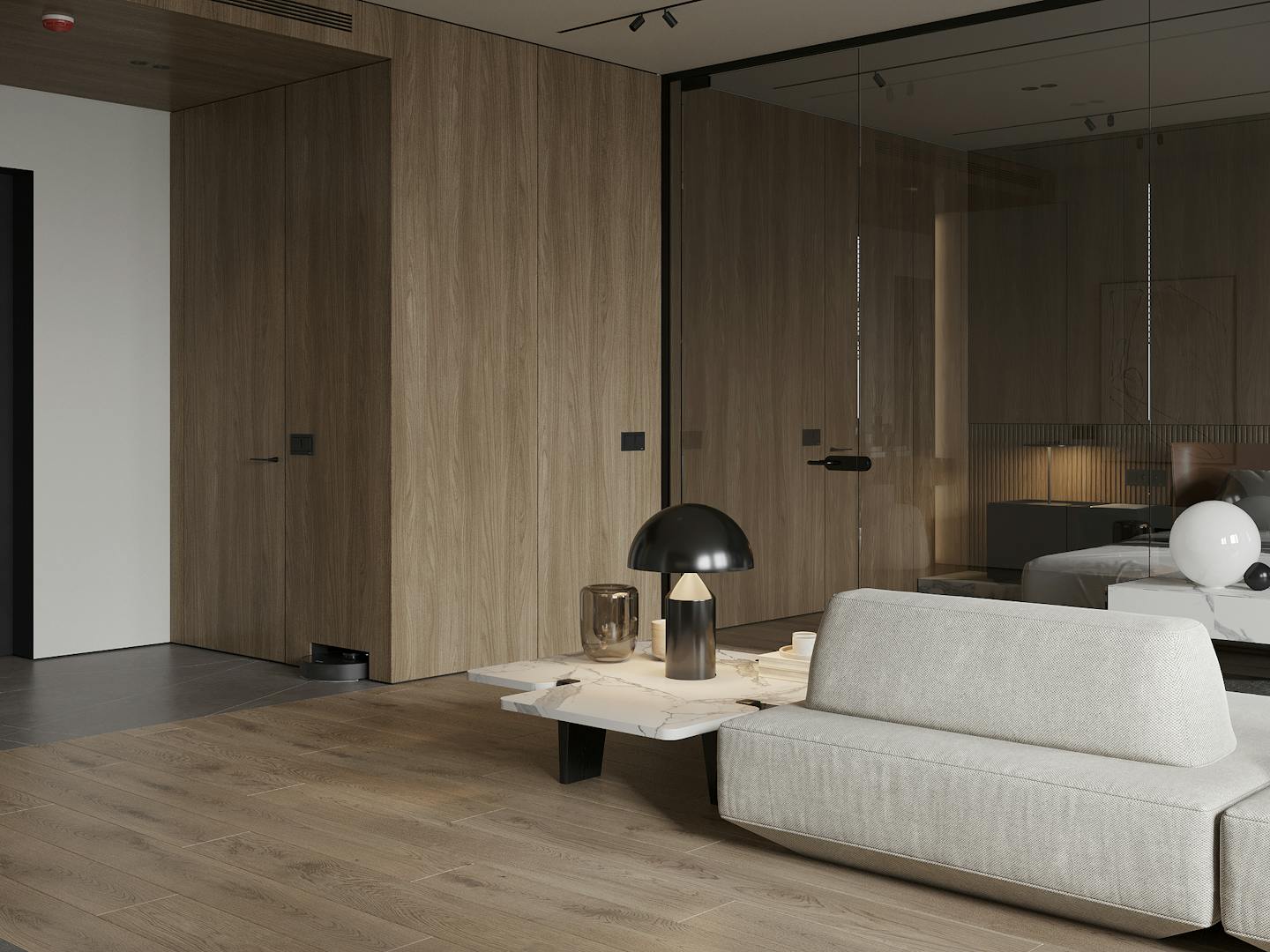 Тщательно продуманы все зоны: спальню можно сделать приватной с помощью штор на электромоторах или с умным стеклом с регулируемой прозрачностью. На кухне предусмотрели остров, переходящий в обеденный стол. В гостиной поставили небольшой, но очень удобный модульный диван. В гардеробной есть специальная ниша для робота-пылесоса. Квартира оснащена системой канального охлаждения и рекупирования воздуха, системой против протечек, теплой стеной в санузле, удобным освещением и управлением шторами. На полу и потолке использовали скрытые теневые профиля.