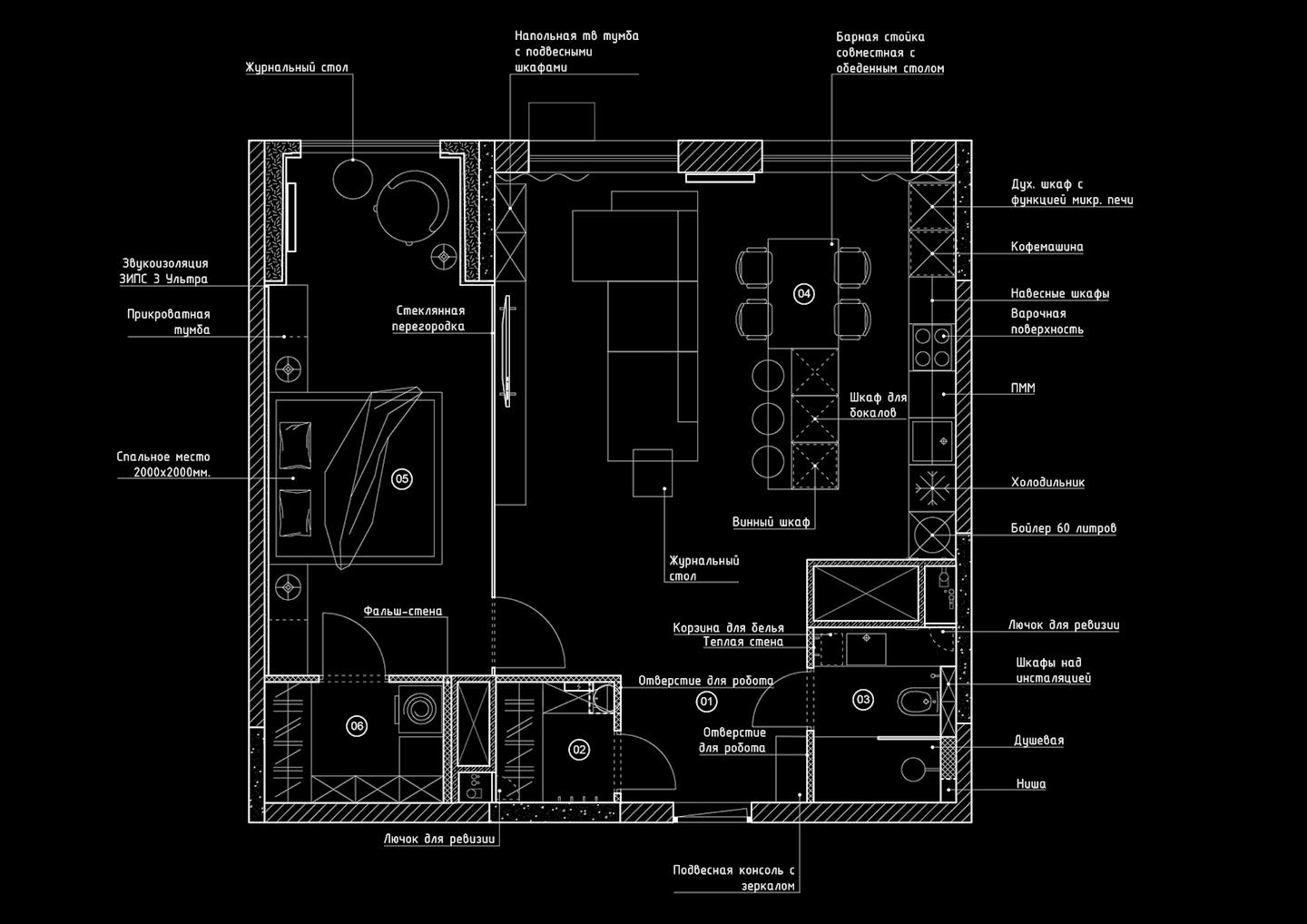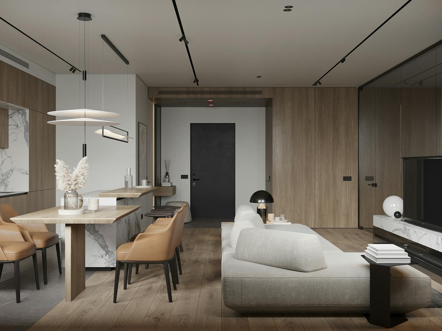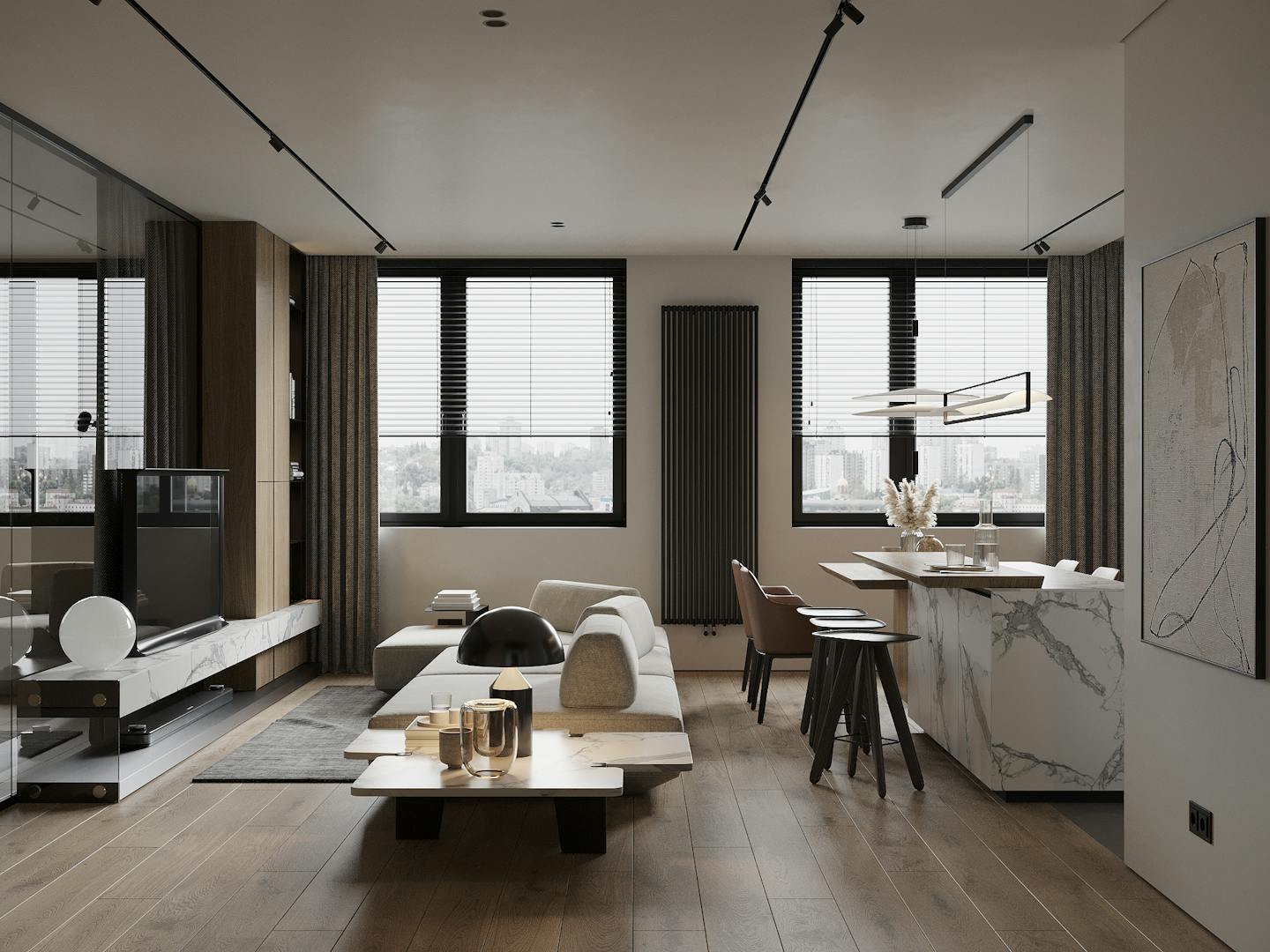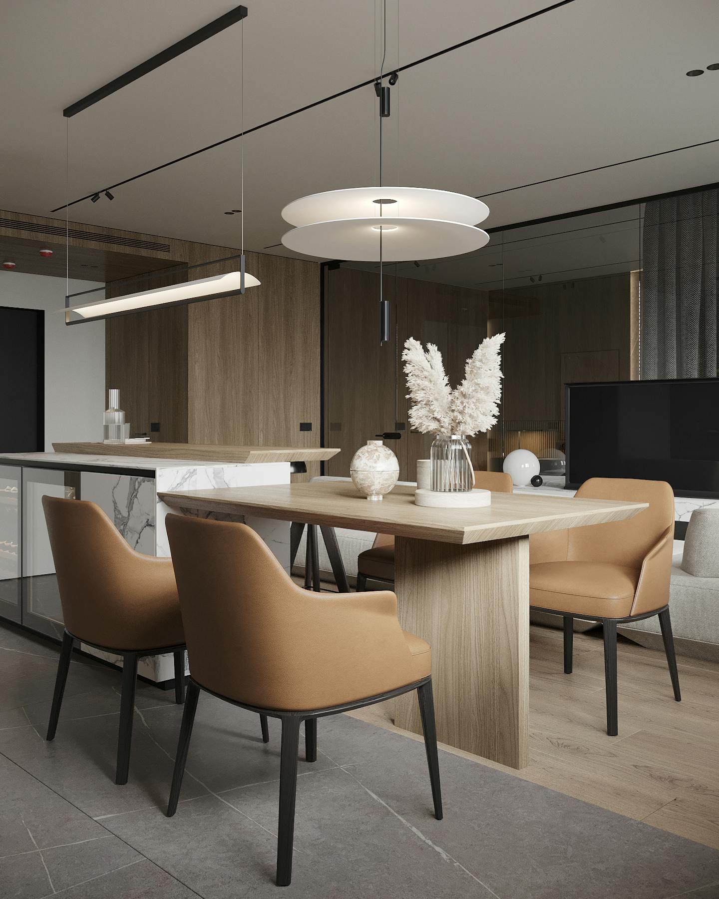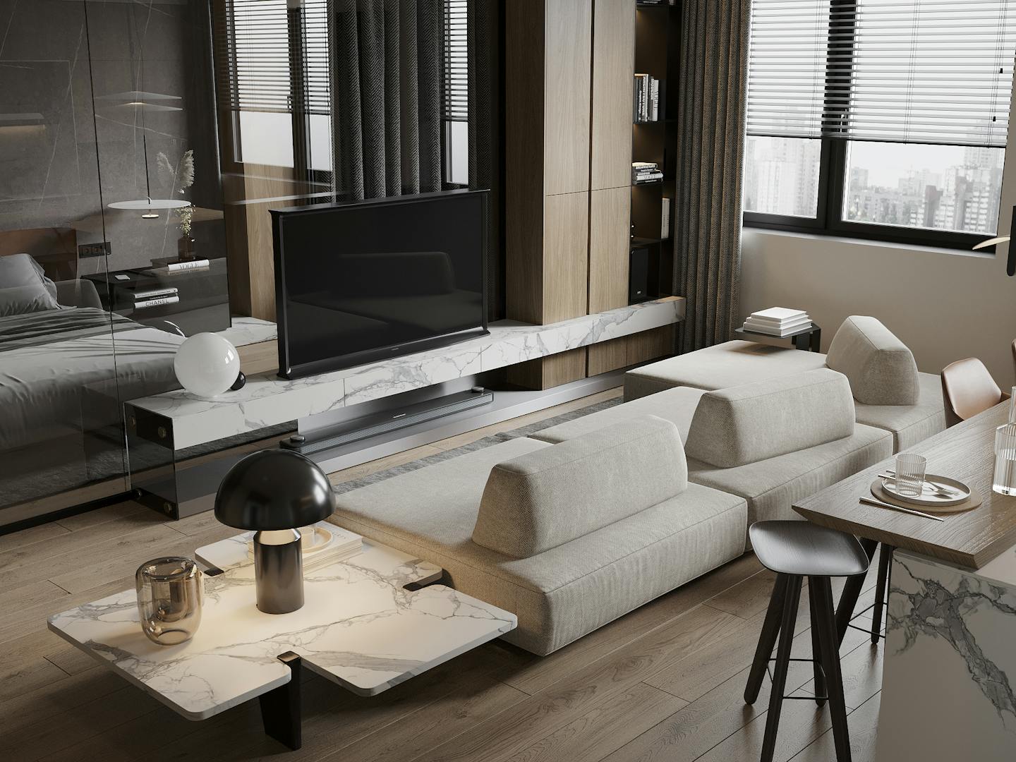 Тщательно продуманы все зоны: спальню можно сделать приватной с помощью штор на электромоторах или с умным стеклом с регулируемой прозрачностью. На кухне предусмотрели остров, переходящий в обеденный стол. В гостиной поставили небольшой, но очень удобный модульный диван. В гардеробной есть специальная ниша для робота-пылесоса. Квартира оснащена системой канального охлаждения и рекупирования воздуха, системой против протечек, теплой стеной в санузле, удобным освещением и управлением шторами. На полу и потолке использовали скрытые теневые профиля.