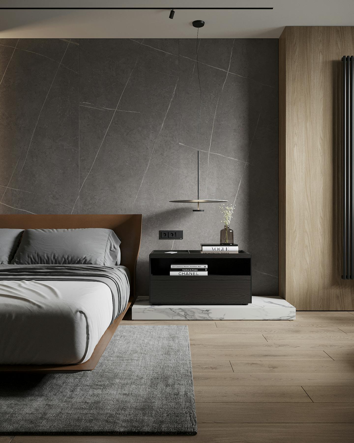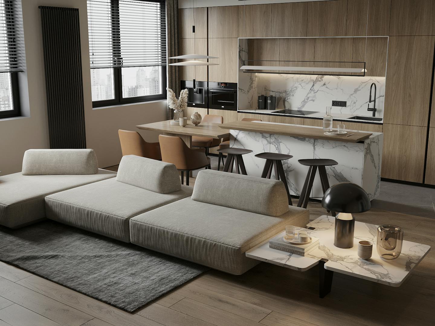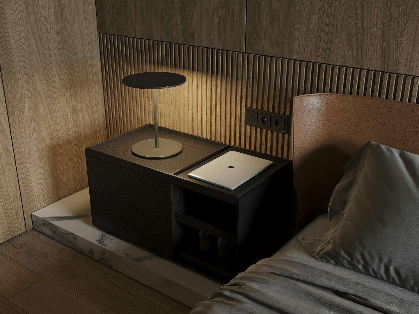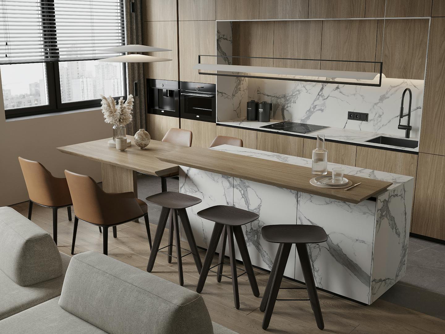 Тщательно продуманы все зоны: спальню можно сделать приватной с помощью штор на электромоторах или с умным стеклом с регулируемой прозрачностью. На кухне предусмотрели остров, переходящий в обеденный стол. В гостиной поставили небольшой, но очень удобный модульный диван. В гардеробной есть специальная ниша для робота-пылесоса. Квартира оснащена системой канального охлаждения и рекупирования воздуха, системой против протечек, теплой стеной в санузле, удобным освещением и управлением шторами. На полу и потолке использовали скрытые теневые профиля.