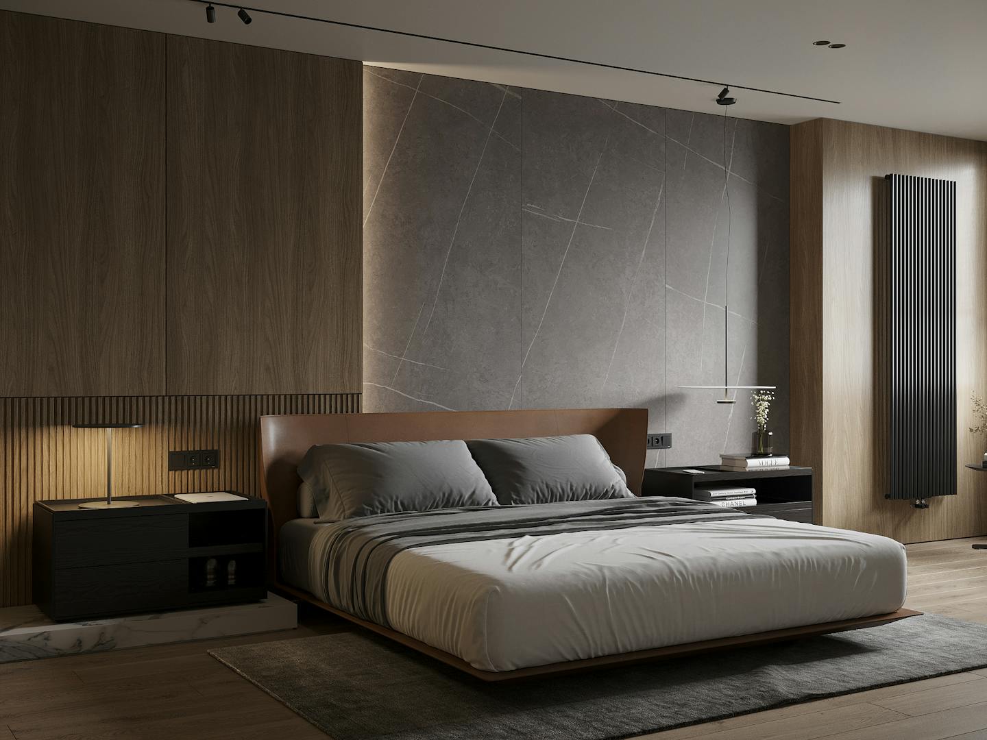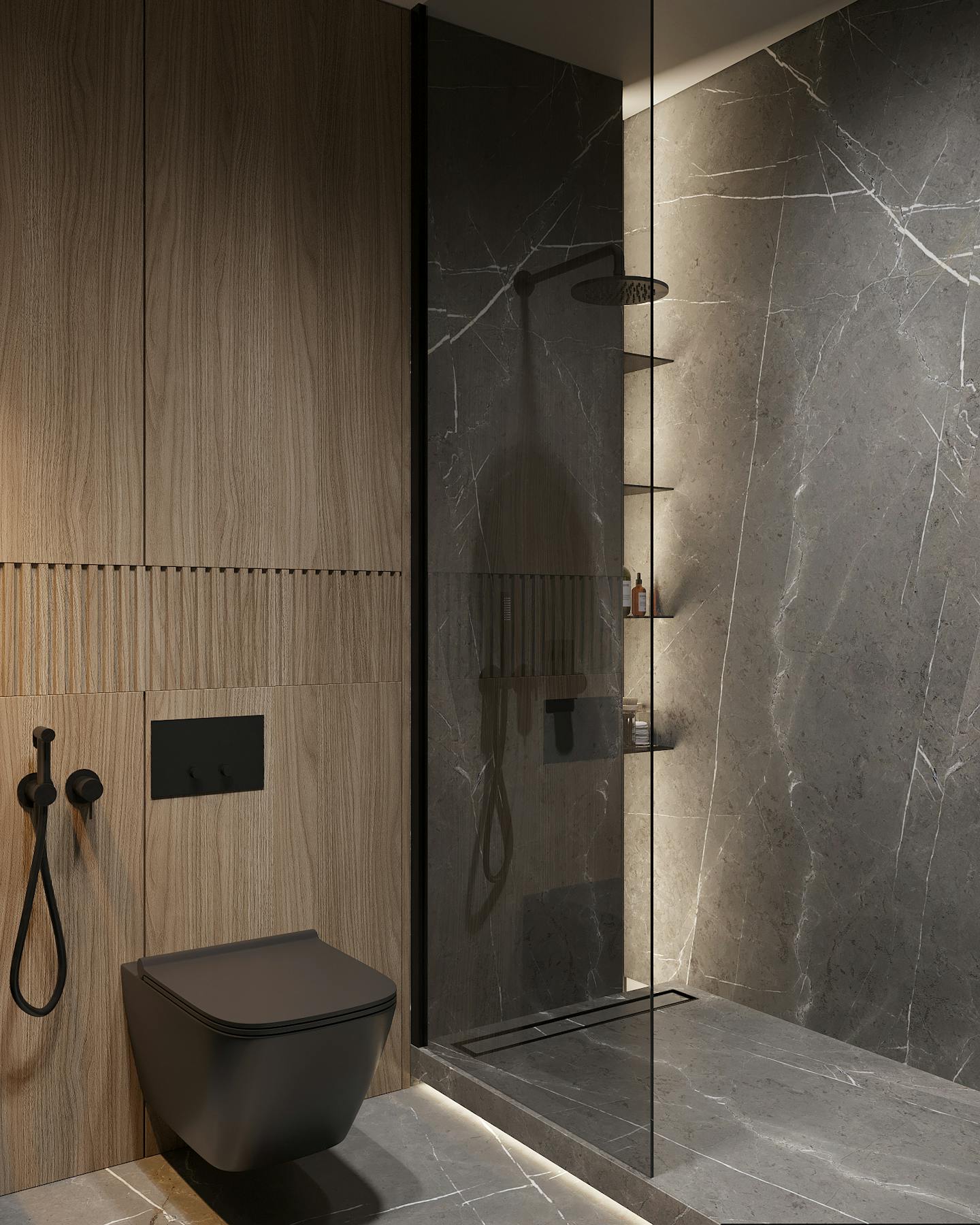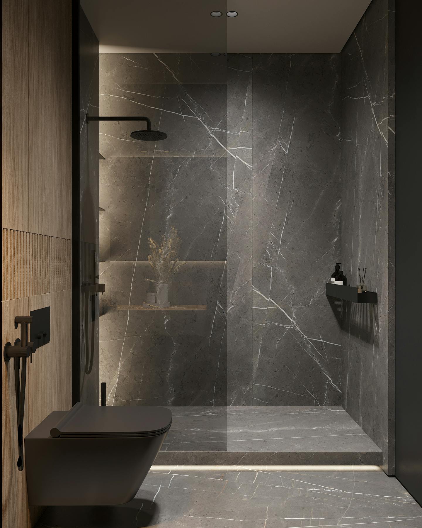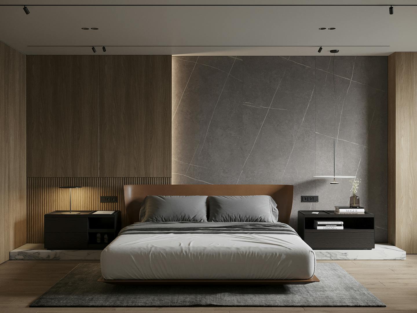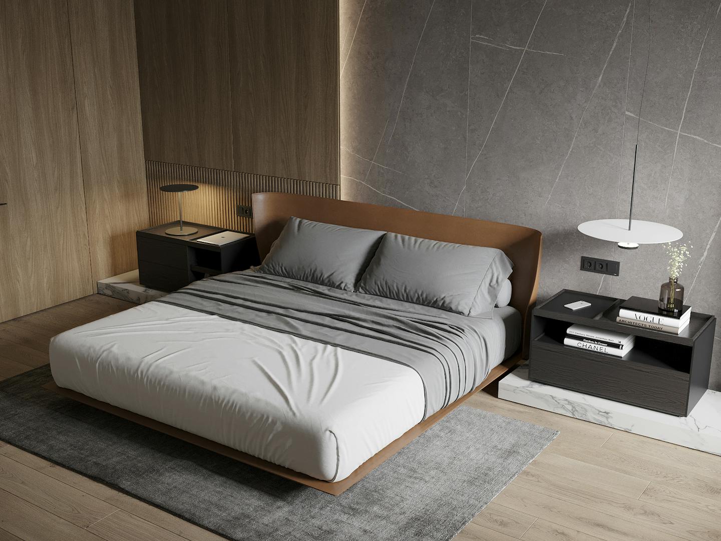 Тщательно продуманы все зоны: спальню можно сделать приватной с помощью штор на электромоторах или с умным стеклом с регулируемой прозрачностью. На кухне предусмотрели остров, переходящий в обеденный стол. В гостиной поставили небольшой, но очень удобный модульный диван. В гардеробной есть специальная ниша для робота-пылесоса. Квартира оснащена системой канального охлаждения и рекупирования воздуха, системой против протечек, теплой стеной в санузле, удобным освещением и управлением шторами. На полу и потолке использовали скрытые теневые профиля.