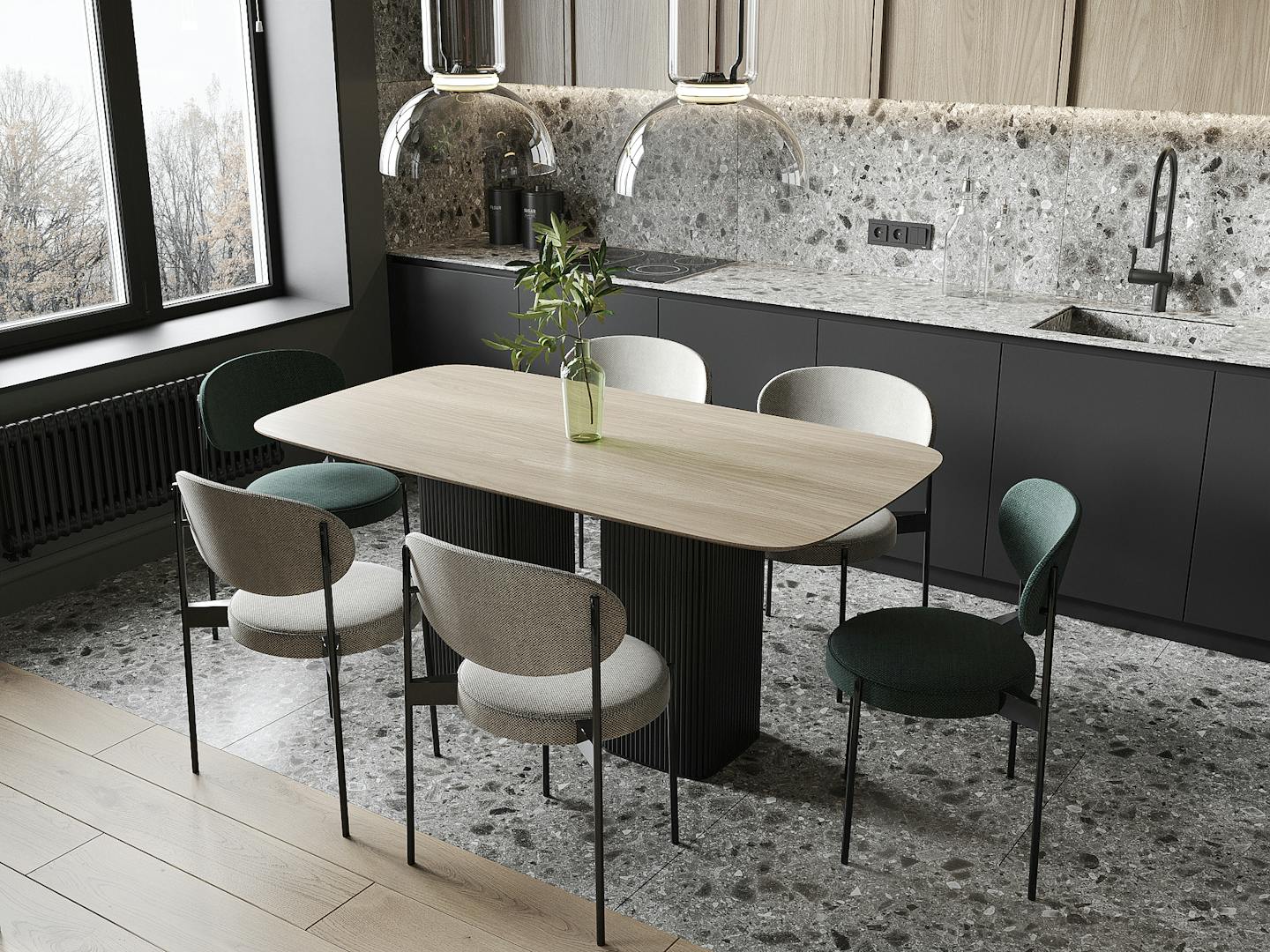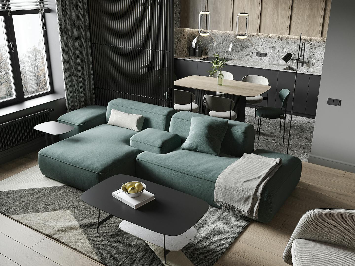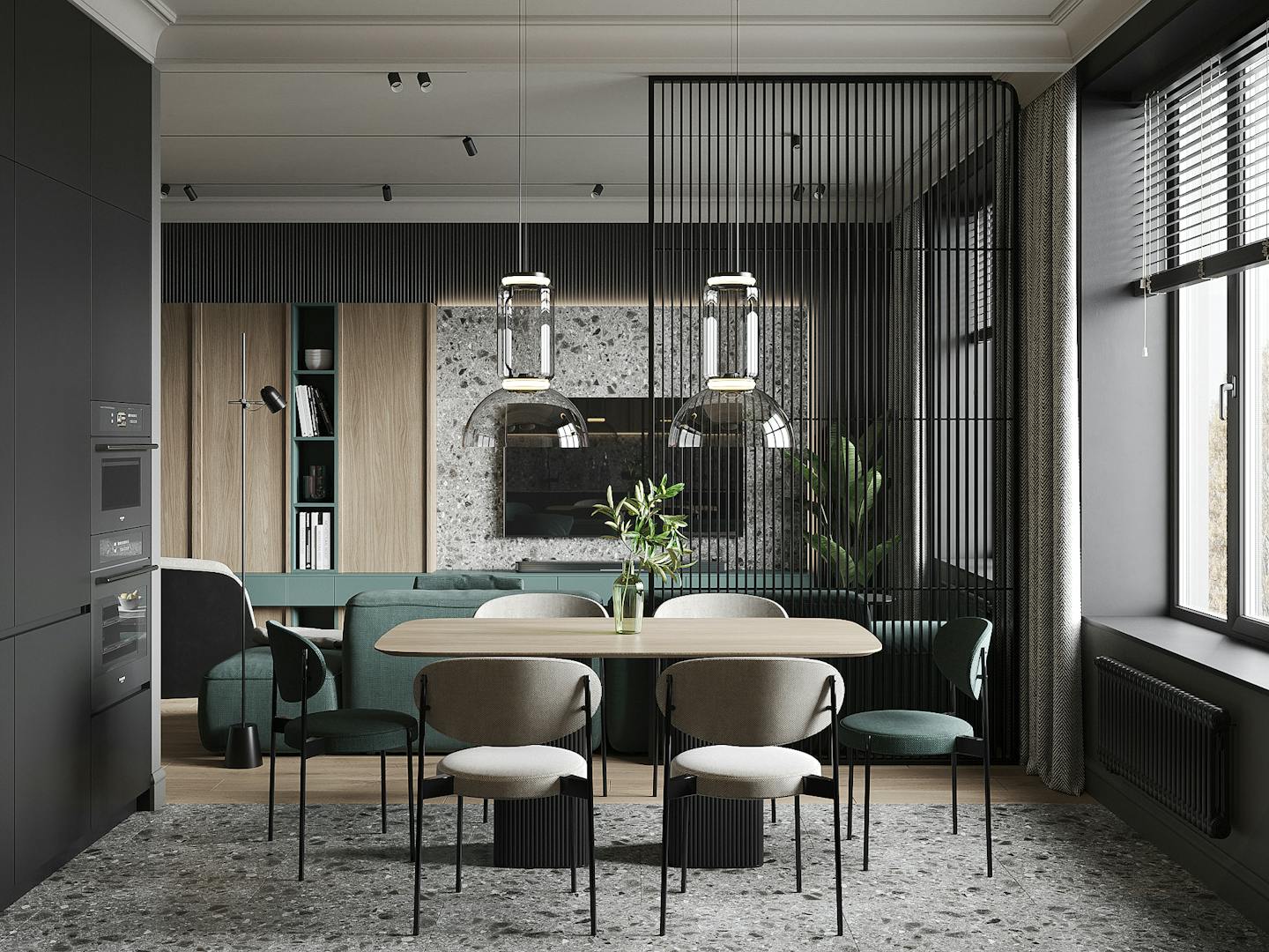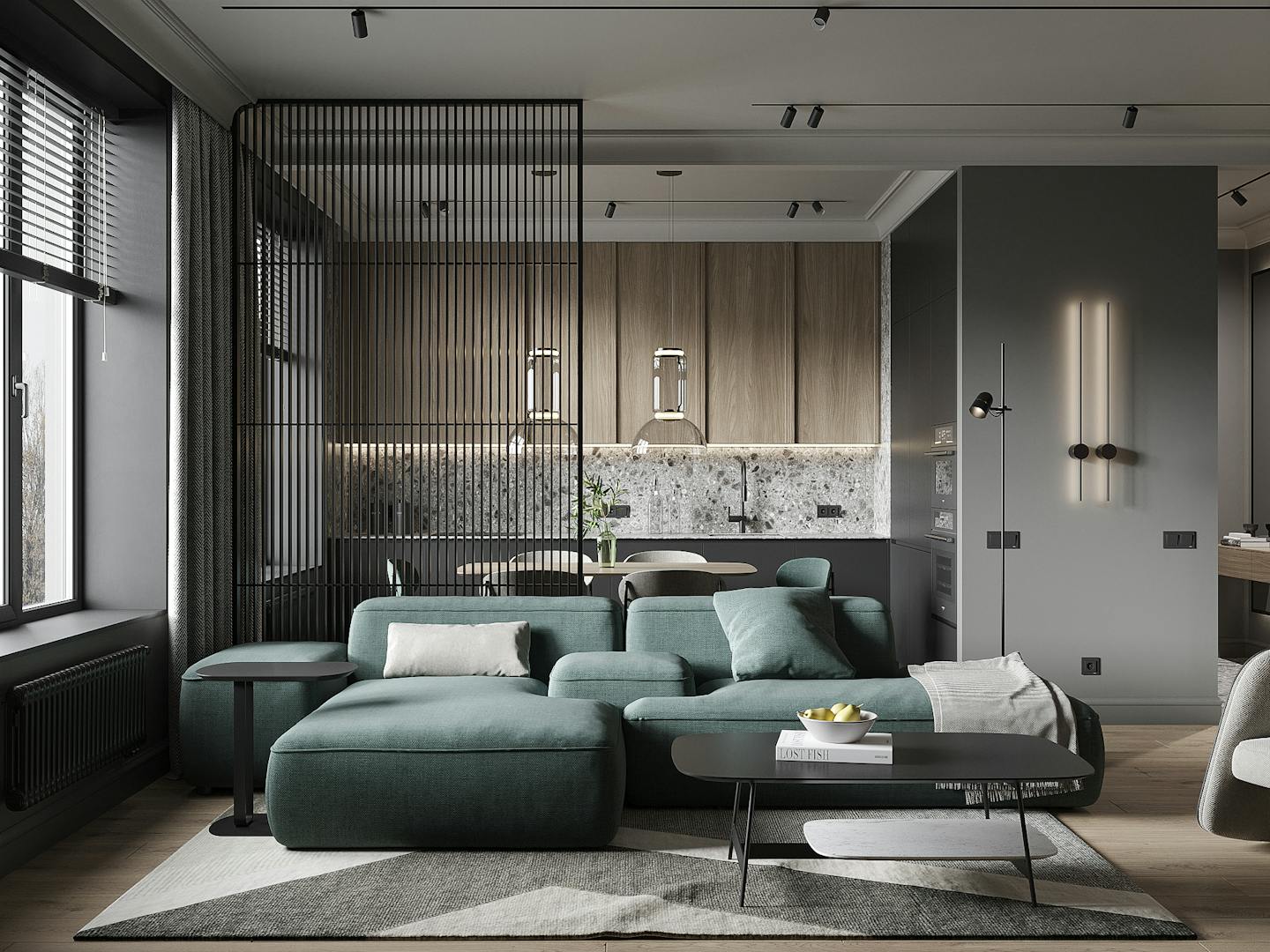 Главные достоинства помещения — свободная планировка, высокие потолки и большие окна. Планировка поделила квартиру на две зоны. Общее пространство кухни и гостиной — самое удачное решение этого проекта. Наиболее выигрышно оно смотрится благодаря воздушности, которая создается высокими потолками. Зоны разделяются реечной перегородкой.