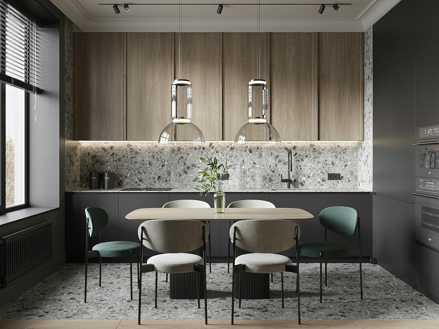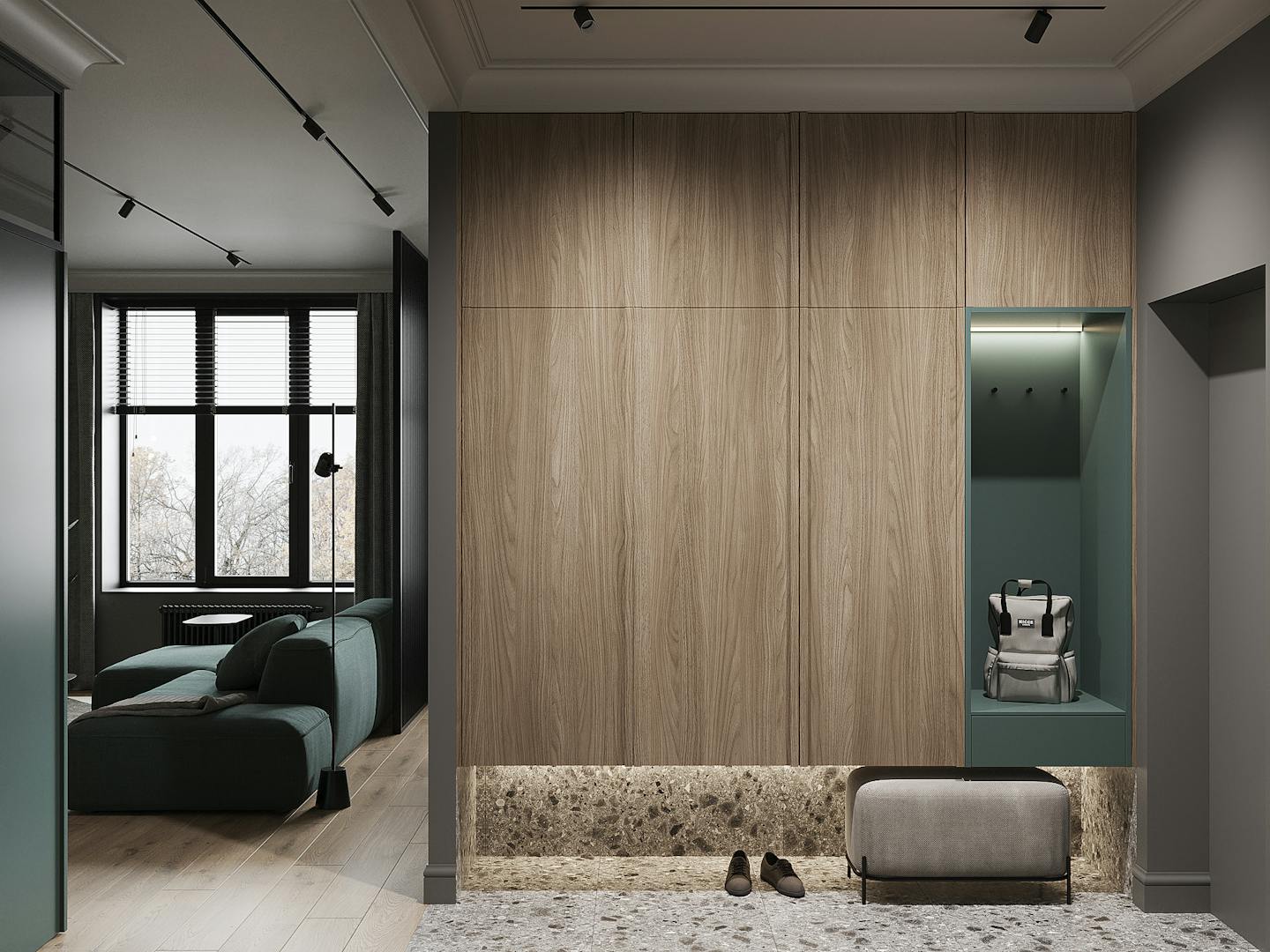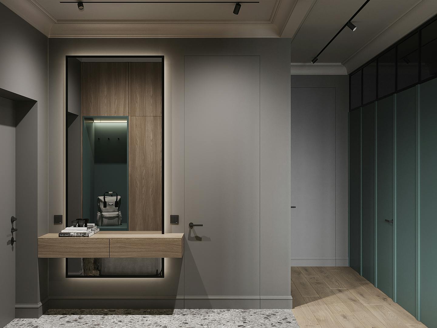 Цветовая палитра светлая, спокойная, с природными оттенками. Преобладают натуральные материалы. Керамогранит на кухне и в зоне тв, мебель с натуральным дубовым шпоном. Мебель — лаконичная, простая, но из качественных материалов, освещение в основном трековое, исключение составили два стеклянных светильника над обеденным столом. У заказчиков было пожелание — минимум открытых поверхностей и ручек. В этом плане прихожая получилась монолитной, а серый оттенок подчёркивает ее строгость.