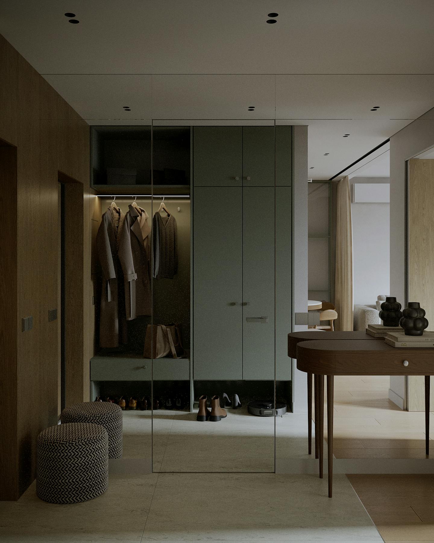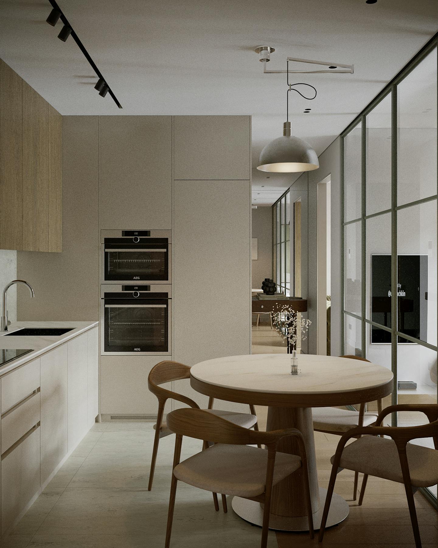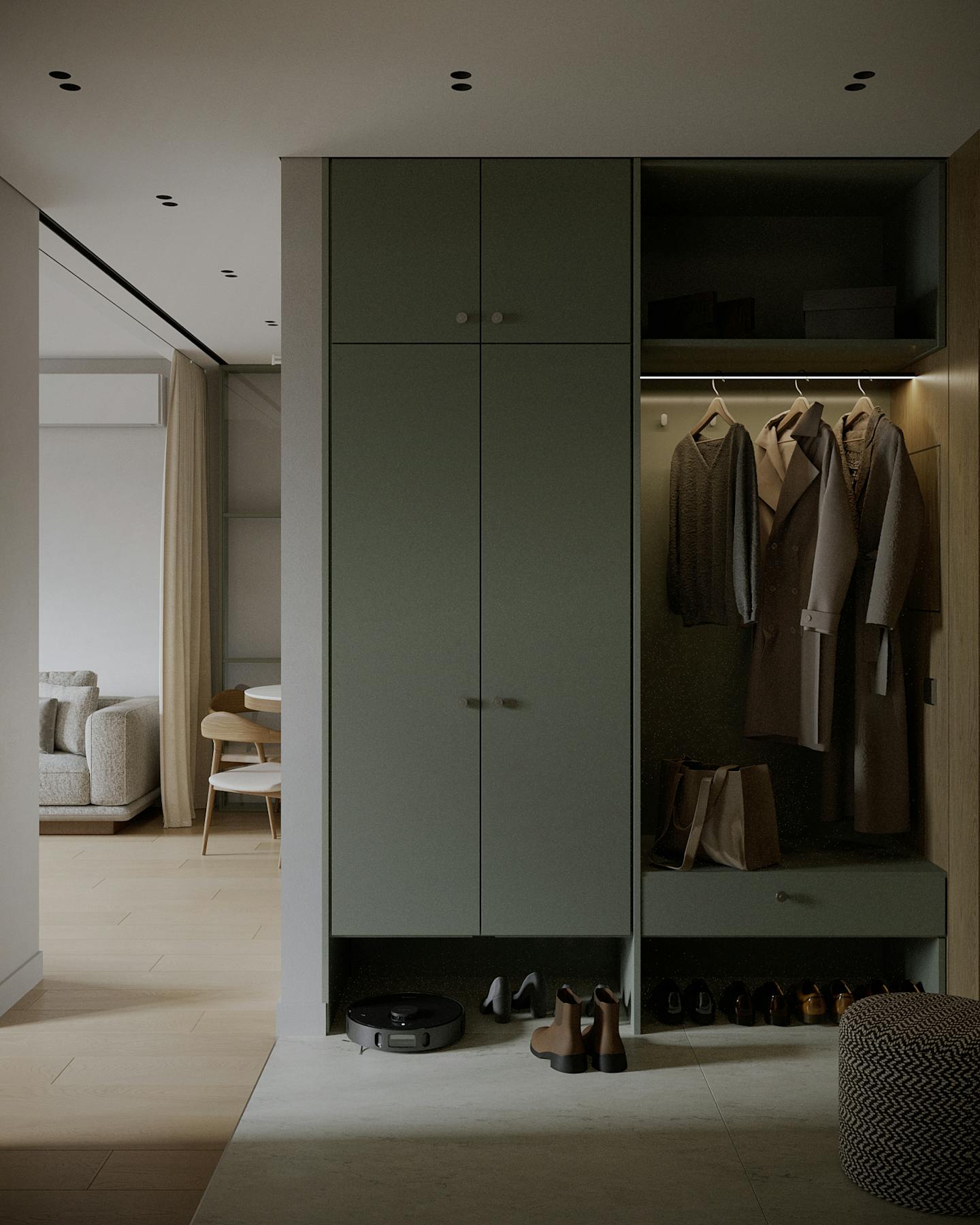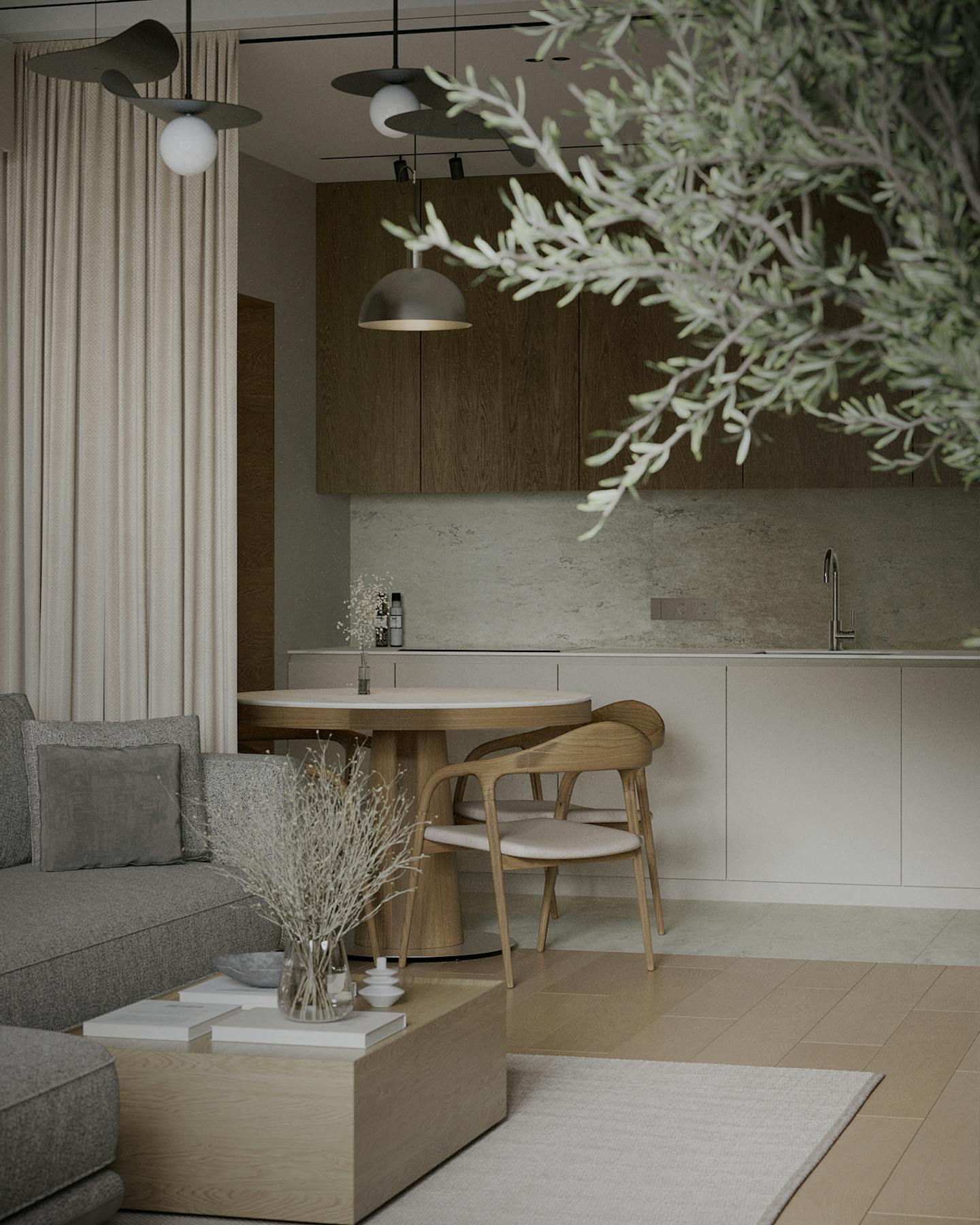 Концепция проекта основана на сочетании минималистичных форм и натуральных оттенков. Оливковые цвета использованы как в крупных элементах интерьера, так и в декоративных акцентах, создавая гармоничную композицию.
