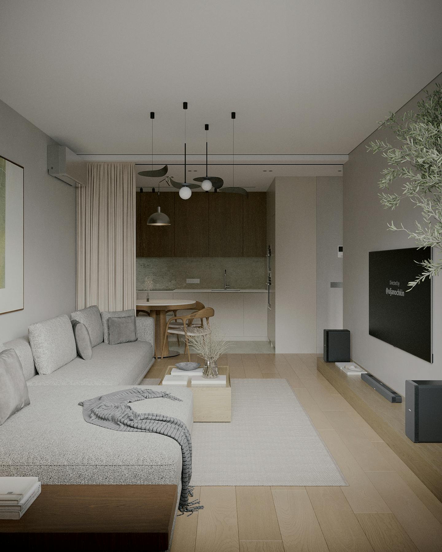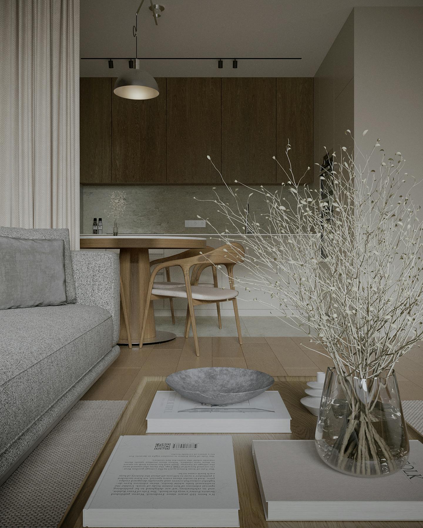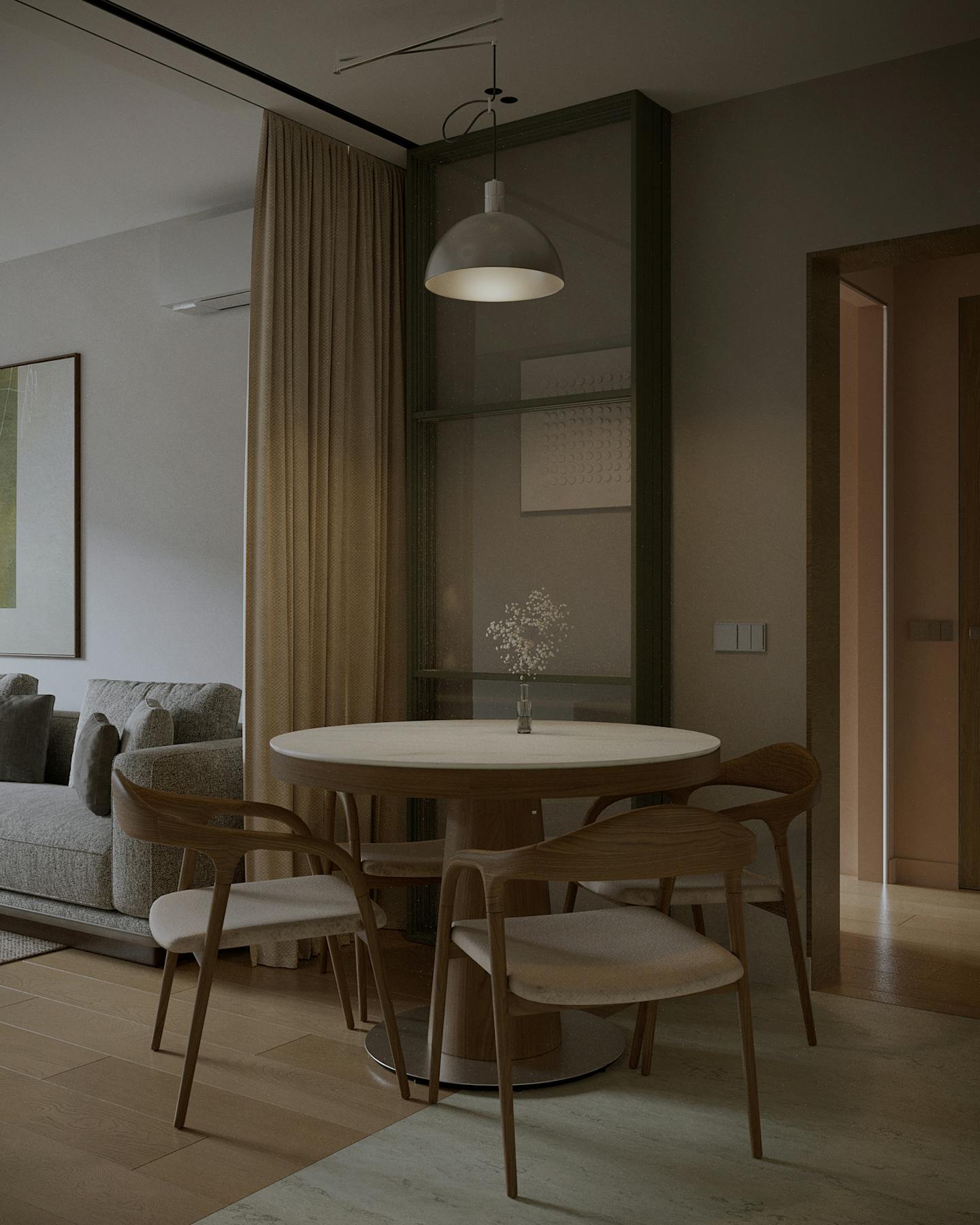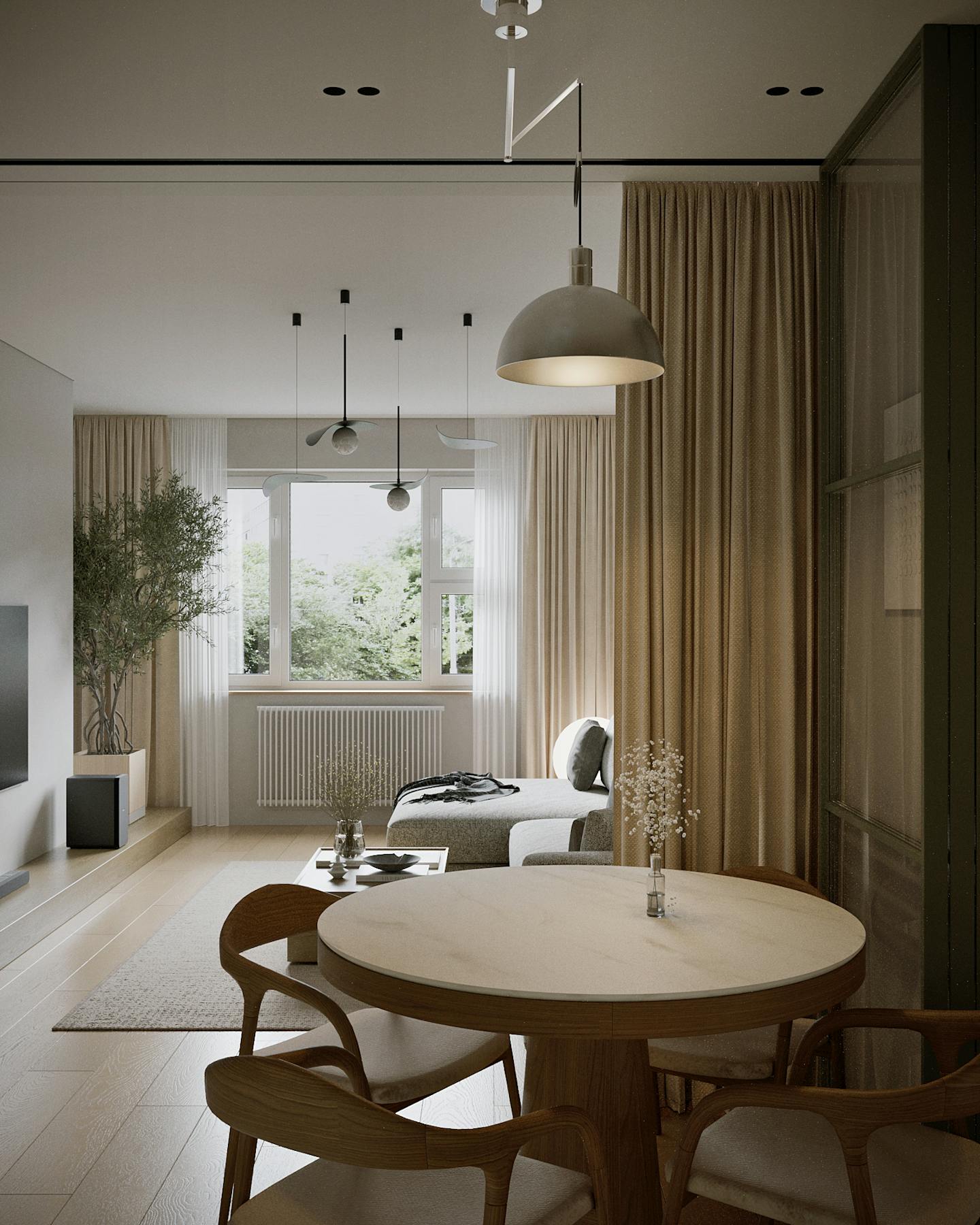 Концепция проекта основана на сочетании минималистичных форм и натуральных оттенков. Оливковые цвета использованы как в крупных элементах интерьера, так и в декоративных акцентах, создавая гармоничную композицию.