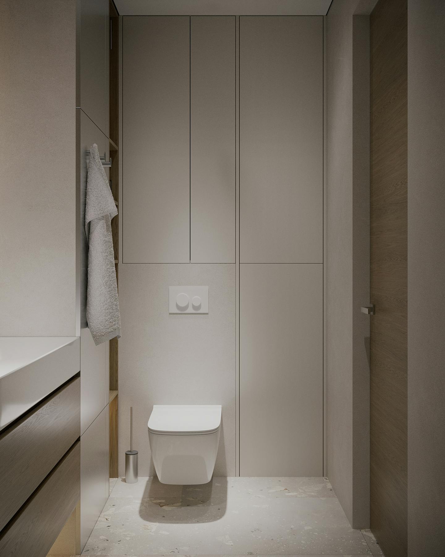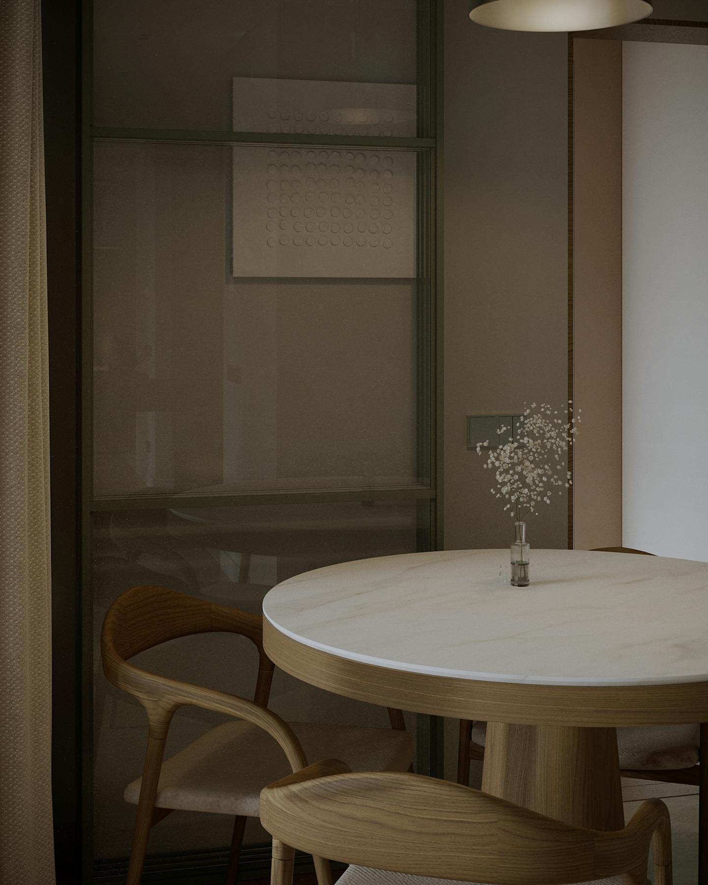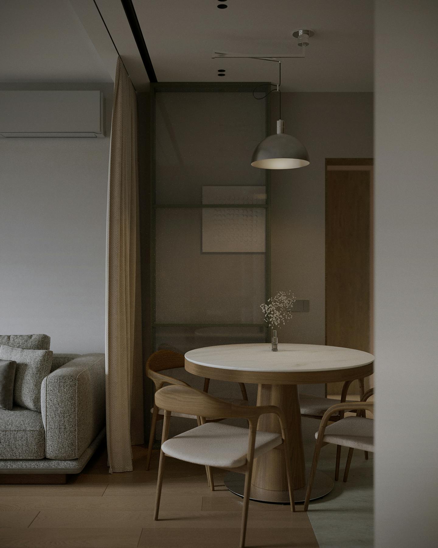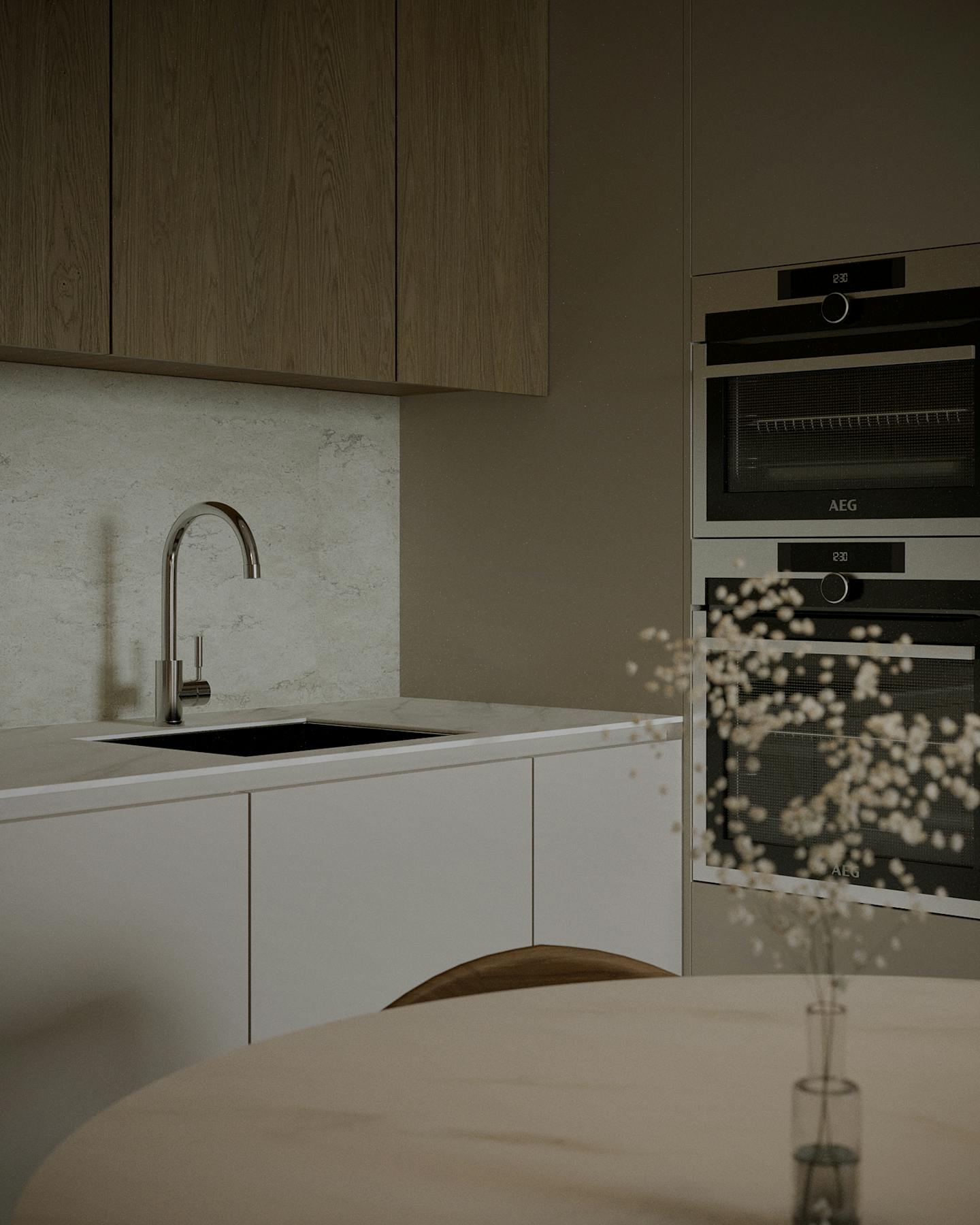 Концепция проекта основана на сочетании минималистичных форм и натуральных оттенков. Оливковые цвета использованы как в крупных элементах интерьера, так и в декоративных акцентах, создавая гармоничную композицию.